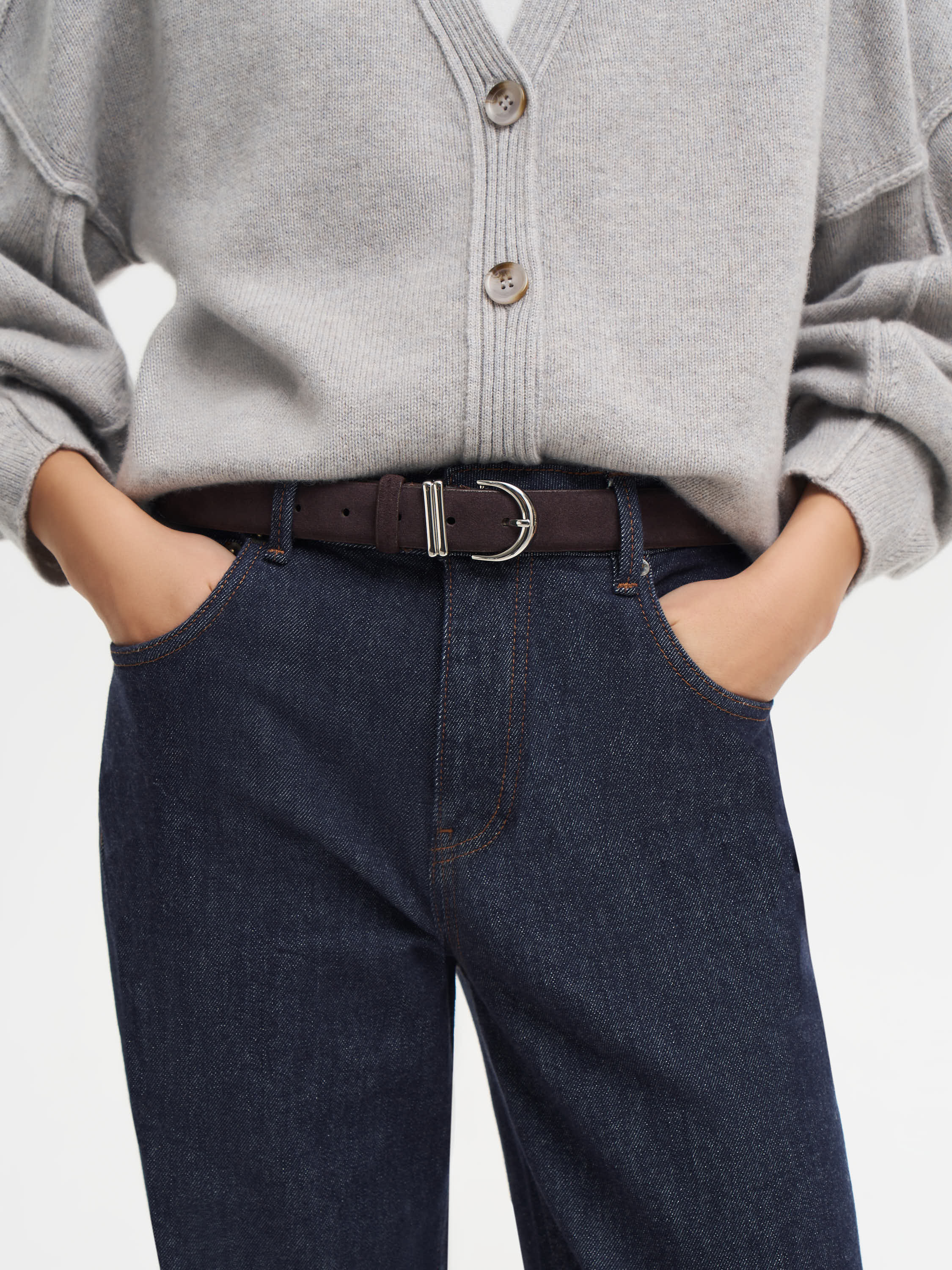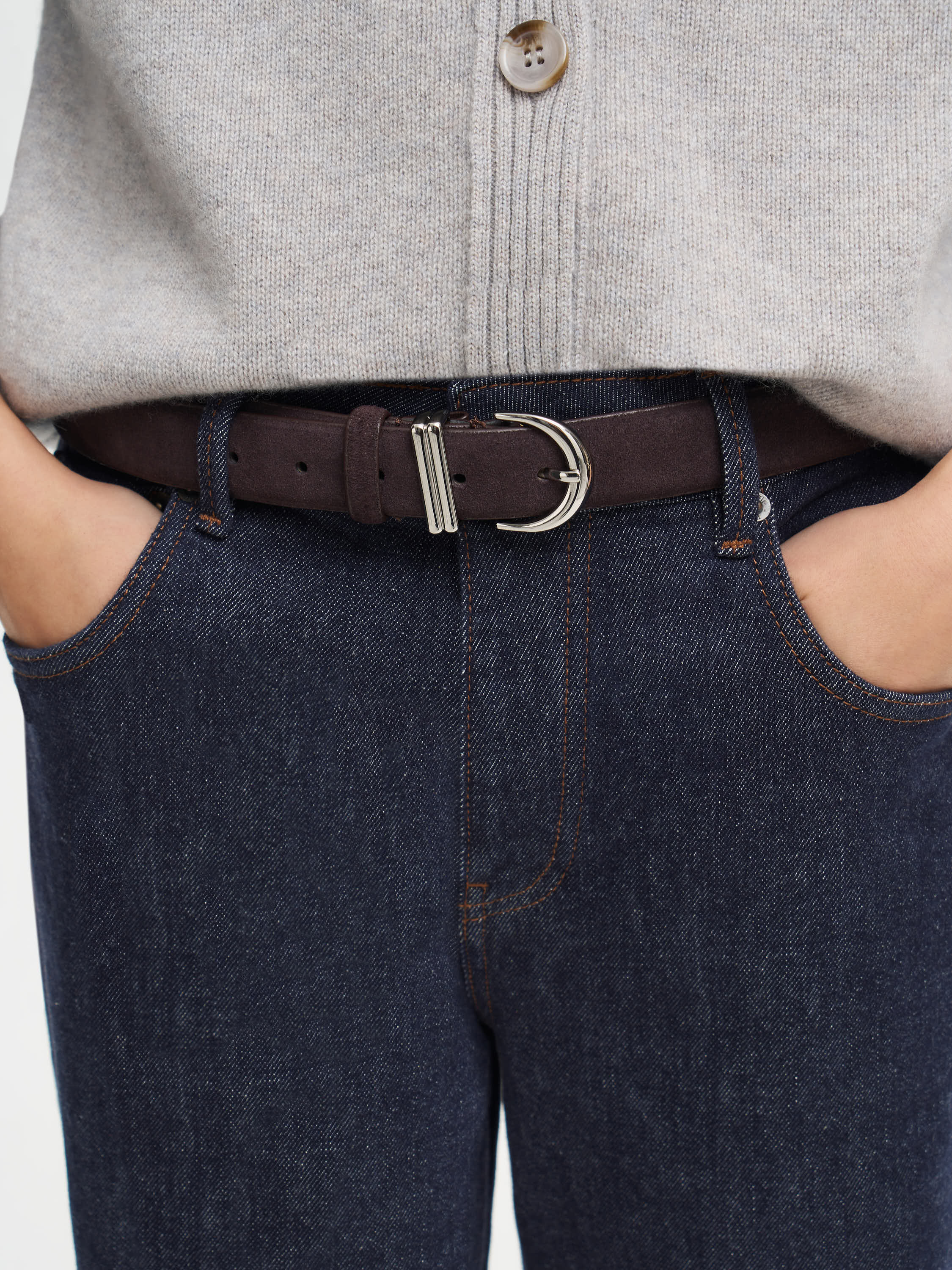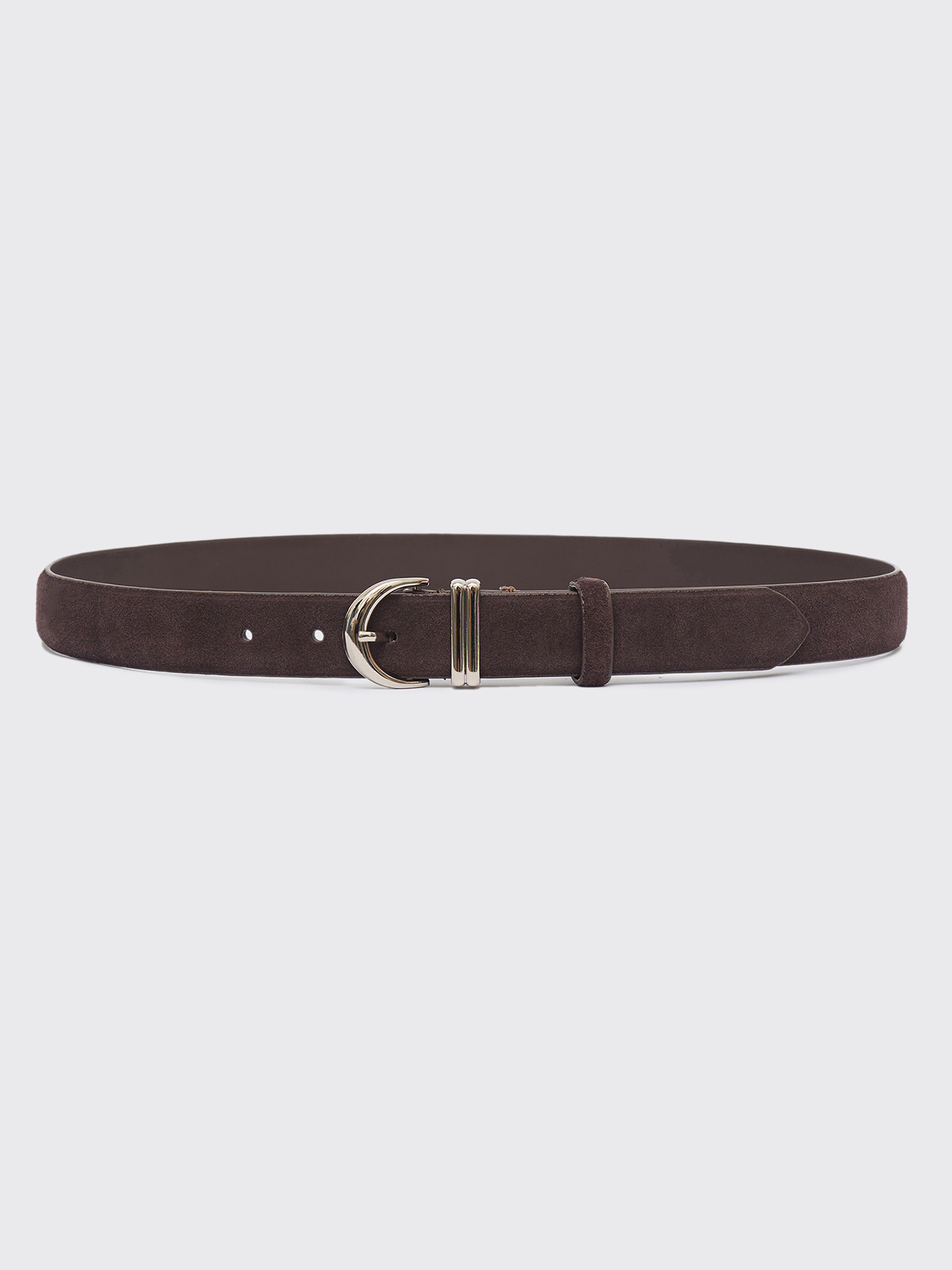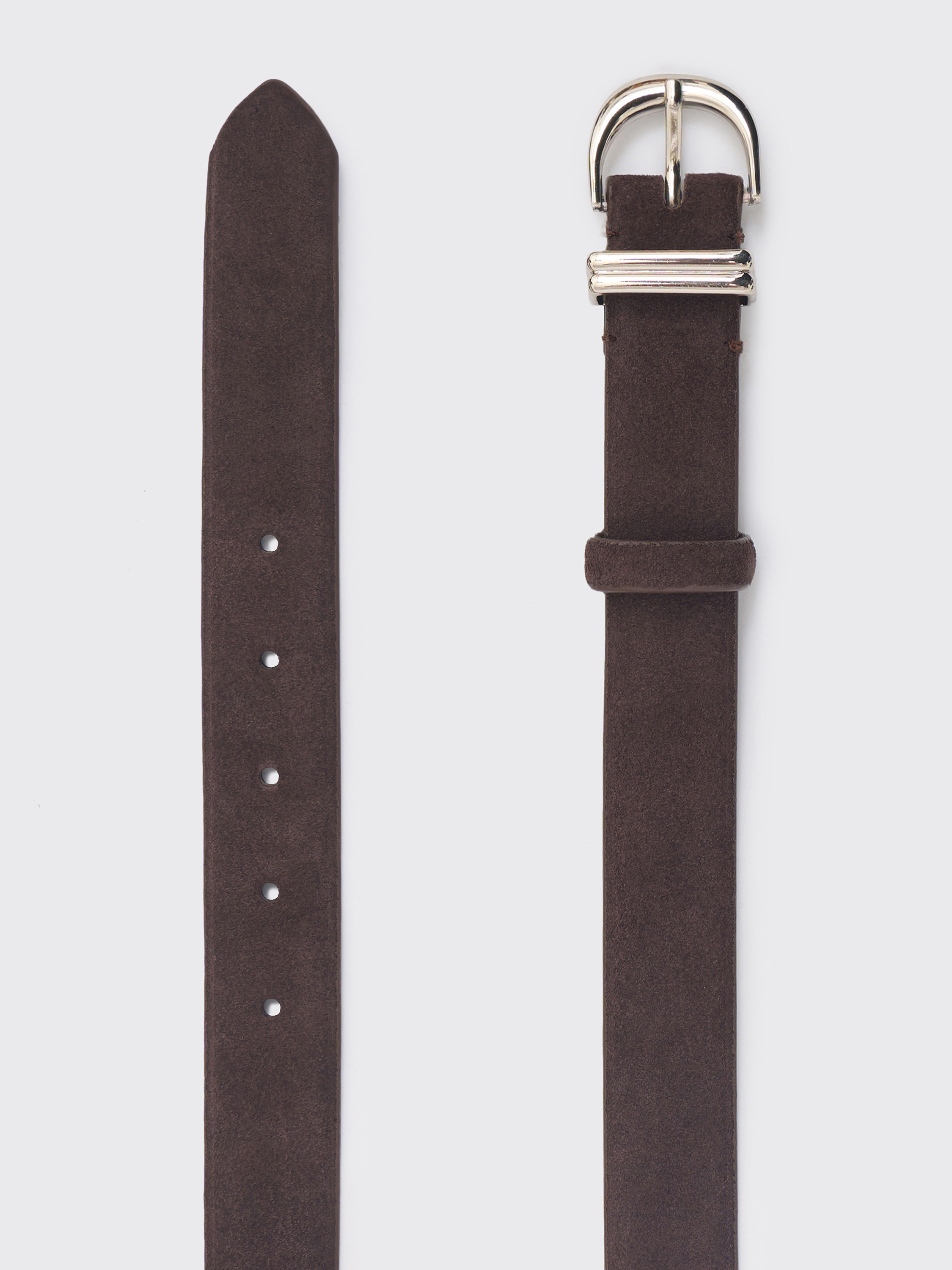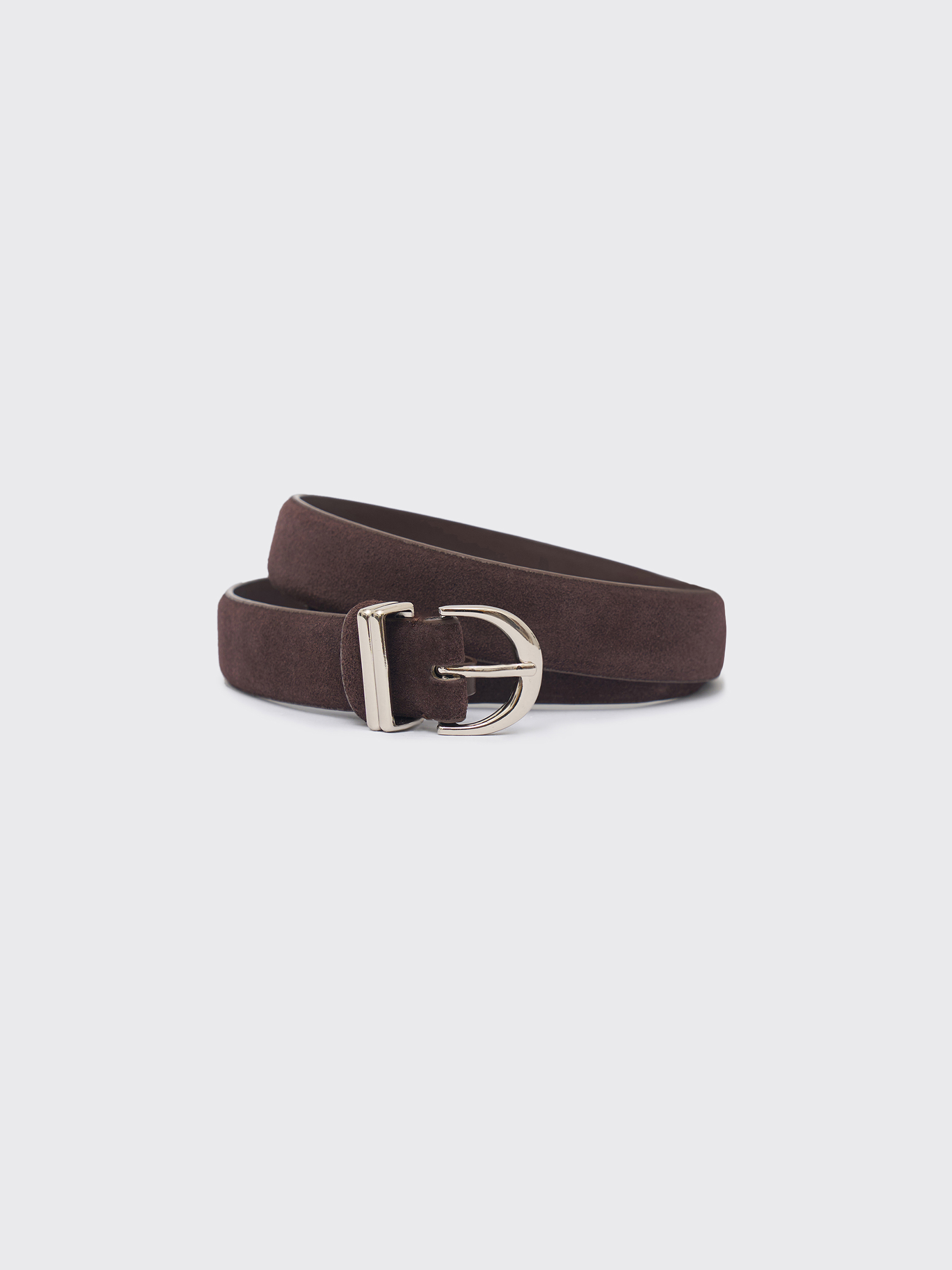 Ремень из натуральной замши с мягкой бархатистой поверхностью и аккуратной металлической пряжкой. Классическая форма и сдержанный дизайн позволяют использовать аксессуар как в повседневных, так и в более собранных образах. Благодаря плотной структуре материал сохраняет форму, а деликатная фактура придает образу визуальную глубину и ощущение тактильного комфорта.
