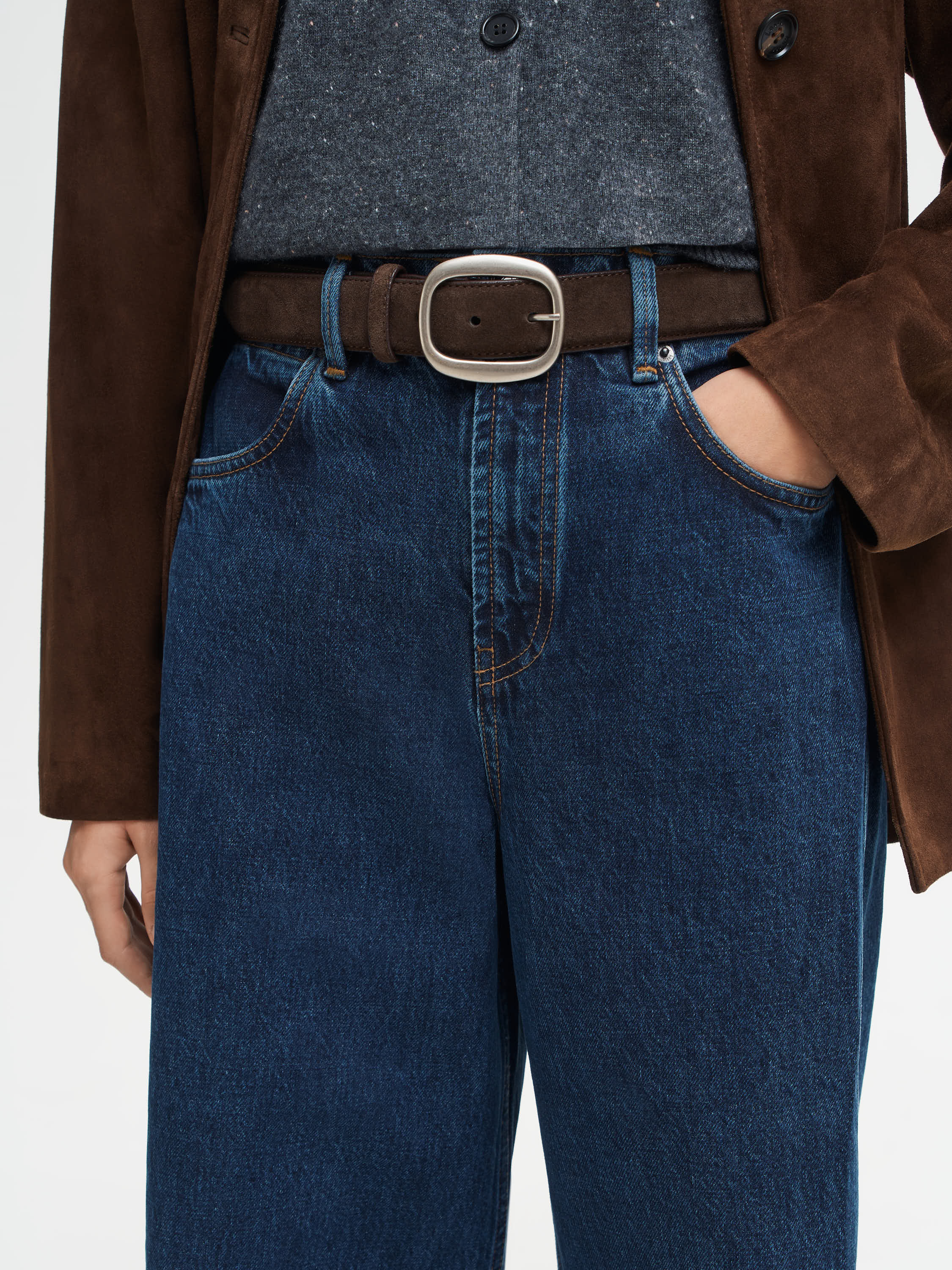 Ремень из натуральной замши с матовой текстурой и лаконичной пряжкой из металла с мягким блеском. Плотная, бархатистая на ощупь замша делает аксессуар выразительным, но сдержанным — идеальное решение для повседневных образов. Благодаря нейтральному оттенку и классической форме ремень органично сочетается с денимом, шерстью и замшей, подчеркивая линию талии и добавляя акцент в минималистичные комплекты.