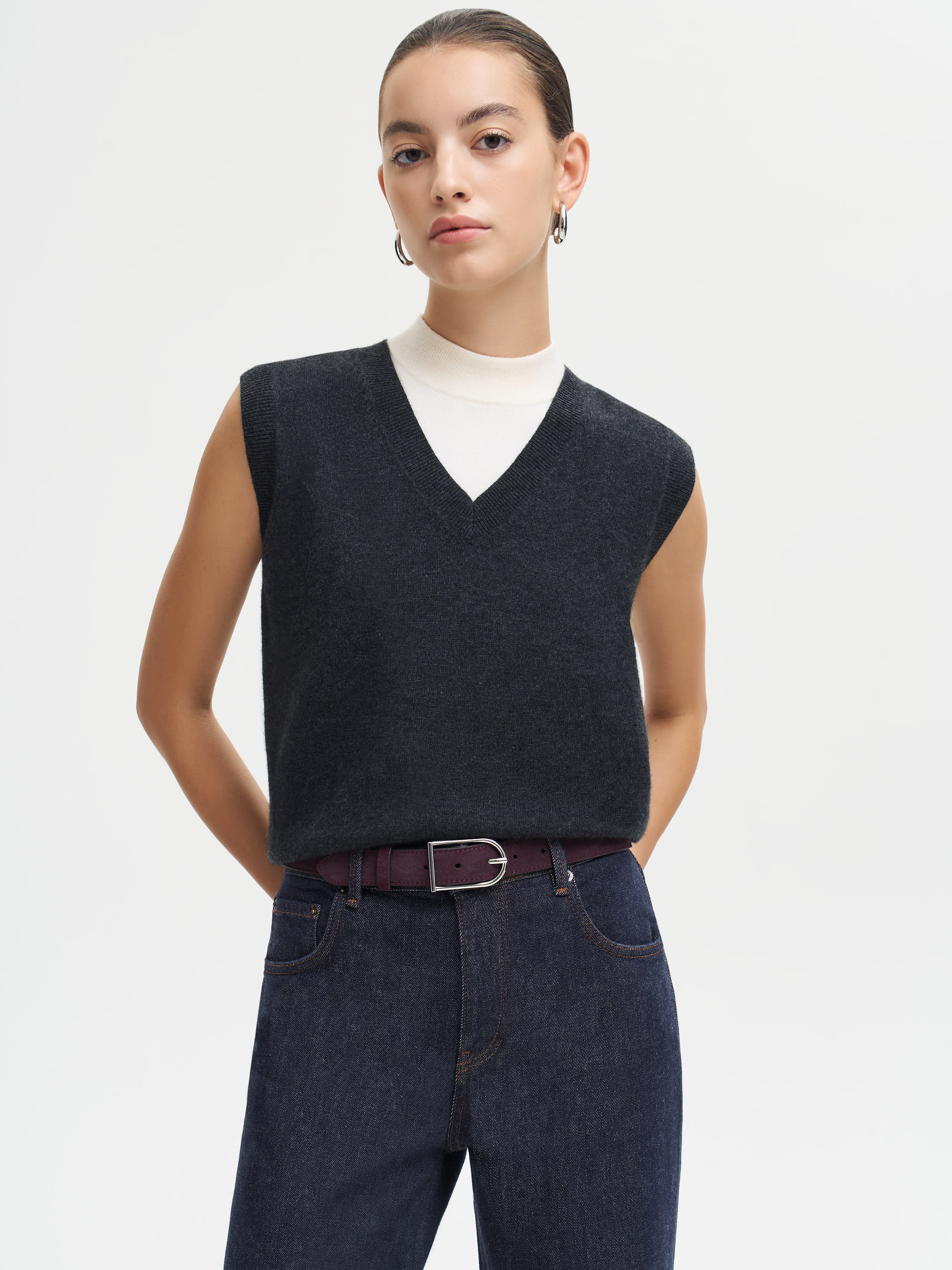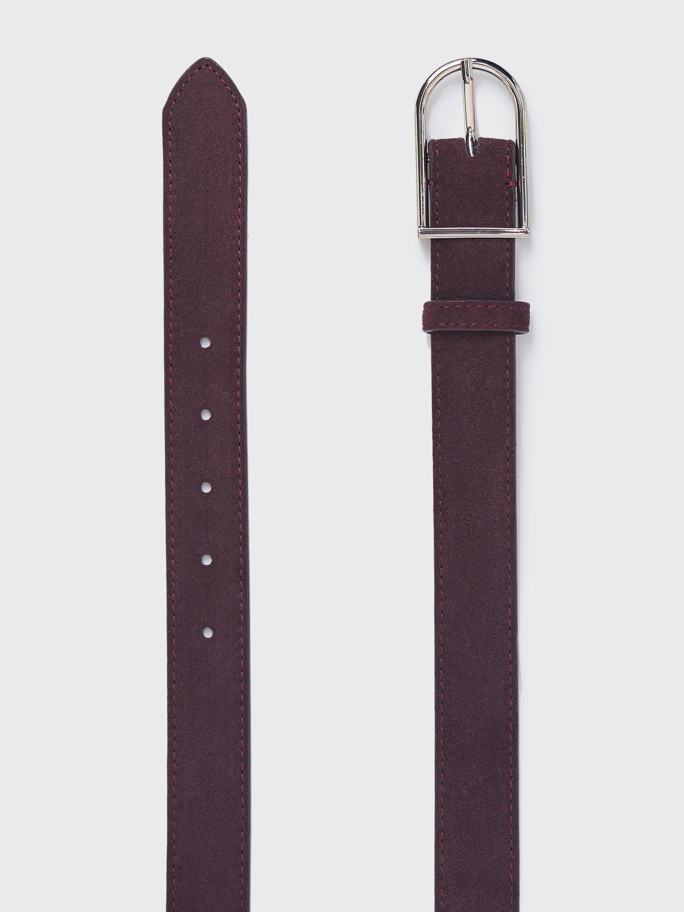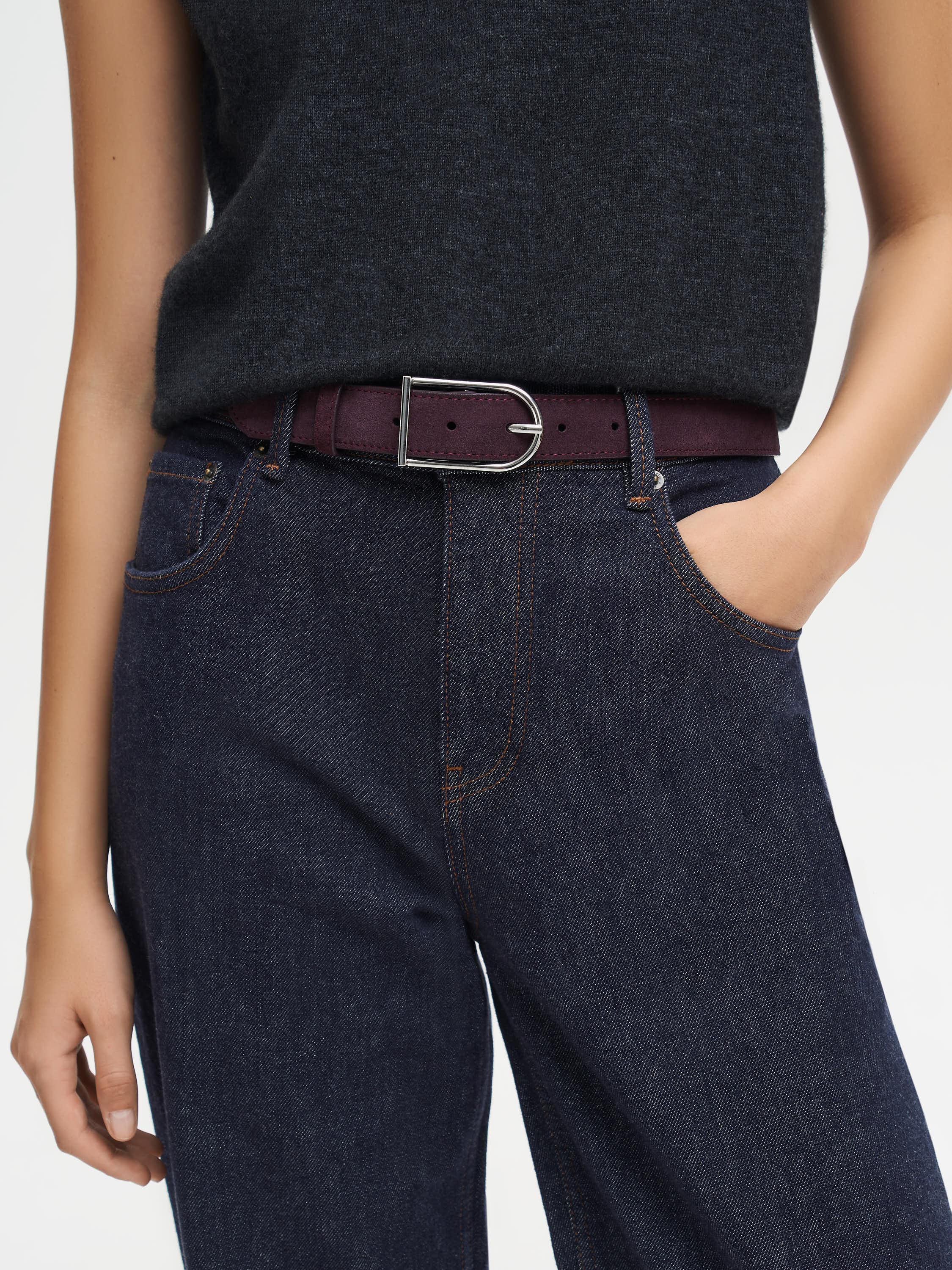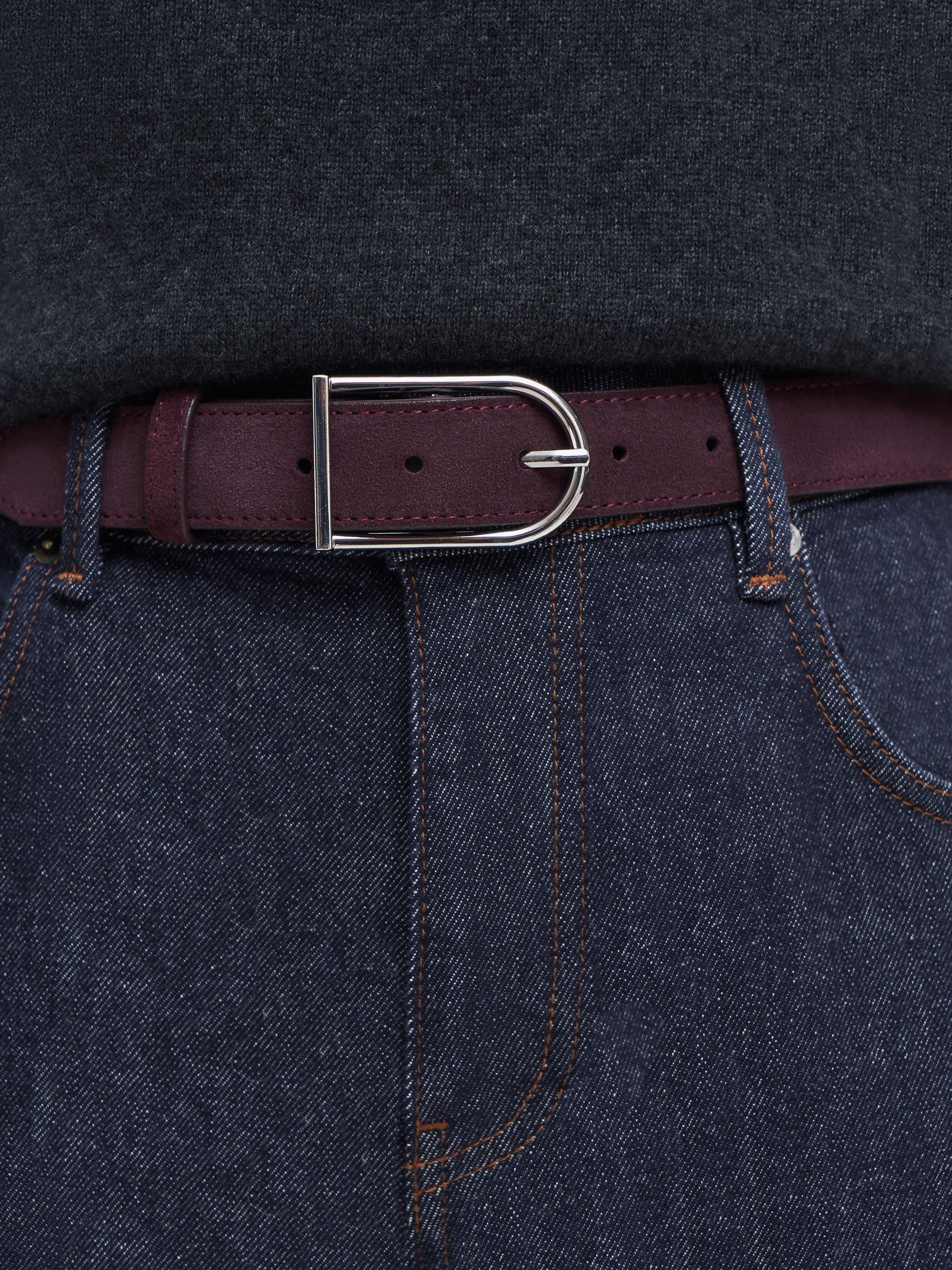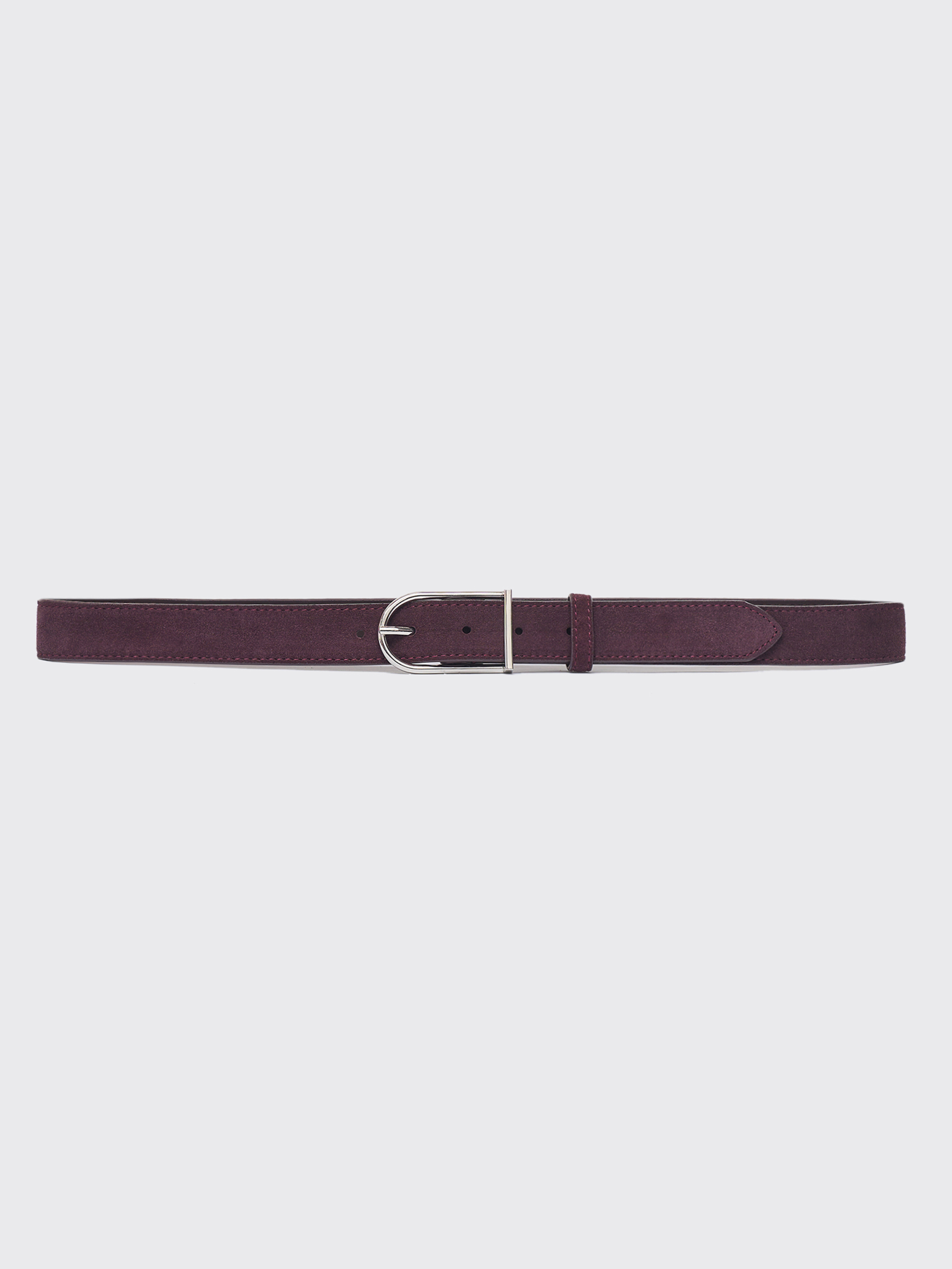 Ремень из мягкой натуральной замши с характерной бархатистой фактурой и матовым финишем. Актуальная ширина делает его универсальным: он подходит как для классических брюк, так и для акцентного ношения поверх жакета или платья. Пряжка округлой формы с лаконичным блеском металла уравновешивает мягкость замши, создавая продуманное сочетание материалов. Аккуратная строчка и плотная основа подчеркивают качество исполнения и сохраняют форму при носке.