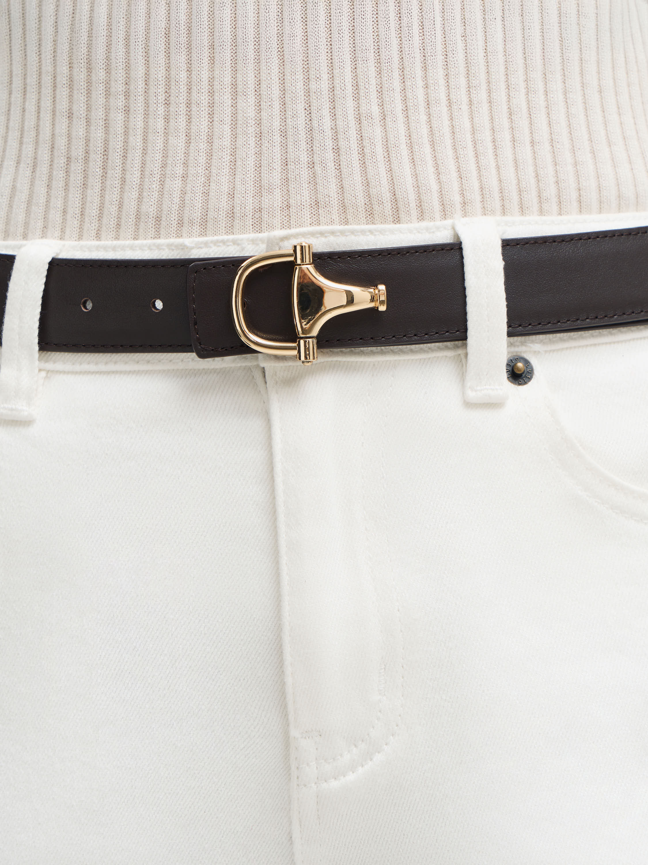 Ремень из гладкой кожи с классической пряжкой в лаконичном исполнении. Умеренная ширина позволяет сочетать аксессуар как с брюками, так и с юбками, подчеркивая талию и завершая образ. Структура кожи обеспечивает прочность и износостойкость, сохраняя при этом аккуратный внешний вид. Минималистичный дизайн делает ремень универсальной деталью гардероба, которая органично вписывается в повседневные и более формальные комплекты.