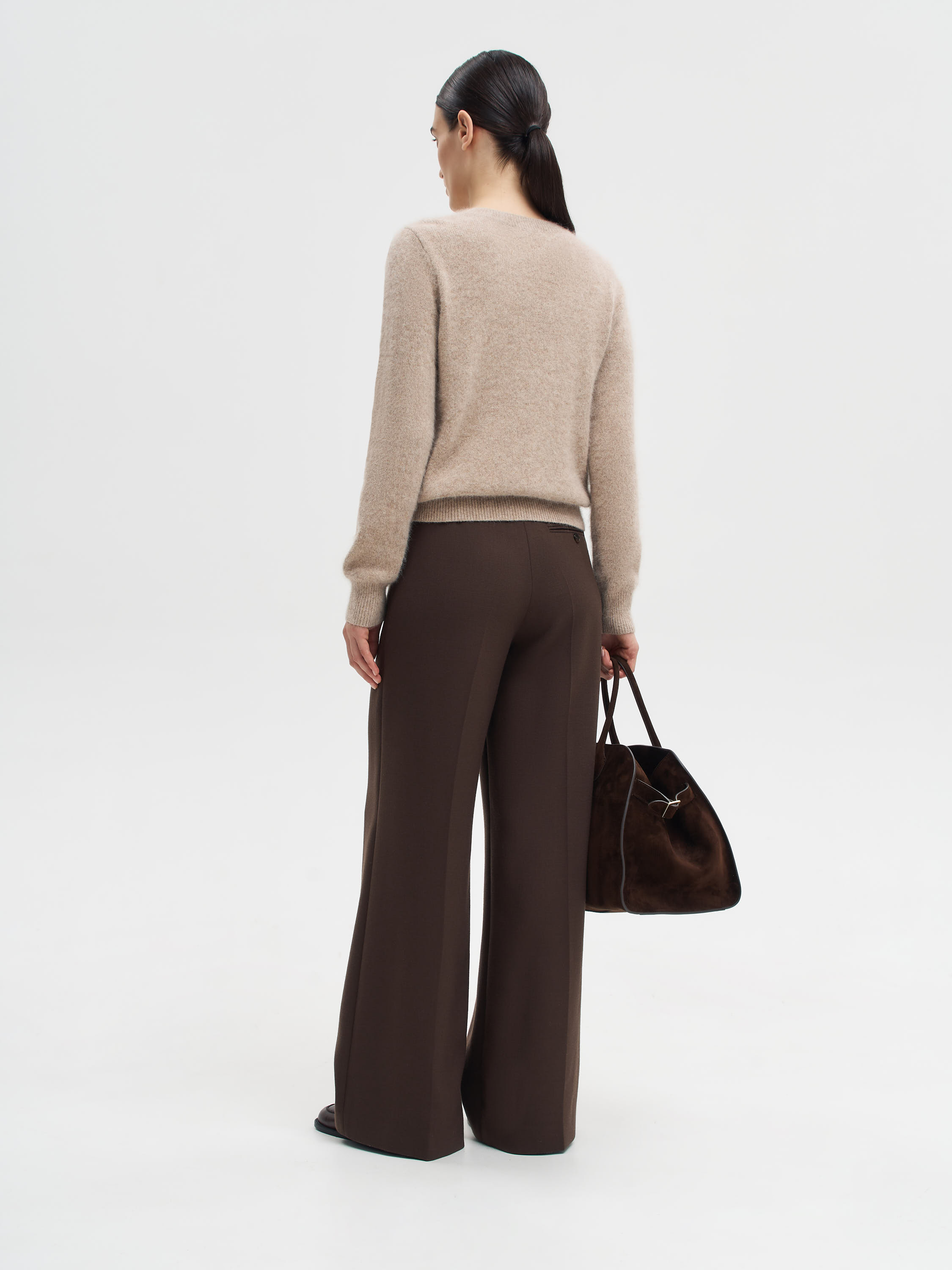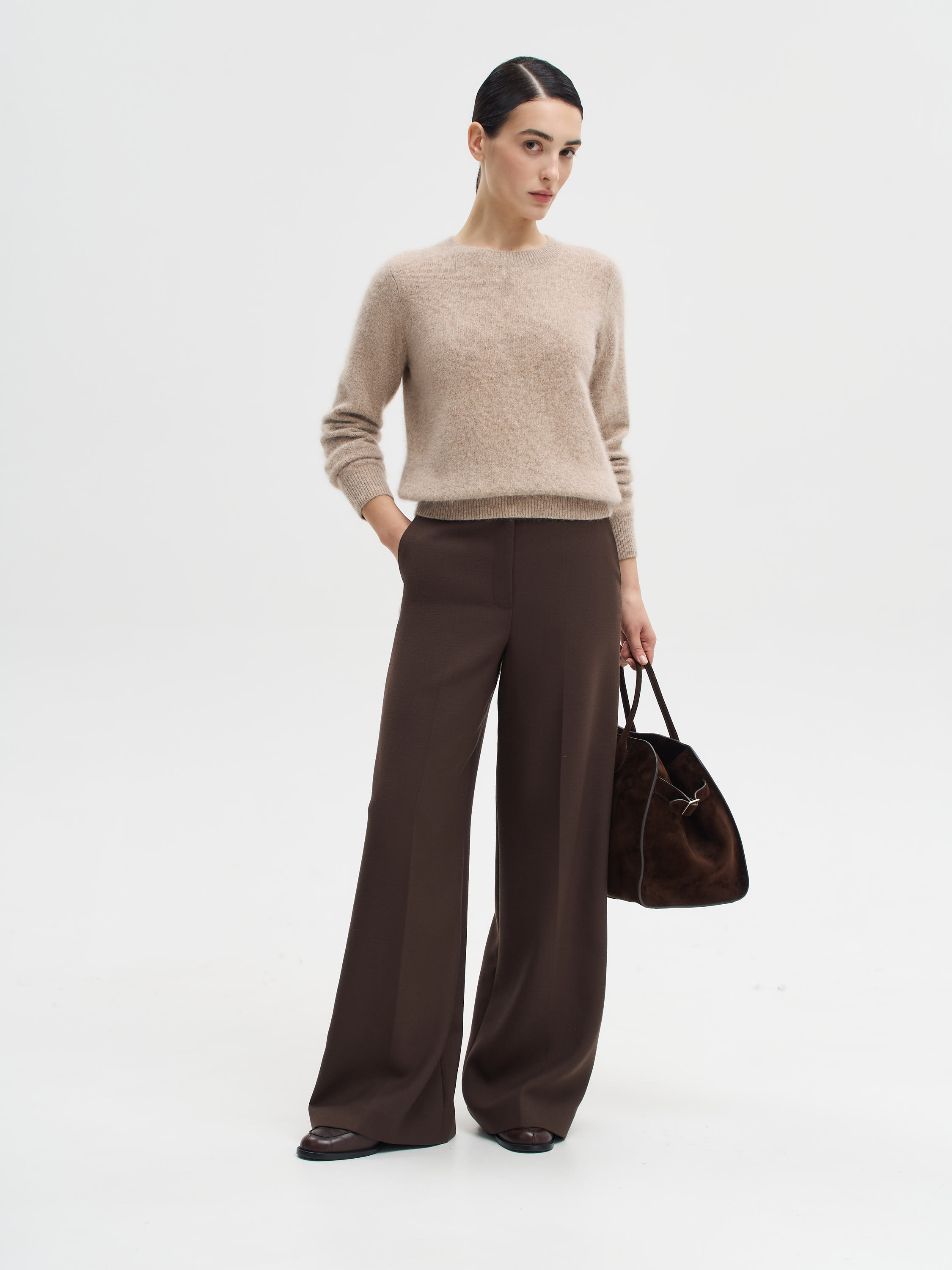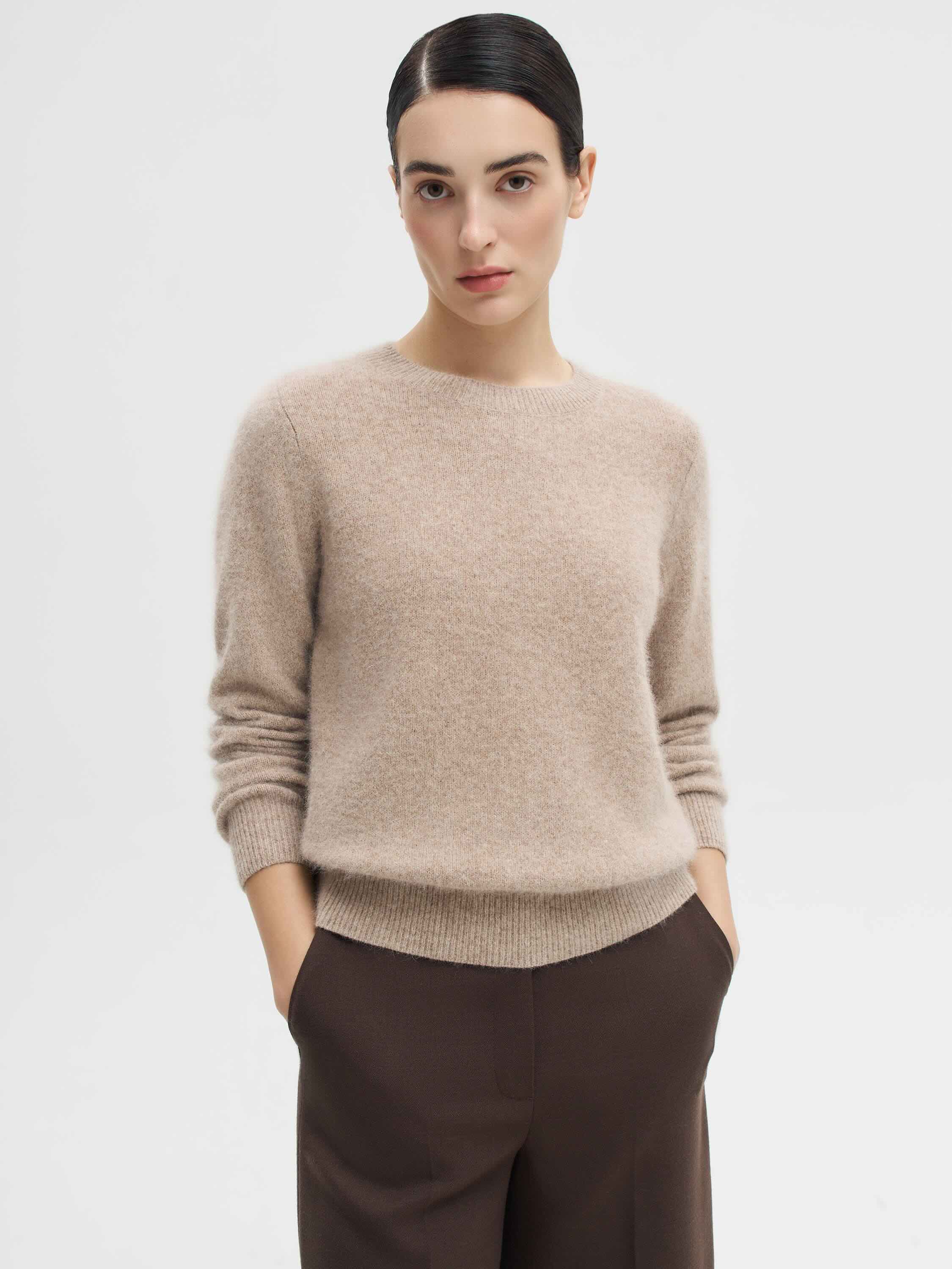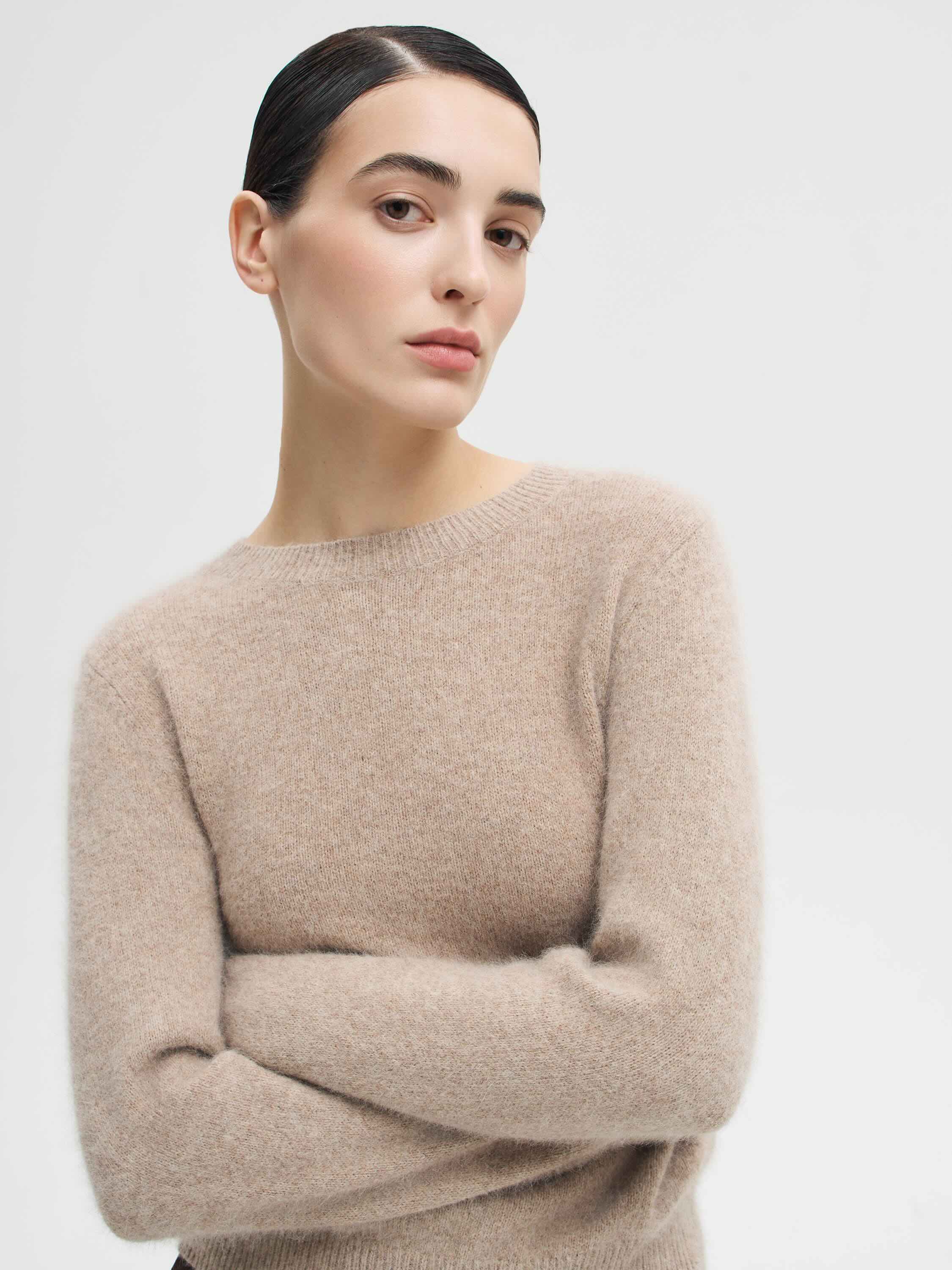 Джемпер из трикотажного полотна с высоким содержанием шерсти енота сразу выделяется своей выразительной фактурой. Мягкий ворс создает объем и характерную «пушистость», благодаря чему модель выглядит особенно уютной и в то же время утонченной. Прямой силуэт и базовый крой позволяют легко вписывать джемпер в повседневные и более собранные образы. Это редкая вещь, которая делает акцент на материале и его естественной красоте.