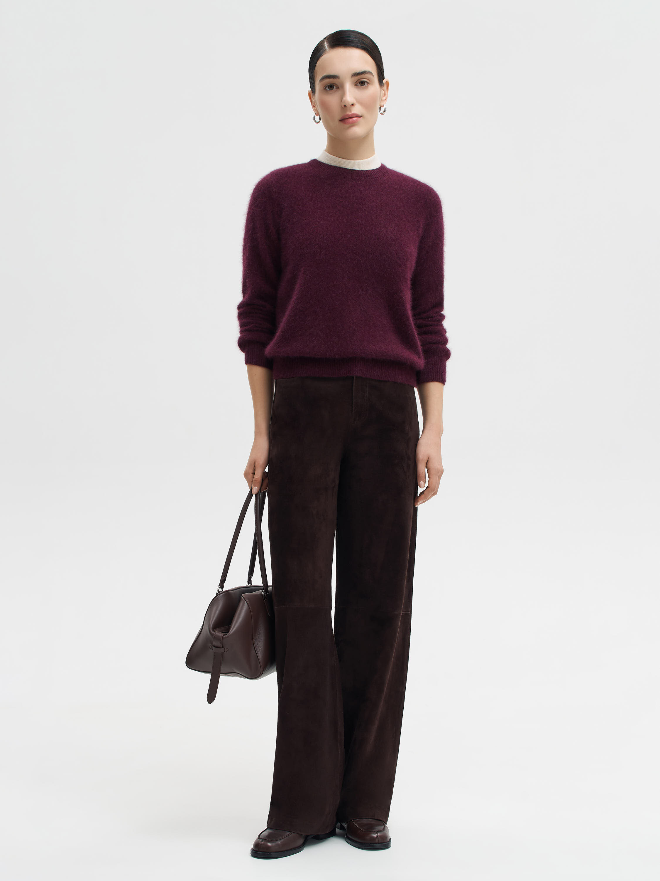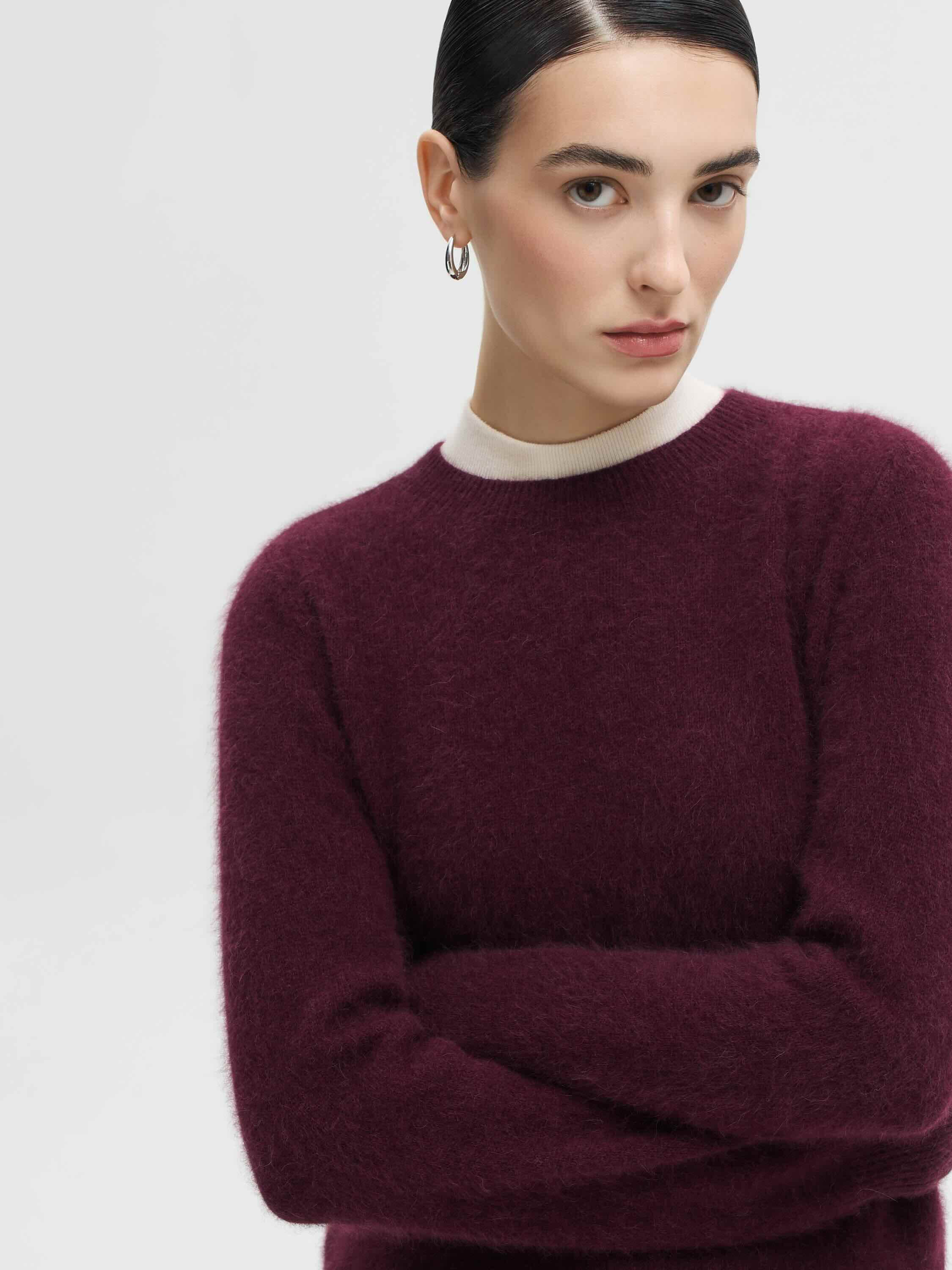 Джемпер из трикотажного полотна с высоким содержанием шерсти енота сразу выделяется своей выразительной фактурой. Мягкий ворс создает объем и характерную «пушистость», благодаря чему модель выглядит особенно уютной и в то же время утонченной. Прямой силуэт и базовый крой позволяют легко вписывать джемпер в повседневные и более собранные образы. Это редкая вещь, которая делает акцент на материале и его естественной красоте.