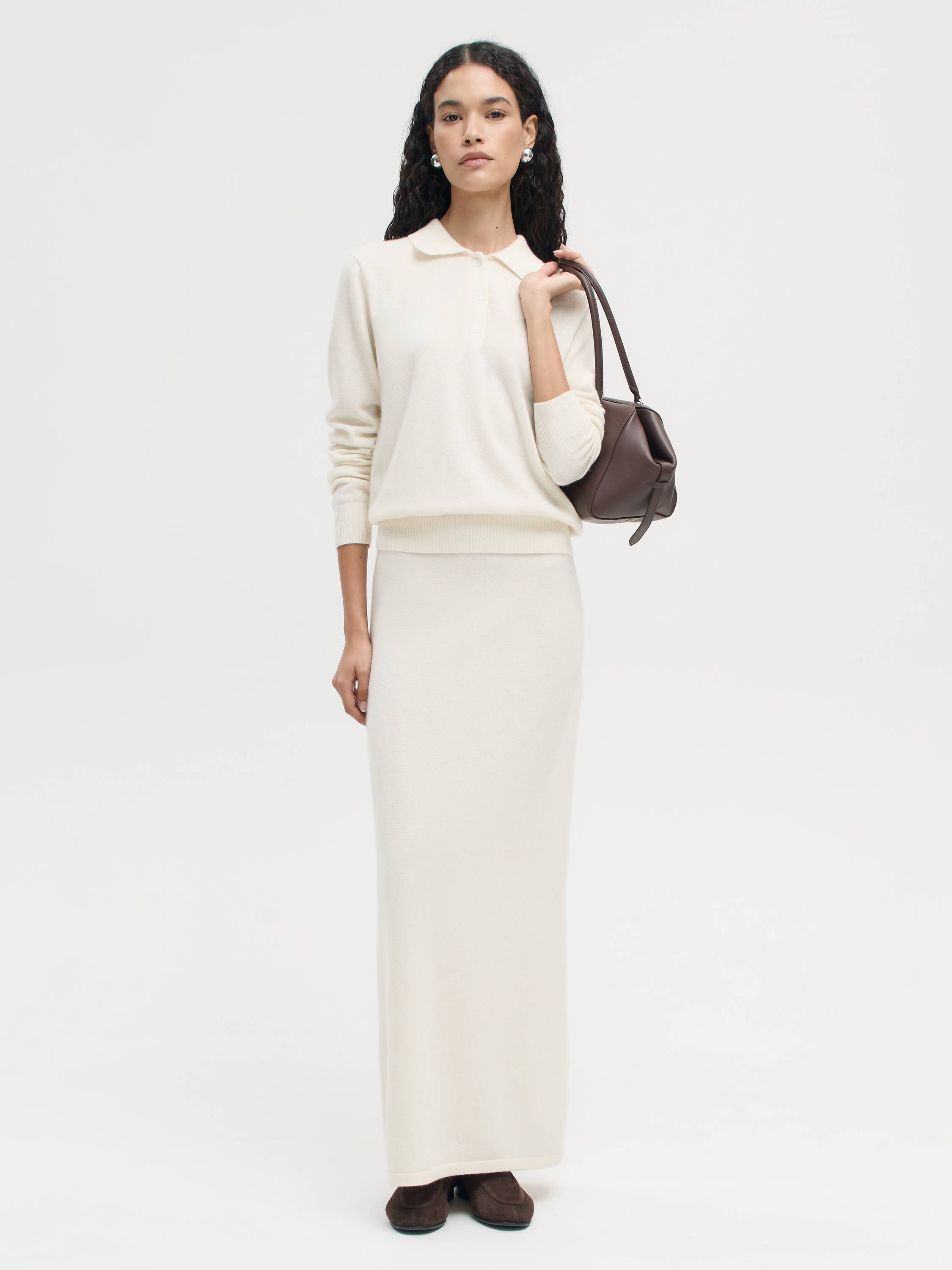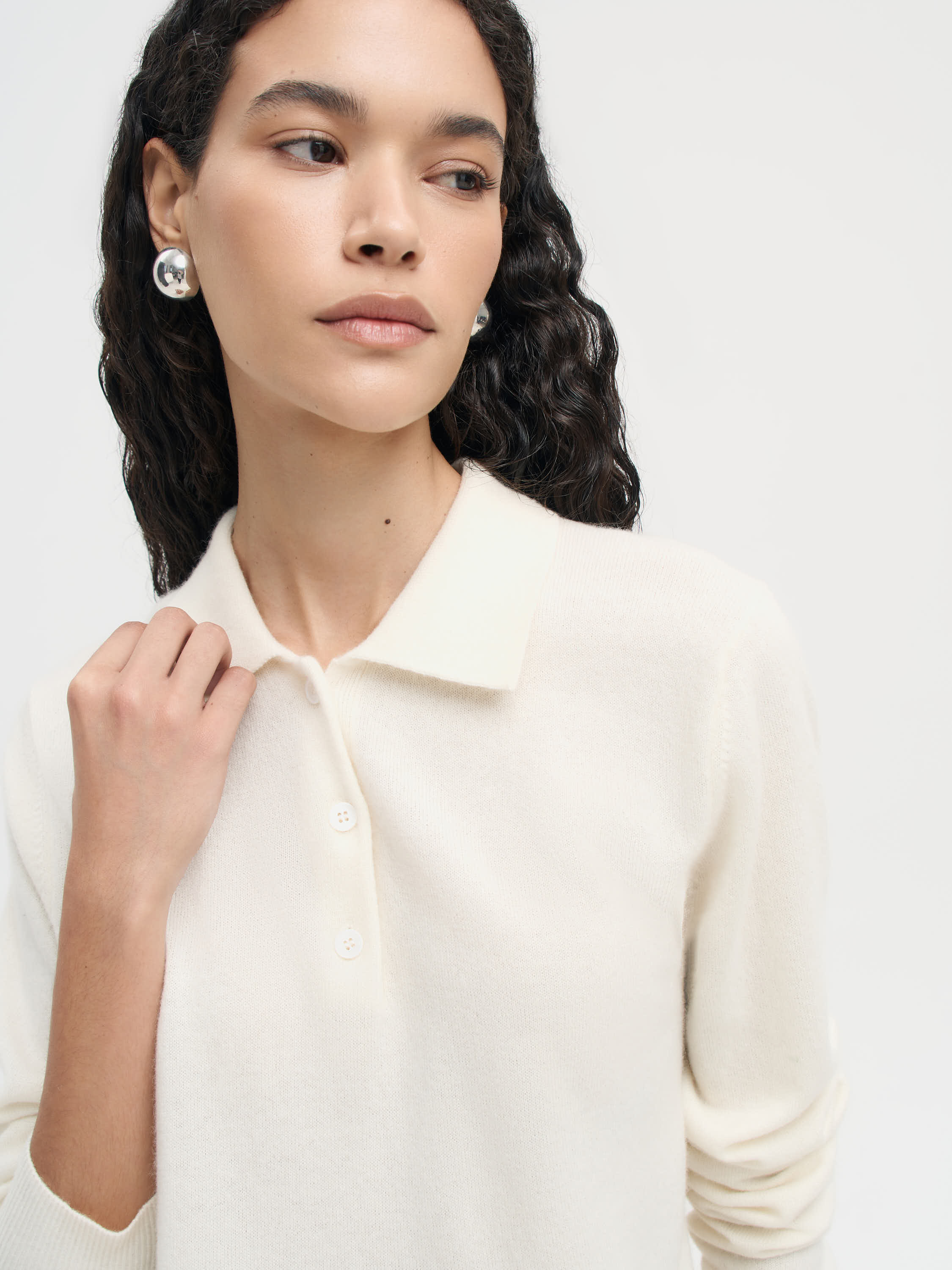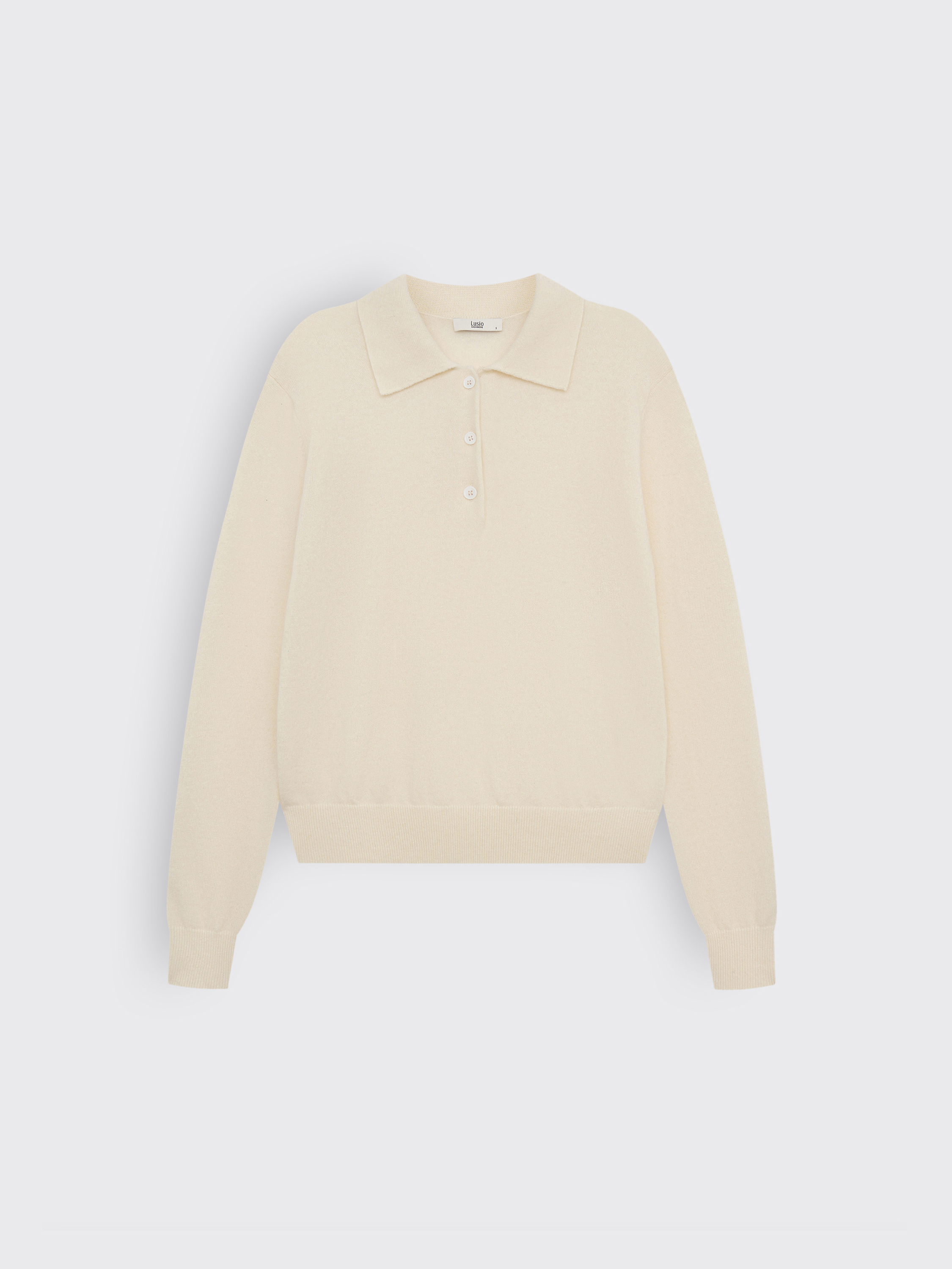 Джемпер из мягкой пряжи на основе шерсти мериноса с добавлением кашемира. Материал тонкий, пластичный, с выраженной мягкостью и приятным теплом, комфортен при носке в прохладный сезон. Крой прямой, с отложным воротником-поло и планкой на пуговицах, что придает модели непринужденный характер. Длинные рукава дополнены плотными манжетами, низ — с эластичной резинкой, формирующей аккуратный силуэт. Джемпер универсален для повседневных и более собранных образов: сочетается с широкими или прямыми брюками, юбками миди, а также вписывается в комплекты с жакетами, жилетами или пальто.