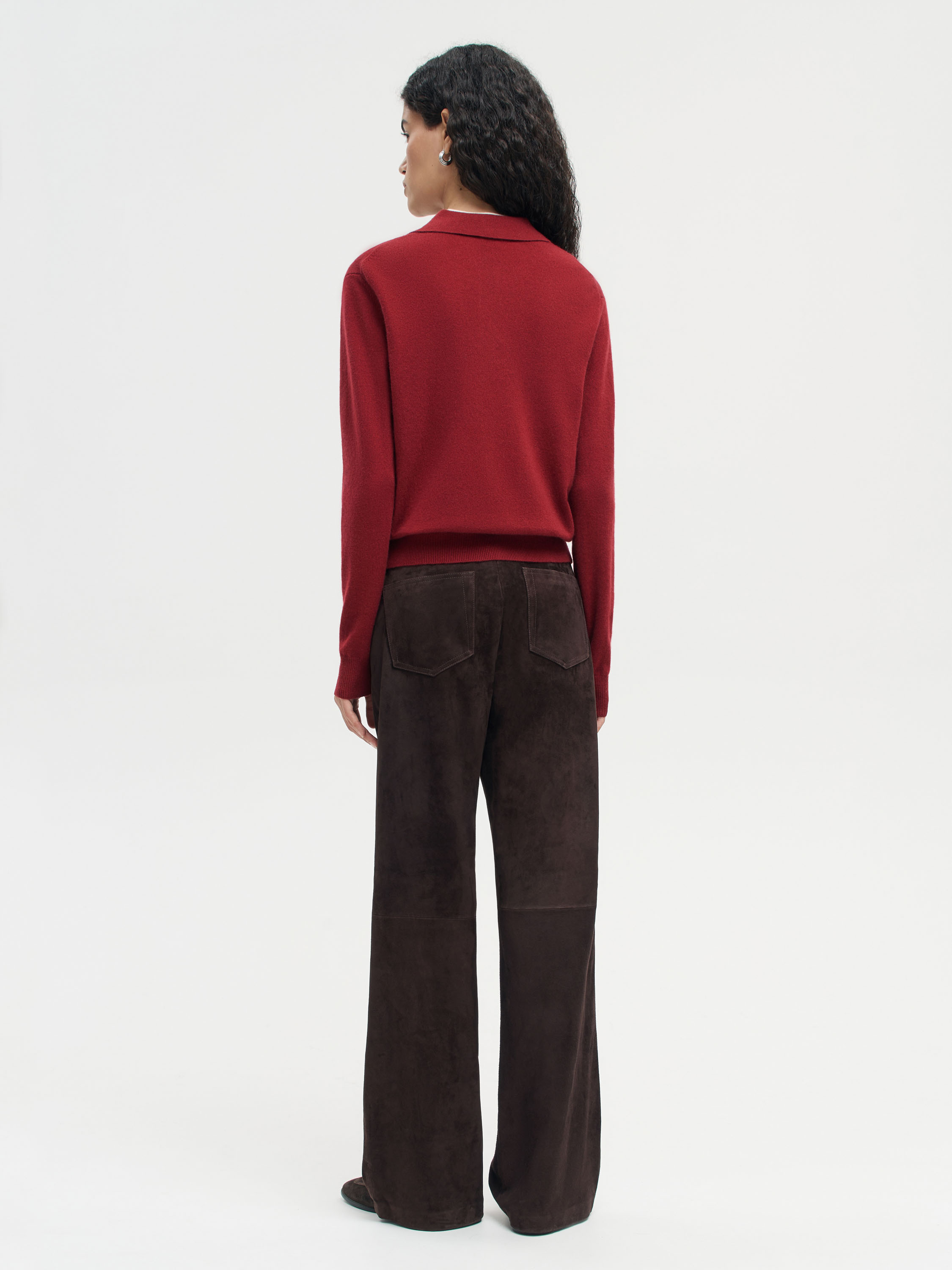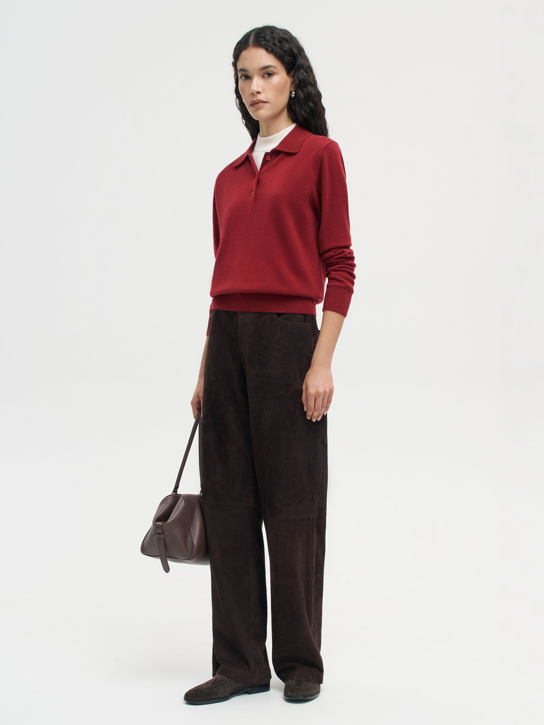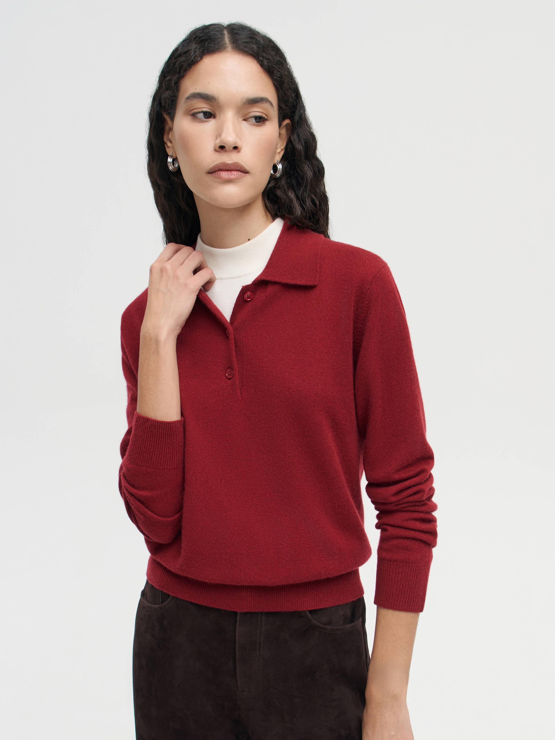 Джемпер из мягкой пряжи на основе шерсти мериноса с добавлением кашемира. Материал тонкий, пластичный, с выраженной мягкостью и приятным теплом, комфортен при носке в прохладный сезон. Крой прямой, с отложным воротником-поло и планкой на пуговицах, что придает модели непринужденный характер. Длинные рукава дополнены плотными манжетами, низ — с эластичной резинкой, формирующей аккуратный силуэт. Джемпер универсален для повседневных и более собранных образов: сочетается с широкими или прямыми брюками, юбками миди, а также вписывается в комплекты с жакетами, жилетами или пальто.