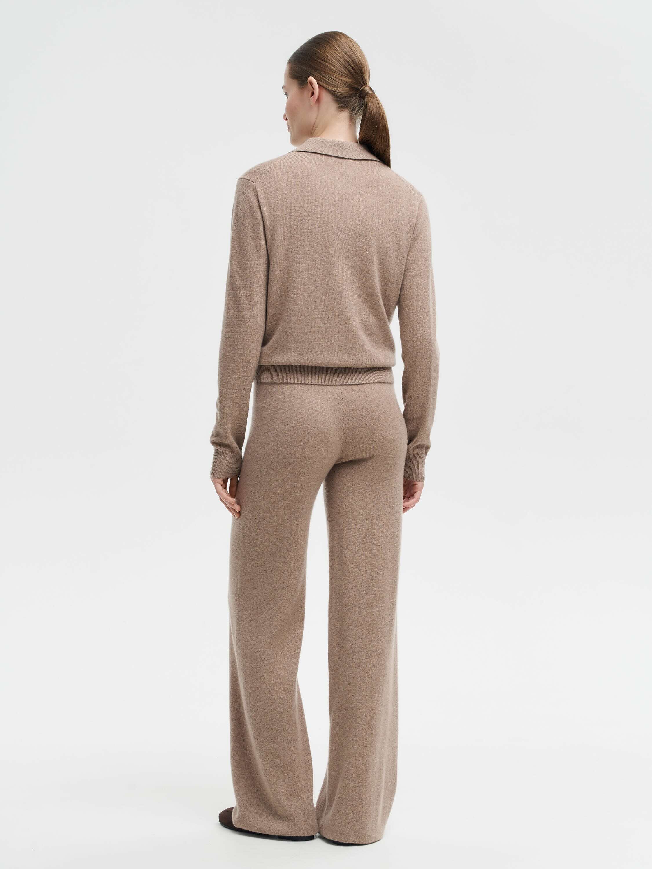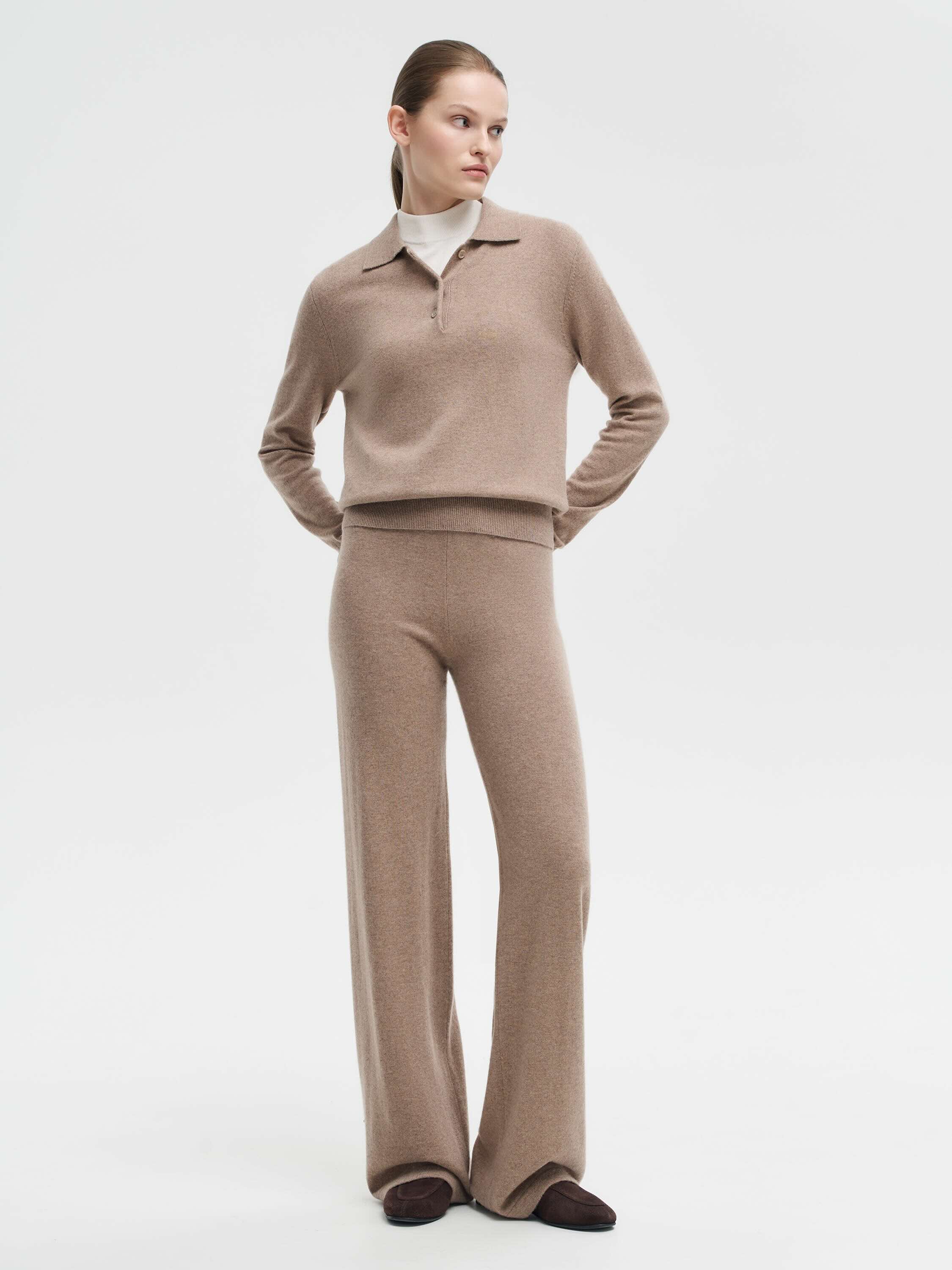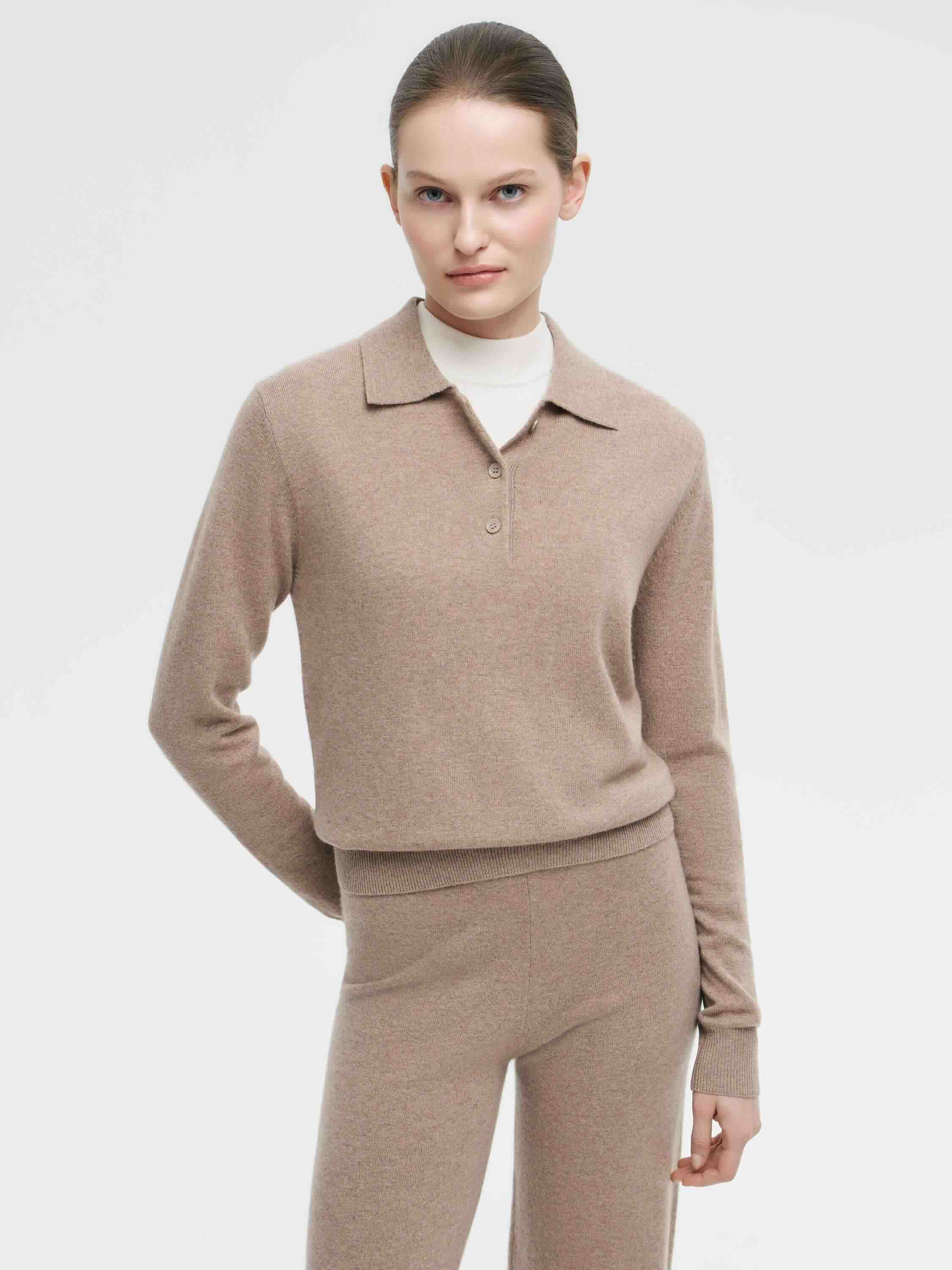 Джемпер из мягкой пряжи на основе шерсти мериноса с добавлением кашемира. Материал тонкий, пластичный, с выраженной мягкостью и приятным теплом, комфортен при носке в прохладный сезон. Крой прямой, с отложным воротником-поло и планкой на пуговицах, что придает модели непринужденный характер. Длинные рукава дополнены плотными манжетами, низ — с эластичной резинкой, формирующей аккуратный силуэт. Джемпер универсален для повседневных и более собранных образов: сочетается с широкими или прямыми брюками, юбками миди, а также вписывается в комплекты с жакетами, жилетами или пальто.