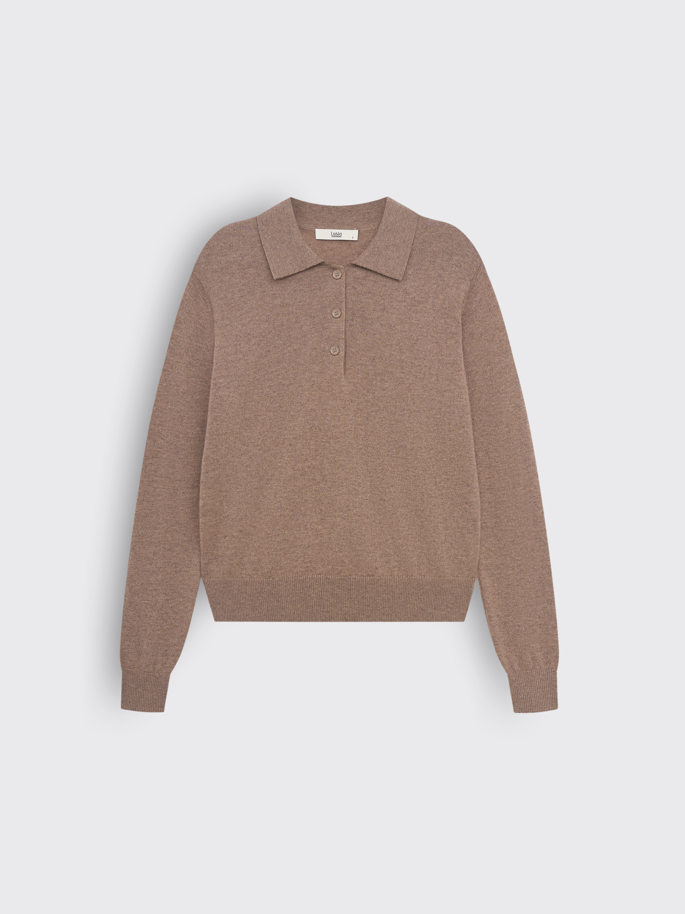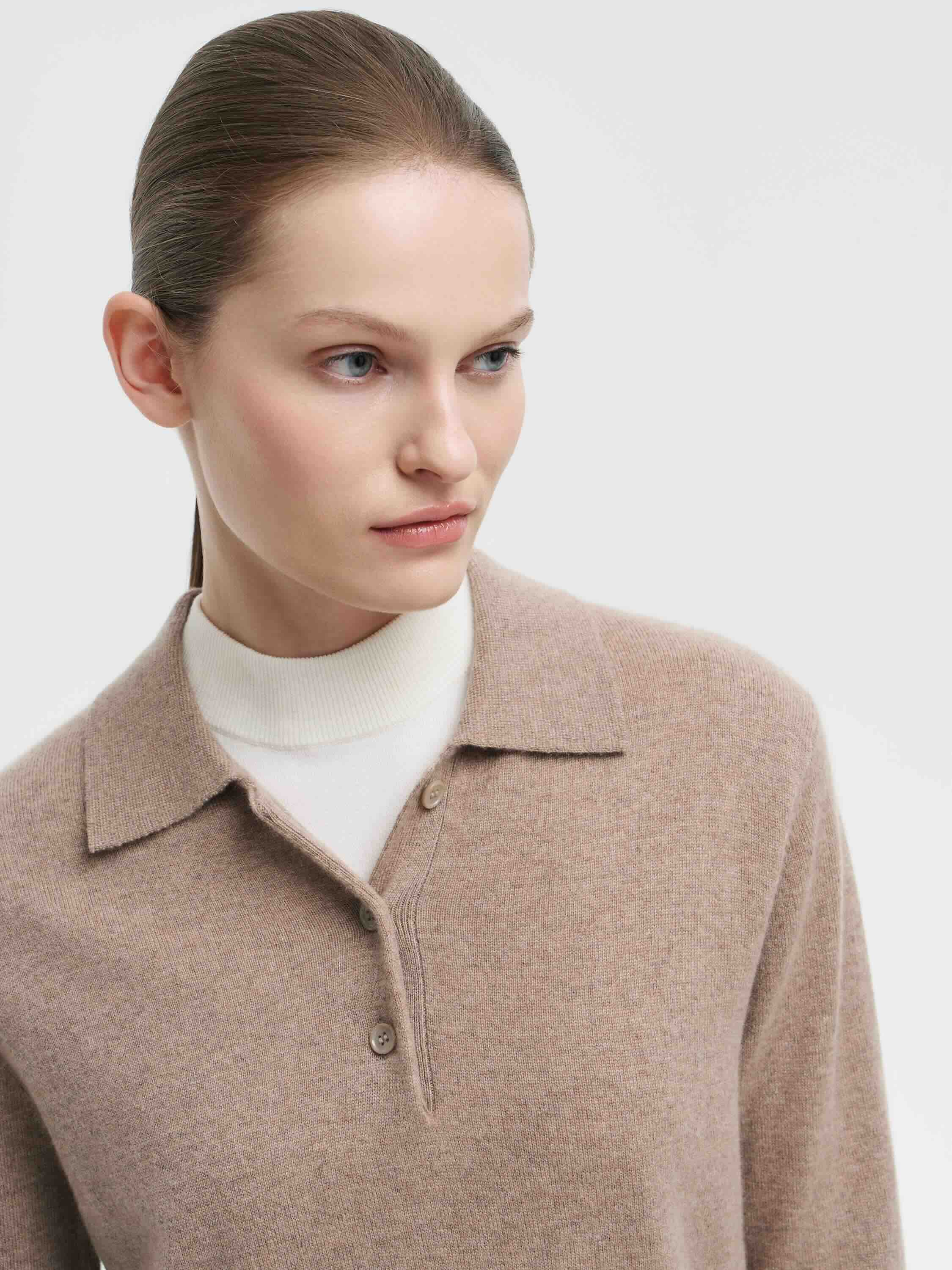 Джемпер из мягкой пряжи на основе шерсти мериноса с добавлением кашемира. Материал тонкий, пластичный, с выраженной мягкостью и приятным теплом, комфортен при носке в прохладный сезон. Крой прямой, с отложным воротником-поло и планкой на пуговицах, что придает модели непринужденный характер. Длинные рукава дополнены плотными манжетами, низ — с эластичной резинкой, формирующей аккуратный силуэт. Джемпер универсален для повседневных и более собранных образов: сочетается с широкими или прямыми брюками, юбками миди, а также вписывается в комплекты с жакетами, жилетами или пальто.