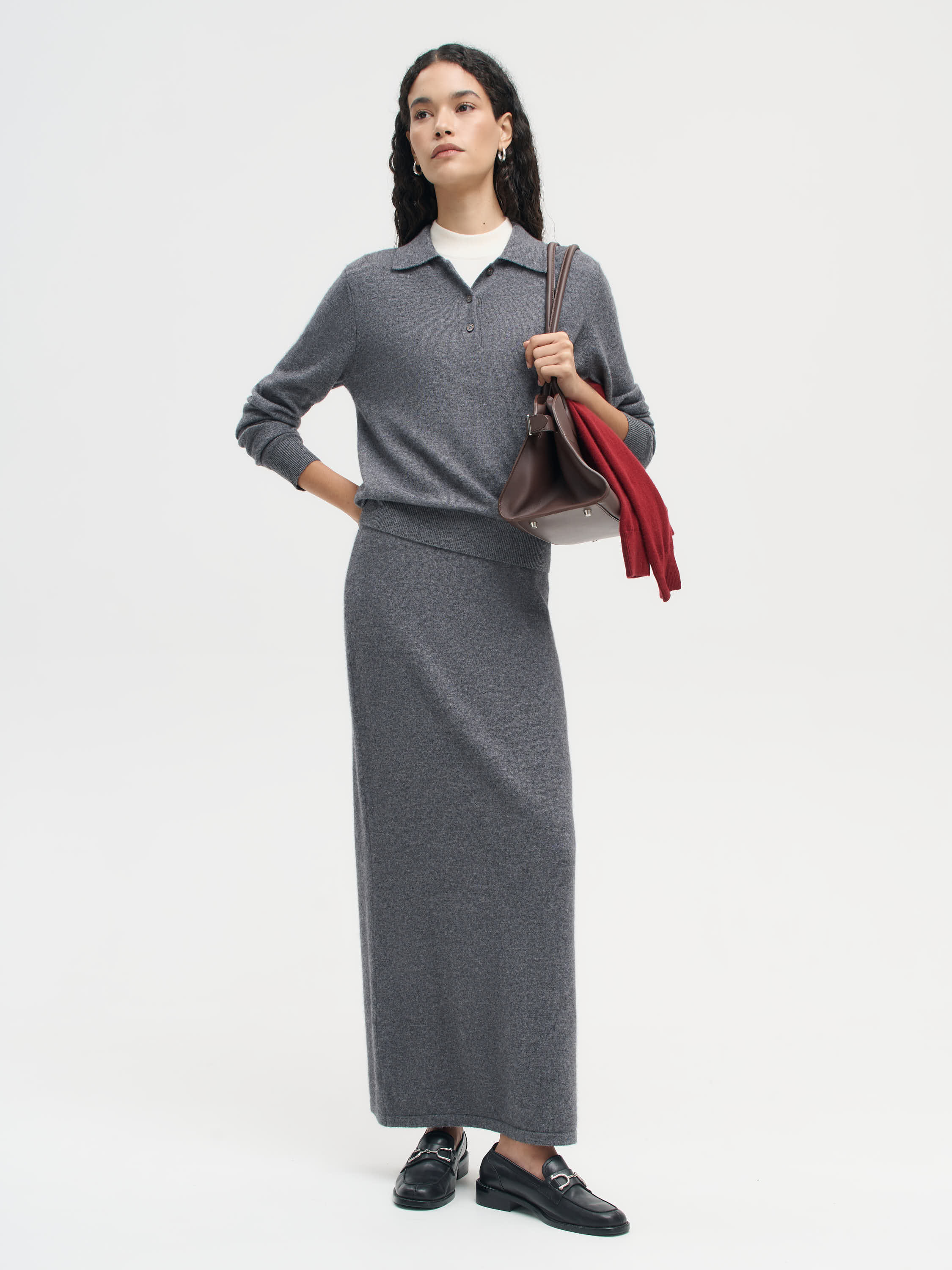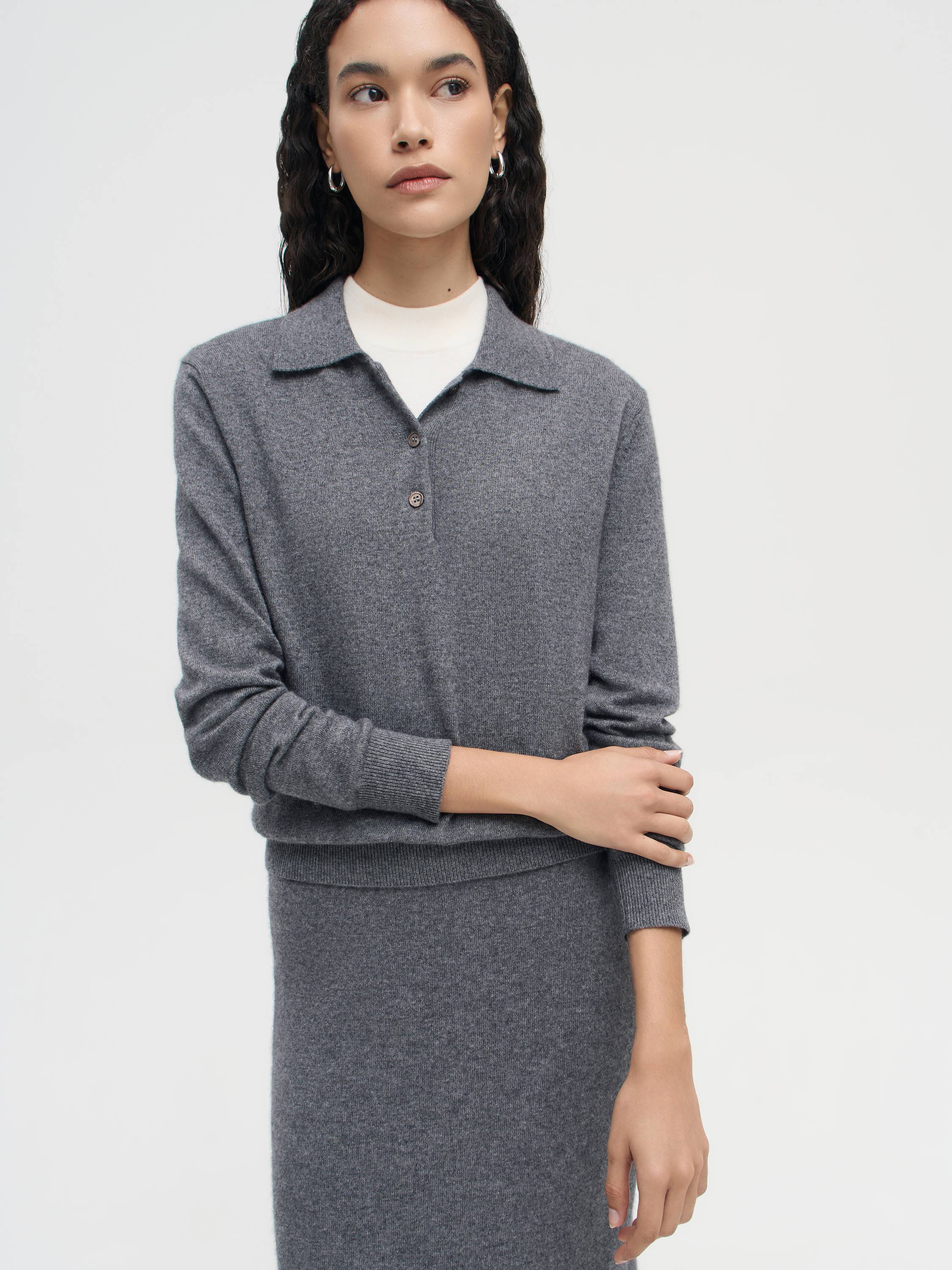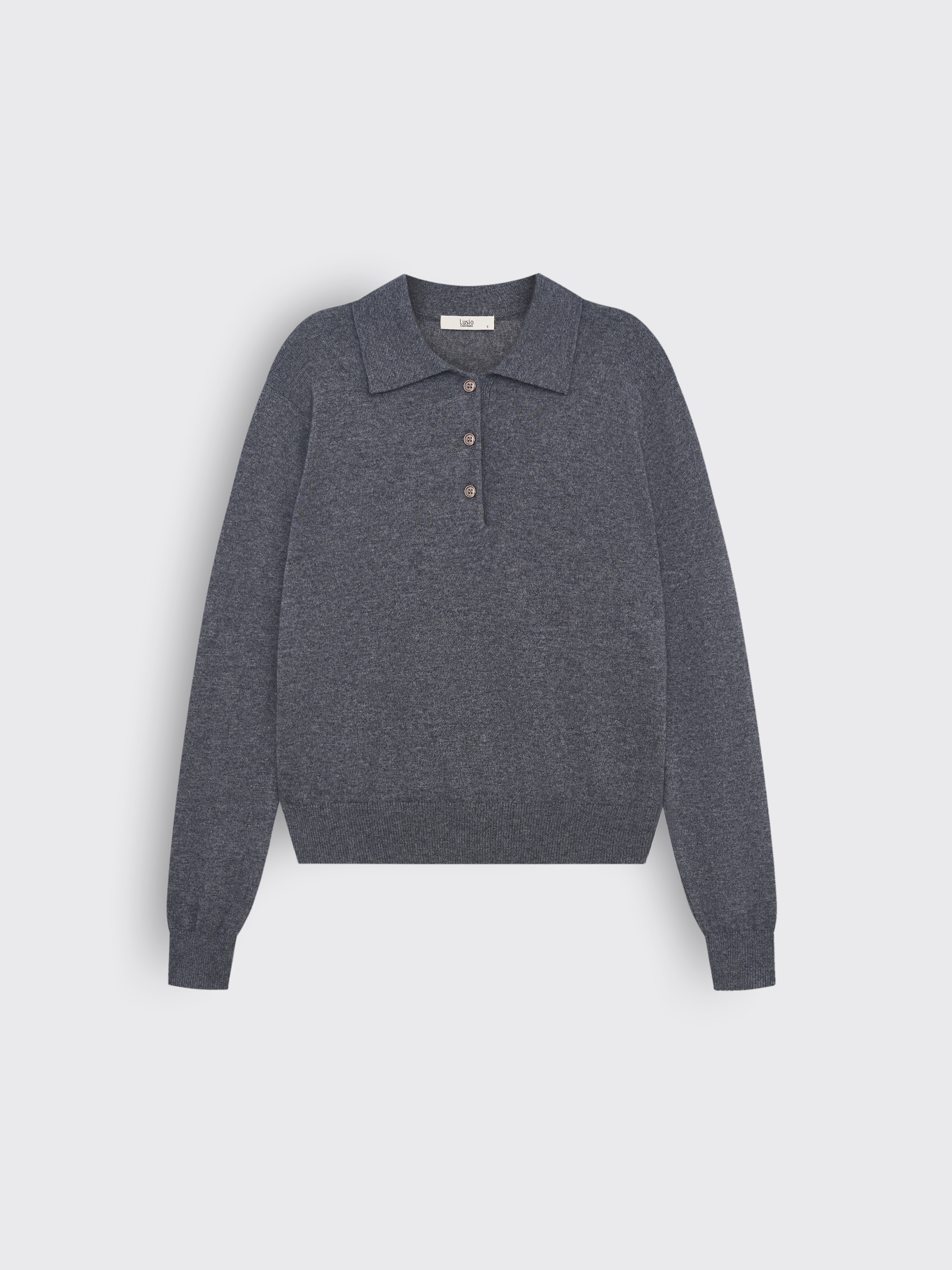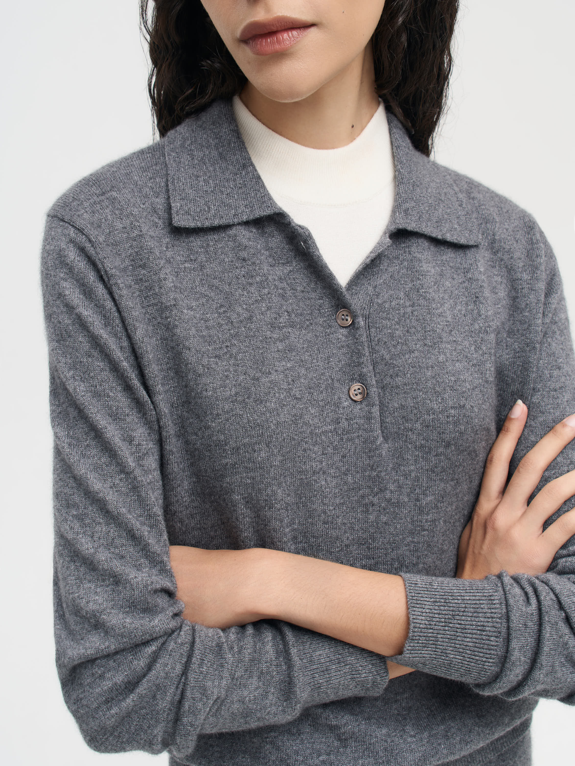 Джемпер из мягкой пряжи на основе шерсти мериноса с добавлением кашемира. Материал тонкий, пластичный, с выраженной мягкостью и приятным теплом, комфортен при носке в прохладный сезон. Крой прямой, с отложным воротником-поло и планкой на пуговицах, что придает модели непринужденный характер. Длинные рукава дополнены плотными манжетами, низ — с эластичной резинкой, формирующей аккуратный силуэт. Джемпер универсален для повседневных и более собранных образов: сочетается с широкими или прямыми брюками, юбками миди, а также вписывается в комплекты с жакетами, жилетами или пальто.