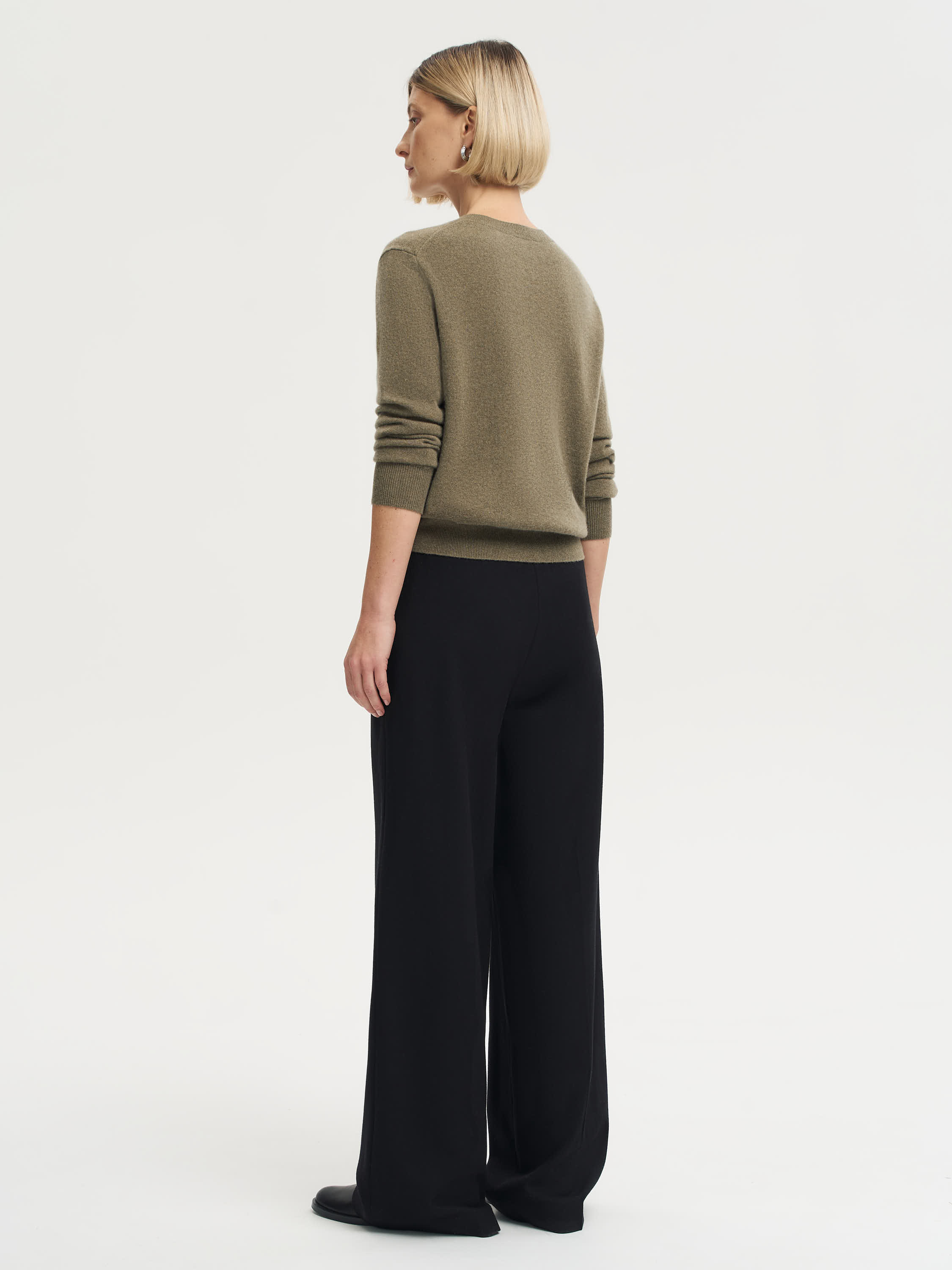 Джемпер выполнен из мягкого и теплого трикотажа с добавлением кашемира и тонкой шерсти мериноса, благодаря чему он приятен к телу и сохраняет тепло без лишнего объема. Классический круглый вырез и лаконичный крой делают модель универсальной — она легко вписывается как в повседневные, так и в более собранные образы. Плотная резинка по линии горловины, манжет и низа обеспечивает аккуратную посадку. Представлен в двух светлых оттенках — нежный кремовый и теплый бежевый — которые подчеркивают деликатность фактуры и сочетаются с любой базовой палитрой.