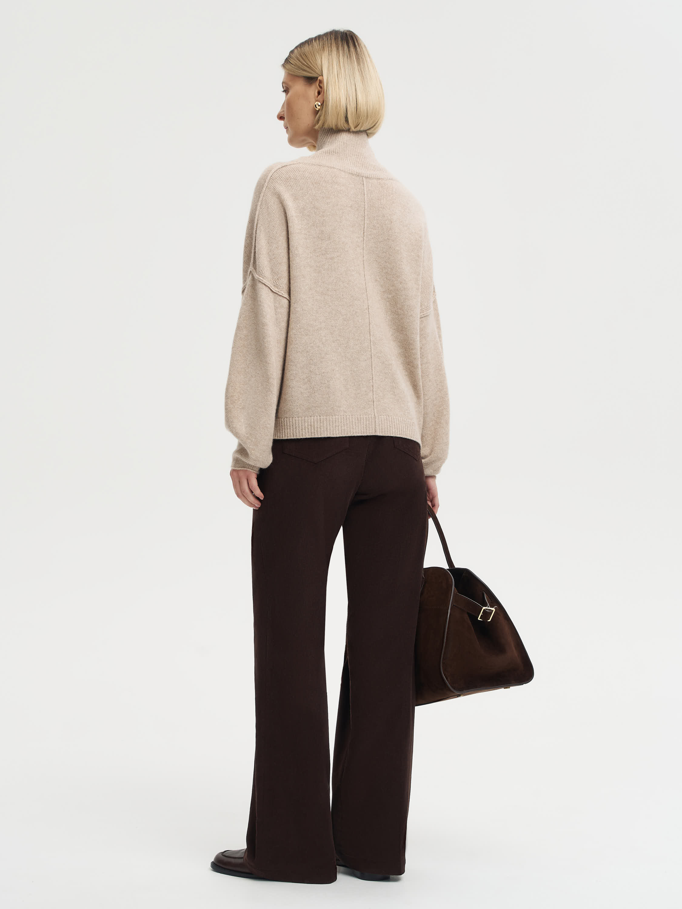 Джемпер из шерсти мериноса и кашемира с мягкой, уютной текстурой и выразительной вертикальной линией по центру переда. Модель со спущенной линией плеча и свободной посадкой создает расслабленный, но собранный силуэт. Объемные рукава придают образу мягкость и пластичность, а высокий воротник-гольф добавляет ощущение тепла и комфорта. Тончайшая пряжа из мериноса и кашемира приятна к телу, держит форму и отличается деликатным благородным блеском. Джемпер органично вписывается в базовый гардероб и гармонирует с юбками, прямыми или широкими брюками, а также с денимом.