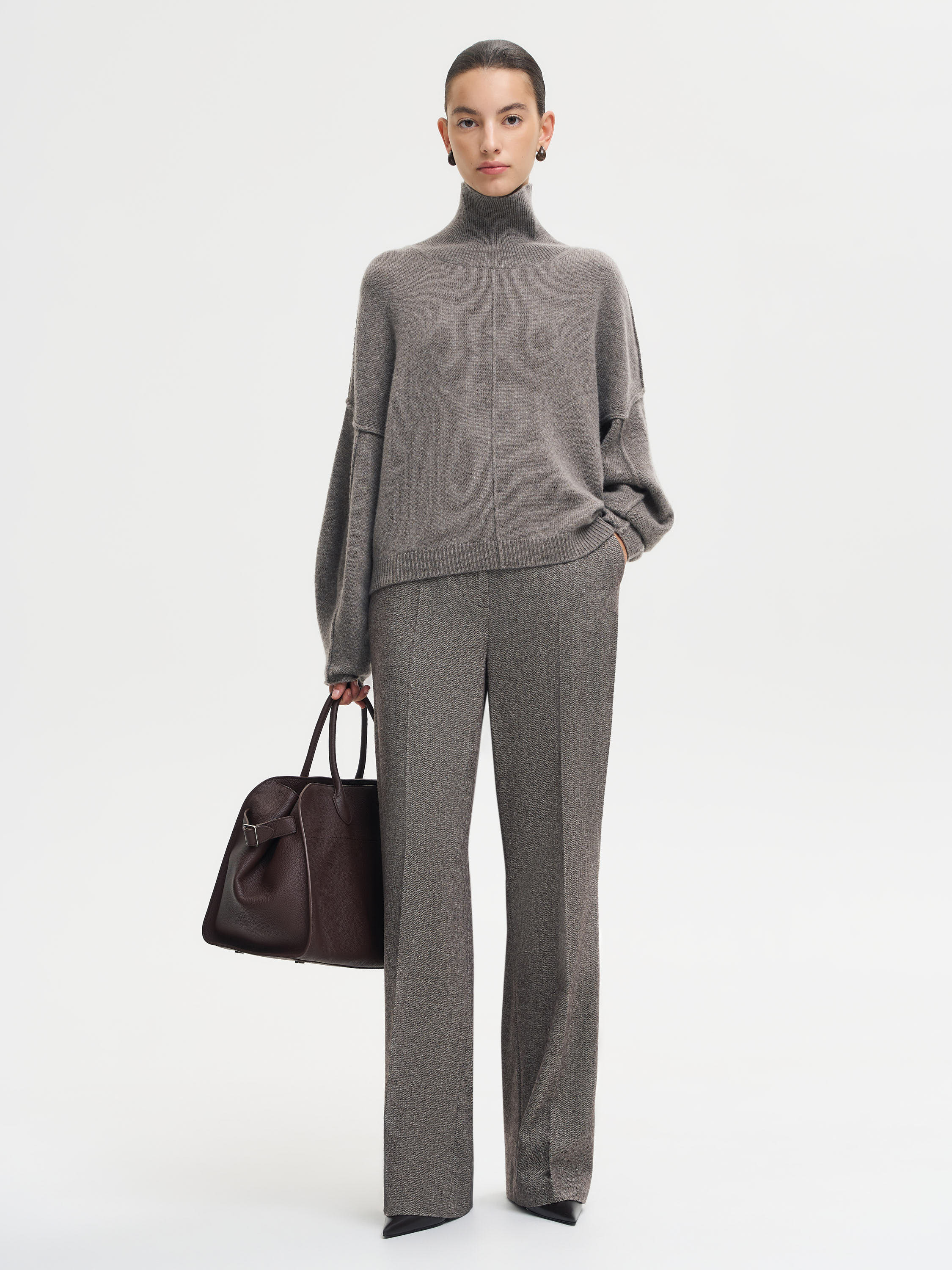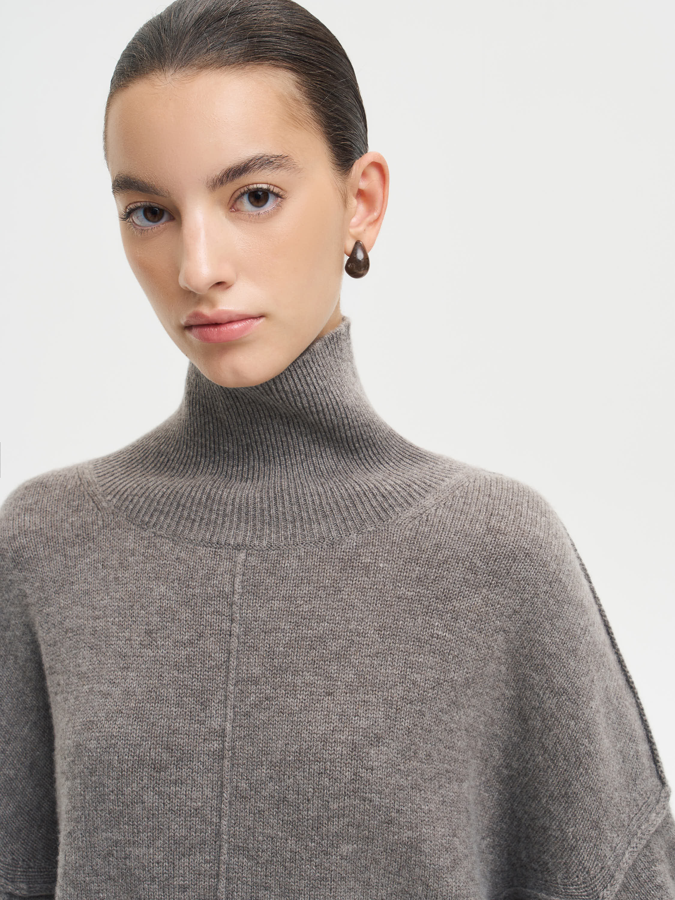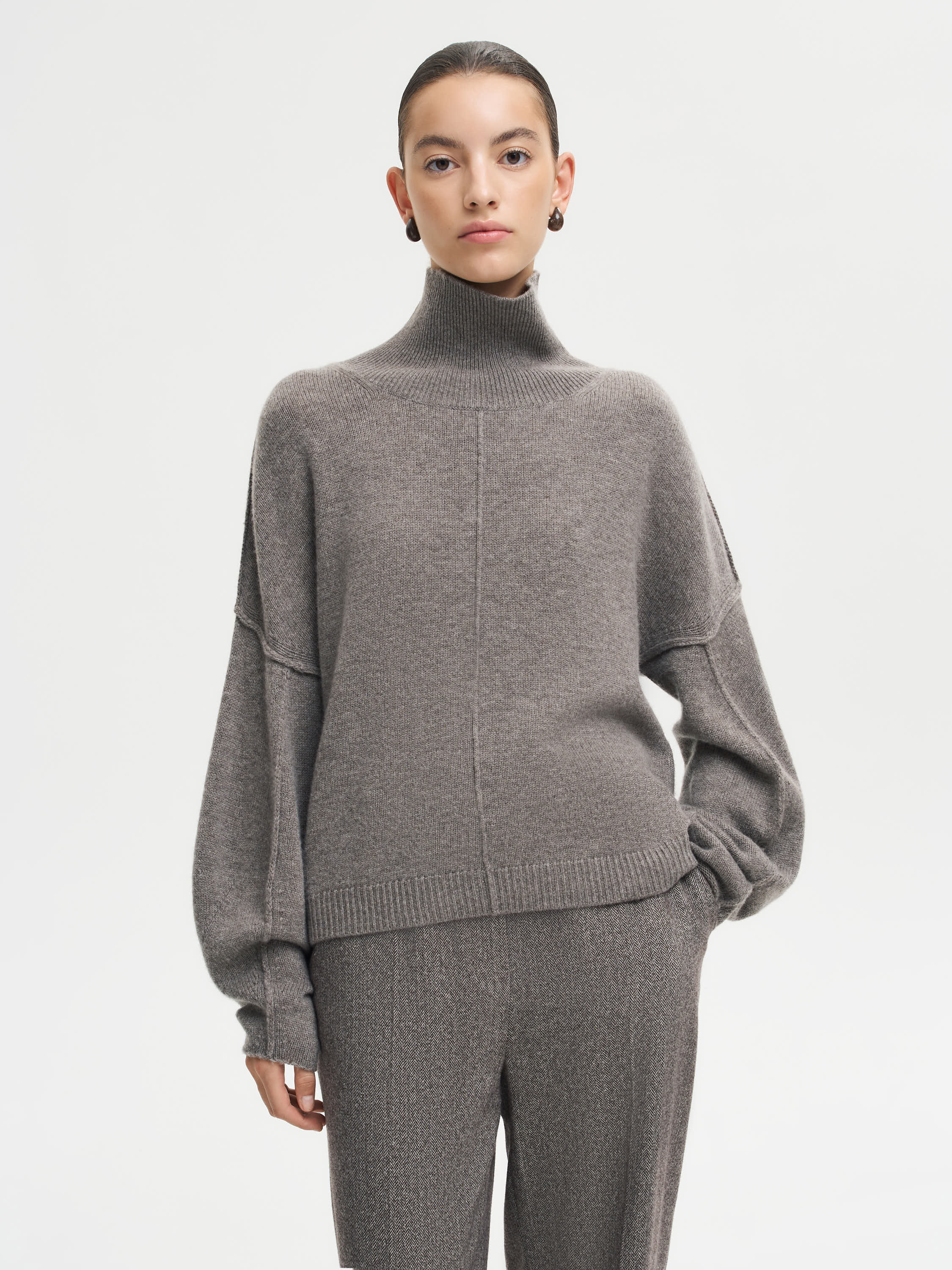 Джемпер из шерсти мериноса и кашемира с мягкой, уютной текстурой и выразительной вертикальной линией по центру переда. Модель со спущенной линией плеча и свободной посадкой создает расслабленный, но собранный силуэт. Объемные рукава придают образу мягкость и пластичность, а высокий воротник-гольф добавляет ощущение тепла и комфорта. Тончайшая пряжа из мериноса и кашемира приятна к телу, держит форму и отличается деликатным благородным блеском. Джемпер органично вписывается в базовый гардероб и гармонирует с юбками, прямыми или широкими брюками, а также с денимом.