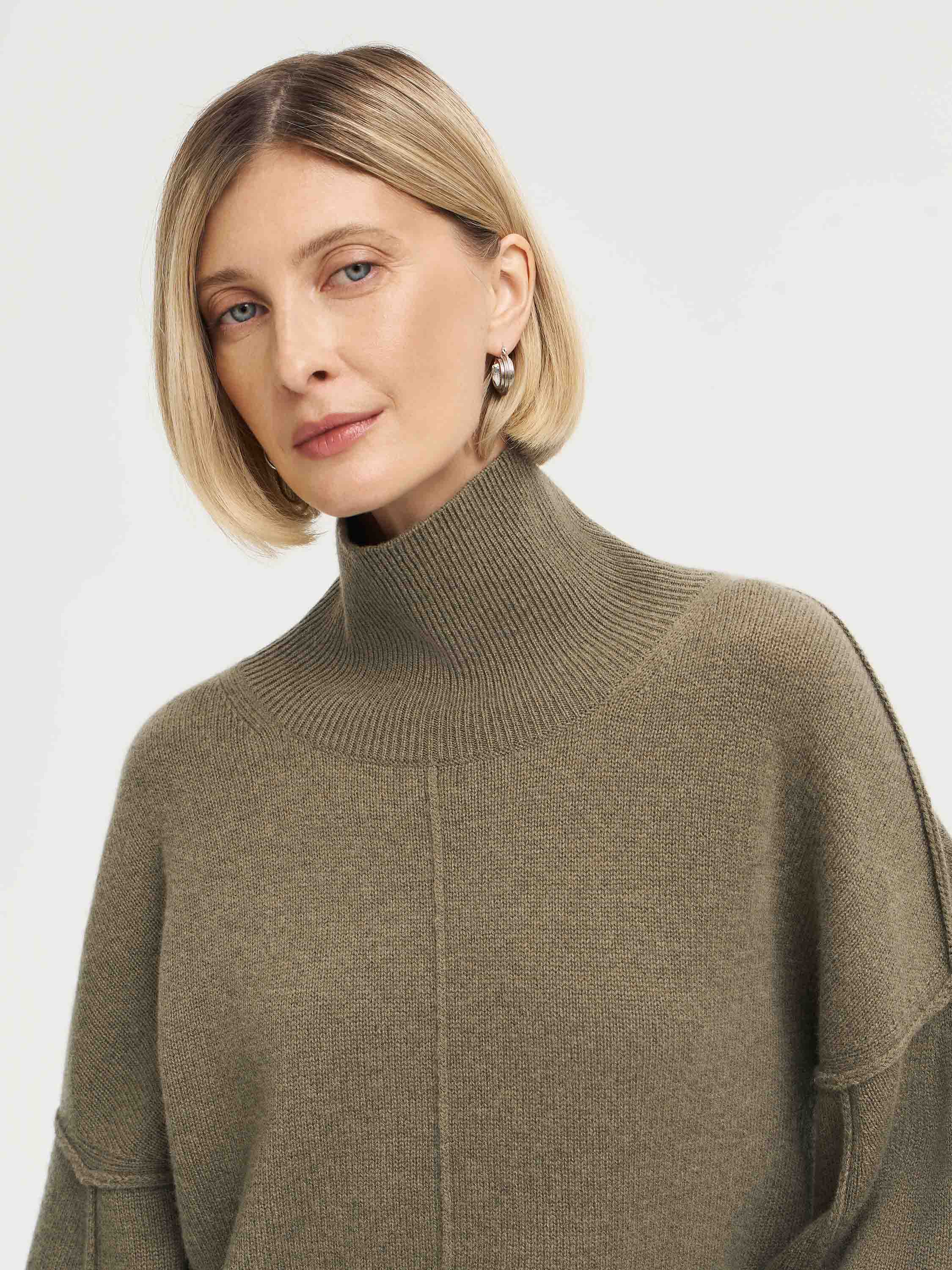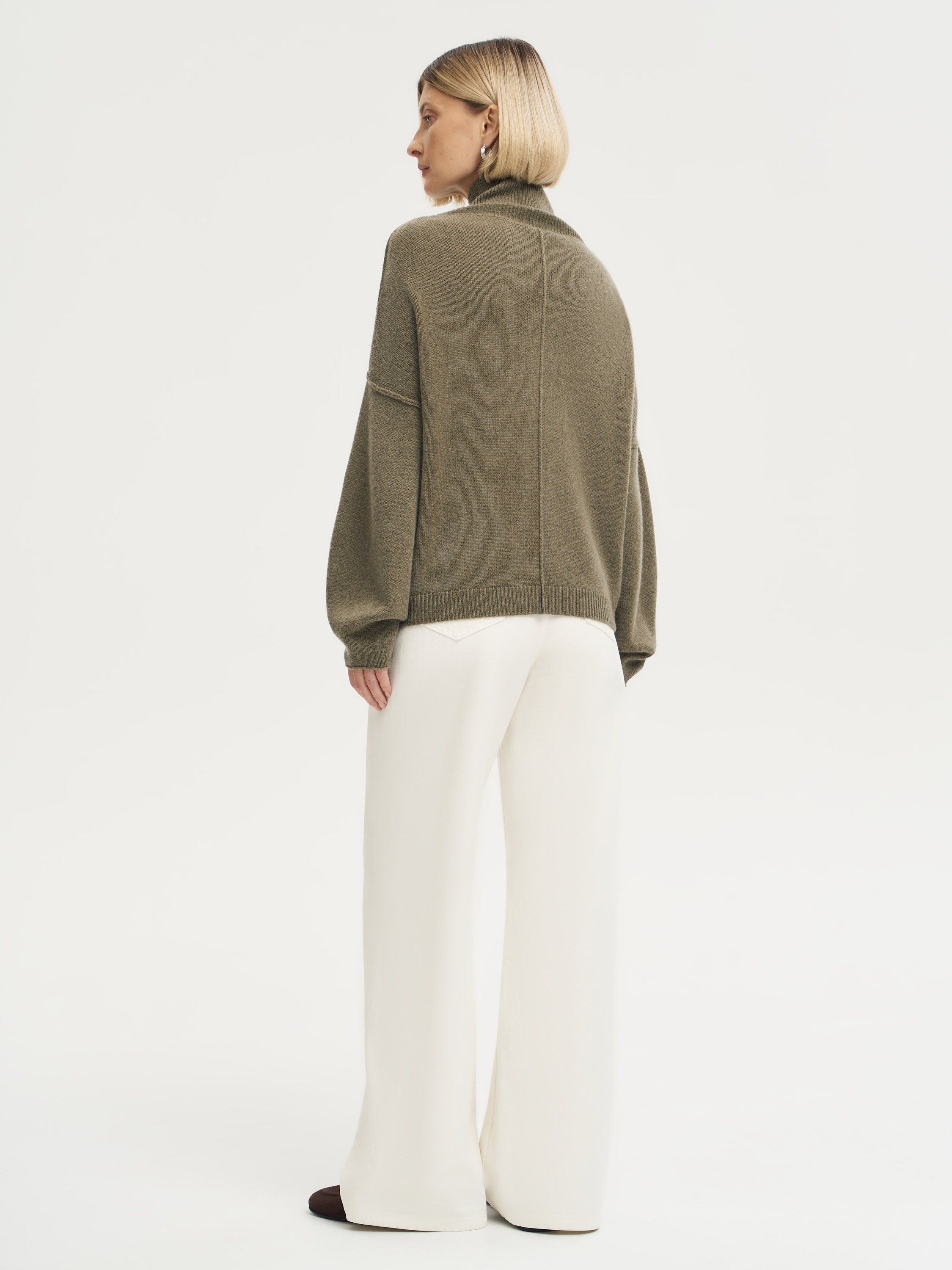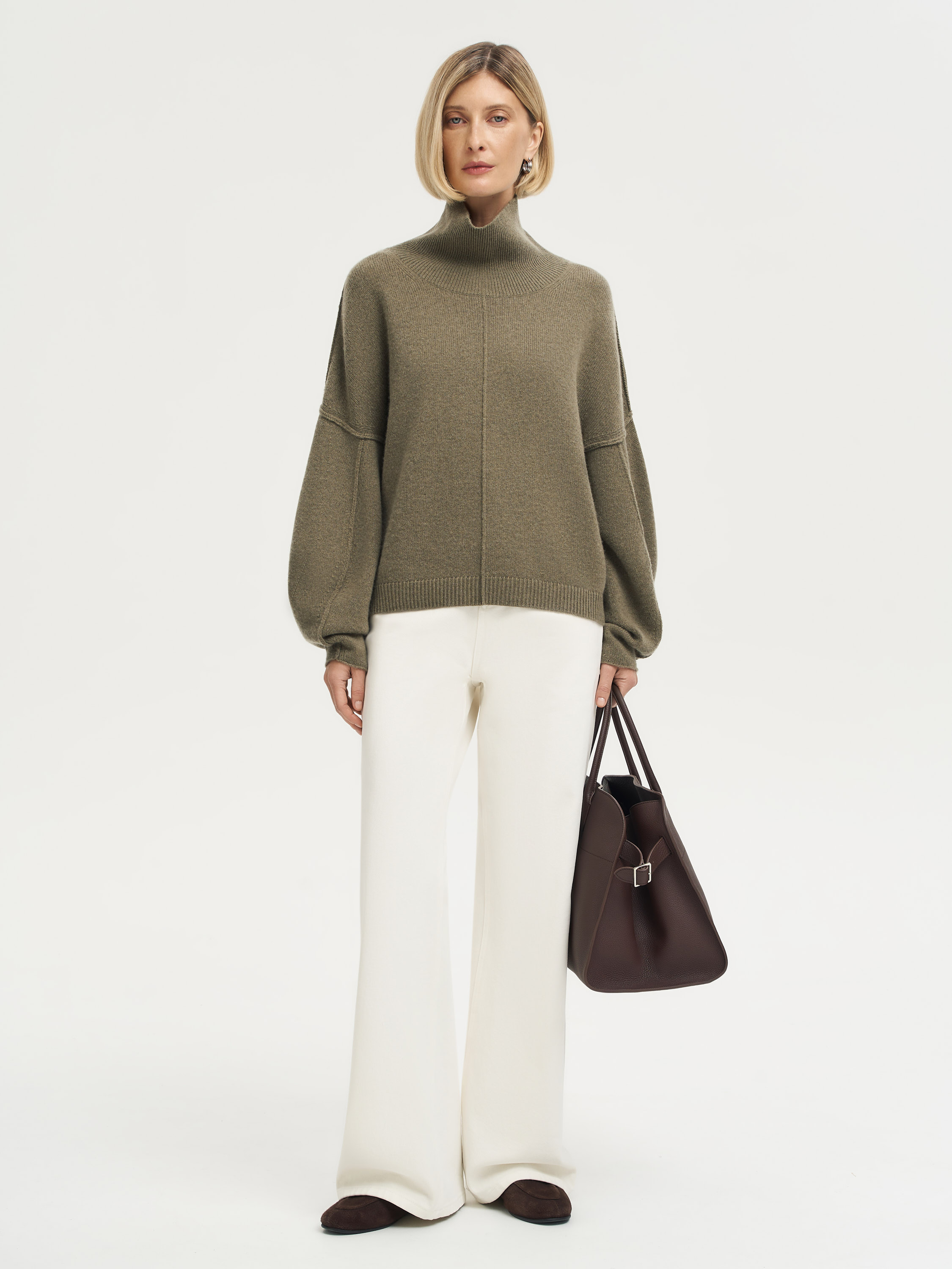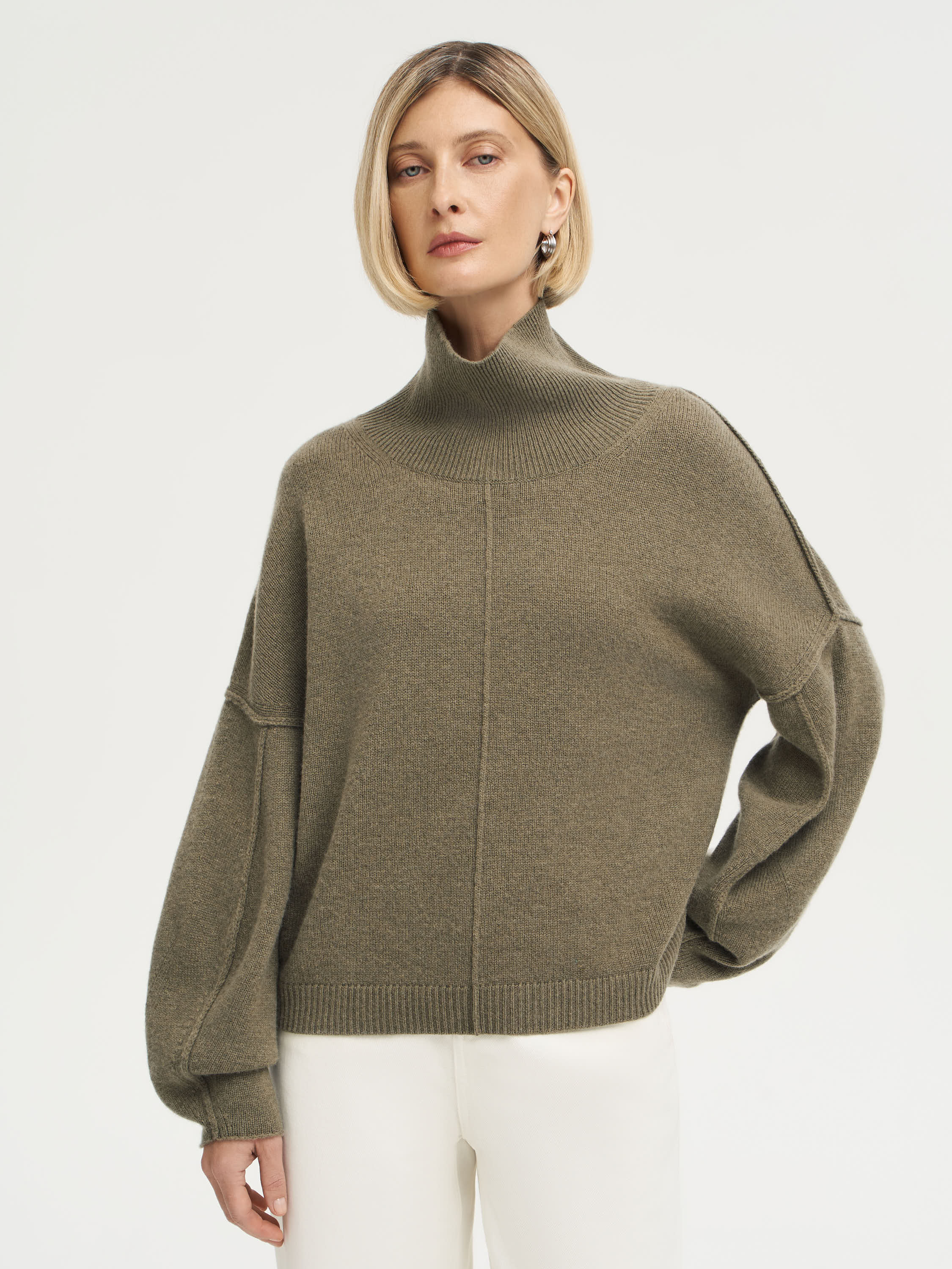 Джемпер из шерсти мериноса и кашемира с мягкой, уютной текстурой и выразительной вертикальной линией по центру переда. Модель со спущенной линией плеча и свободной посадкой создает расслабленный, но собранный силуэт. Объемные рукава придают образу мягкость и пластичность, а высокий воротник-гольф добавляет ощущение тепла и комфорта. Тончайшая пряжа из мериноса и кашемира приятна к телу, держит форму и отличается деликатным благородным блеском. Джемпер органично вписывается в базовый гардероб и гармонирует с юбками, прямыми или широкими брюками, а также с денимом.