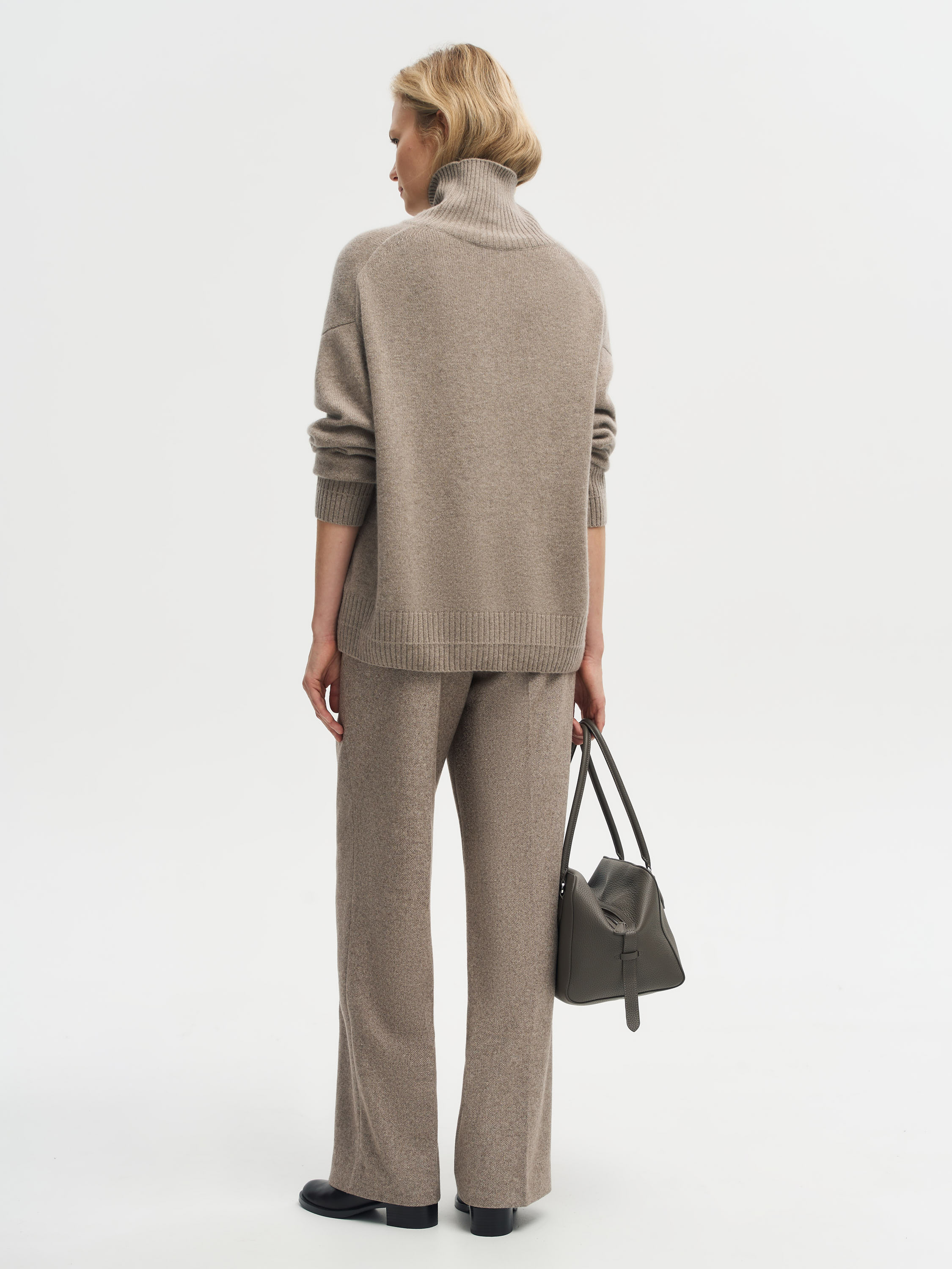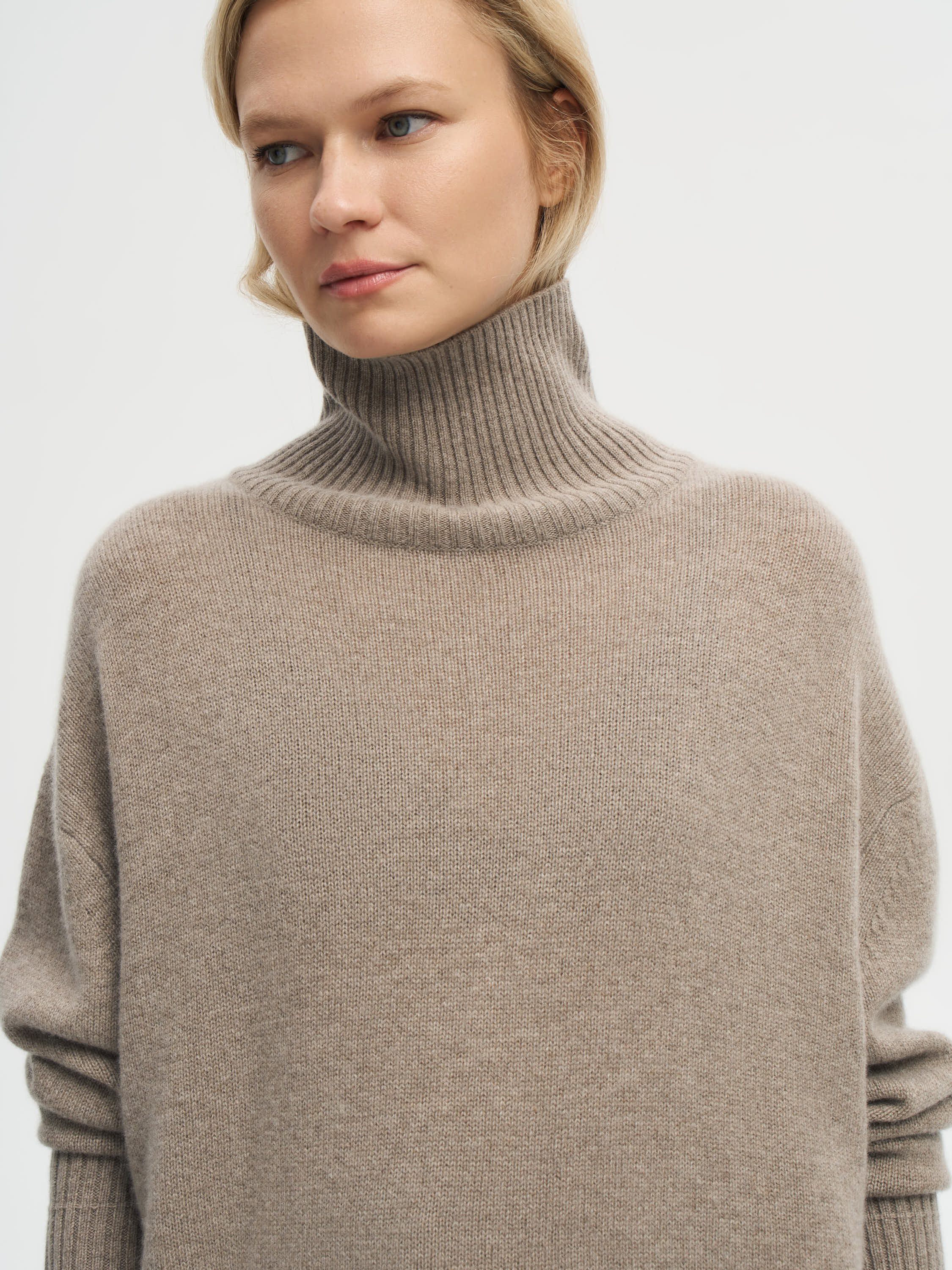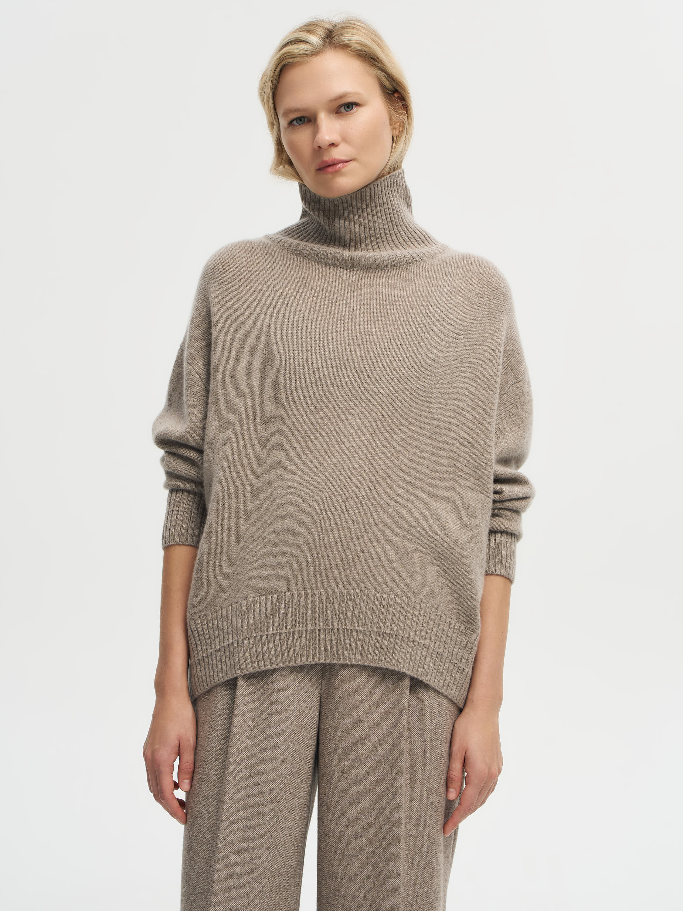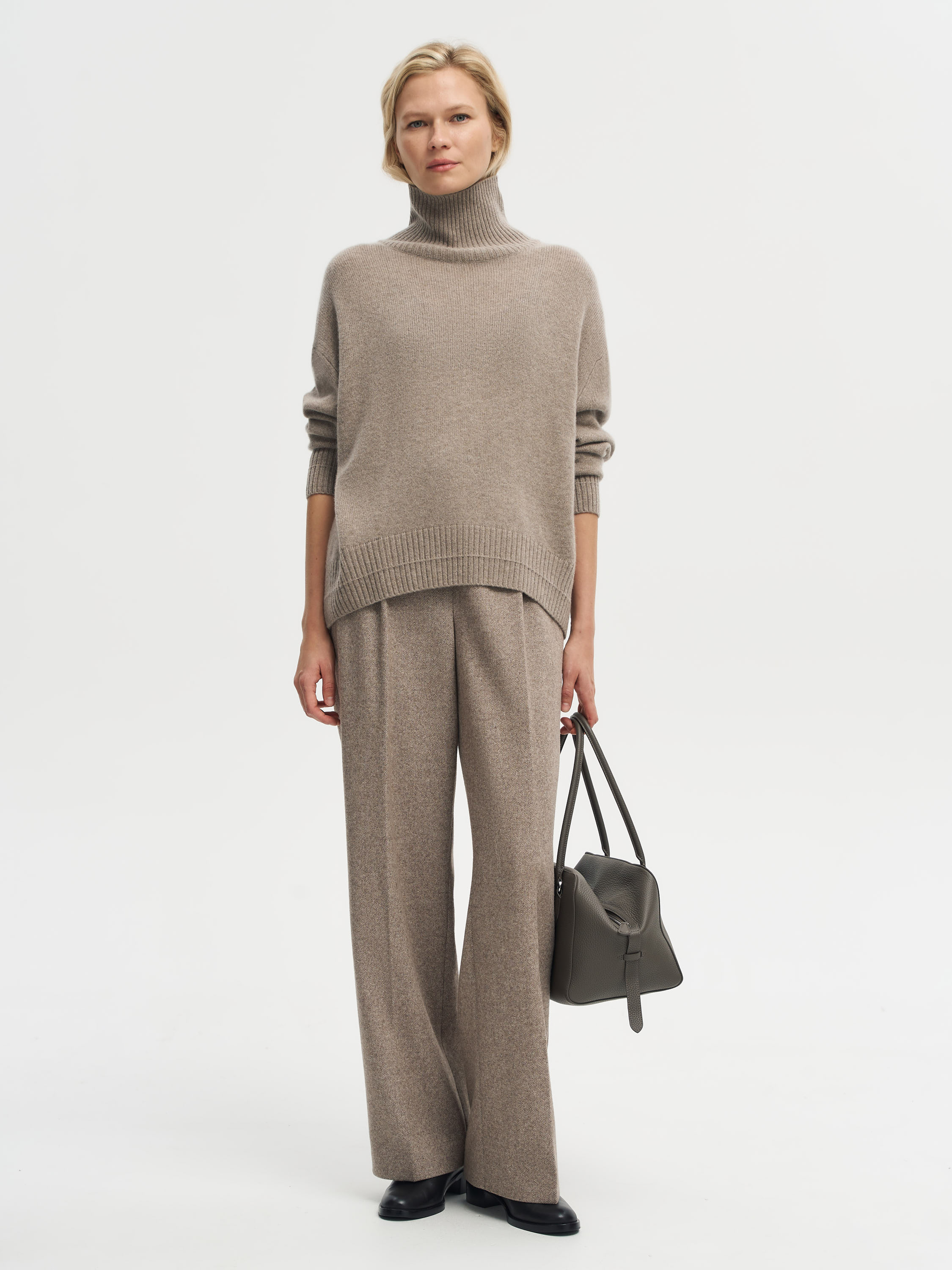 Джемпер из мериносовой шерсти с добавлением кашемира. Полотно мягкое, пластичное и теплое, комфортное в носке и хорошо сохраняет форму. Крой свободный, с удлиненной линией плеча, длинными рукавами и высоким воротником стойкой, который мягко фиксируется и защищает от холода. Манжеты и низ выполнены из плотной резинки, создающей аккуратный силуэт. Лаконичный дизайн делает модель универсальной: джемпер гармонично вписывается в повседневные комплекты с джинсами и брюками и органично смотрится в более собранных образах с юбками.
