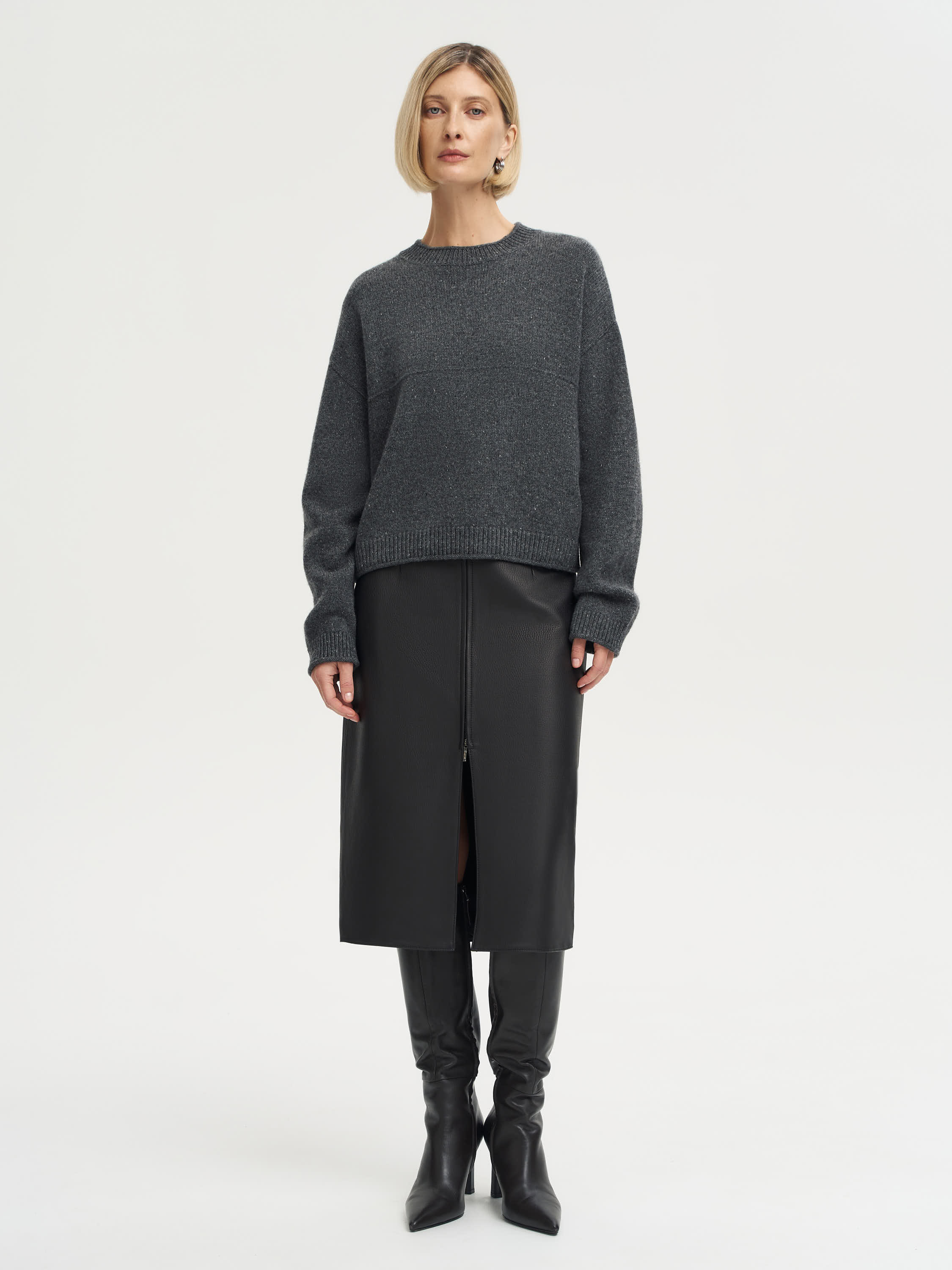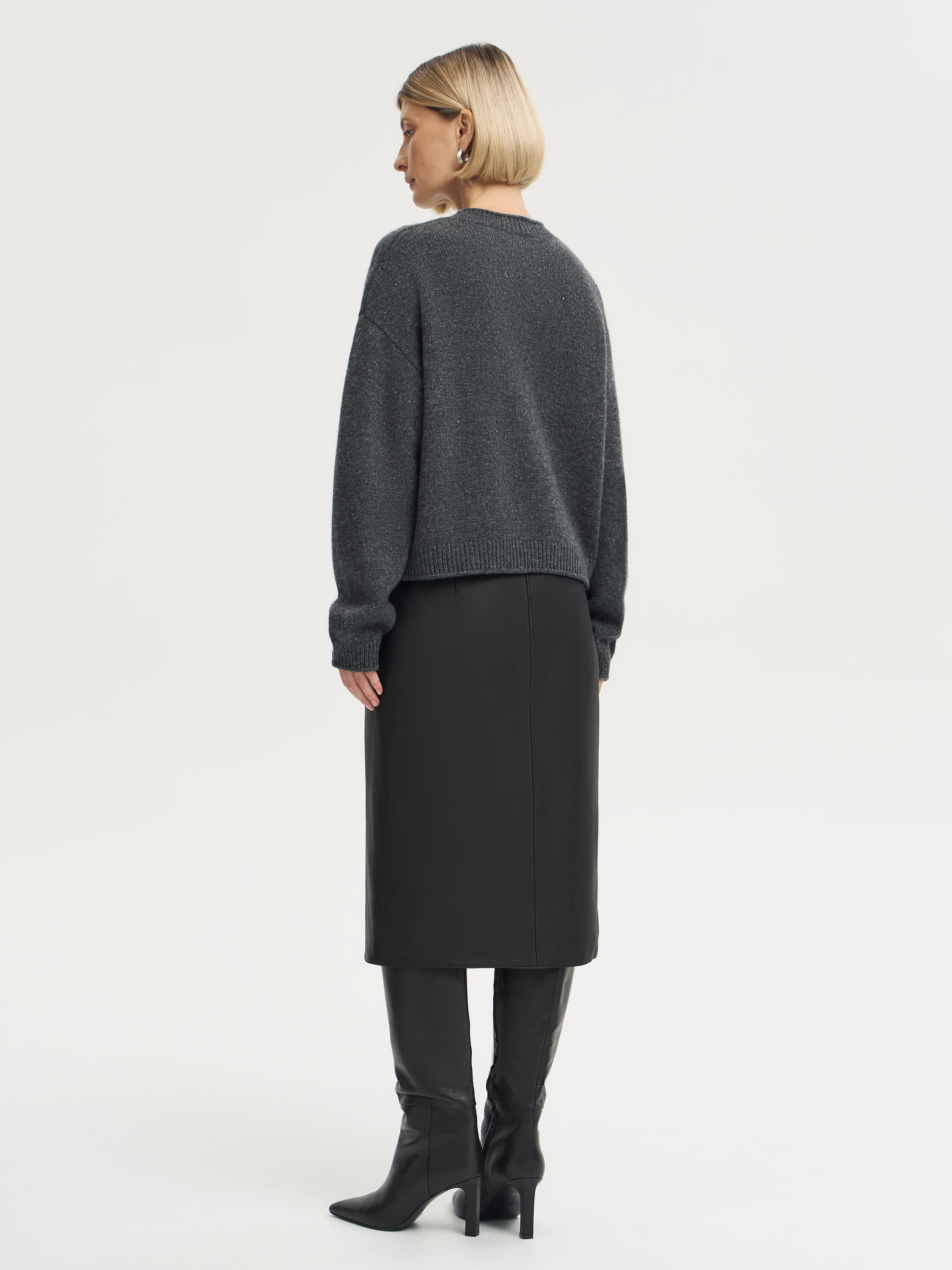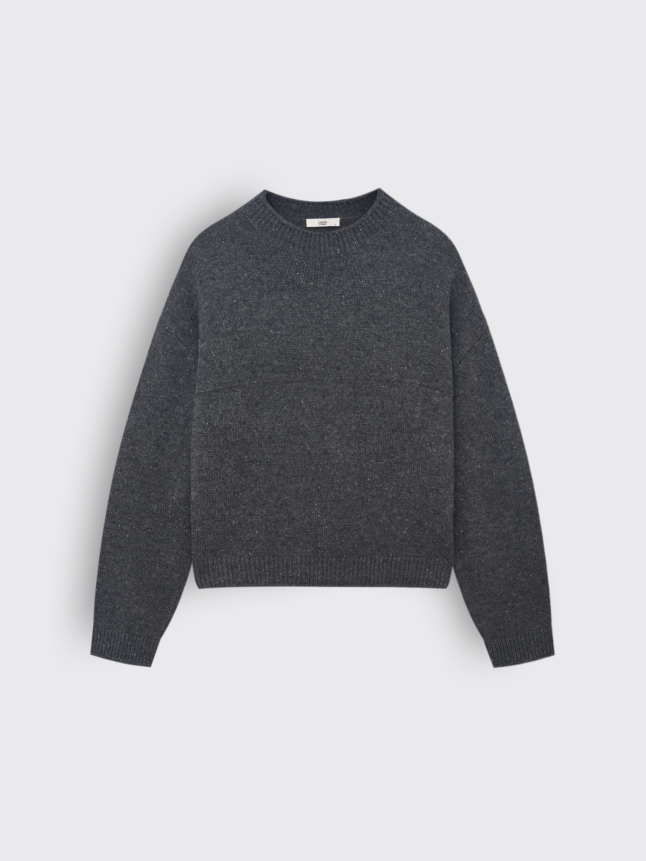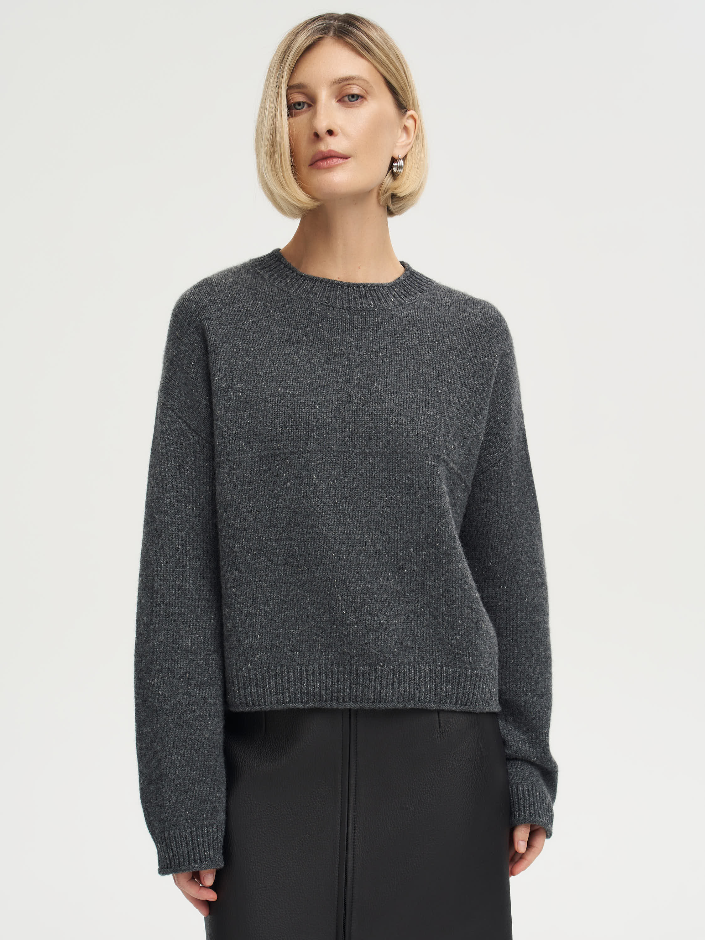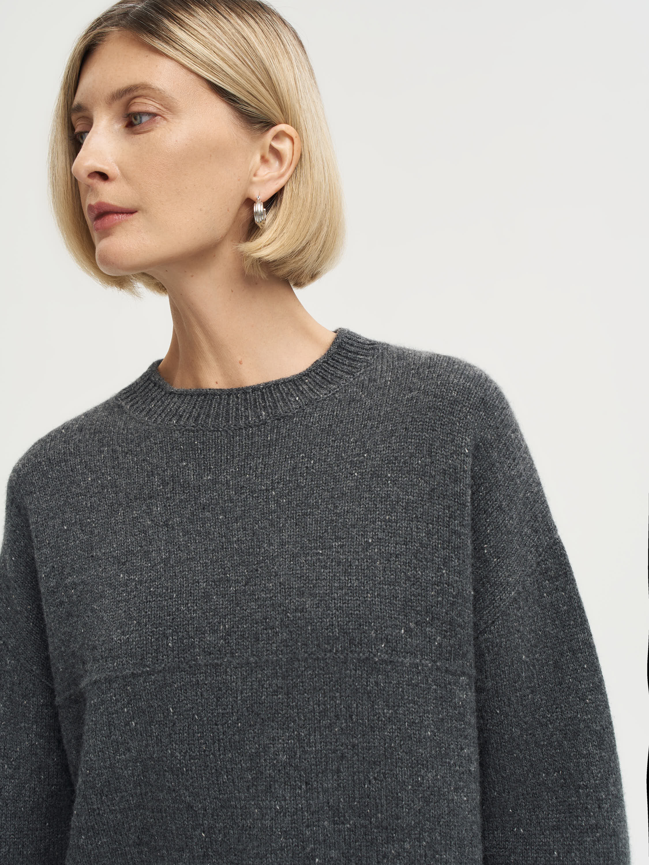 Джемпер из шерсти с добавлением кашемира выполнен из плотной, мягкой вязки с меланжевым эффектом, создающим деликатную глубину фактуры. Слегка объемный силуэт со спущенной линией плеч обеспечивает комфорт и свободу движения. Манжеты и линия низа оформлены широкой резинкой, добавляющей структуру и аккуратность посадке. Тактильно приятная пряжа не колется и сохраняет тепло, оставаясь дышащей. Универсальная модель, которая вписывается в повседневный осенне-зимний гардероб и может стать базой для многослойных образов.