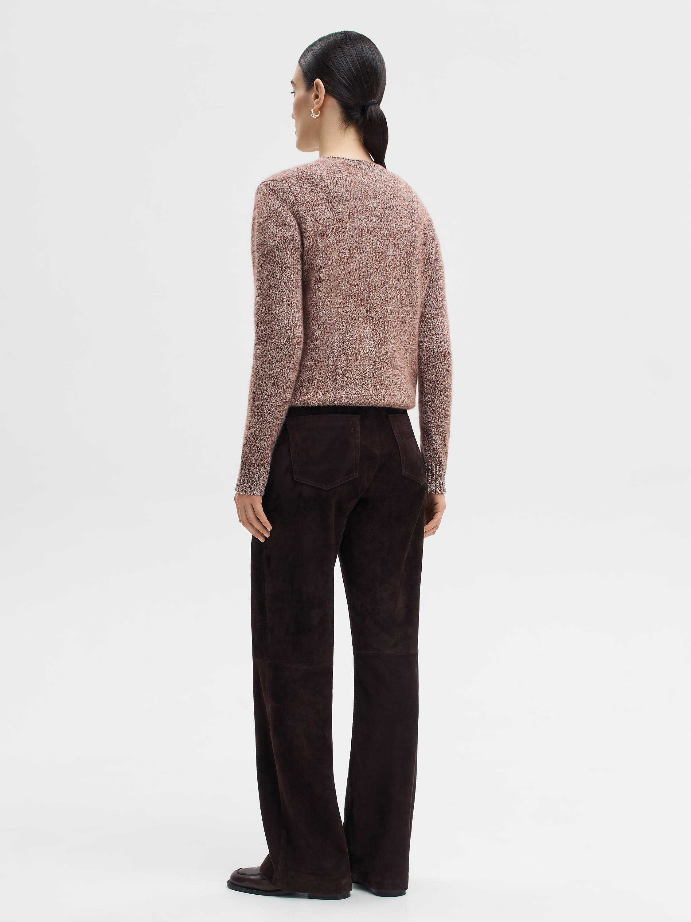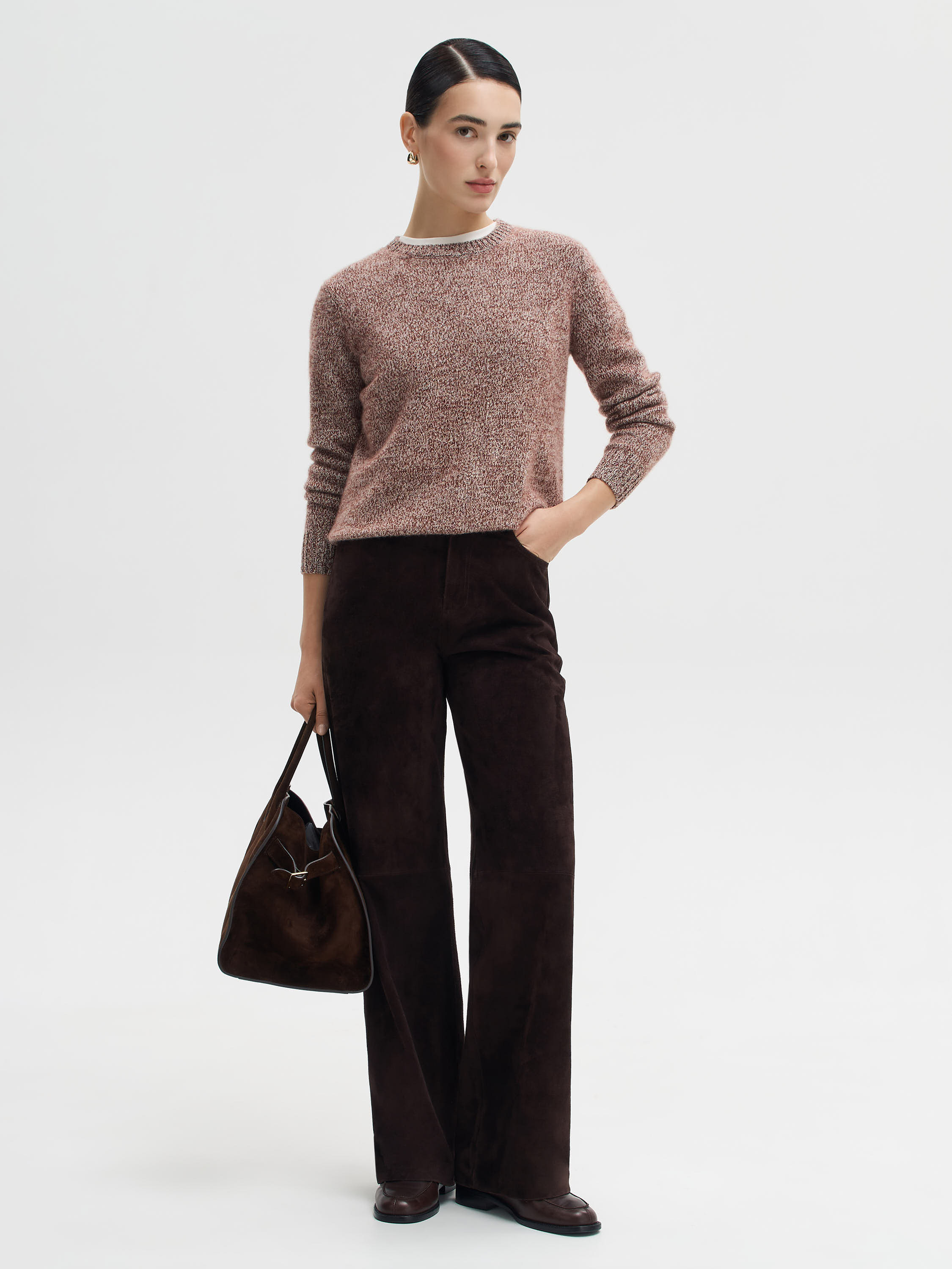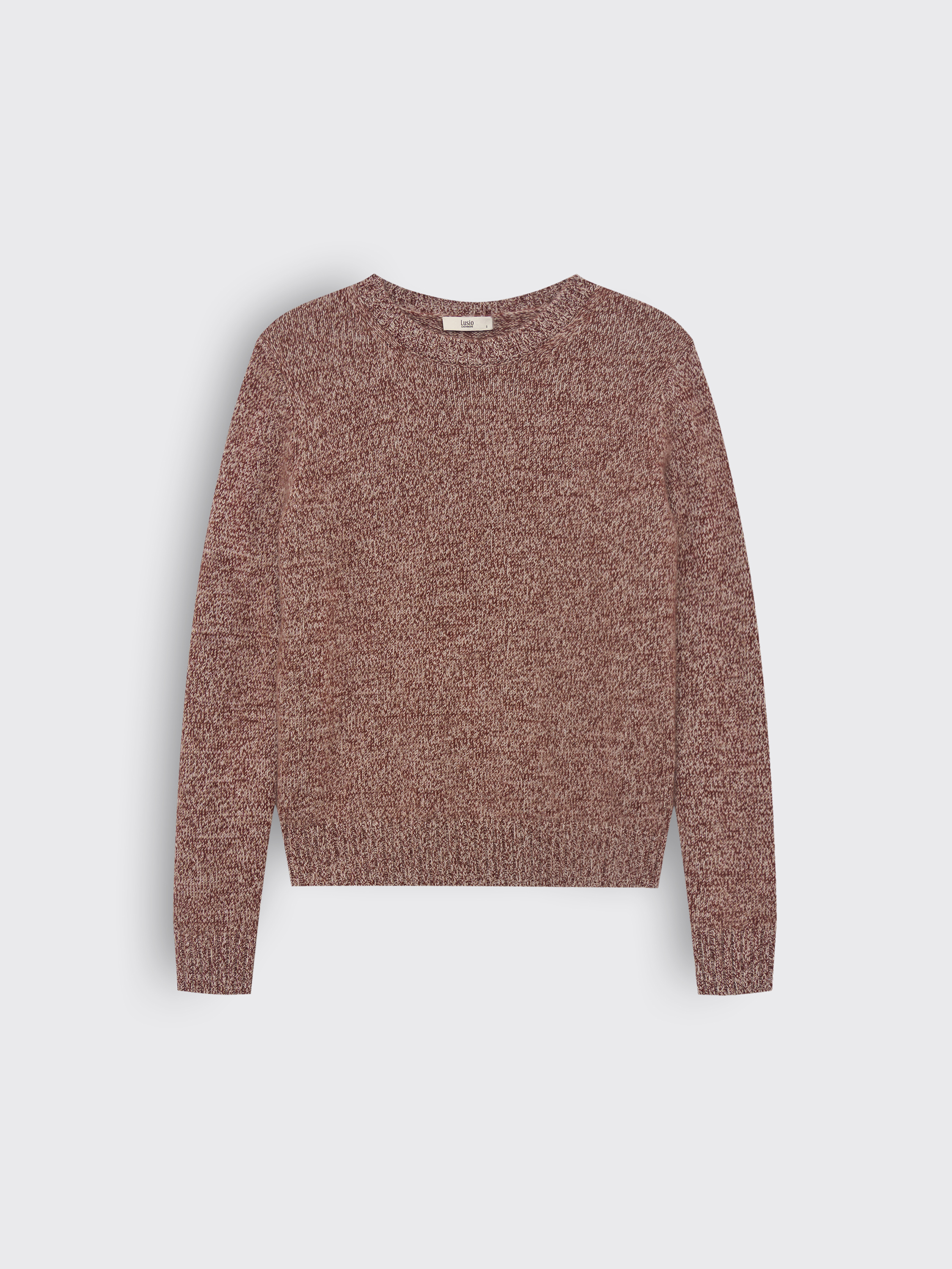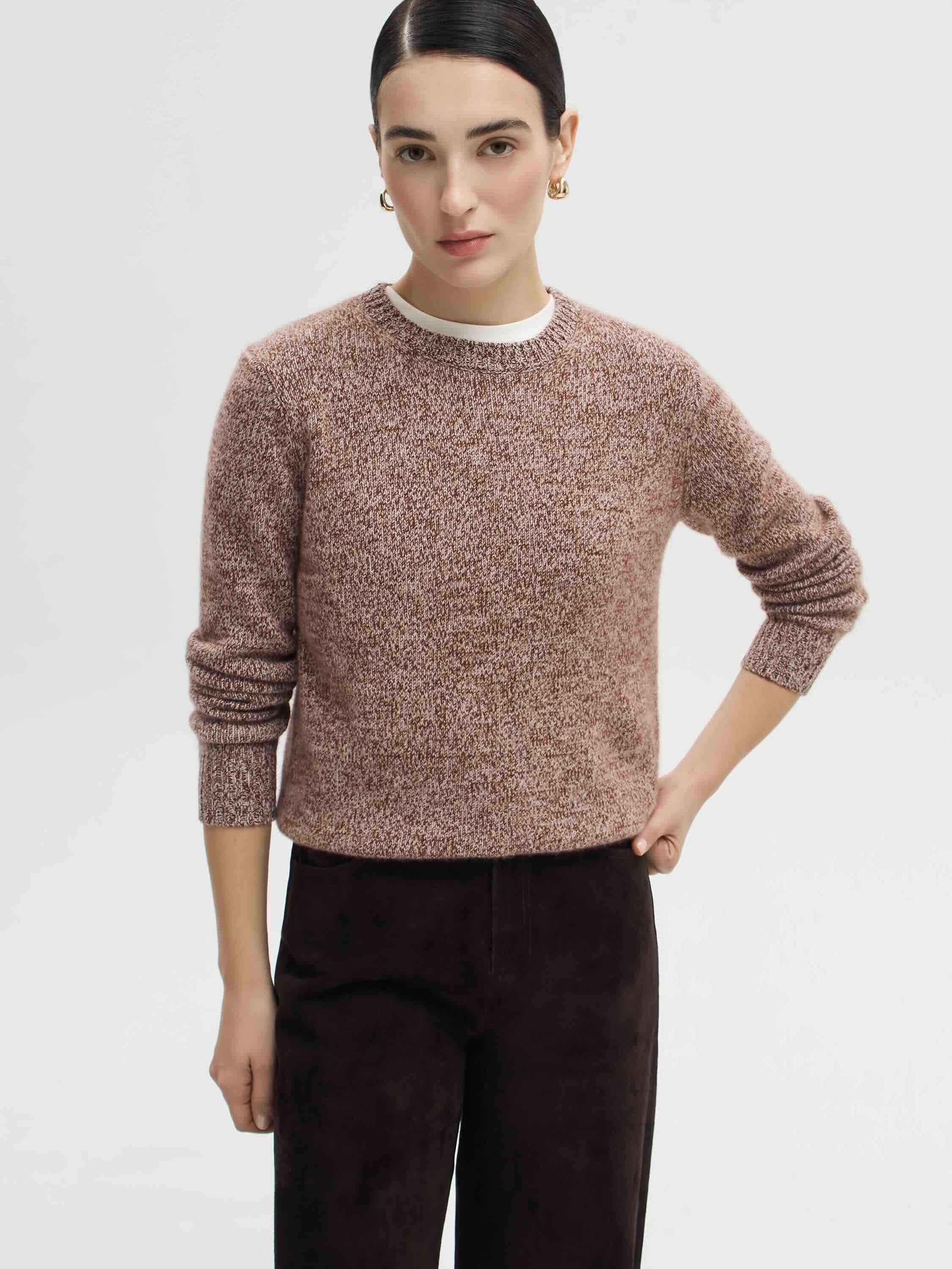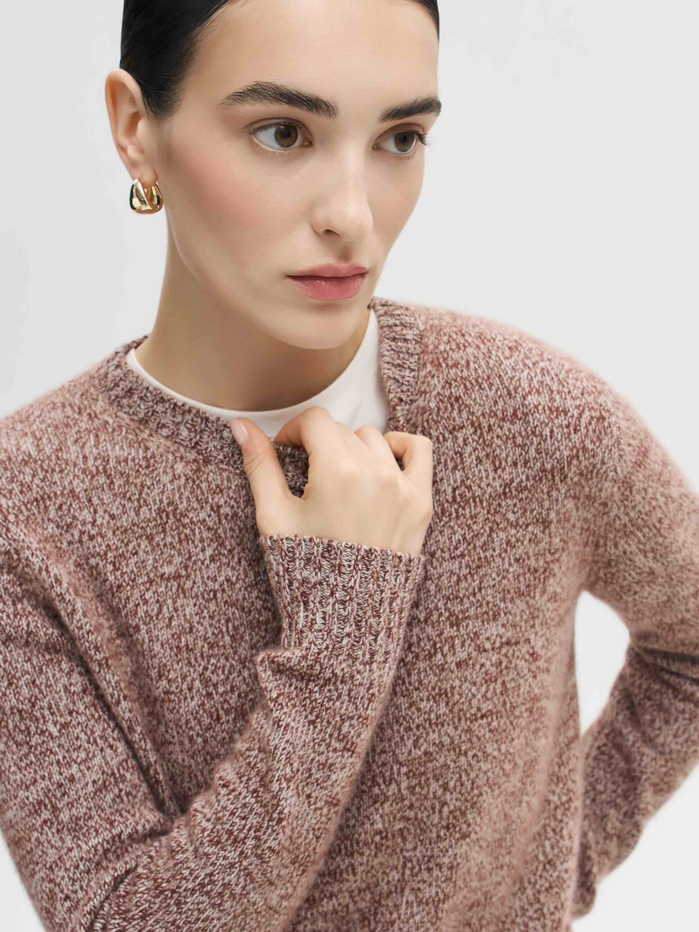 Джемпер из смесовой пряжи с высоким содержанием шерсти мериноса и кашемира. Легкий меланжевый эффект добавляет фактурности, а мягкая тактильность делает вещь особенно комфортной. Прямой крой и круглый вырез горловины создают универсальную основу для образов на каждый день. Такая модель гармонично сочетается и с брюками, и с юбками, легко поддерживая как деловой, так и расслабленный стиль.