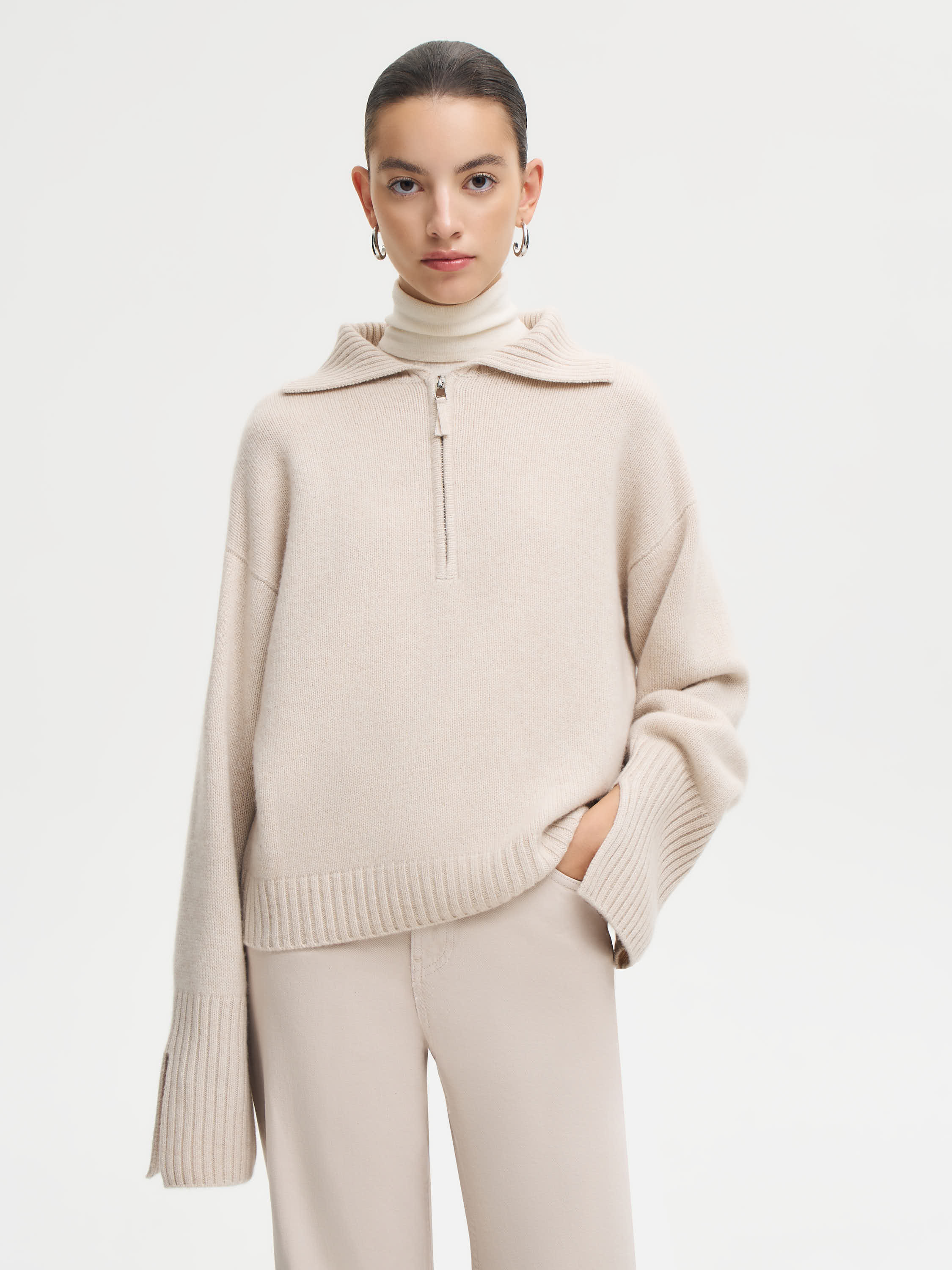 Джемпер из 100% кашемира с мягкой фактурой и выразительным вязанием. Модель выполнена в лаконичном силуэте с воротником-поло и короткой молнией, которая позволяет варьировать посадку воротника — от открытого до полностью закрытого. Спущенная линия плеча и широкие манжеты создают расслабленное, но собранное впечатление. Теплая, невесомая пряжа обеспечивает комфорт и мягкое прилегание к телу. Универсальная модель, которая сочетается как с повседневными, так и более выверенными образами.