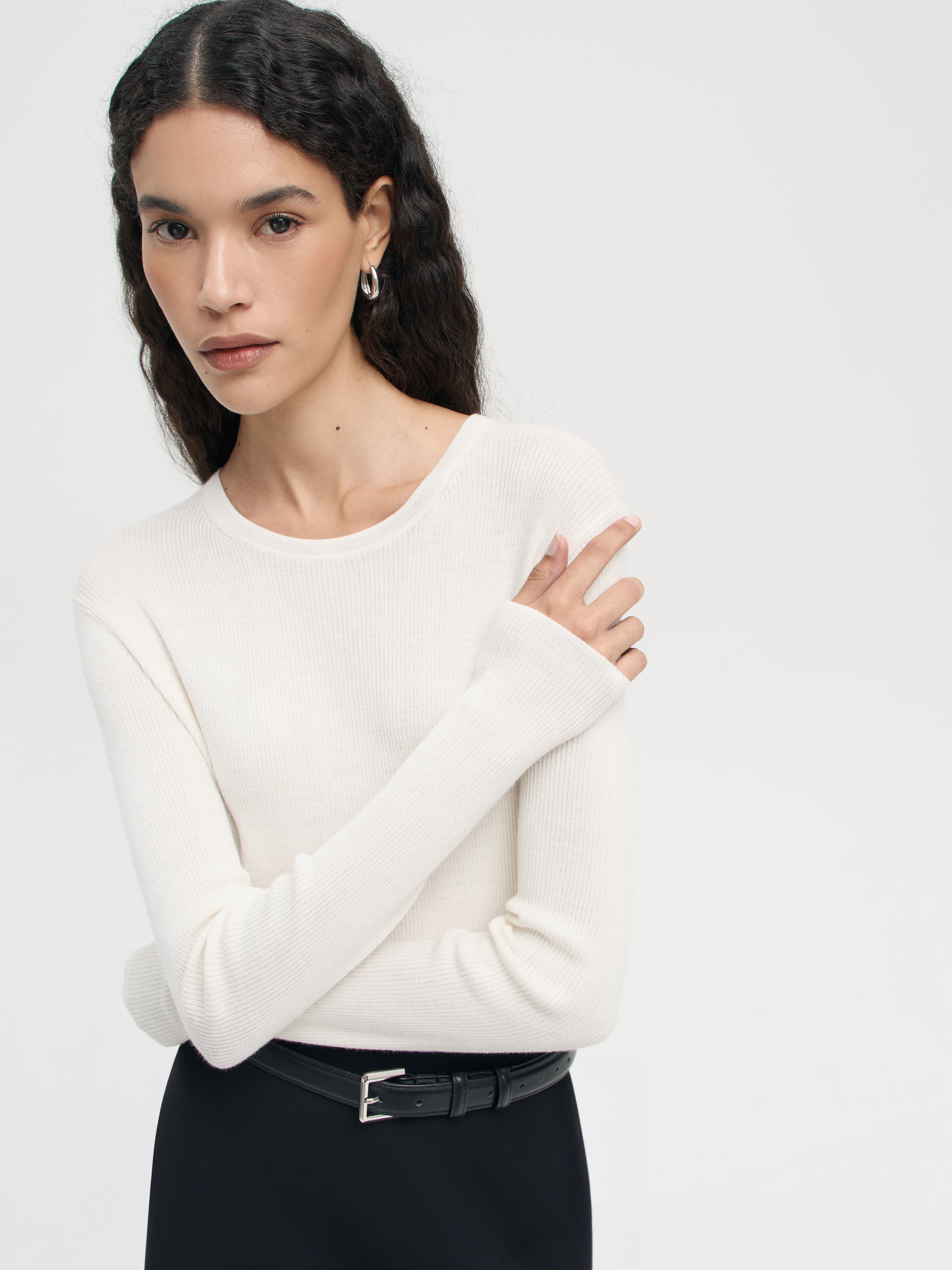 Джемпер из тонкой пряжи с шерстью мериноса и шелком, с мягкой фактурой и легким деликатным блеском. Материал пластичный и приятный к коже, обеспечивает комфорт в течение всего дня. Крой прямой, с круглым вырезом и длинными рукавами. Вязка в рубчик формирует чистый вертикальный рисунок, добавляя изделию выразительности и подчеркивая линии силуэта. Универсальная модель, которая гармонично впишется и в повседневный, и в деловой гардероб, сочетаясь с юбками, брюками или жакетами.