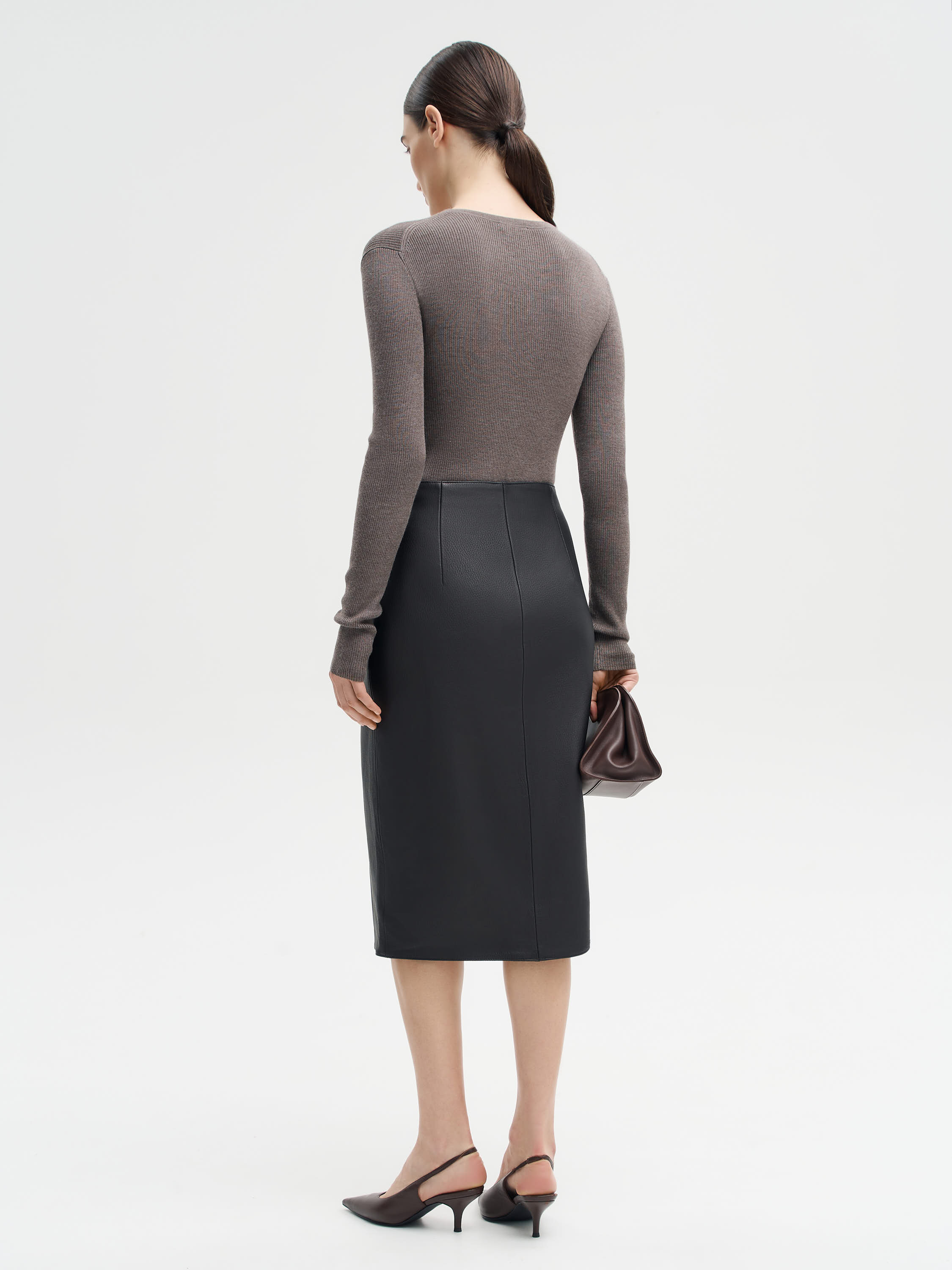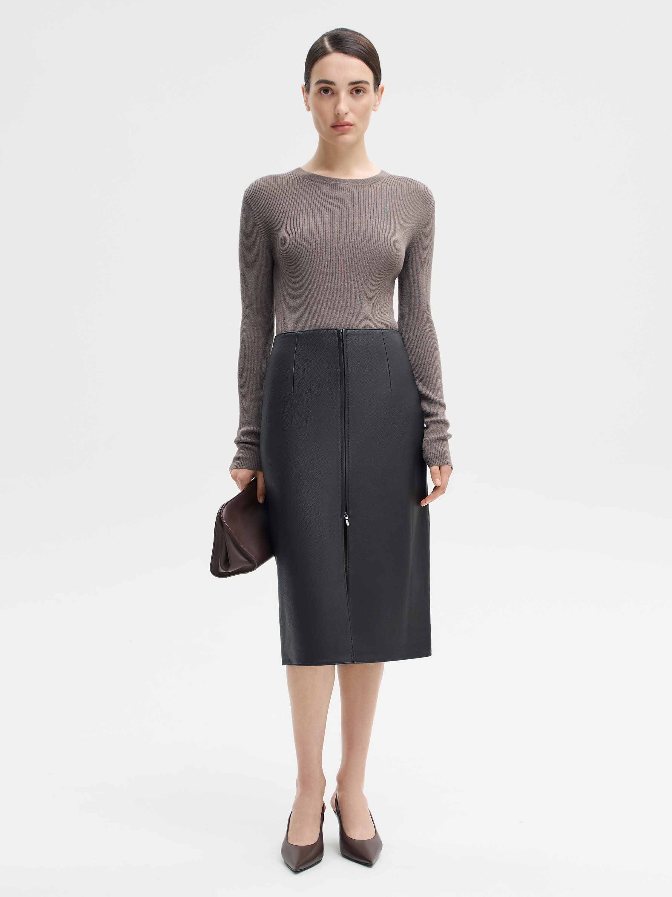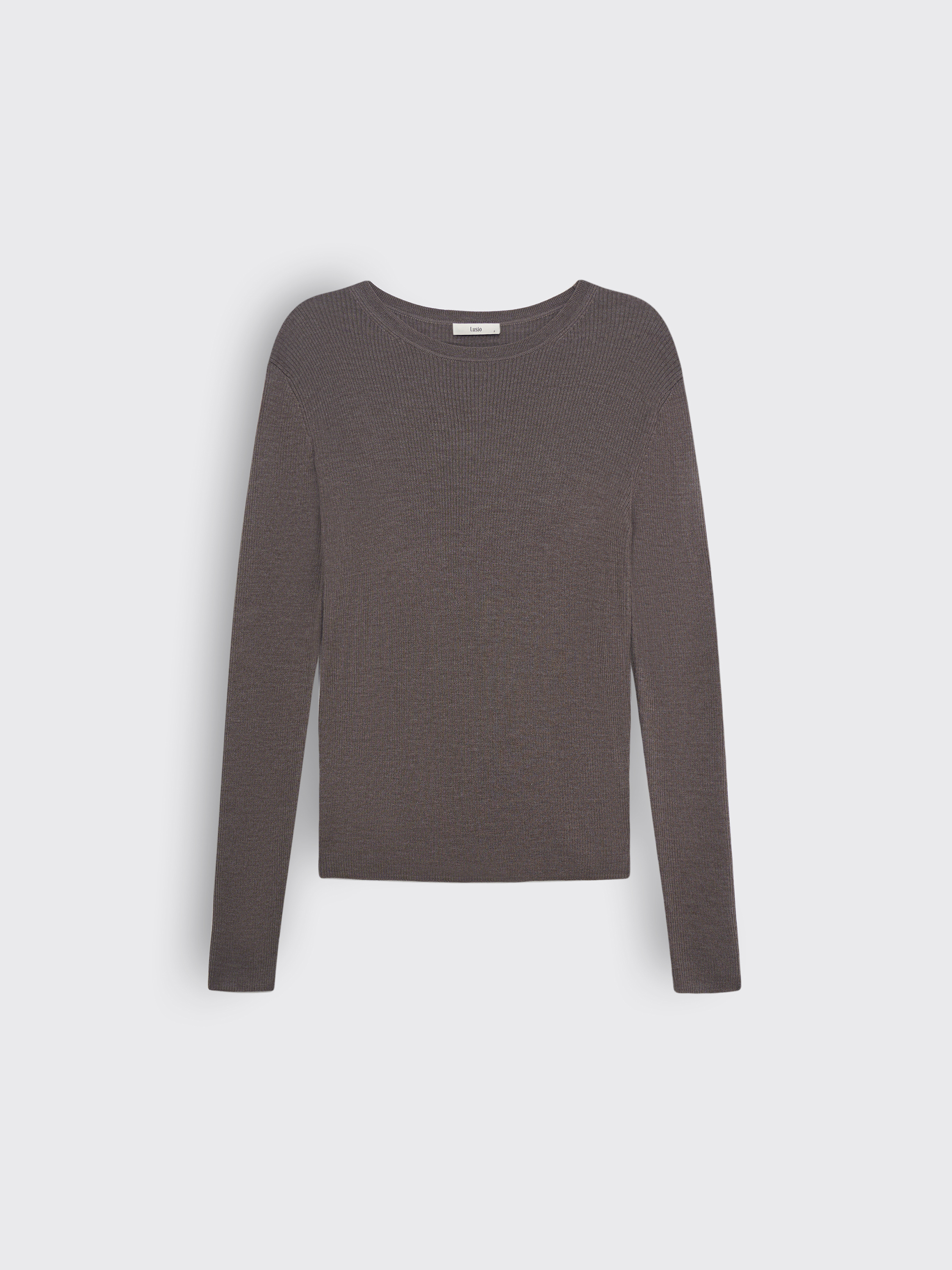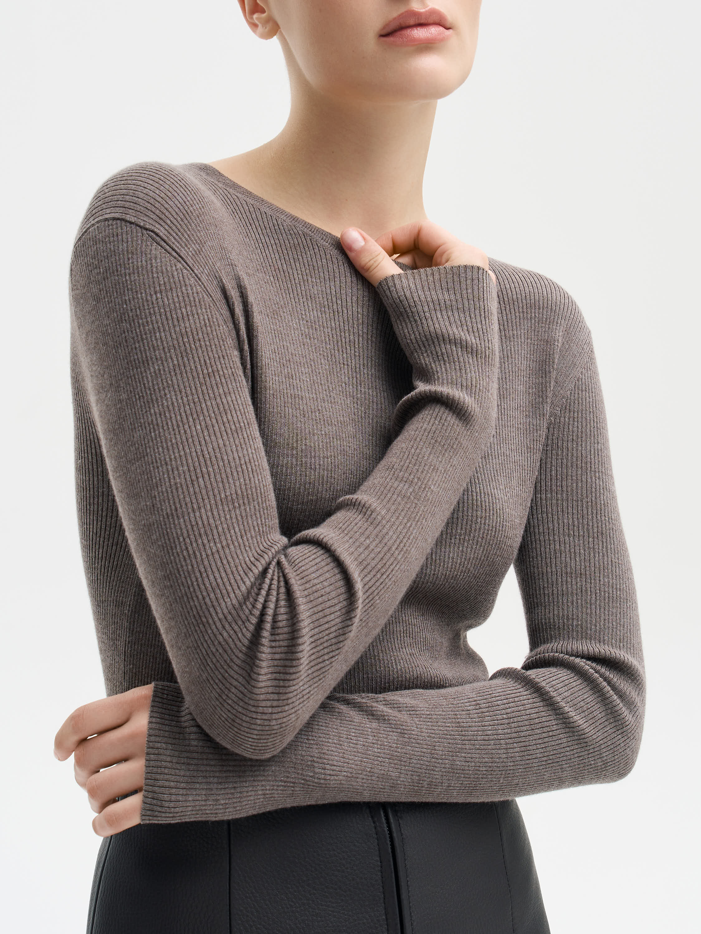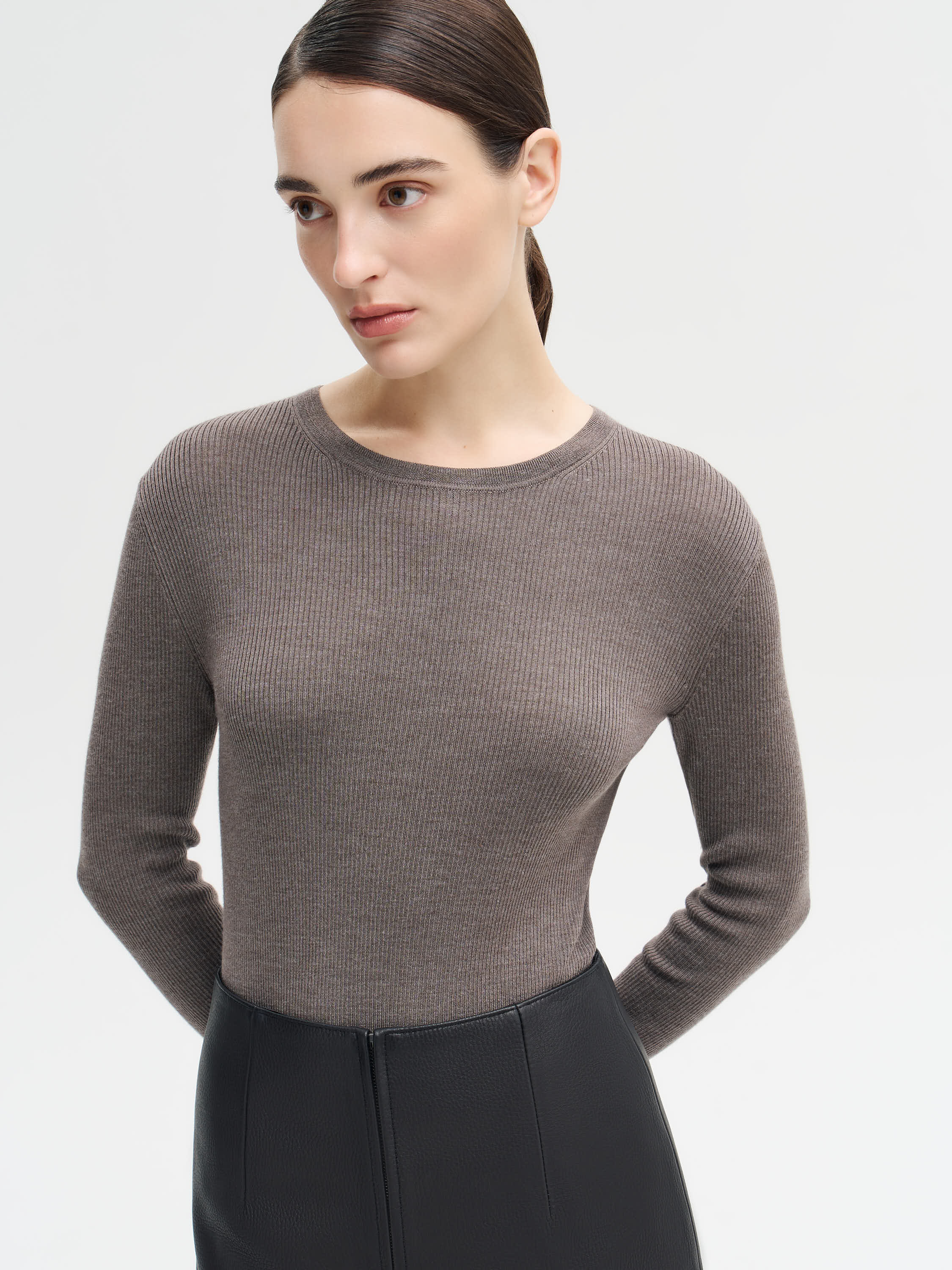 Джемпер из тонкой пряжи с шерстью мериноса и шелком, с мягкой фактурой и легким деликатным блеском. Материал пластичный и приятный к коже, обеспечивает комфорт в течение всего дня. Крой прямой, с круглым вырезом и длинными рукавами. Вязка в рубчик формирует чистый вертикальный рисунок, добавляя изделию выразительности и подчеркивая линии силуэта. Универсальная модель, которая гармонично впишется и в повседневный, и в деловой гардероб, сочетаясь с юбками, брюками или жакетами.