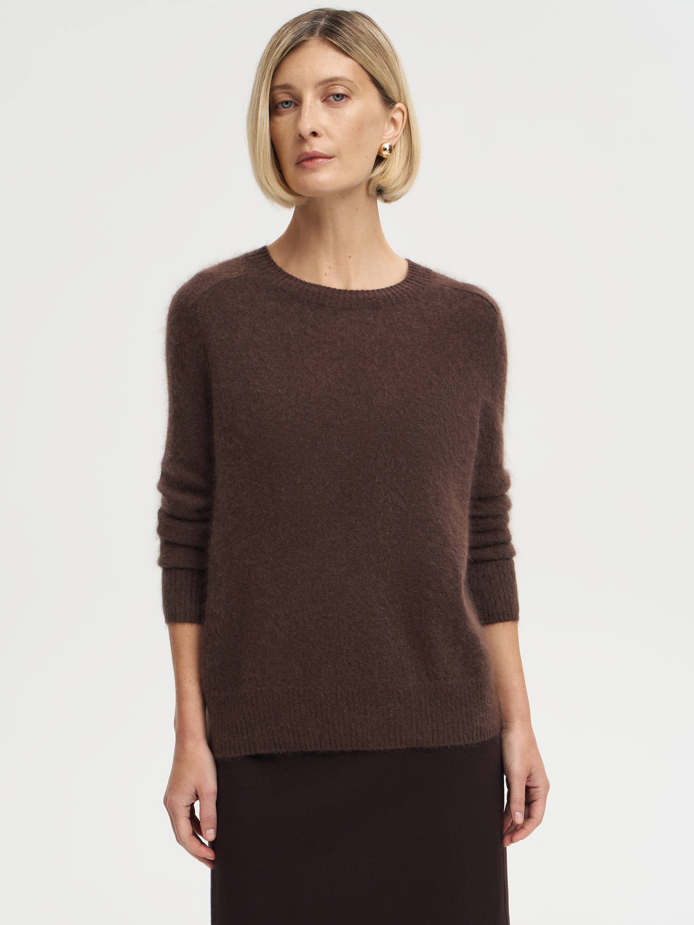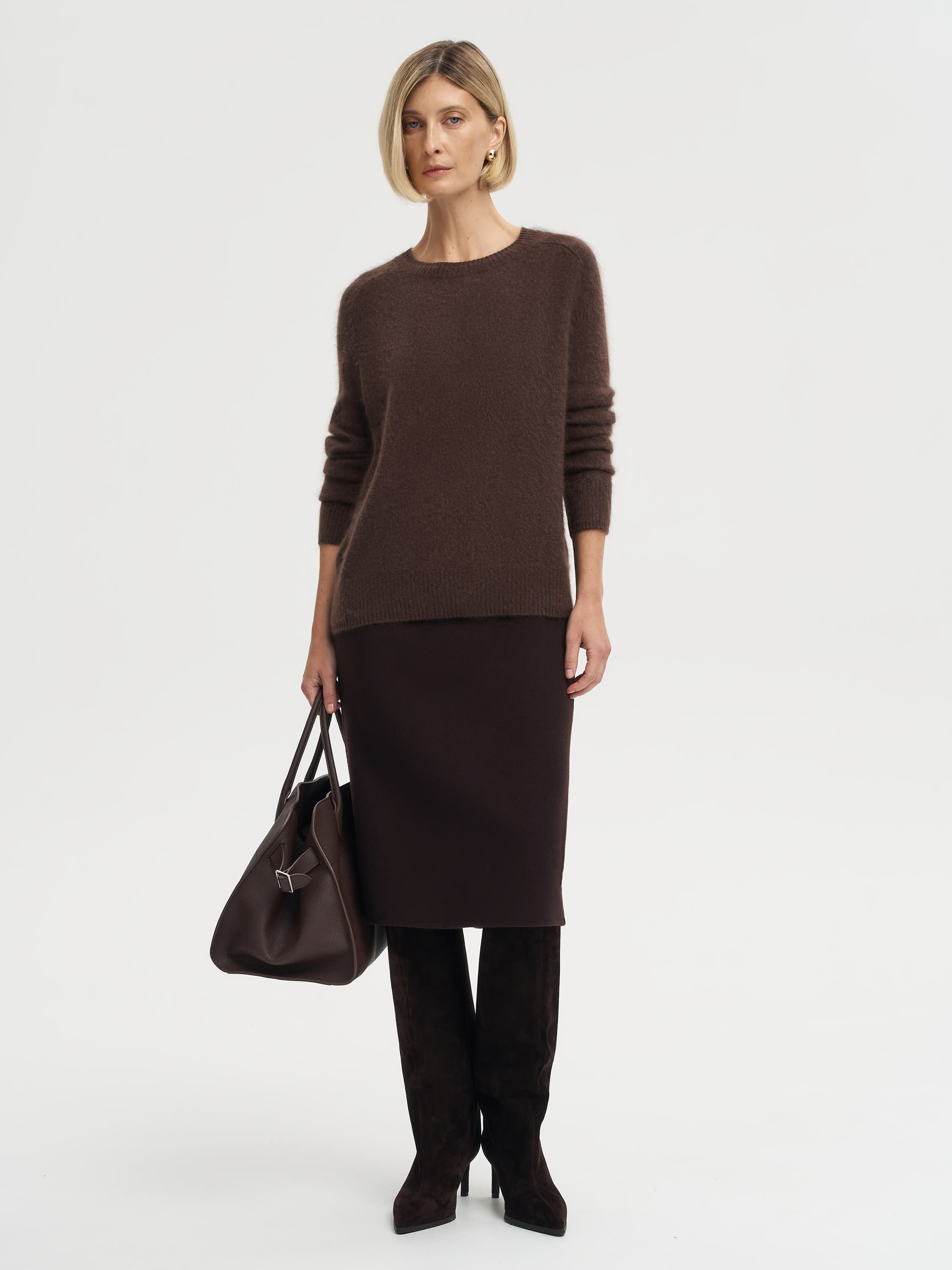 Джемпер из мериносовой шерсти с добавлением кашемира отличается мягкостью, легкостью и приятной фактурой. Тонкое полотно сохраняет тепло, но не утяжеляет образ, позволяя носить модель как соло, так и в многослойности. Прямой крой обеспечивает комфортную посадку, а аккуратная линия плеч и эластичная отделка по краям придают изделию собранный вид. Джемпер гармонично вписывается в базовый осенне-зимний гардероб, сочетаясь с кожей, денимом, шерстяными брюками или юбками. Это универсальная вещь, которая подчеркивает лаконичность и естественную элегантность в повседневных образах.