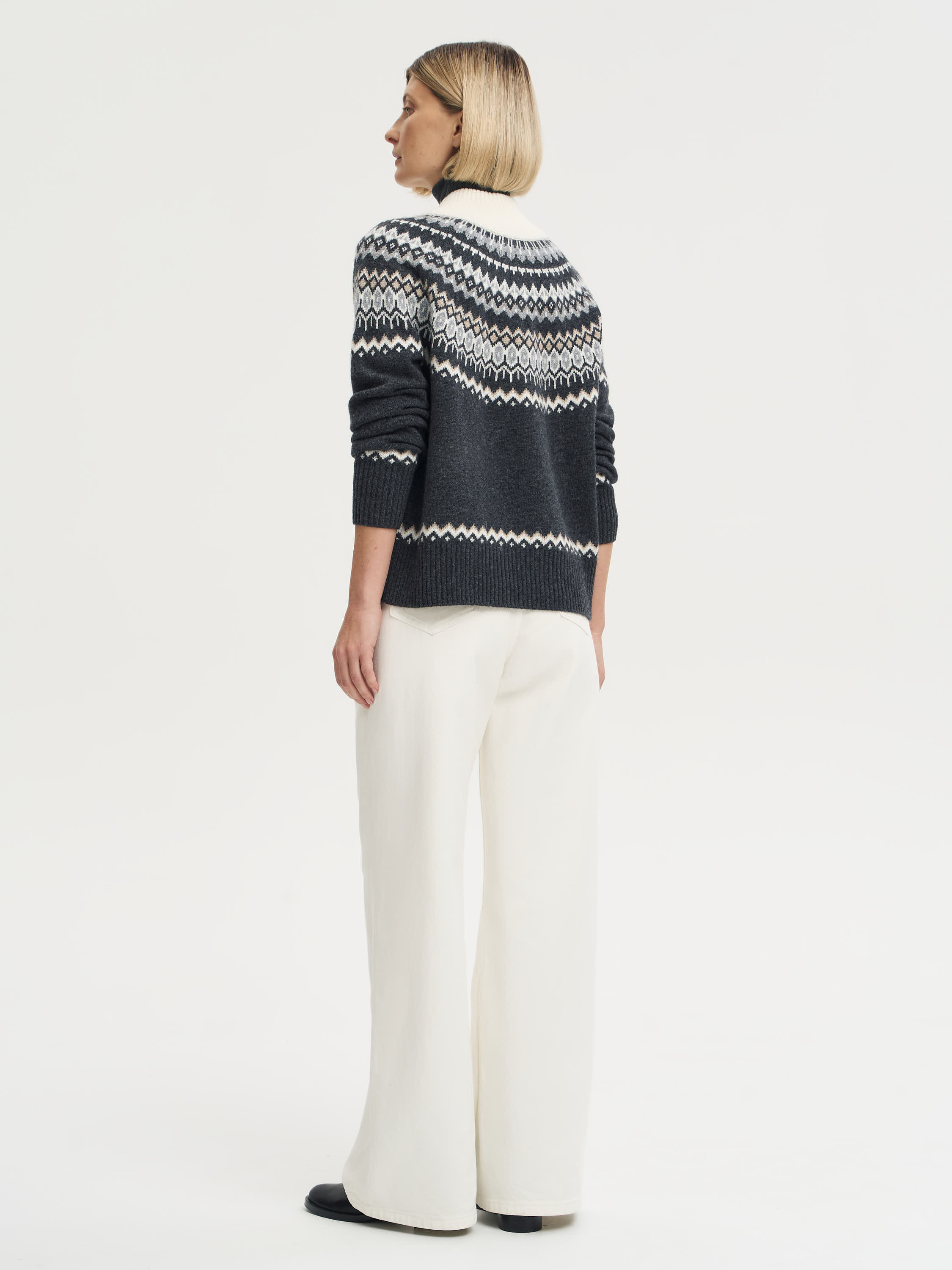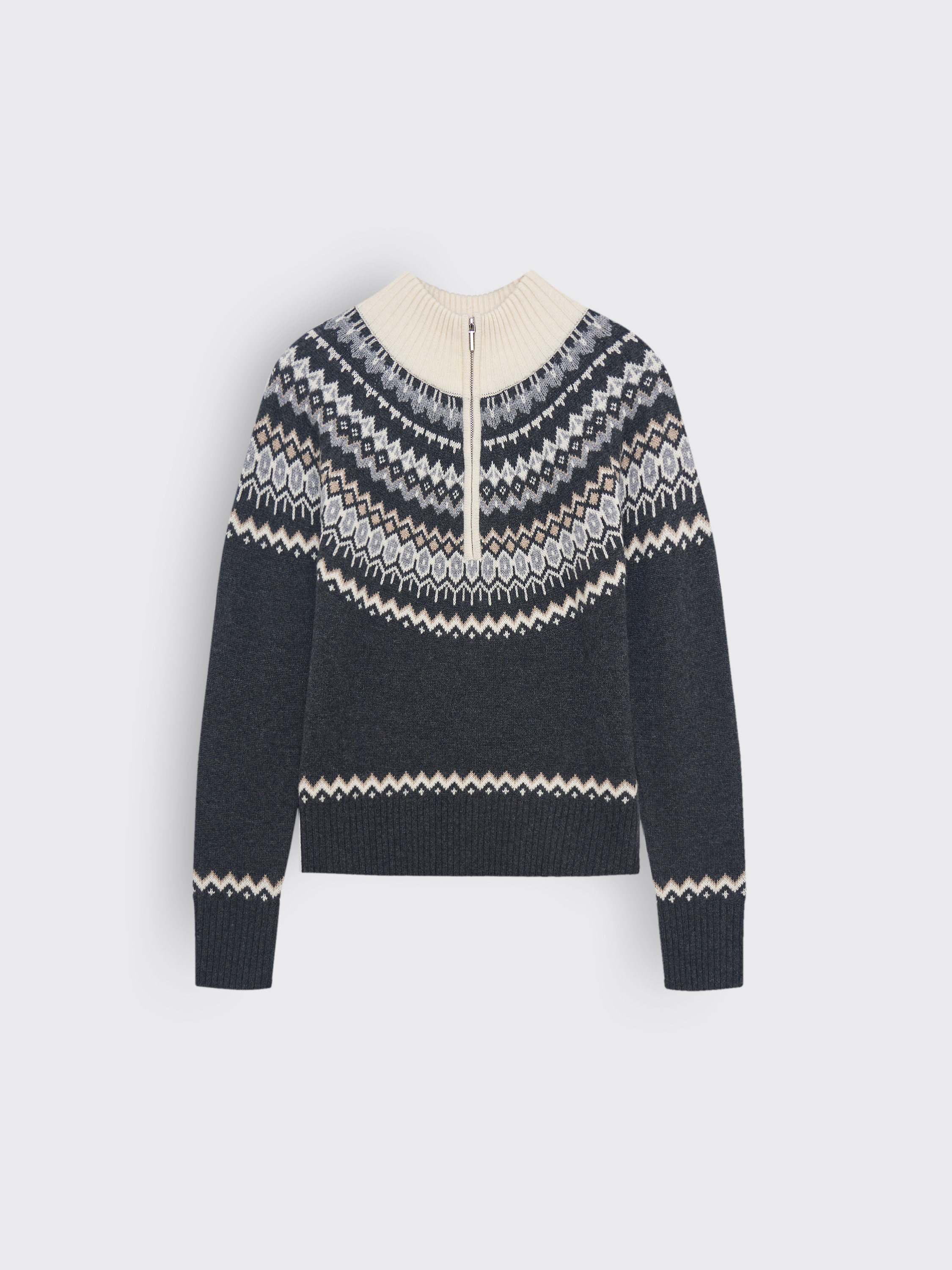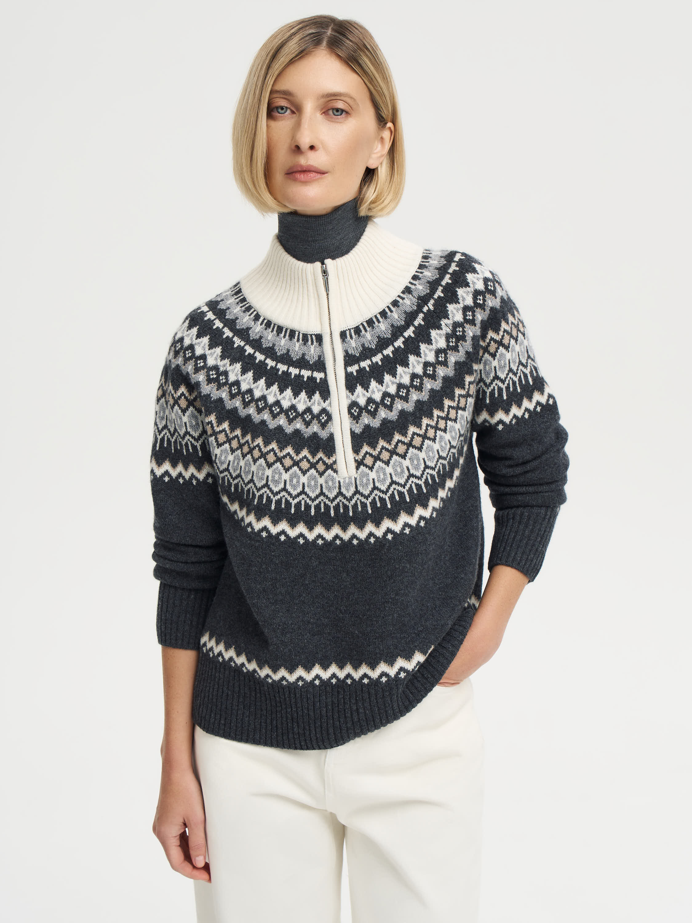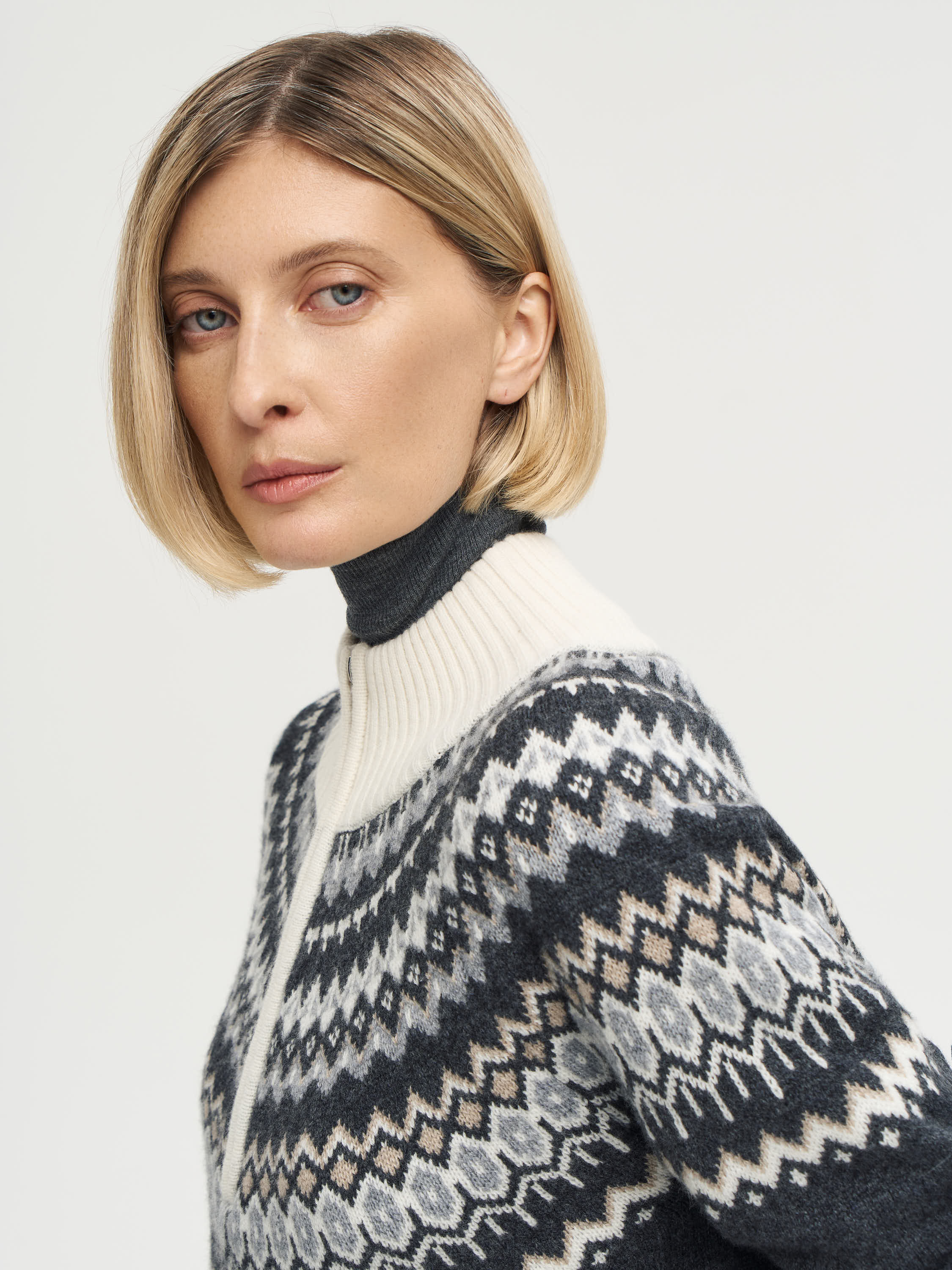 Джемпер из шерсти мериноса с добавлением кашемира сочетает тепло, мягкость и современный характер. Плотное трикотажное полотно сохраняет форму, приятно к телу и подходит для прохладного сезона. Узор в северном стиле придает модели выразительность, а воротник на молнии делает ее функциональной — можно носить расстегнутой для расслабленного образа или застегнутой, создавая эффект теплой стойки. Джемпер хорошо работает в многослойности: с водолазкой, рубашкой или пальто, формируя продуманный и комфортный образ на каждый день.