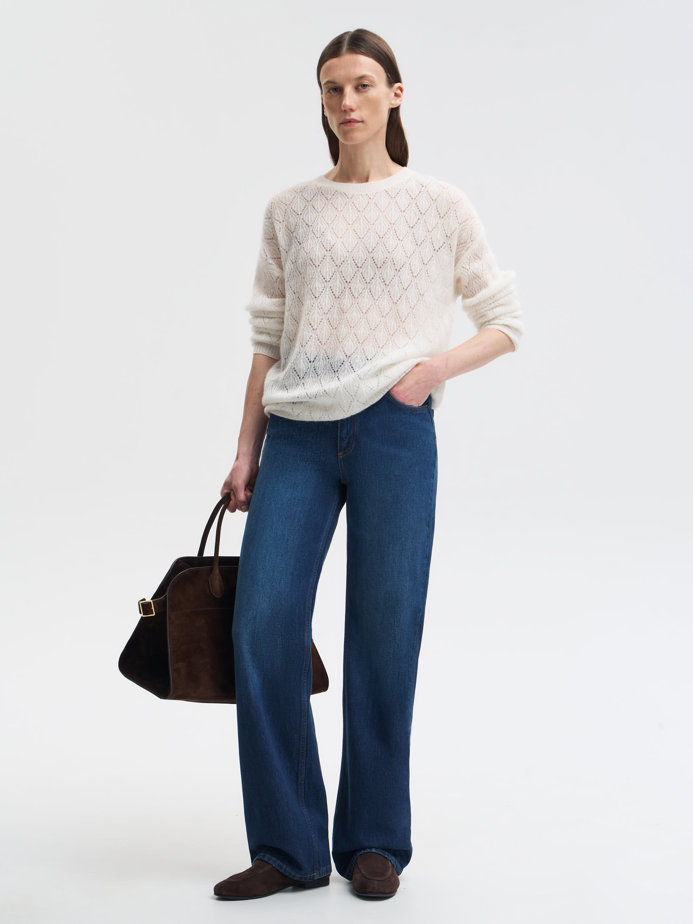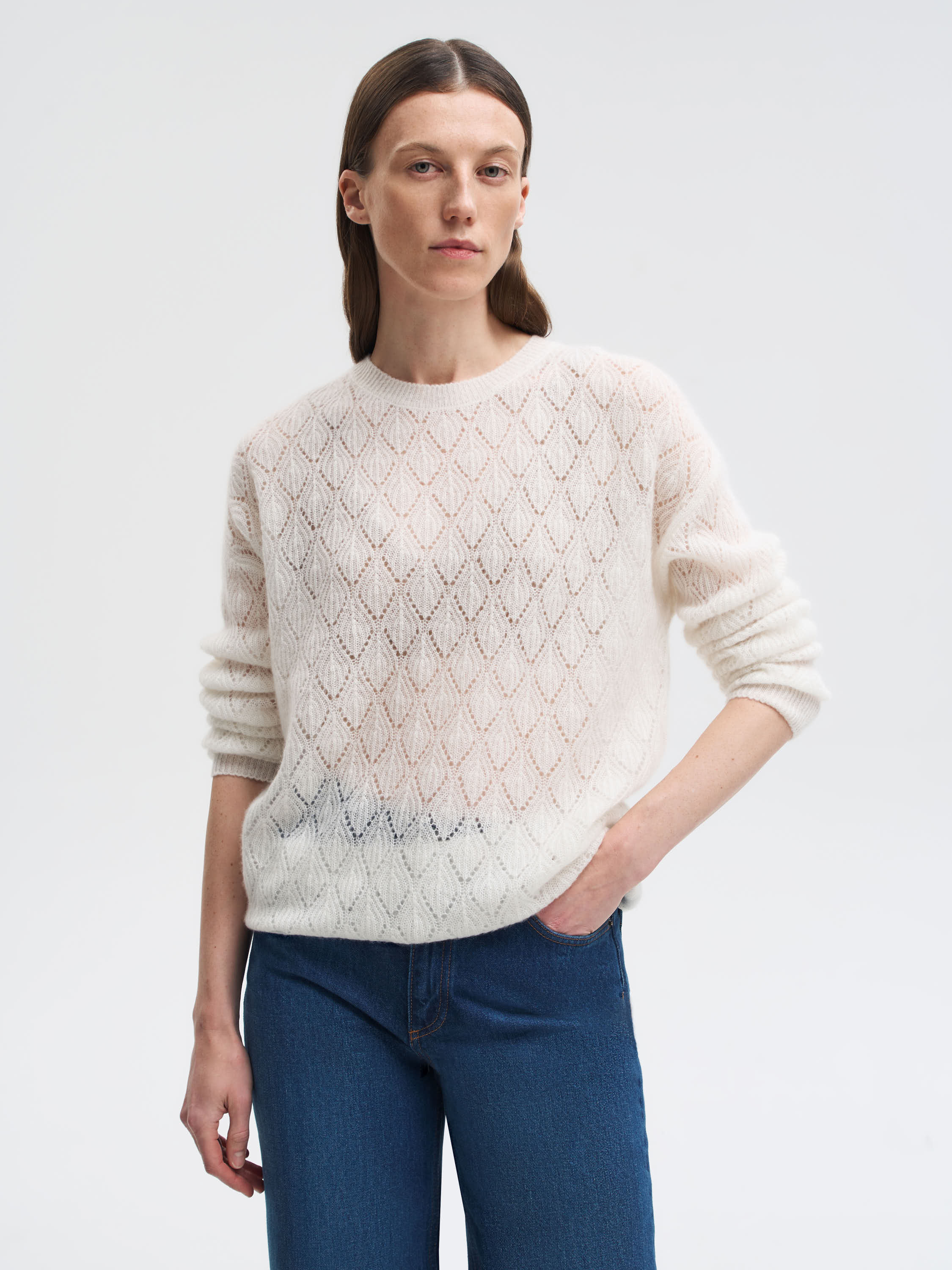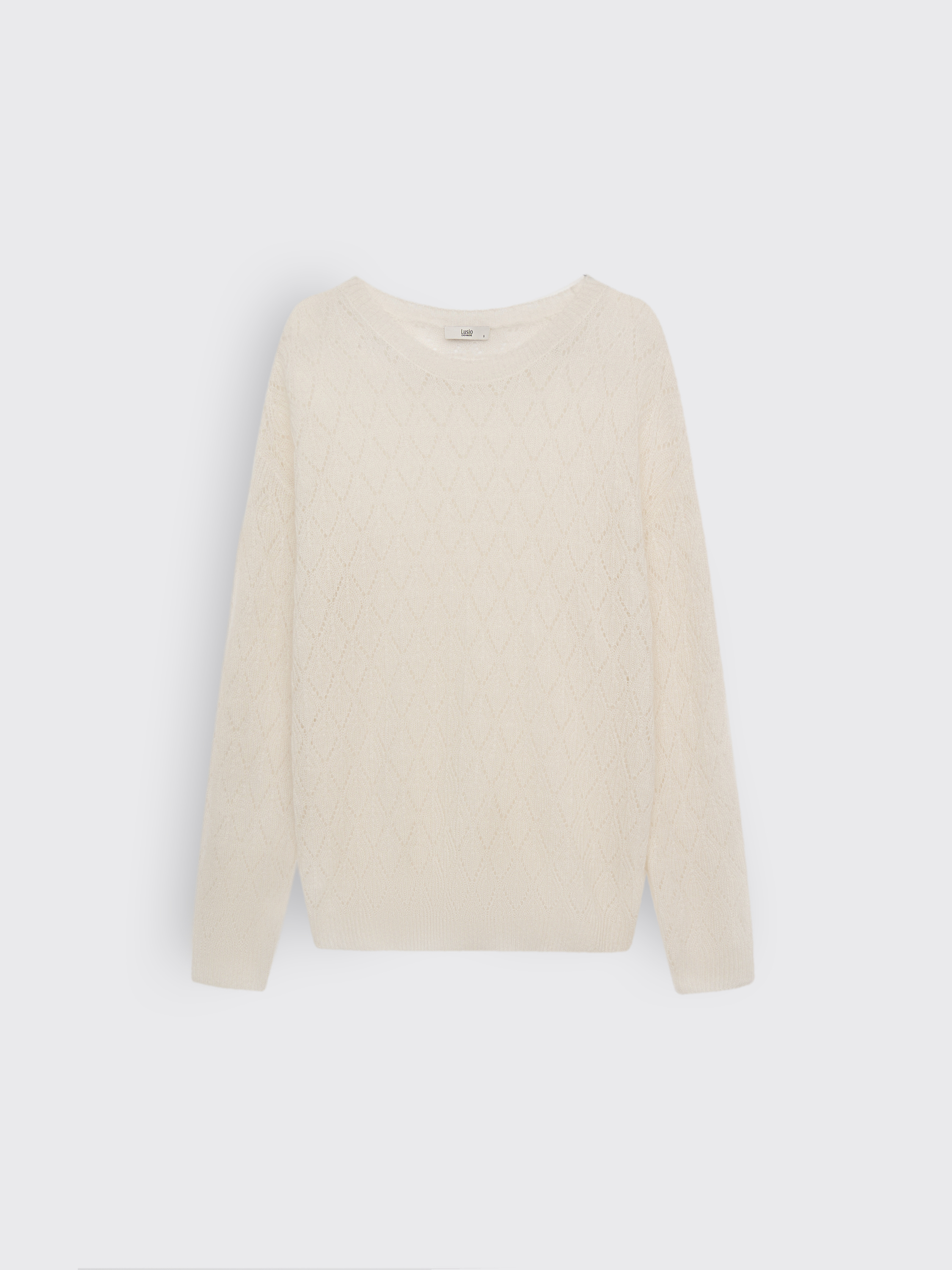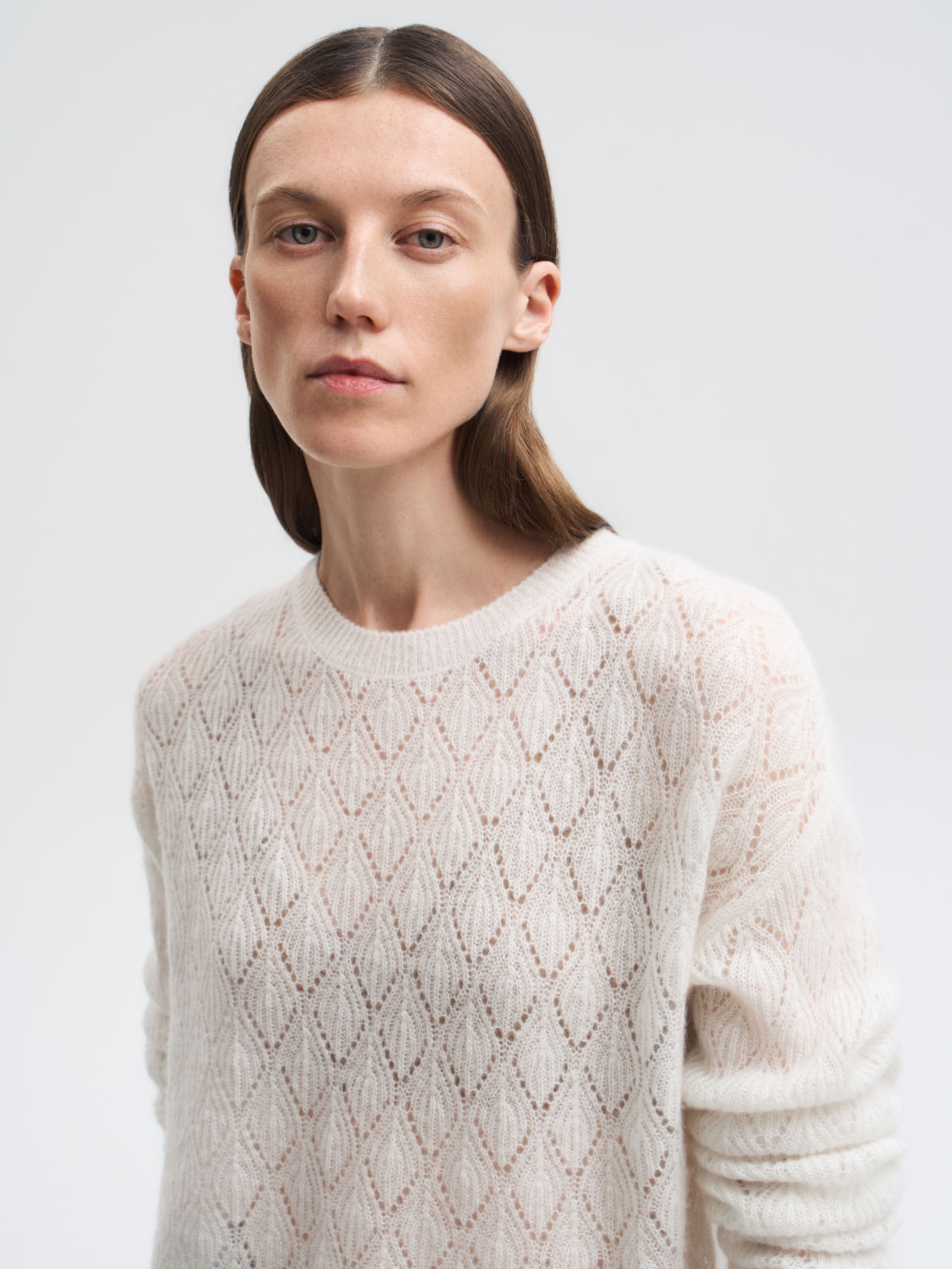 Джемпер из кашемира и шелка с утонченным ажурным узором. Легкий, дышащий трикотаж мягко ложится по фигуре, создавая ощущение невесомости и тепла. Благодаря шелковой нити материал имеет деликатный блеск, подчеркивающий глубину оттенка. Классический круглый вырез и аккуратная посадка делают модель базовой, но при этом выразительной. Джемпер гармонично сочетается с кожаными брюками, юбками миди или строгими костюмными вариантами — подчеркивая естественную элегантность образа.