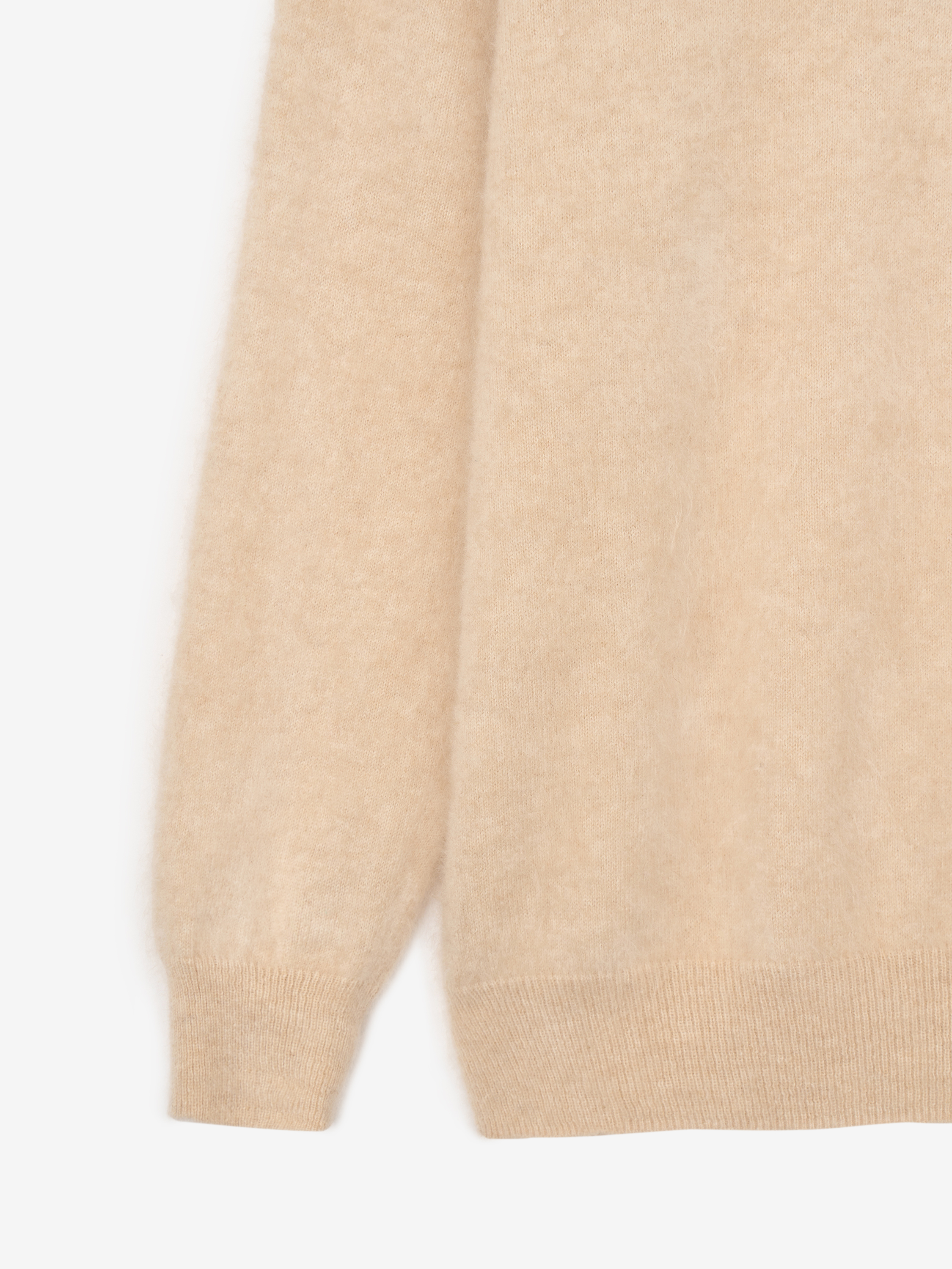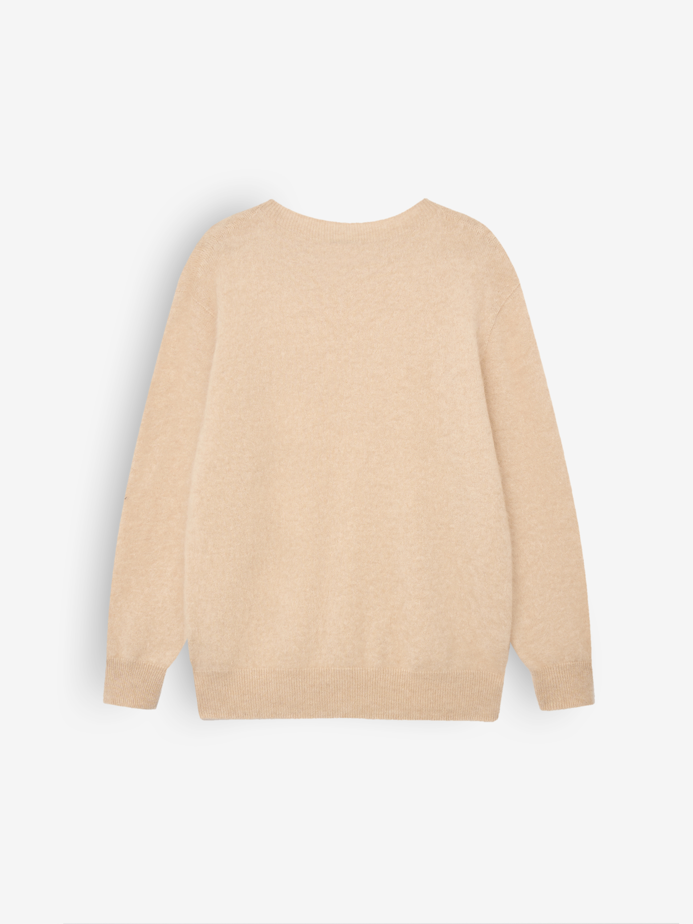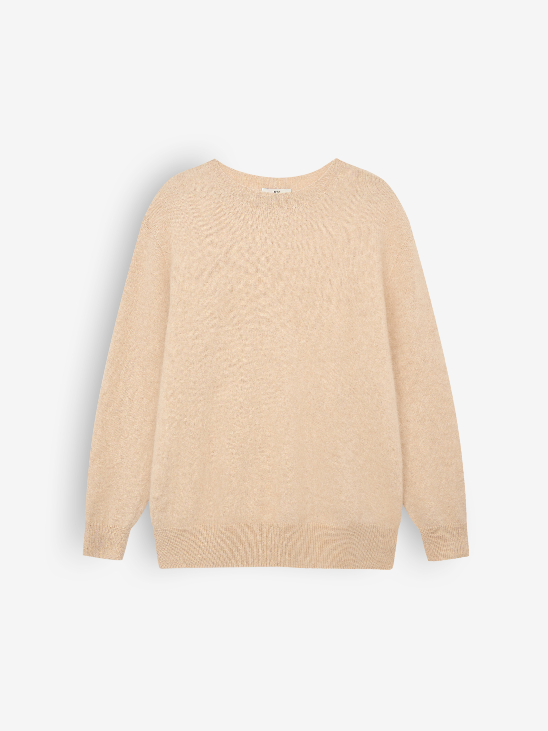 Джемпер из 100% кашемира выполнен в свободном, мягко очерченном силуэте. Полотно обладает характерной для кашемира пушистостью и ровной текстурой, которая дает ощущение тепла еще до прикосновения с ним. Горловина оформлена чистой линией, манжеты и нижний край связаны плотной резинкой, создавая аккуратный переход и собирая форму. Посадка расслабленная, но не объемная: изделие естественно драпируется и сохраняет визуальную легкость. Такой джемпер органично вписывается в повседневные и более собранные комплекты: работает с прямыми брюками, спокойным денимом и мягкими юбками, сохраняя чистую линию образа.