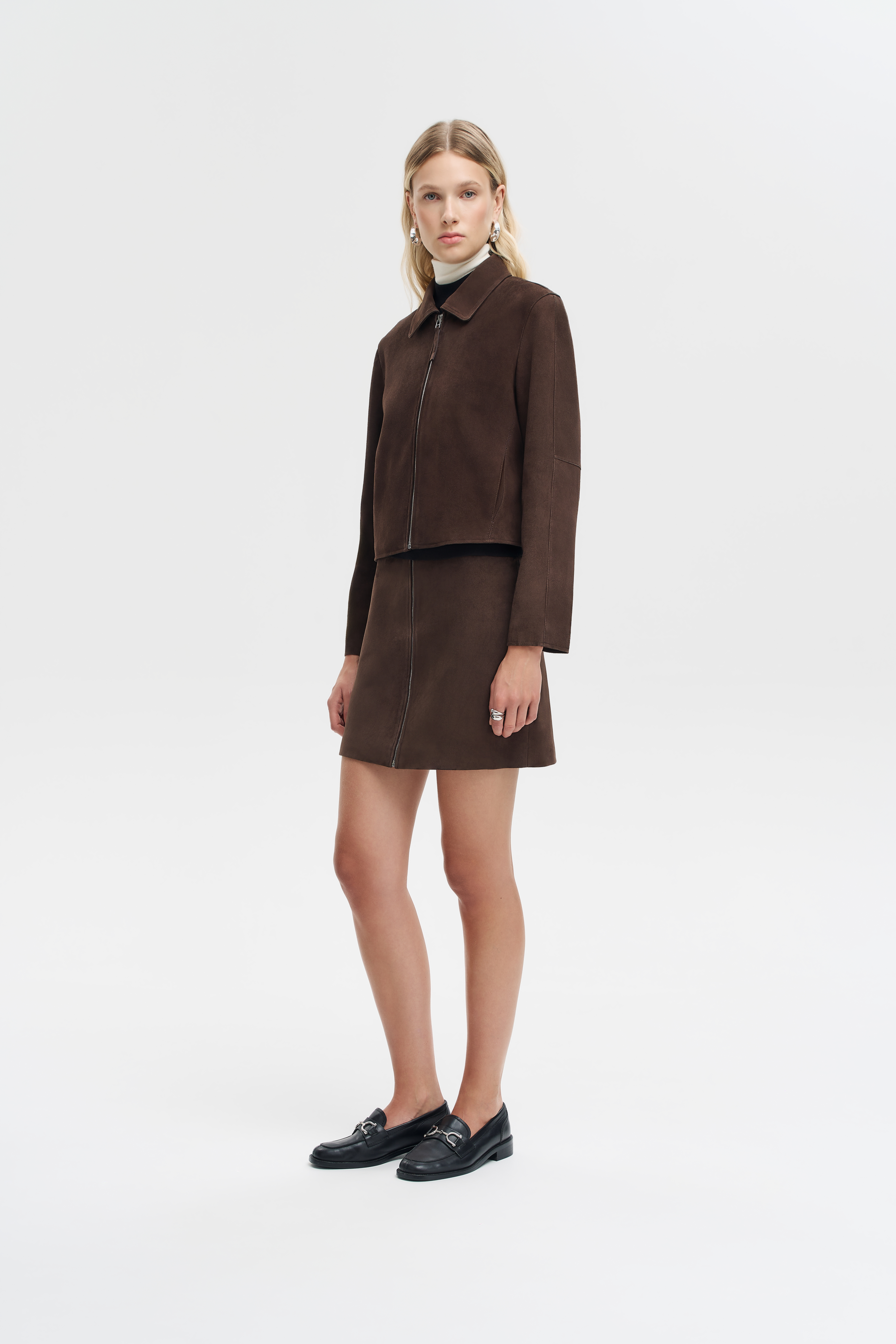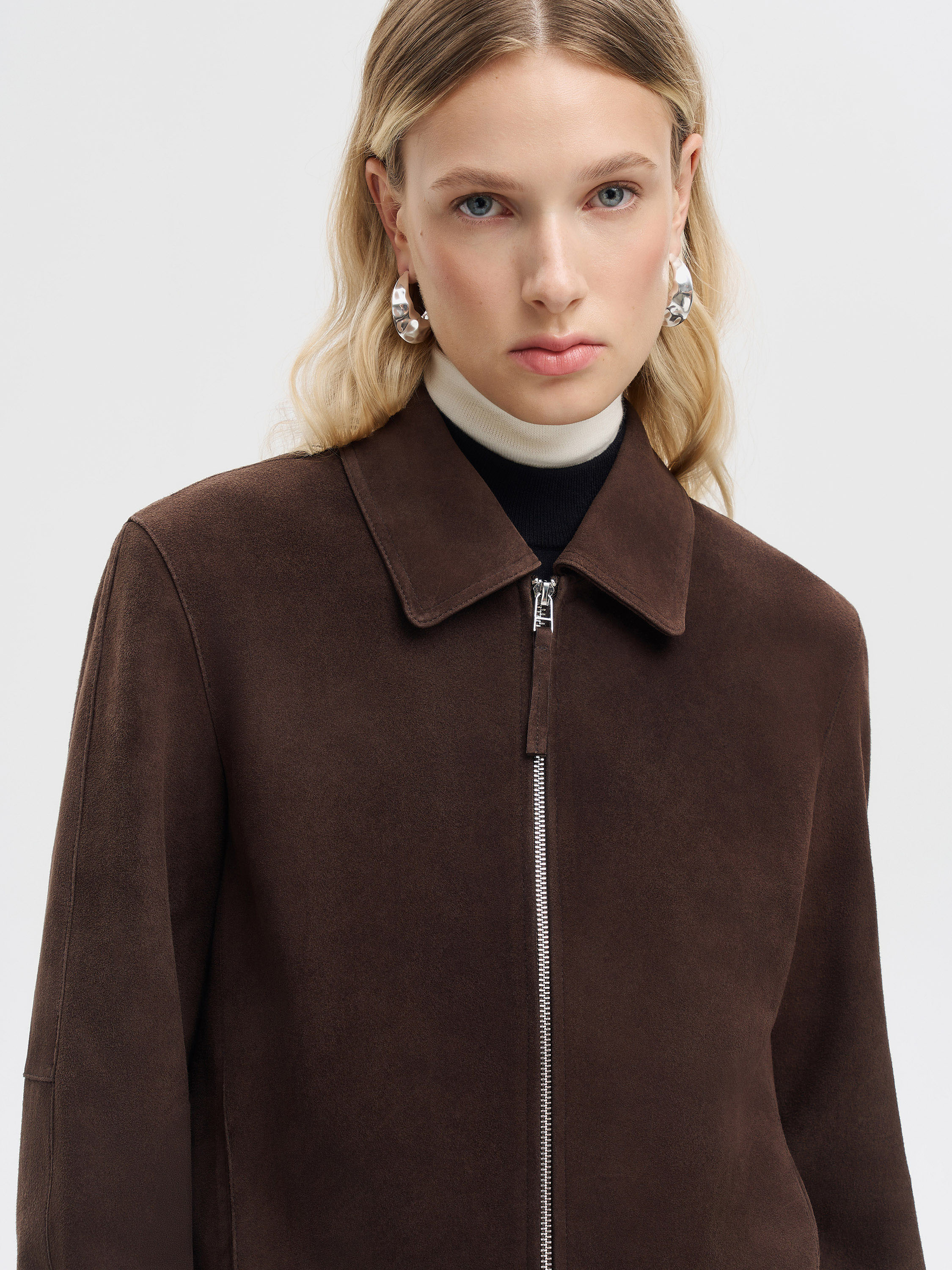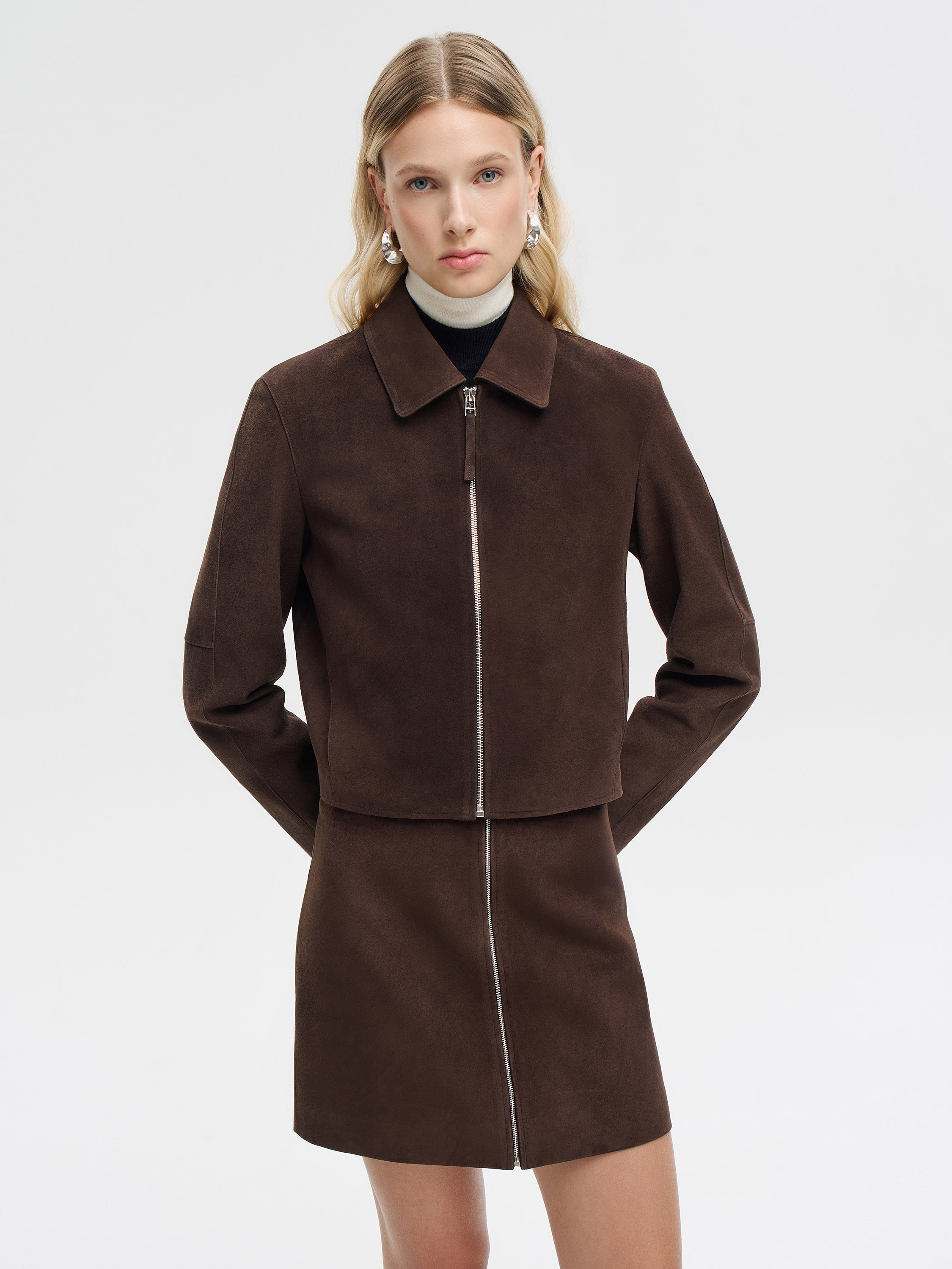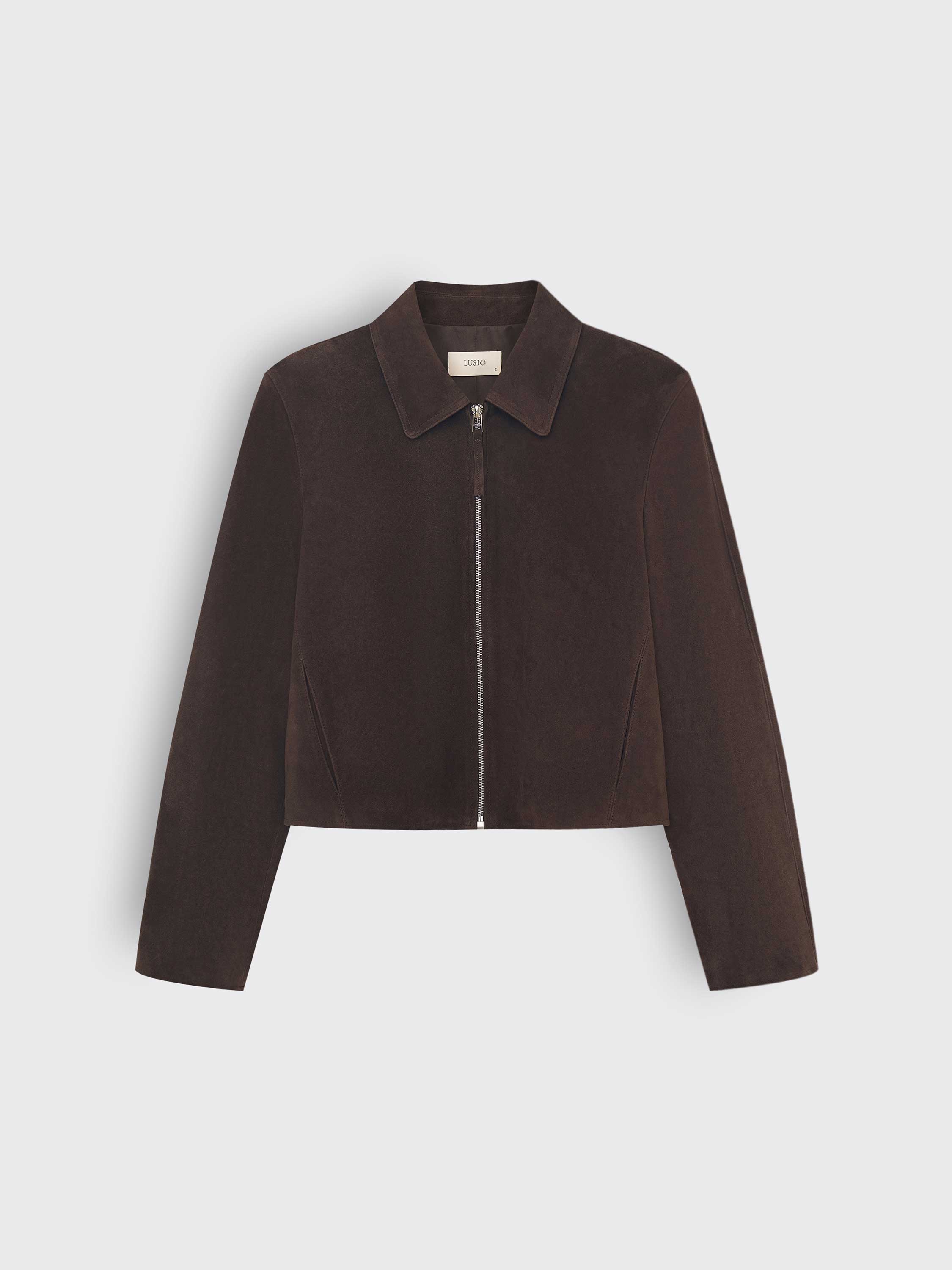 Куртка из натуральной замши с мягкой матовой фактурой и лаконичным кроем. Модель укороченного силуэта с классическим отложным воротником и застежкой на молнию по центру. Материал пластичный и приятный на ощупь, отличается естественной бархатистостью и комфортом в носке. Чистые линии и минималистичный дизайн делают куртку универсальной: она гармонично вписывается в повседневные ансамбли с джинсами или юбками и легко становится частью более собранных образов в современном стиле.