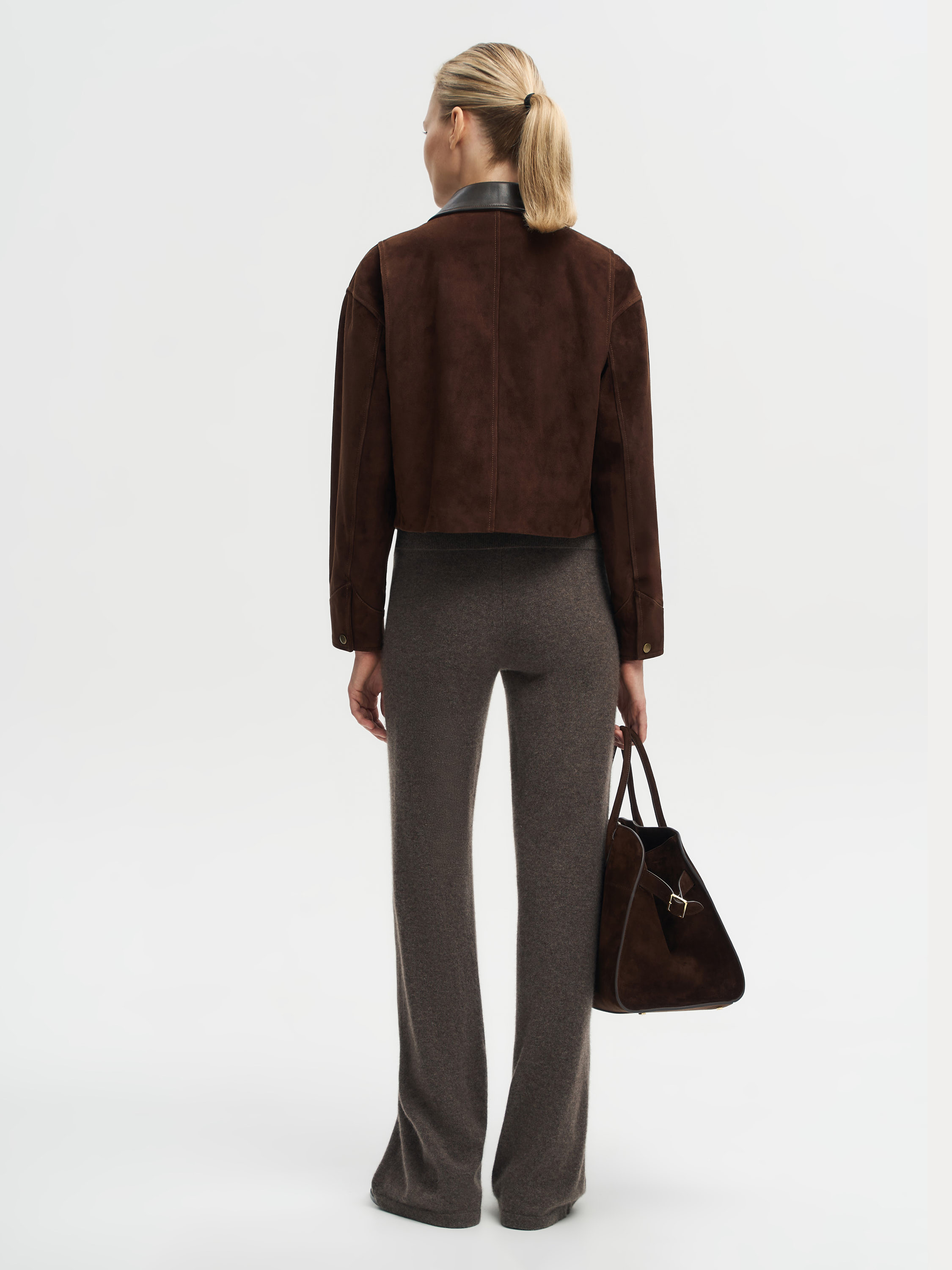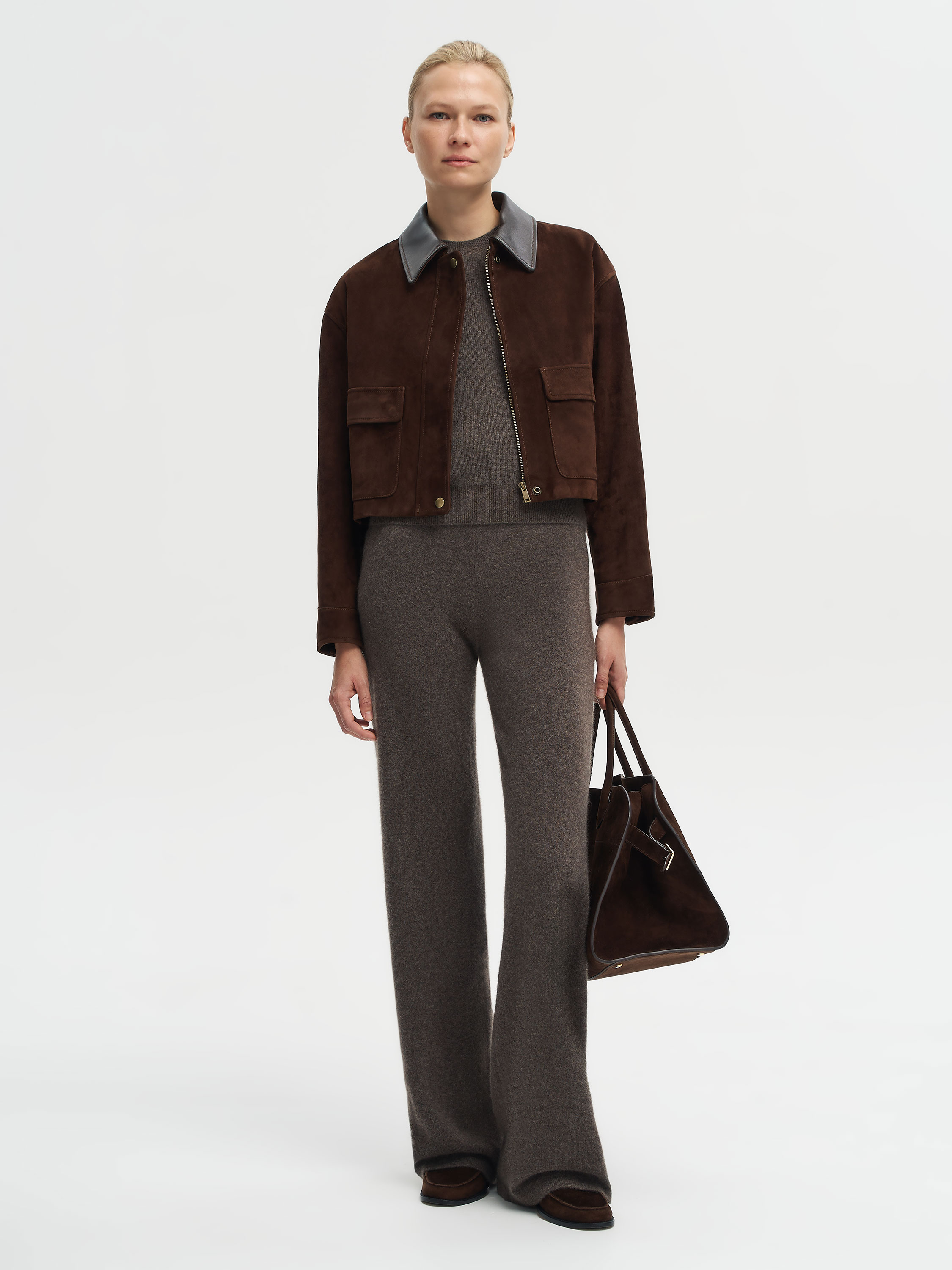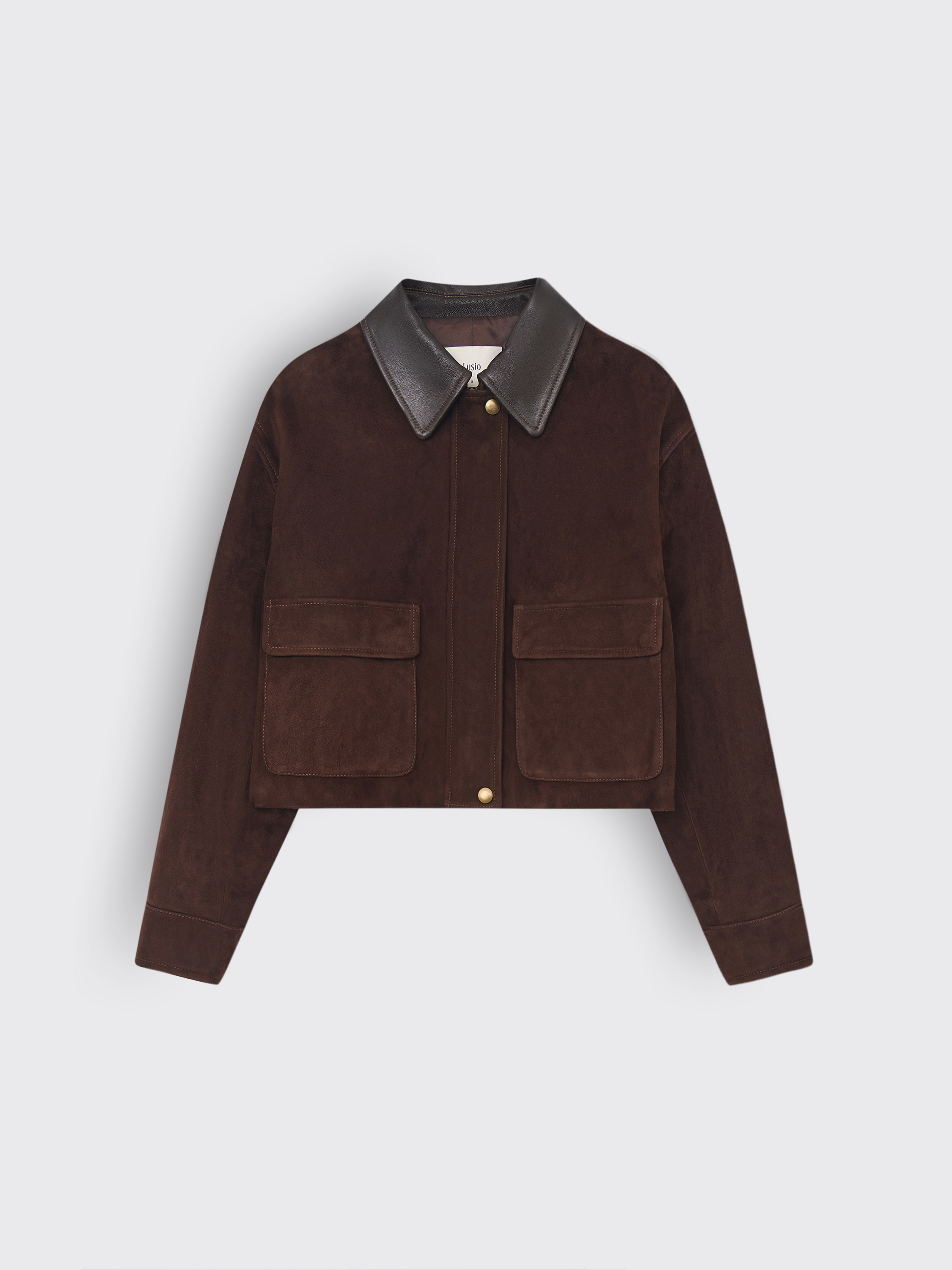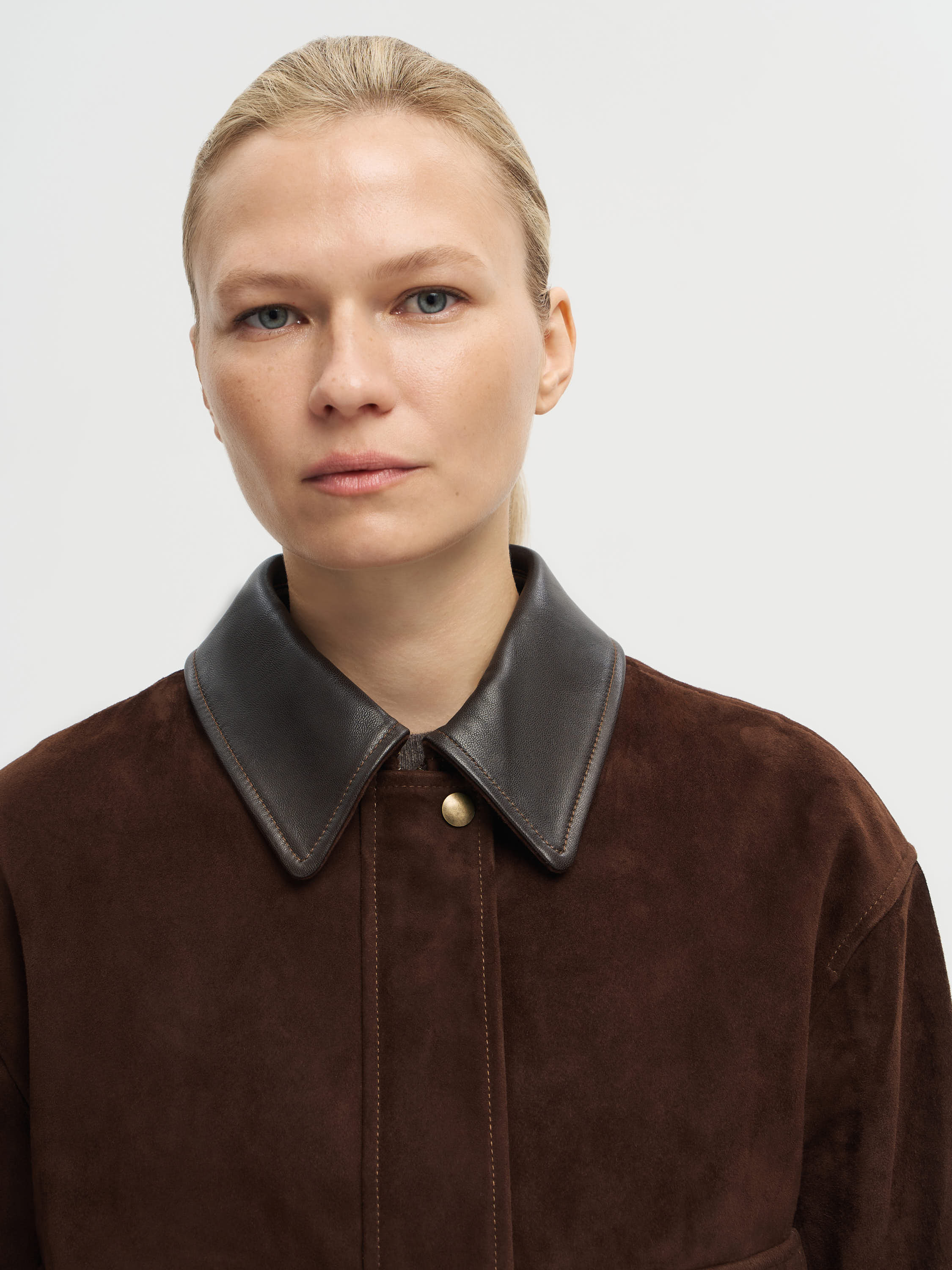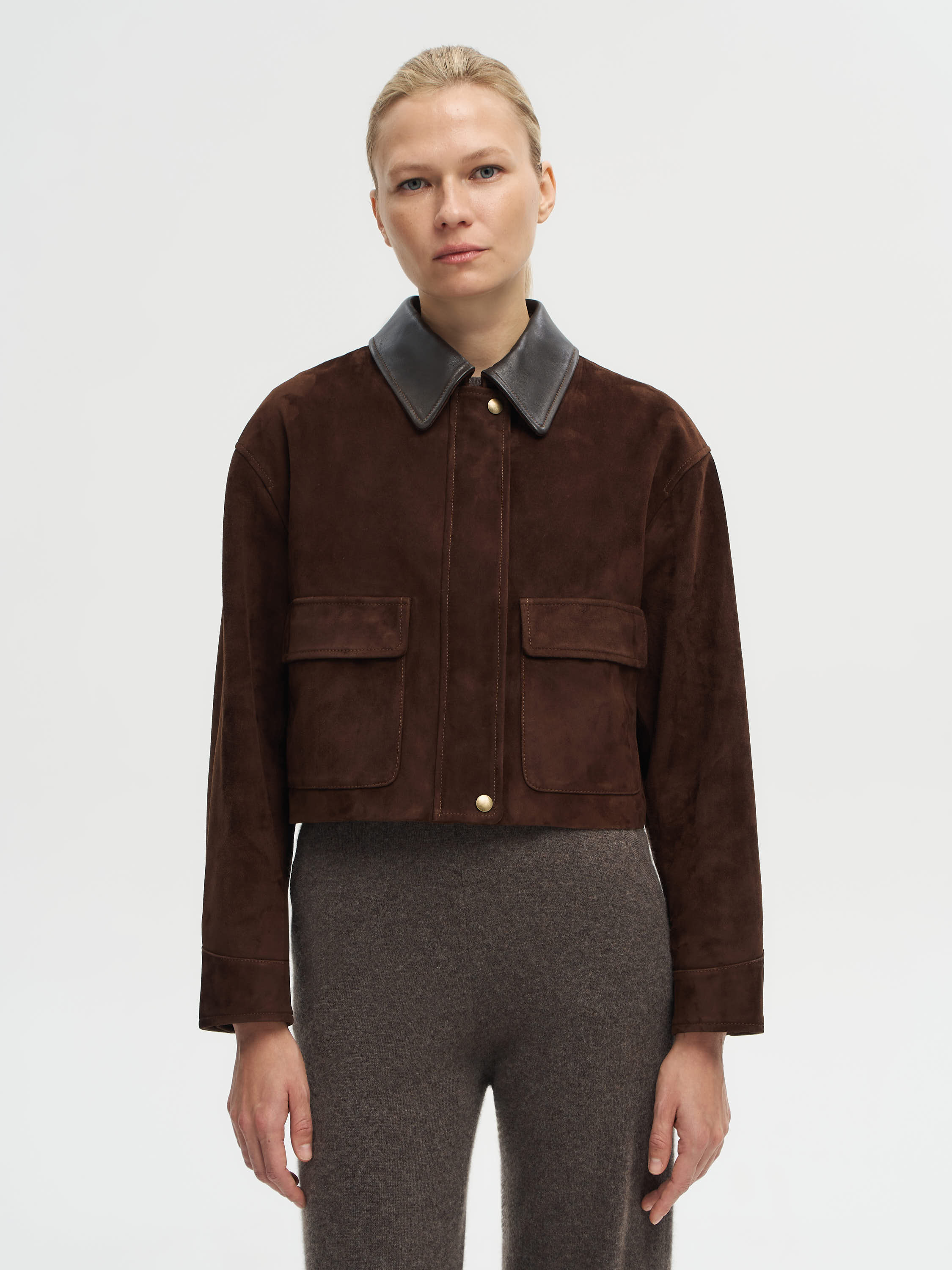 Укороченная куртка из мягкой замши с контрастным кожаным воротником. Материал обладает бархатистой фактурой, плотный, но податливый, хорошо держит форму и сохраняет аккуратный вид. Прямой крой с четкой линией плеча создает лаконичный силуэт, а крупные накладные карманы придают модели графичность. Застежка на потайные кнопки с акцентной верхней деталью завершает дизайн. Элегантное сочетание замши и гладкой кожи подчеркивает современный характер вещи и делает ее актуальной в городских образах.