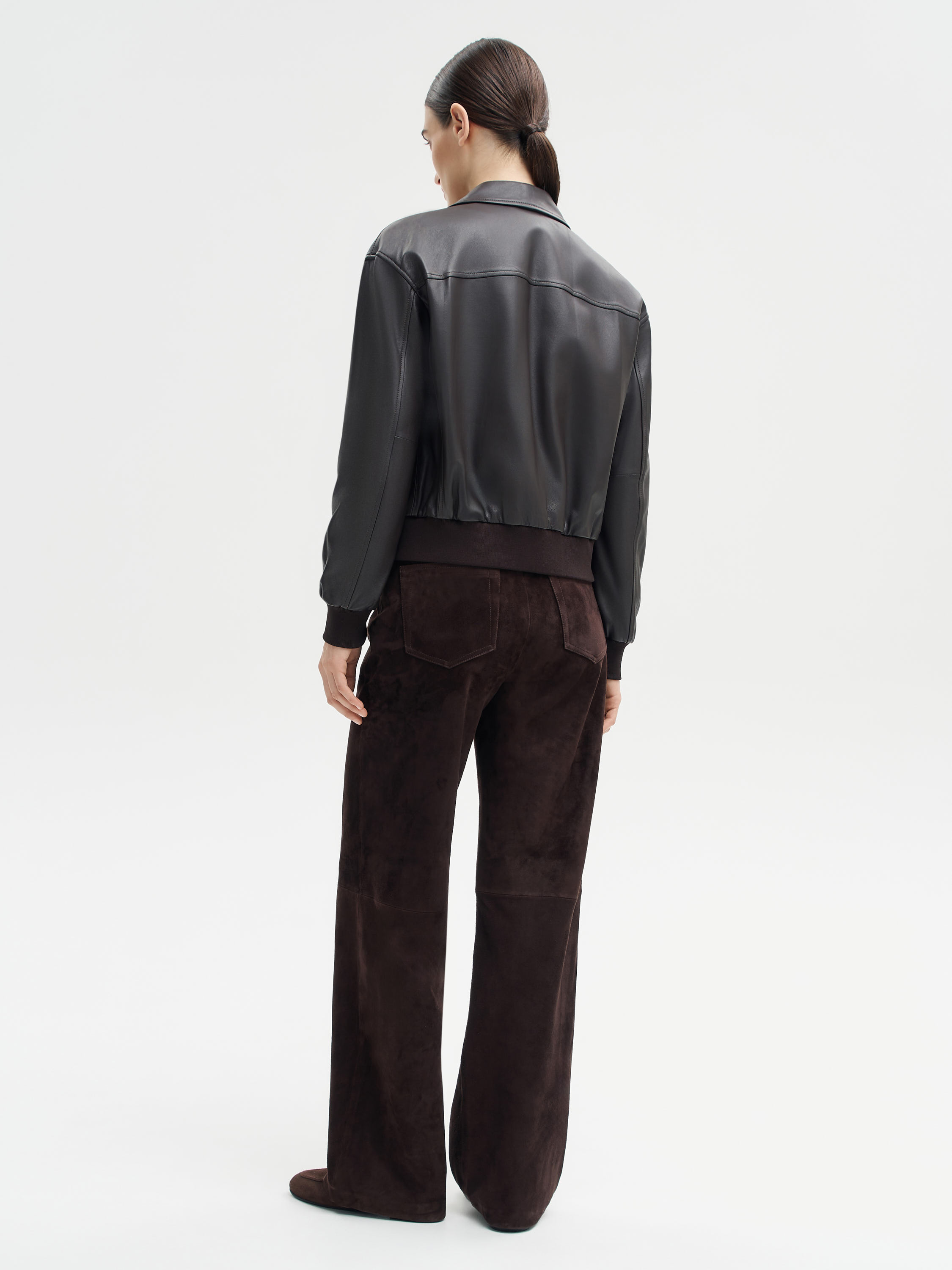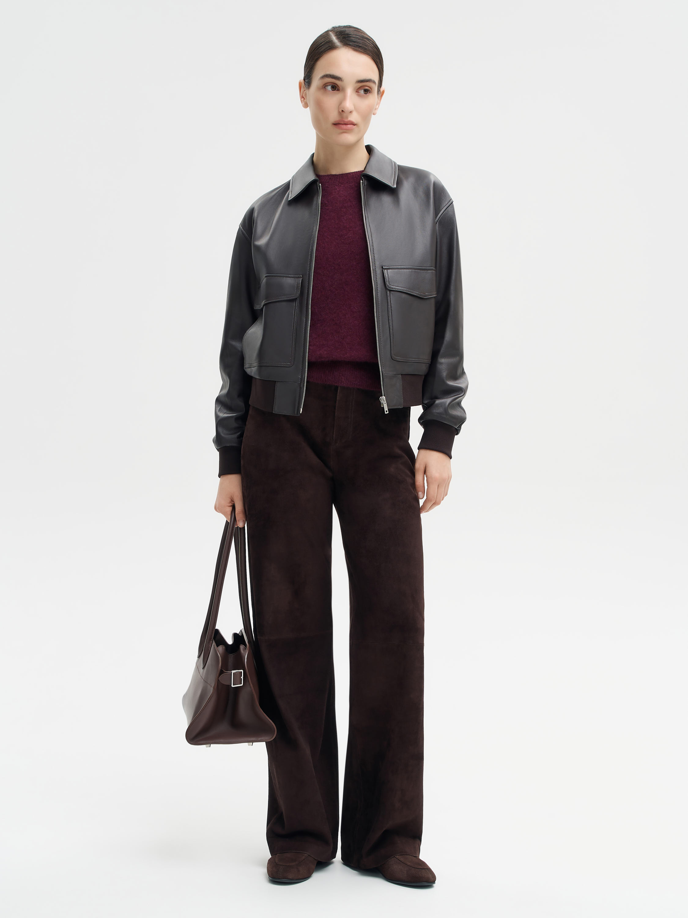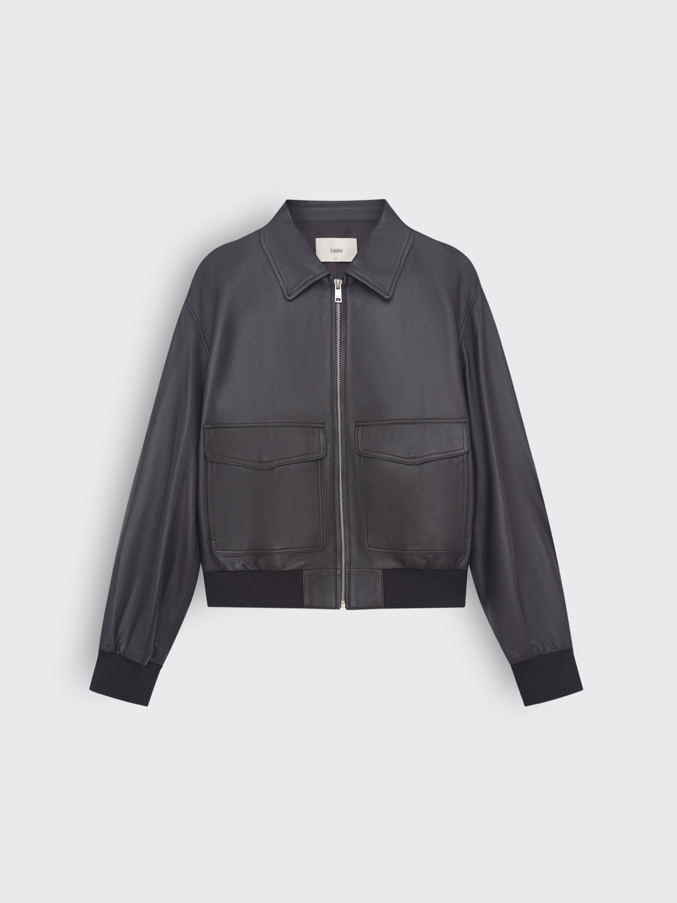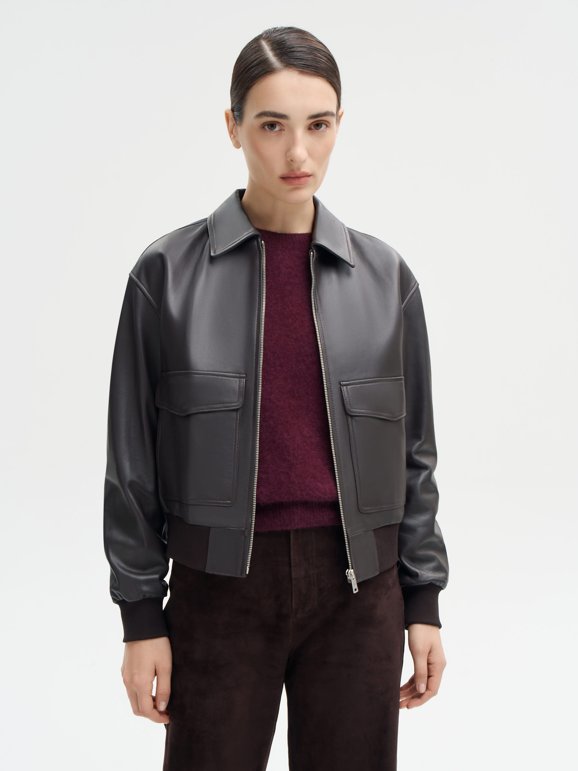 Куртка выполнена из гладкой кожи с мягким матовым блеском. Прямой крой с молнией и накладными карманами создает чистый силуэт в духе минимализма. Классический отложной воротник подчеркивает графичность линии, а аккуратные манжеты добавляют собранности. Лаконичный дизайн делает модель универсальной: её легко носить как с брюками и джинсами, так и в многослойных образах с платьями или юбками.