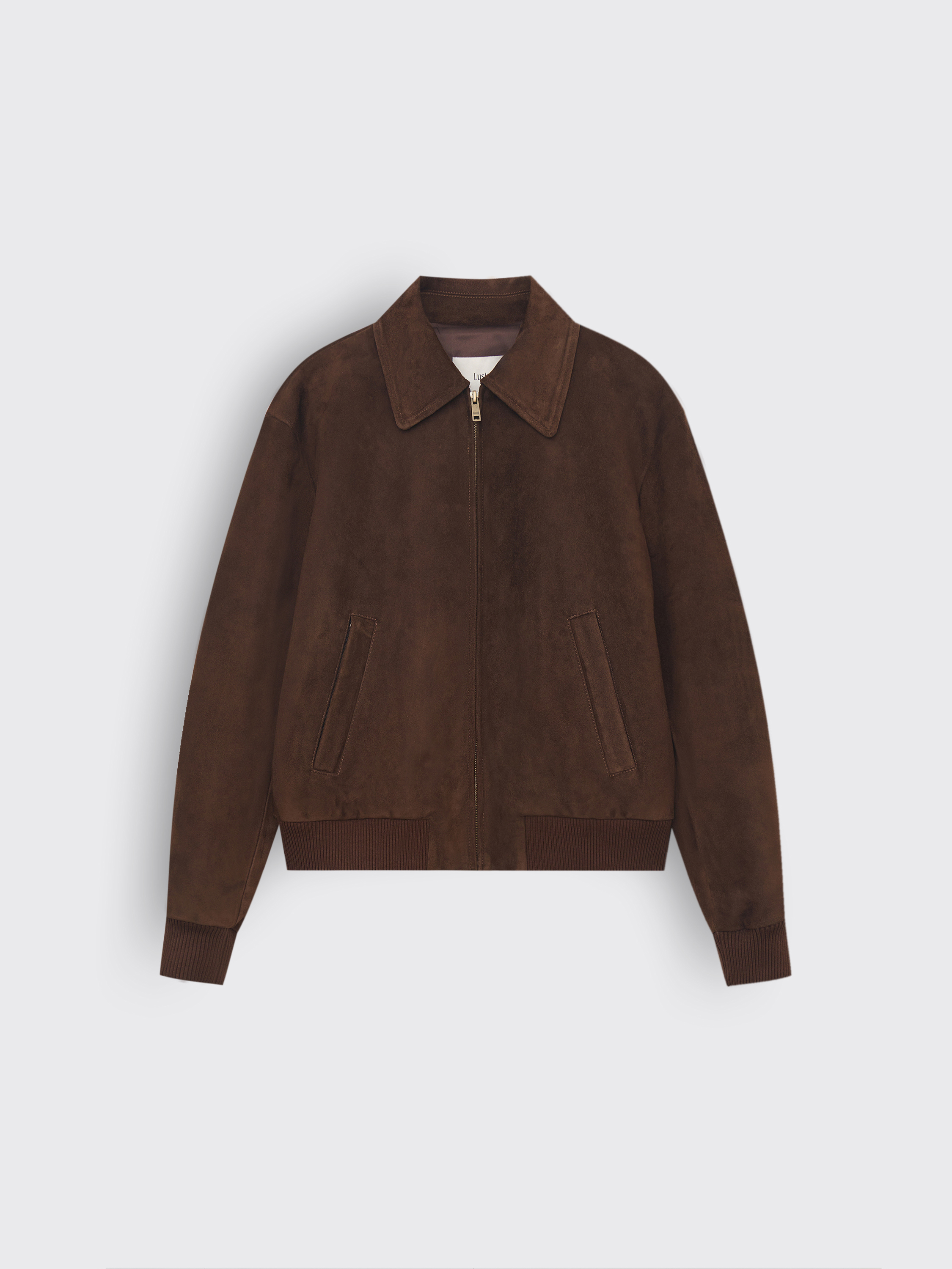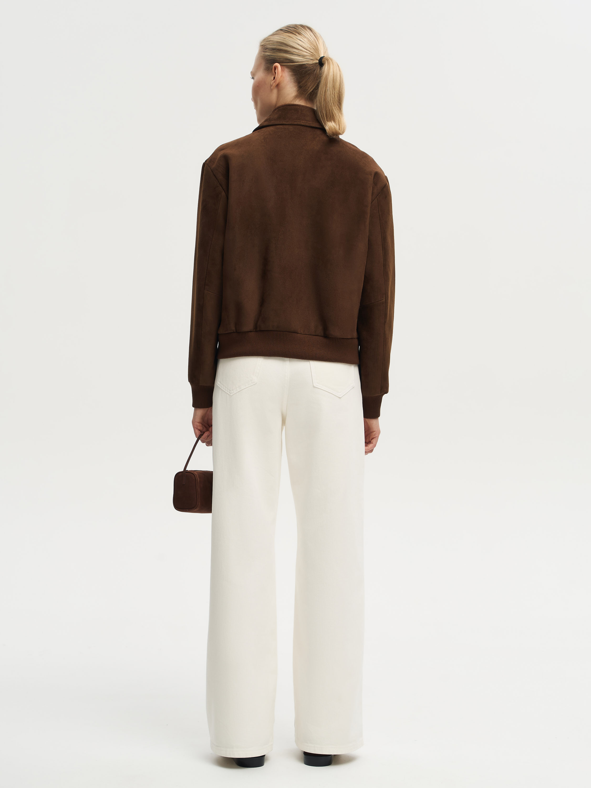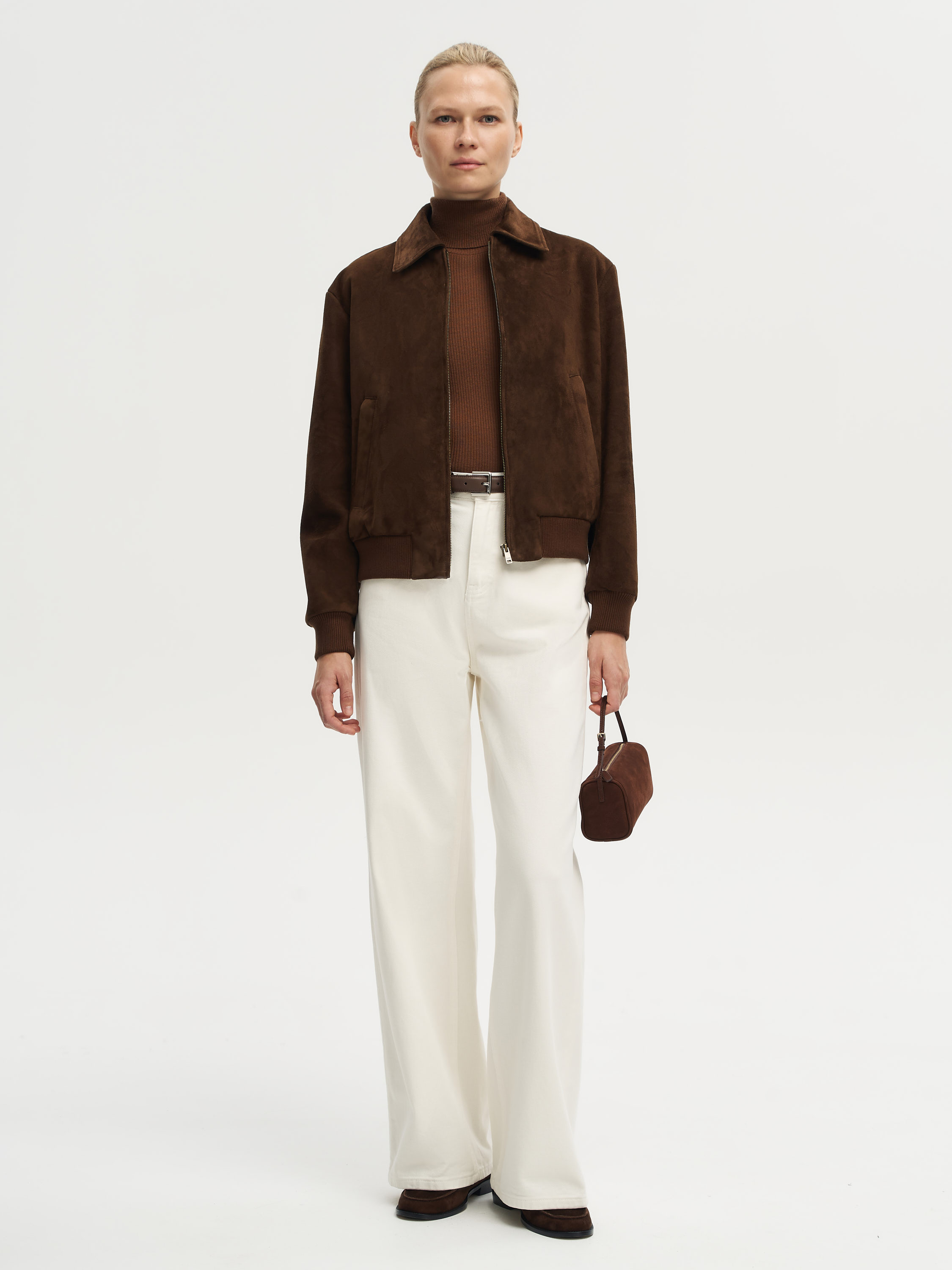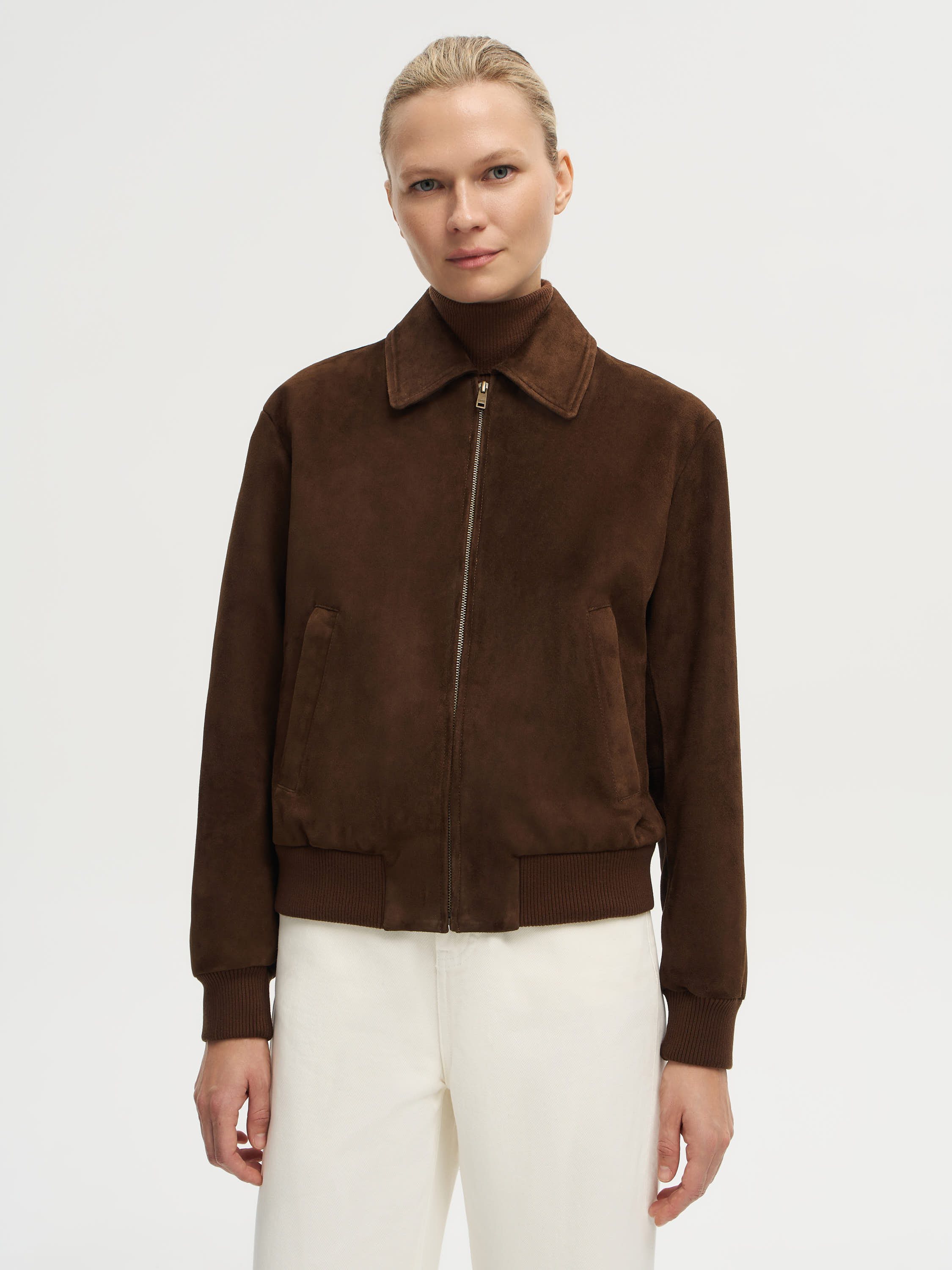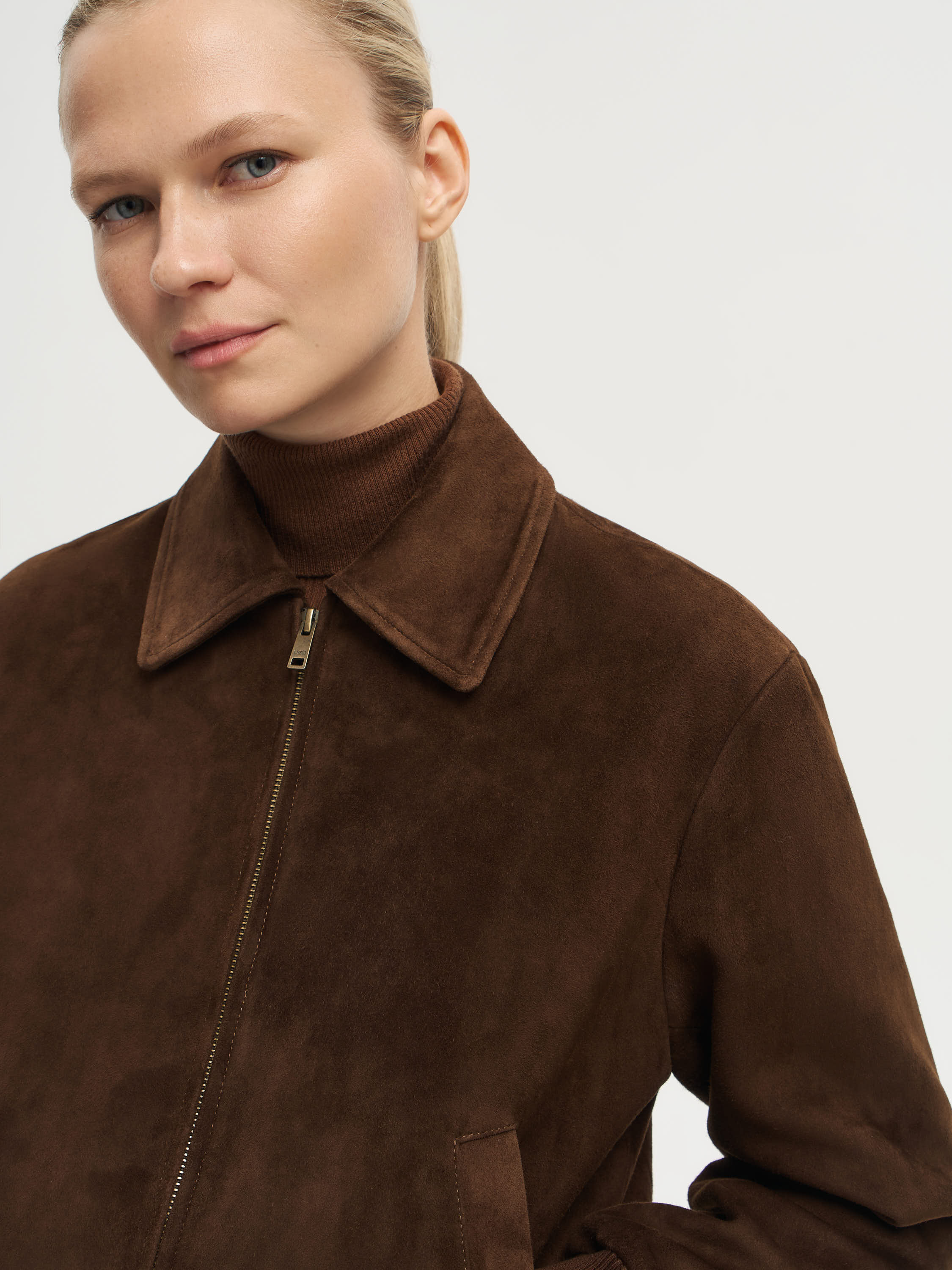 Куртка из мягкой замши с бархатистой текстурой и приятной плотностью материала. Ткань комфортна в носке, держит форму и создает аккуратный силуэт. Классический воротник, металлическая молния и прорезные карманы подчеркивают лаконичность дизайна. Манжеты и нижний край выполнены из эластичной трикотажной резинки, обеспечивающей удобную посадку и защиту от холода. Универсальная модель для осеннего сезона, которая одинаково органично смотрится и в повседневных, и в более собранных образах.