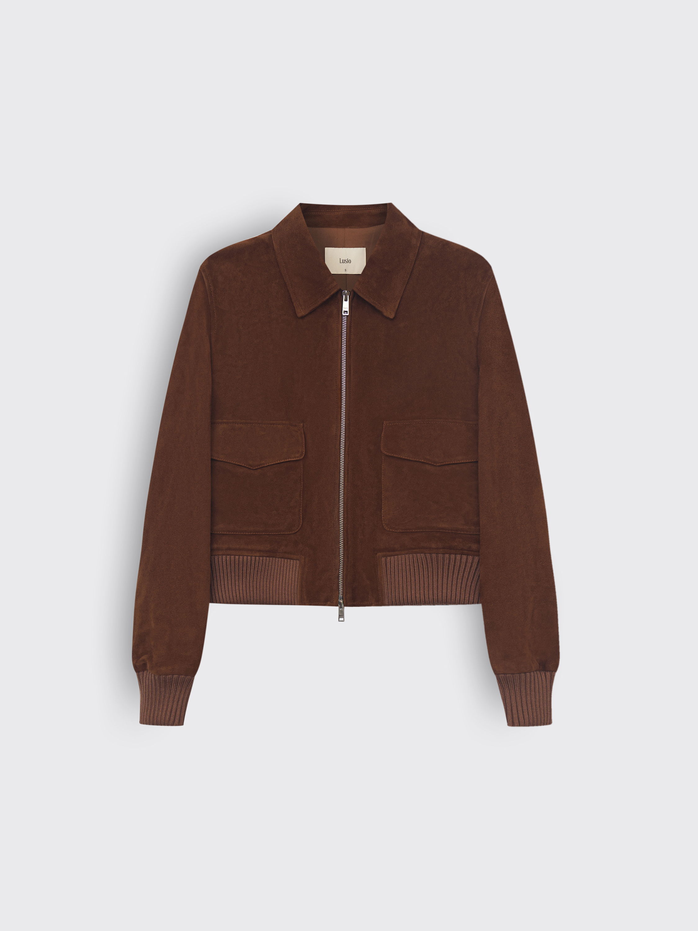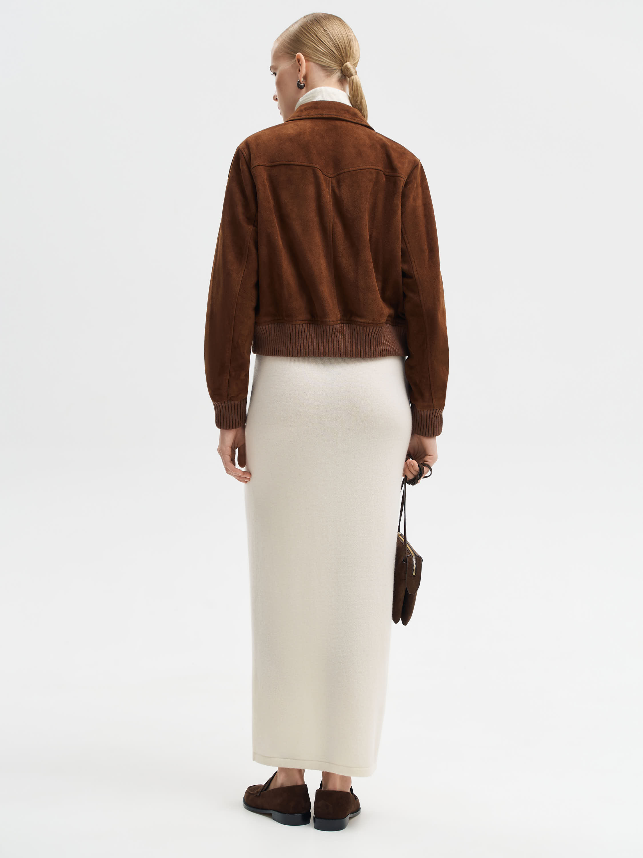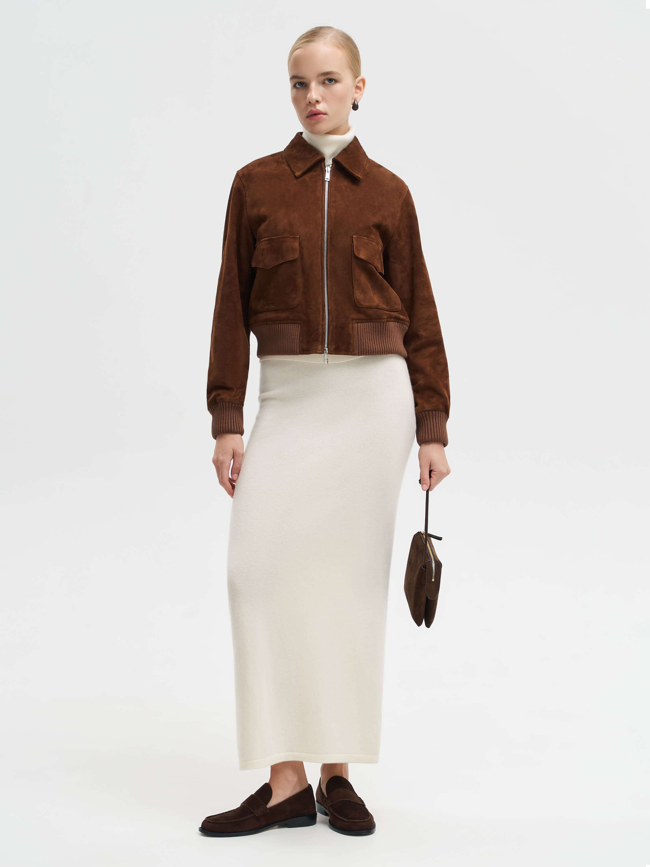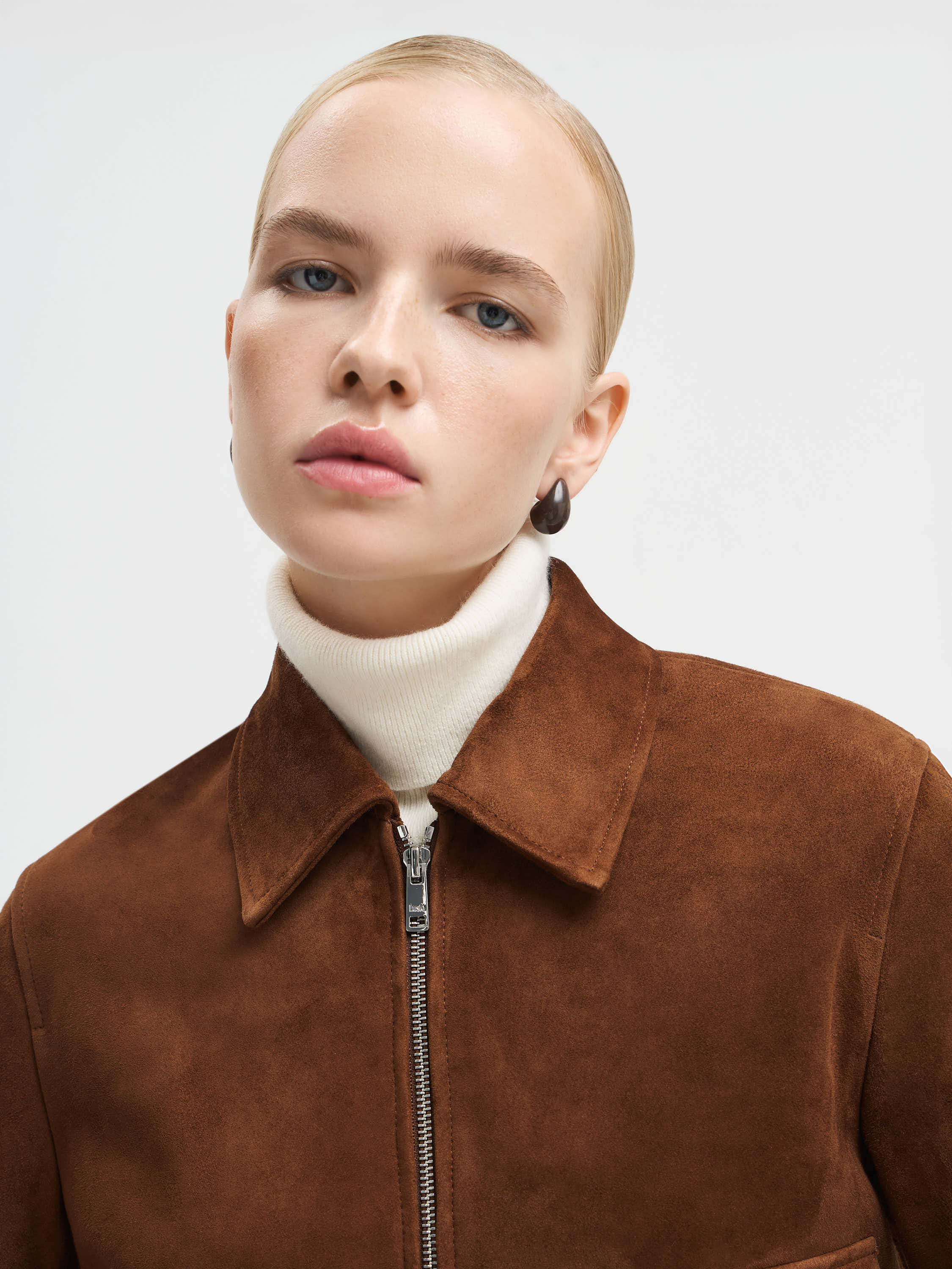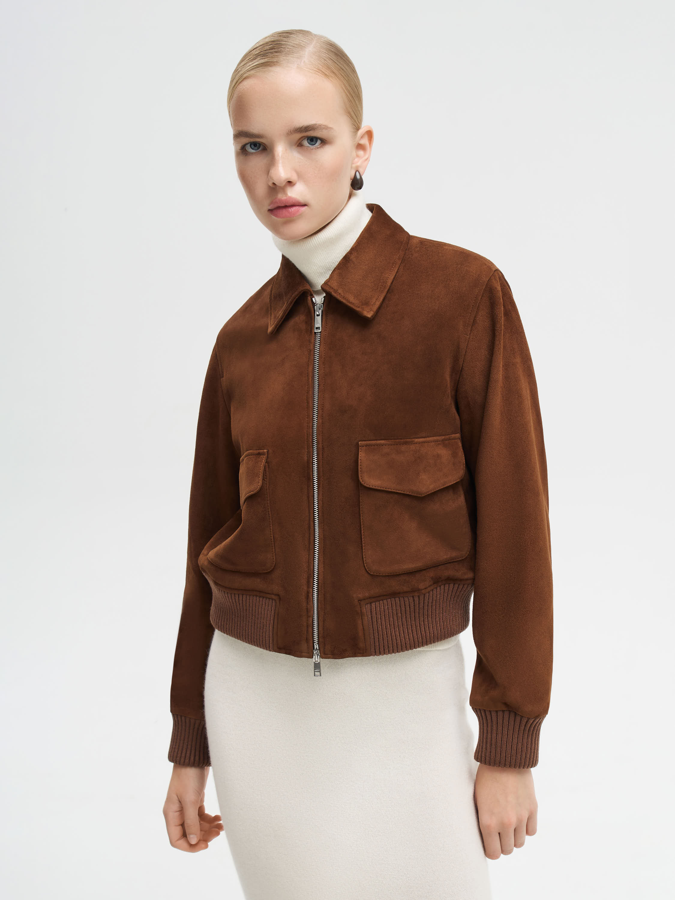 Куртка из замши с укороченным силуэтом и четкой геометрией кроя. Мягкий материал подчеркивает фактуру, при этом сохраняет форму и комфорт в носке. Классический воротник и застежка на молнию делают модель практичной, а накладные карманы с клапанами добавляют акцент. Эластичные вставки по низу и на манжетах обеспечивают удобную посадку и завершенность силуэта. Куртка легко сочетается с трикотажем, брюками и юбками, оставаясь универсальной частью гардероба.