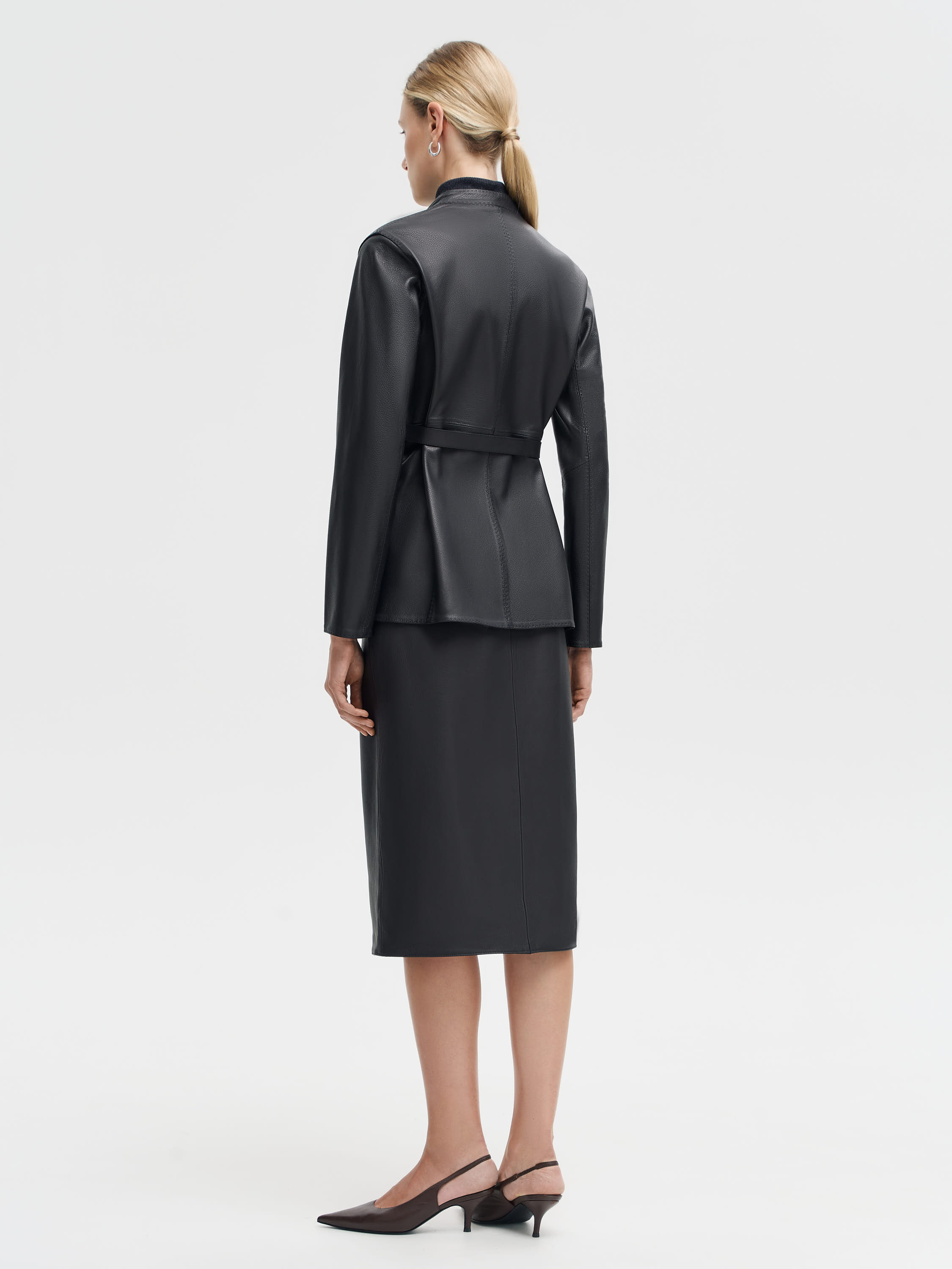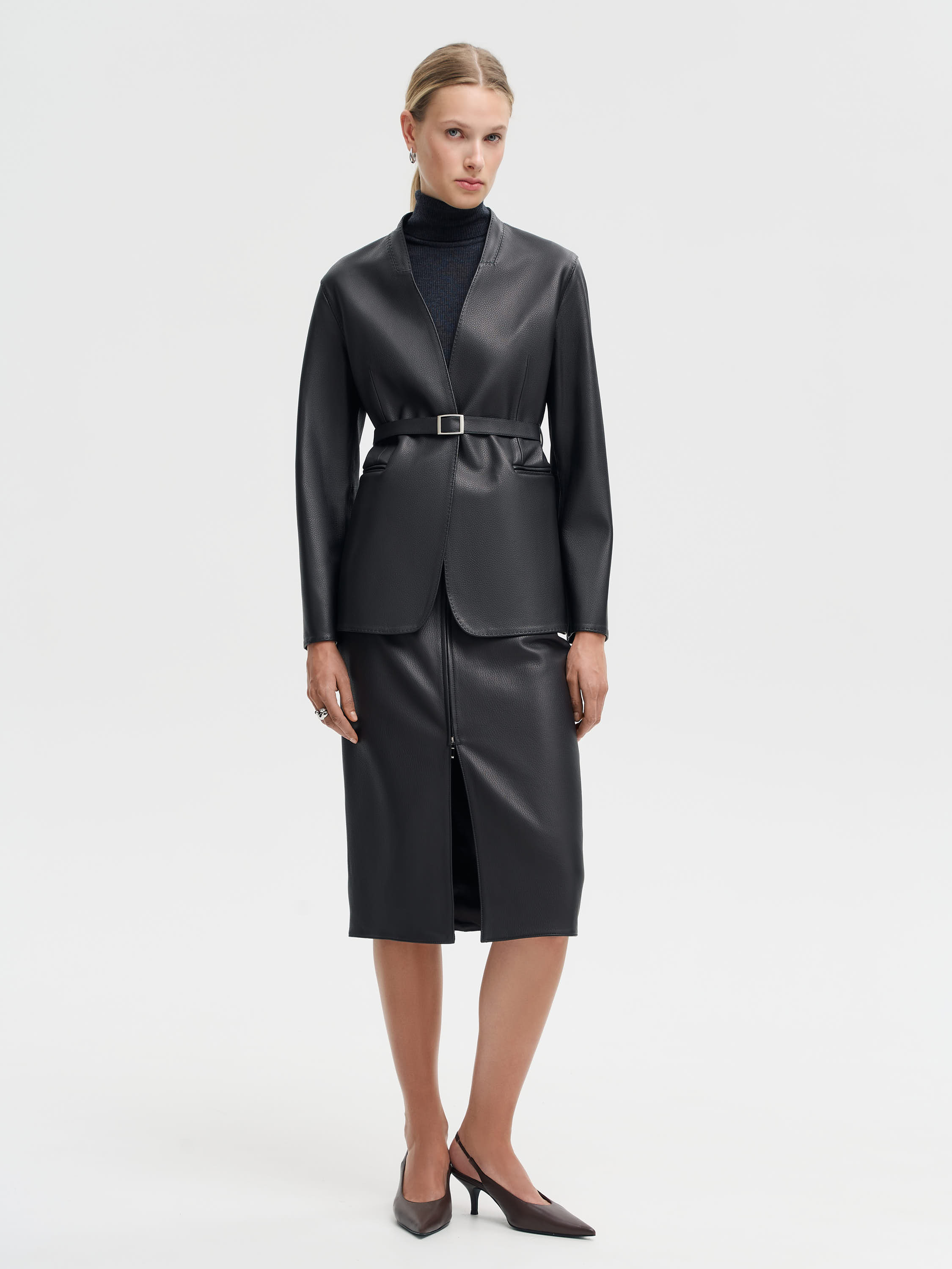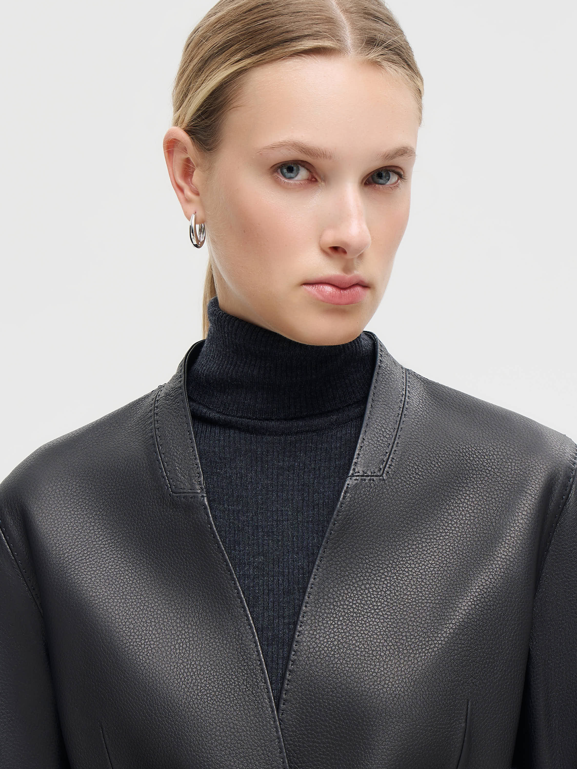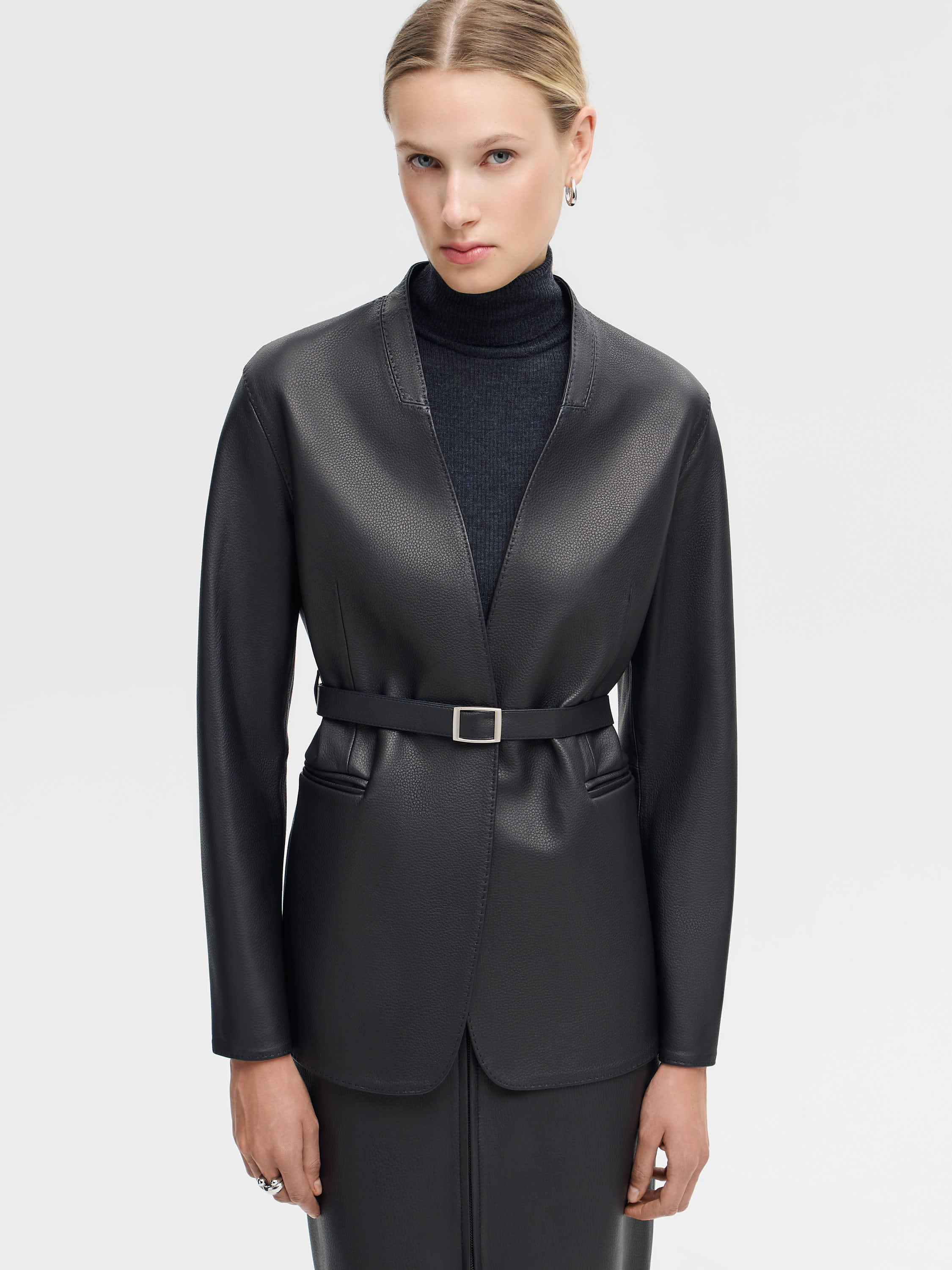 Жакет из зернистой натуральной кожи "Jumbo" в глубоком черном оттенке. Плотное полотно с матовой фактурой держит форму и придает силуэту четкость. Крой прямой, без лацканов, с мягко закругленной линией борта. Лаконичный пояс с металлической пряжкой акцентирует талию и позволяет варьировать посадку — от более приталенной до свободной. Длина до бедра делает жакет универсальным для сочетаний с юбками, платьями и брюками. Модель можно носить как самостоятельный верх или в многослойности с водолазками, рубашками и тонким трикотажем, создавая сдержанные, графичные образы для офиса и городских выходов.