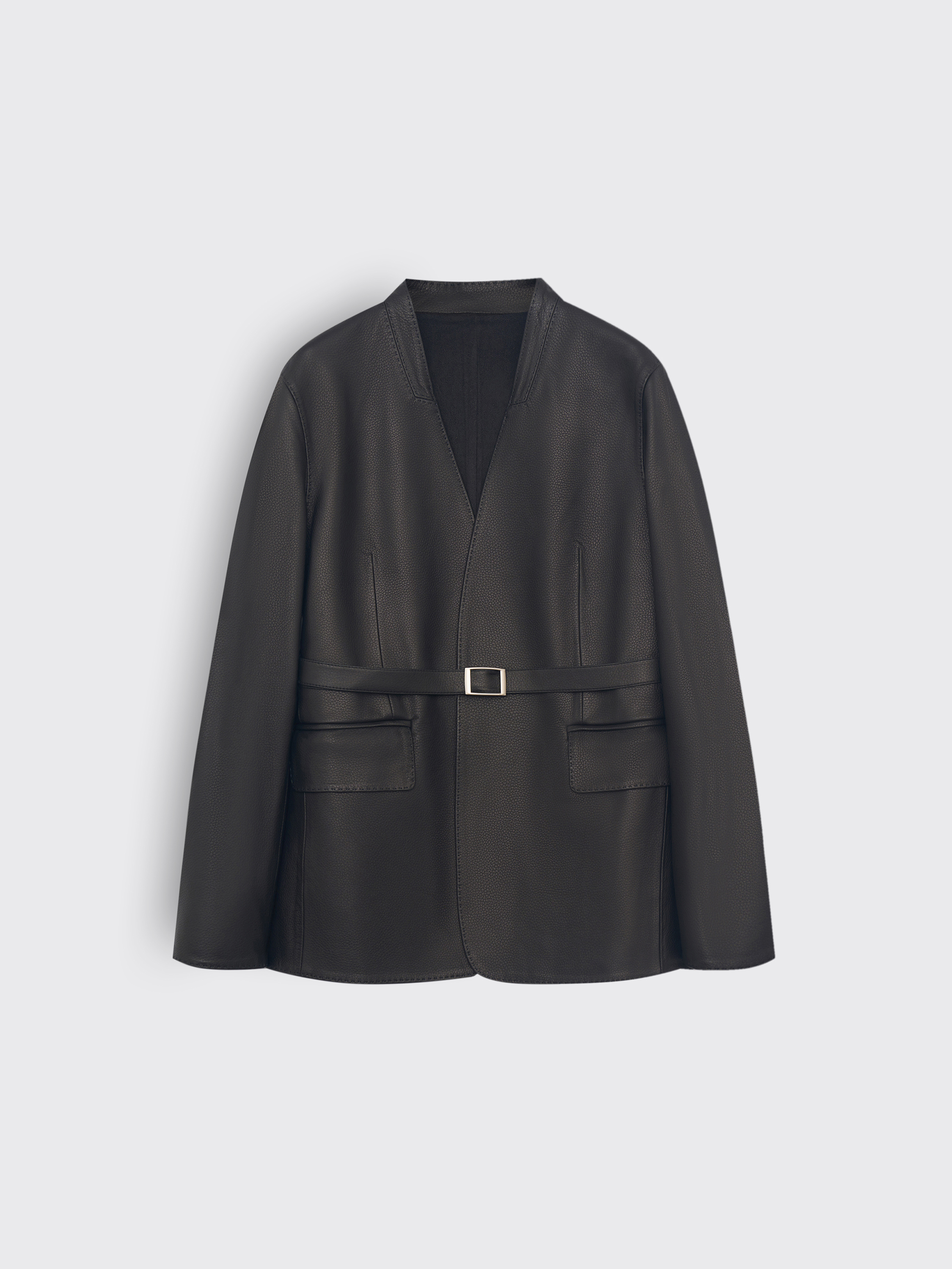 Жакет из зернистой натуральной кожи "Jumbo" в глубоком черном оттенке. Плотное полотно с матовой фактурой держит форму и придает силуэту четкость. Крой прямой, без лацканов, с мягко закругленной линией борта. Лаконичный пояс с металлической пряжкой акцентирует талию и позволяет варьировать посадку — от более приталенной до свободной. Длина до бедра делает жакет универсальным для сочетаний с юбками, платьями и брюками. Модель можно носить как самостоятельный верх или в многослойности с водолазками, рубашками и тонким трикотажем, создавая сдержанные, графичные образы для офиса и городских выходов.