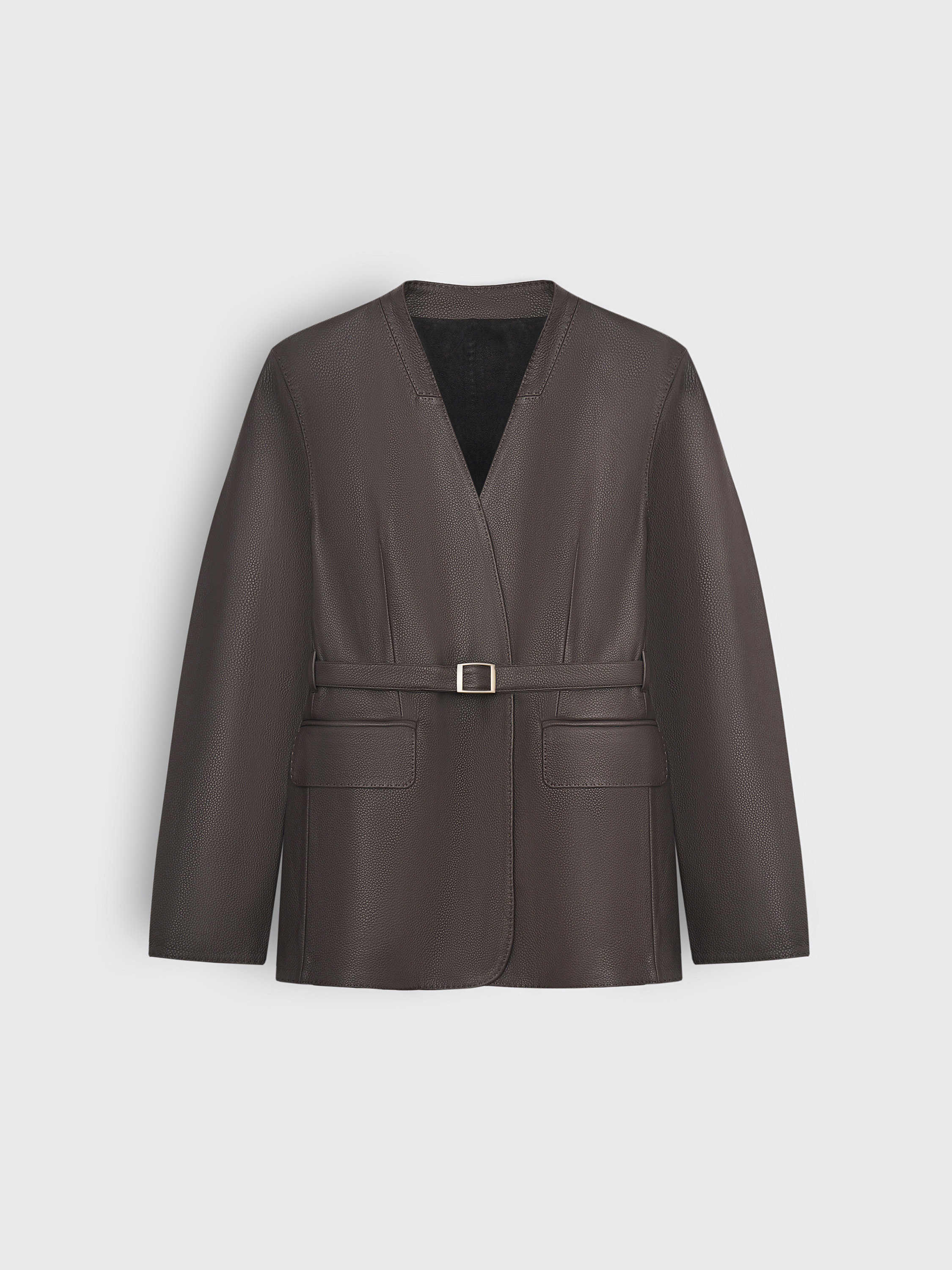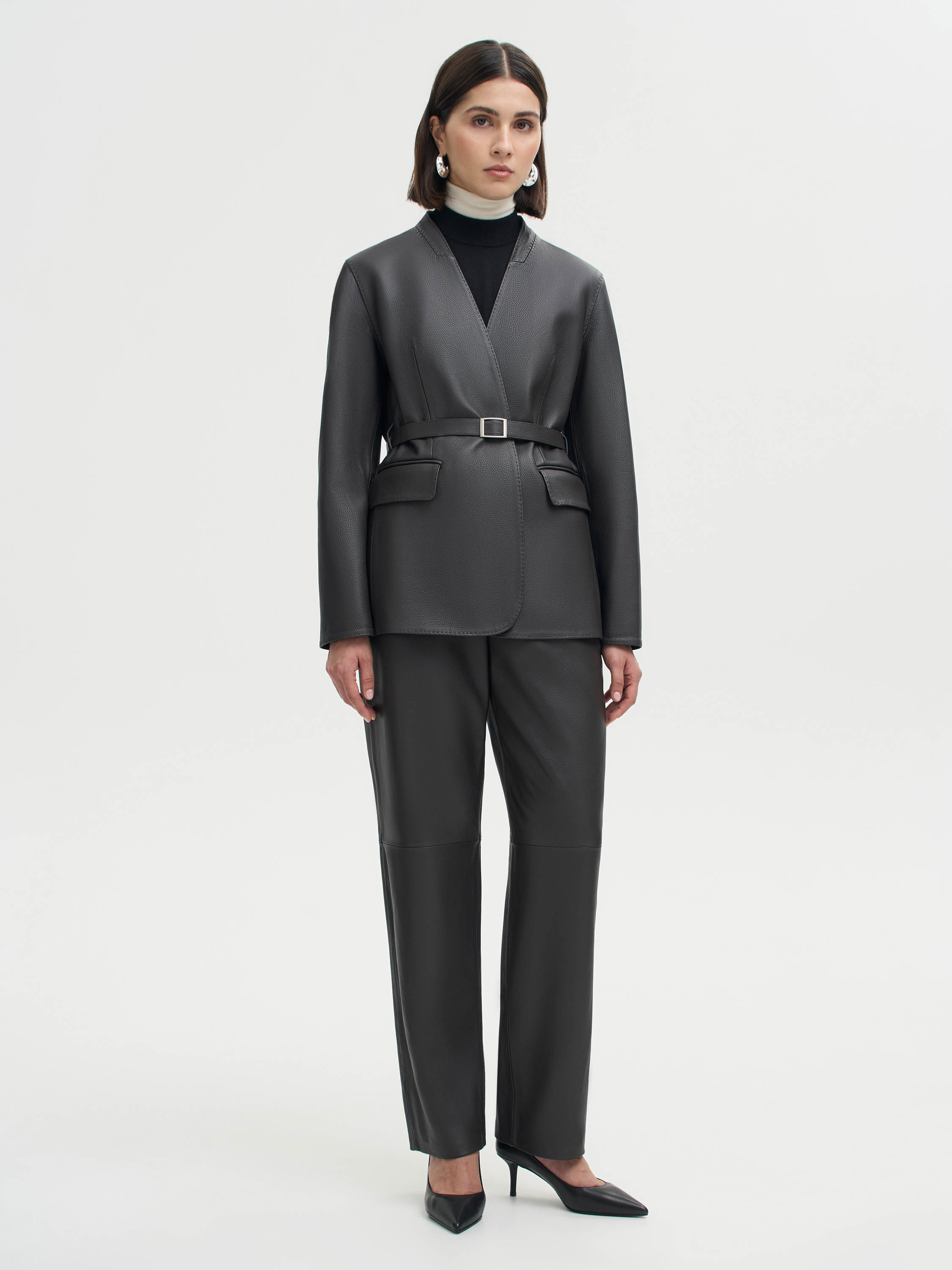 Жакет из зернистой натуральной кожи "Jumbo" в глубоком черном оттенке. Плотное полотно с матовой фактурой держит форму и придает силуэту четкость. Крой прямой, без лацканов, с мягко закругленной линией борта. Лаконичный пояс с металлической пряжкой акцентирует талию и позволяет варьировать посадку — от более приталенной до свободной. Длина до бедра делает жакет универсальным для сочетаний с юбками, платьями и брюками. Модель можно носить как самостоятельный верх или в многослойности с водолазками, рубашками и тонким трикотажем, создавая сдержанные, графичные образы для офиса и городских выходов.