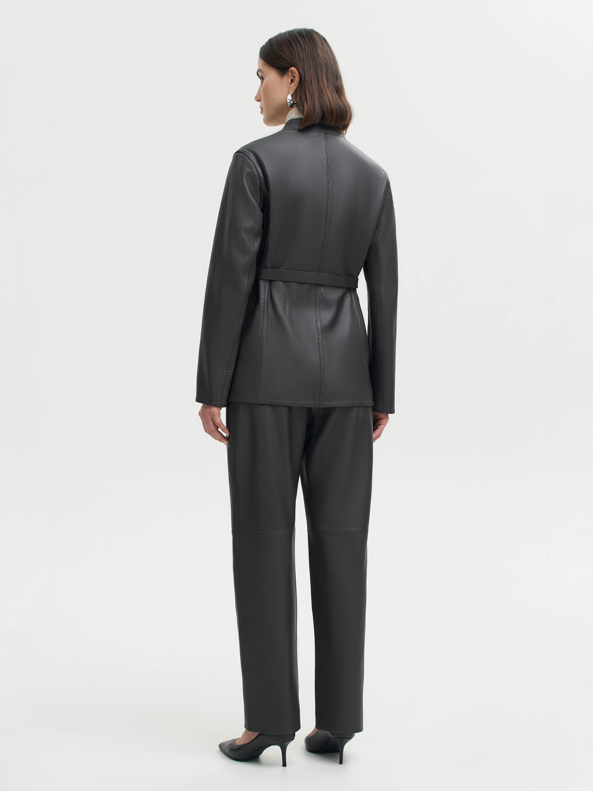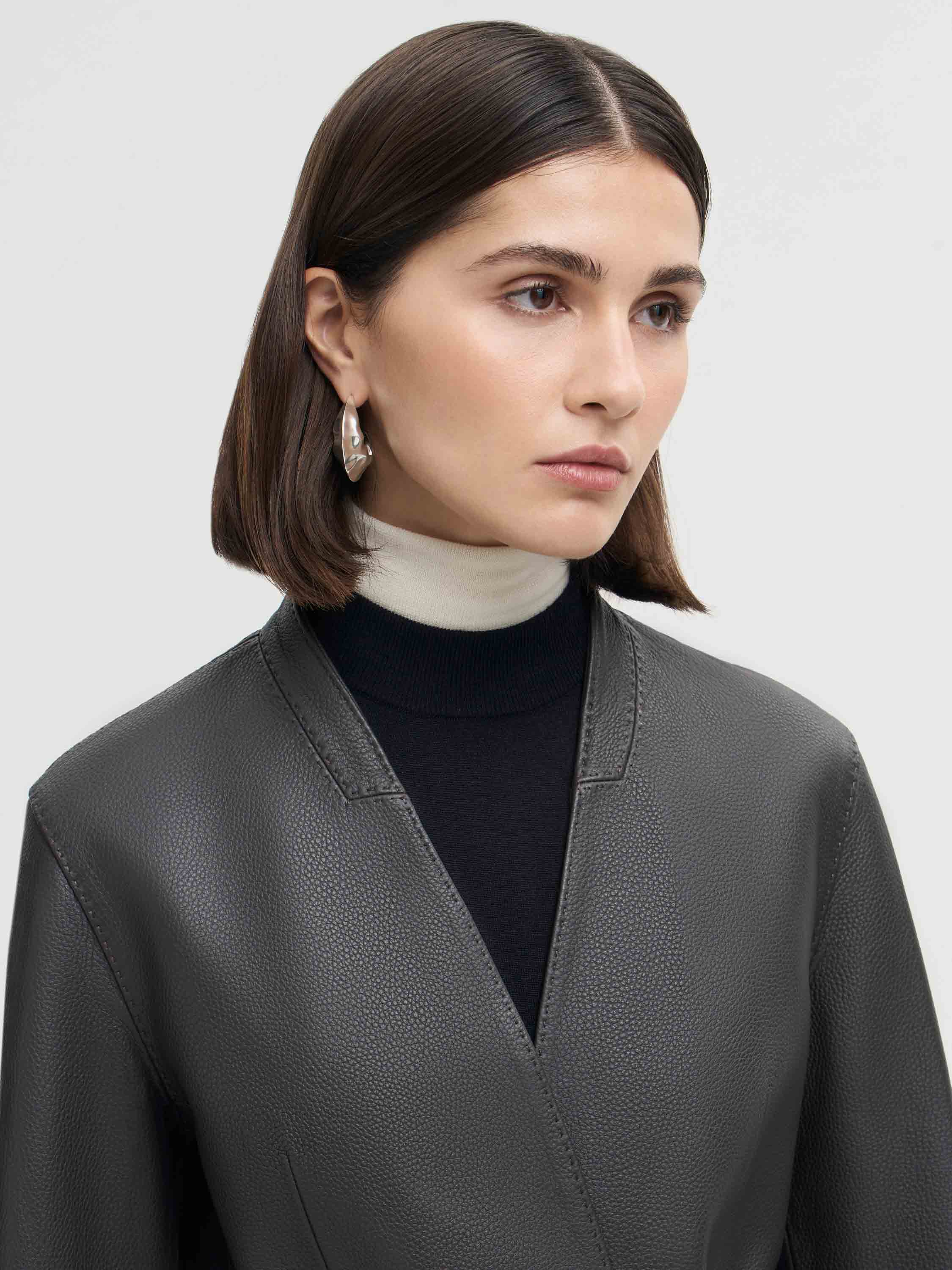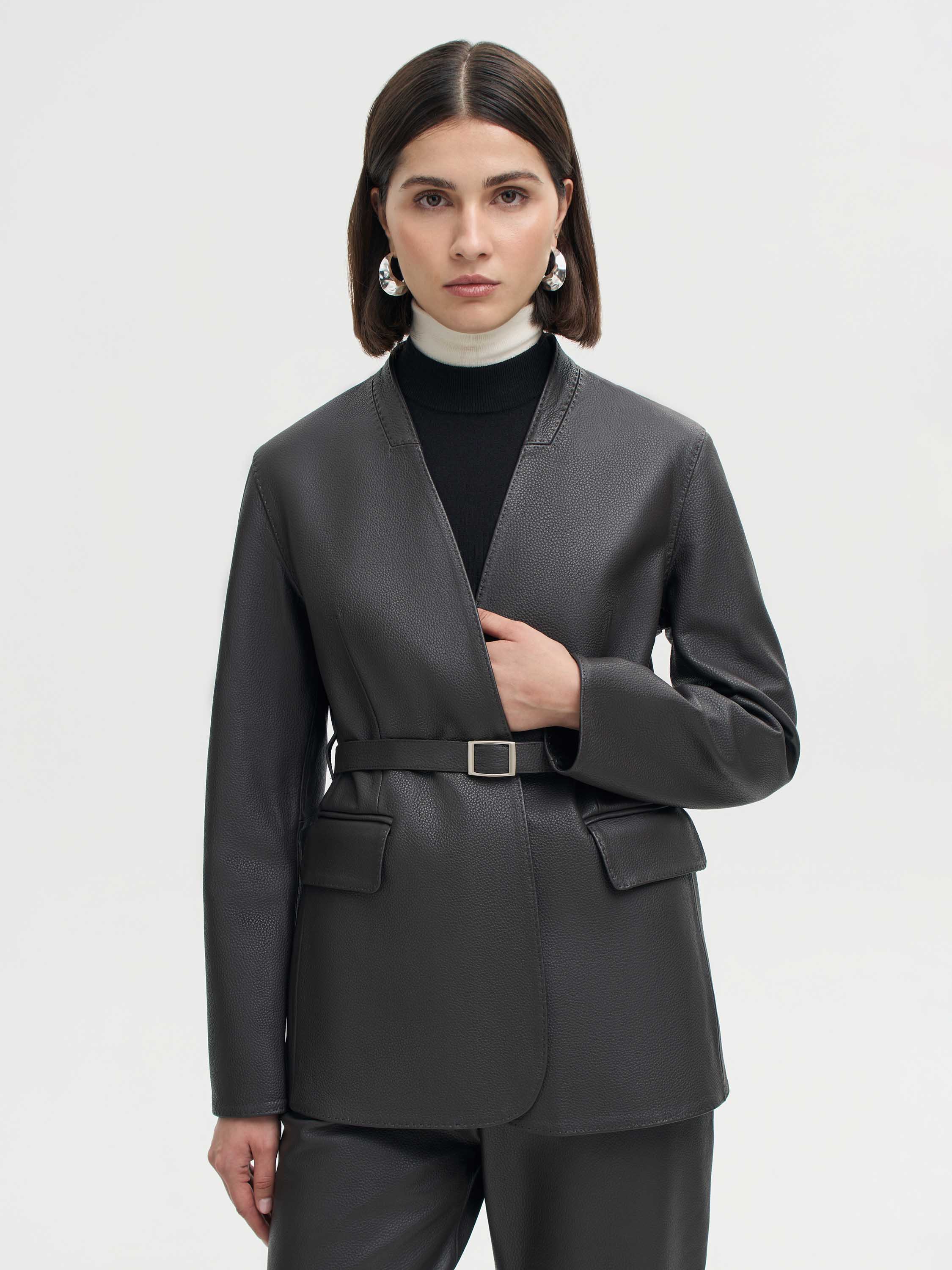 Жакет из зернистой натуральной кожи "Jumbo" в глубоком черном оттенке. Плотное полотно с матовой фактурой держит форму и придает силуэту четкость. Крой прямой, без лацканов, с мягко закругленной линией борта. Лаконичный пояс с металлической пряжкой акцентирует талию и позволяет варьировать посадку — от более приталенной до свободной. Длина до бедра делает жакет универсальным для сочетаний с юбками, платьями и брюками. Модель можно носить как самостоятельный верх или в многослойности с водолазками, рубашками и тонким трикотажем, создавая сдержанные, графичные образы для офиса и городских выходов.