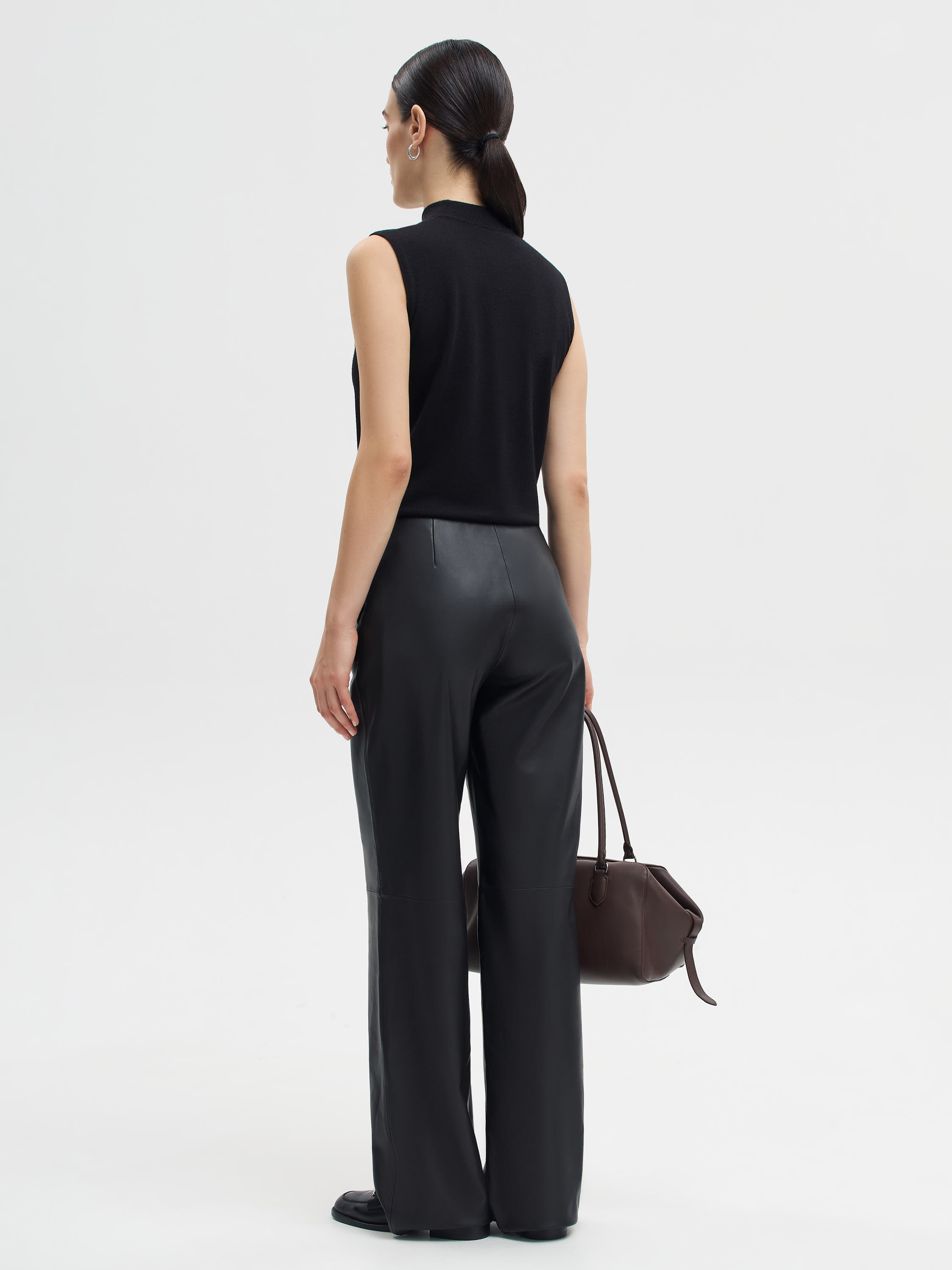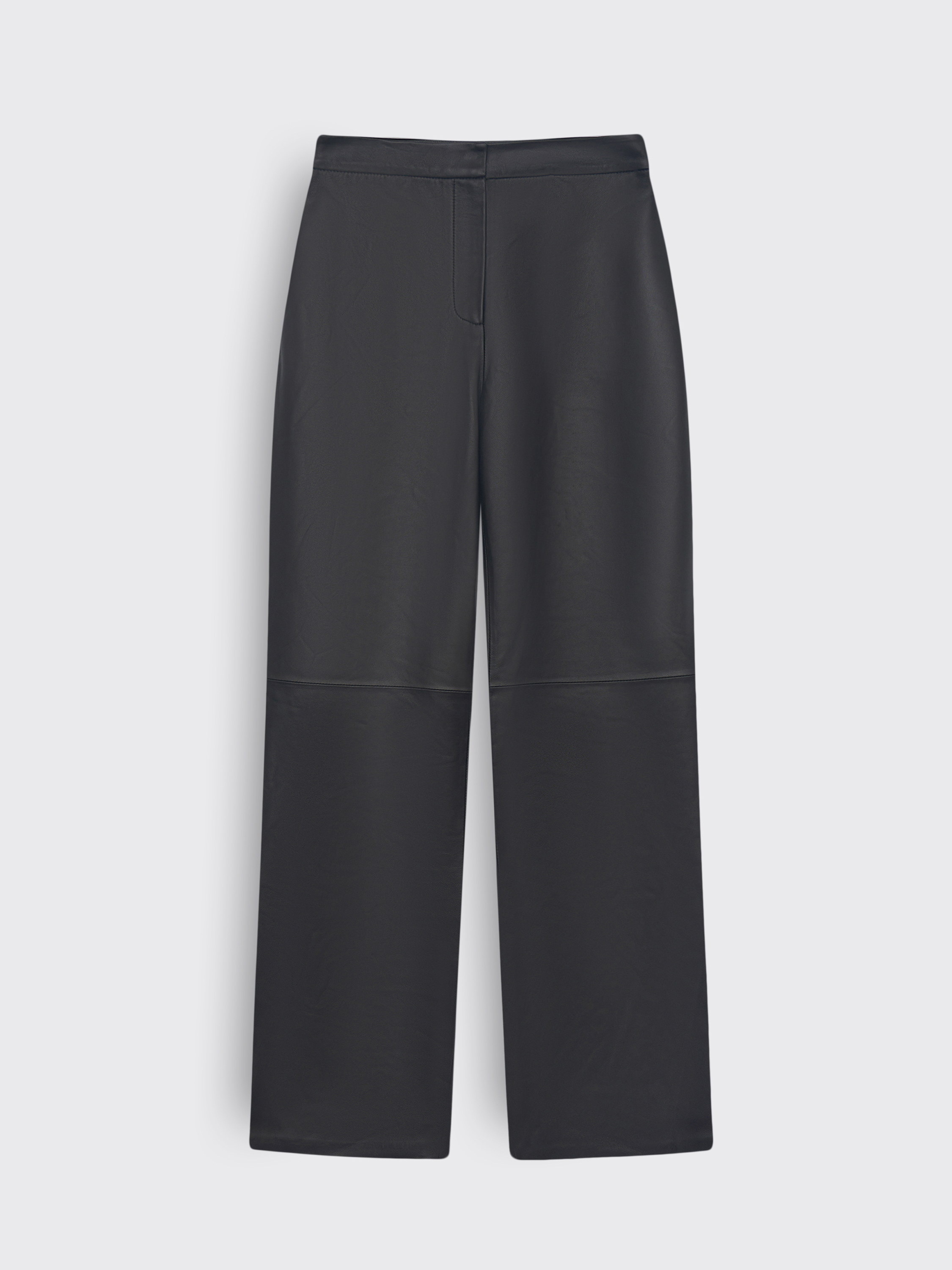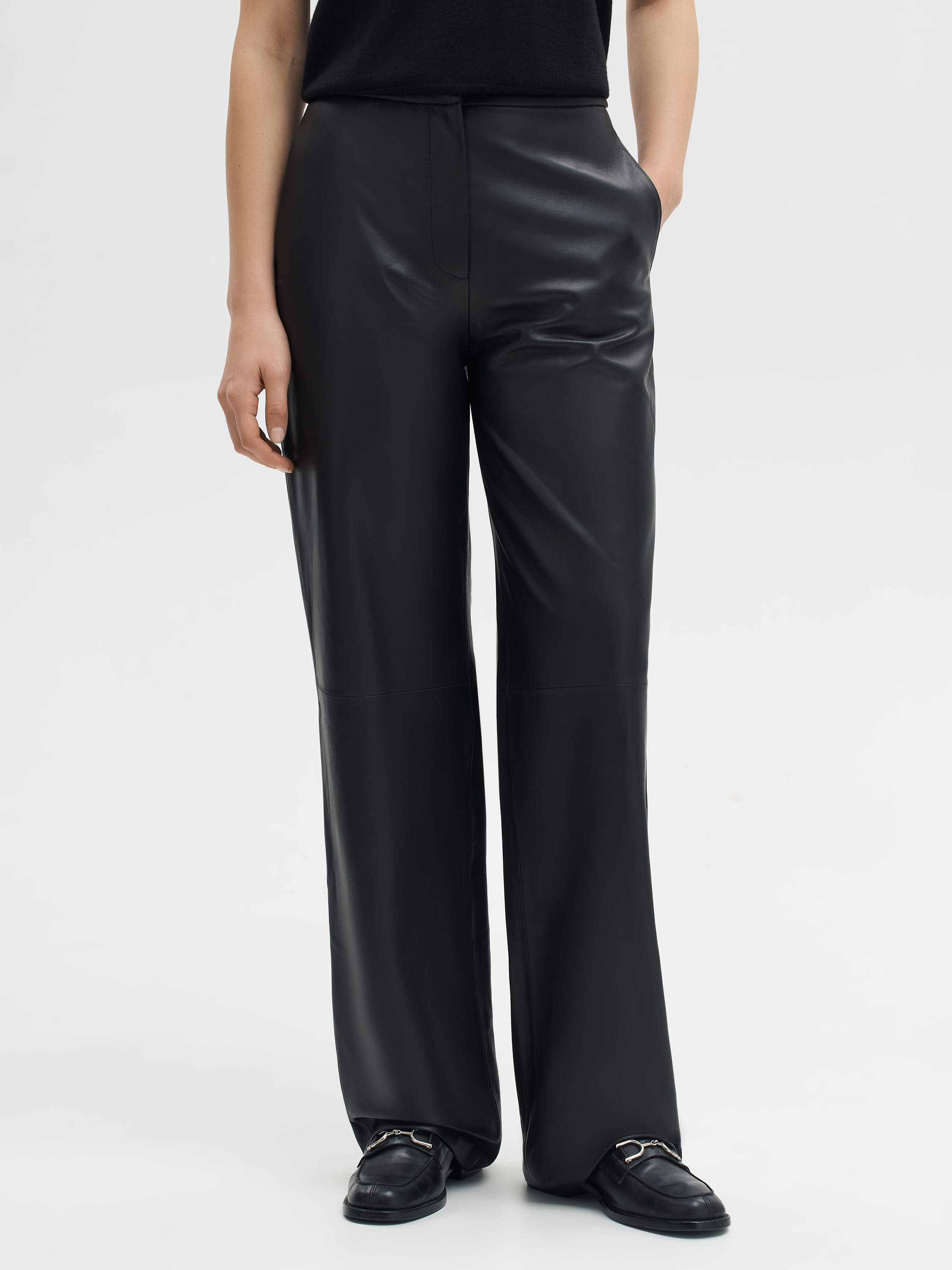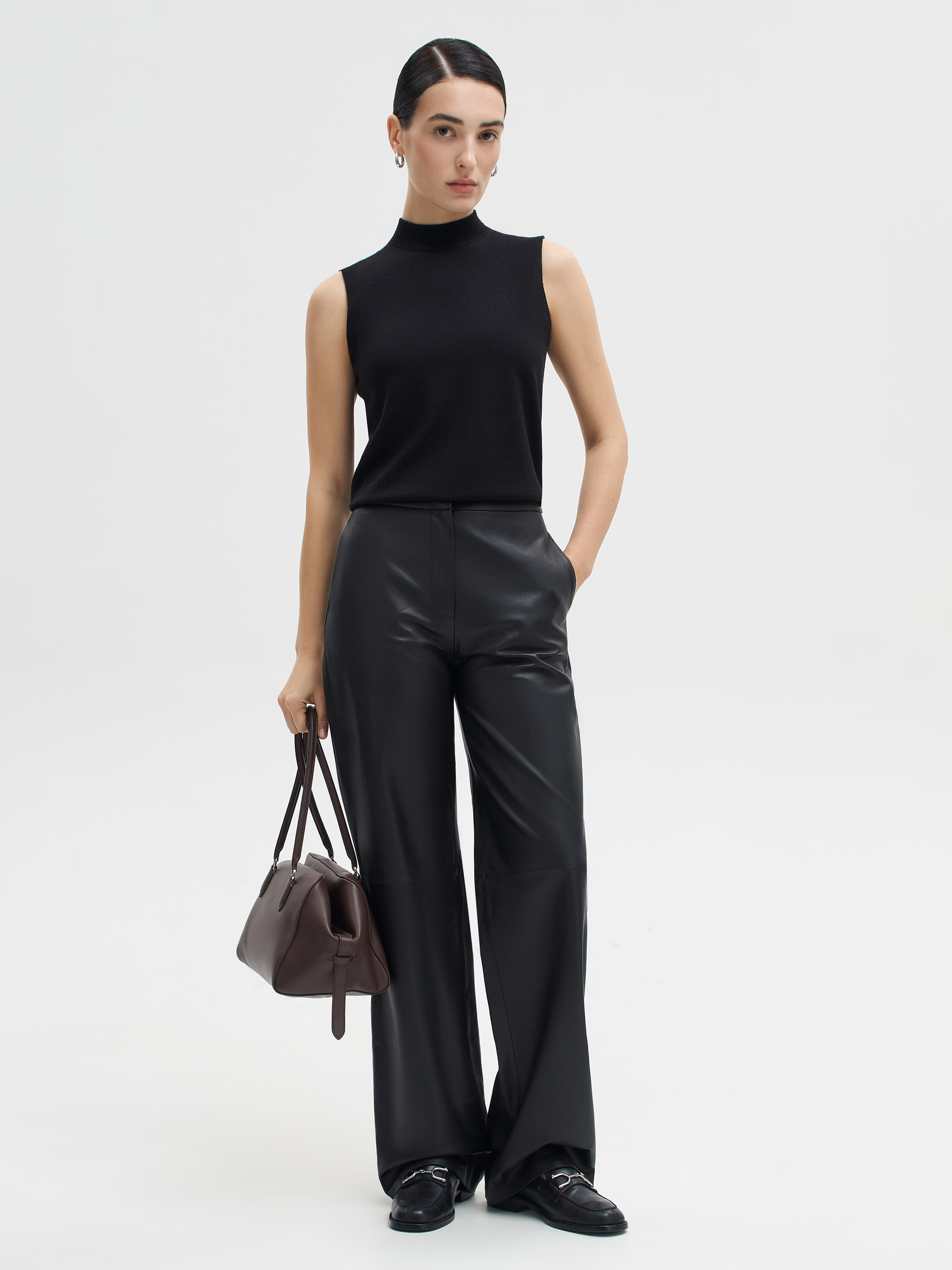 Брюки, которые не перегружают, но собирают образ: гладкая натуральная кожа и прямой силуэт создают сдержанный акцент. Черный оттенок подчеркивает чистоту линии, а фактура кожи придает вещи характер. Посадка со средней талией делает модель практичной и удобной, а сдержанный дизайн открывает простор для экспериментов. Брюки одинаково органично смотрятся с шелковой блузкой и лодочками для выхода или с кашемировым джемпером в повседневных сочетаниях, оставаясь универсальной основой гардероба.