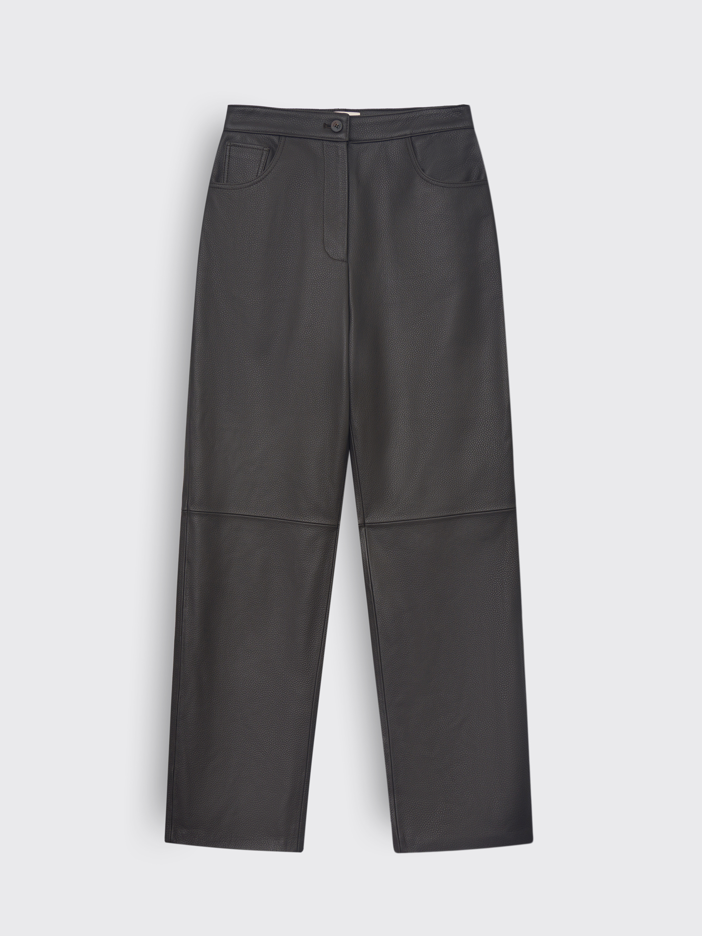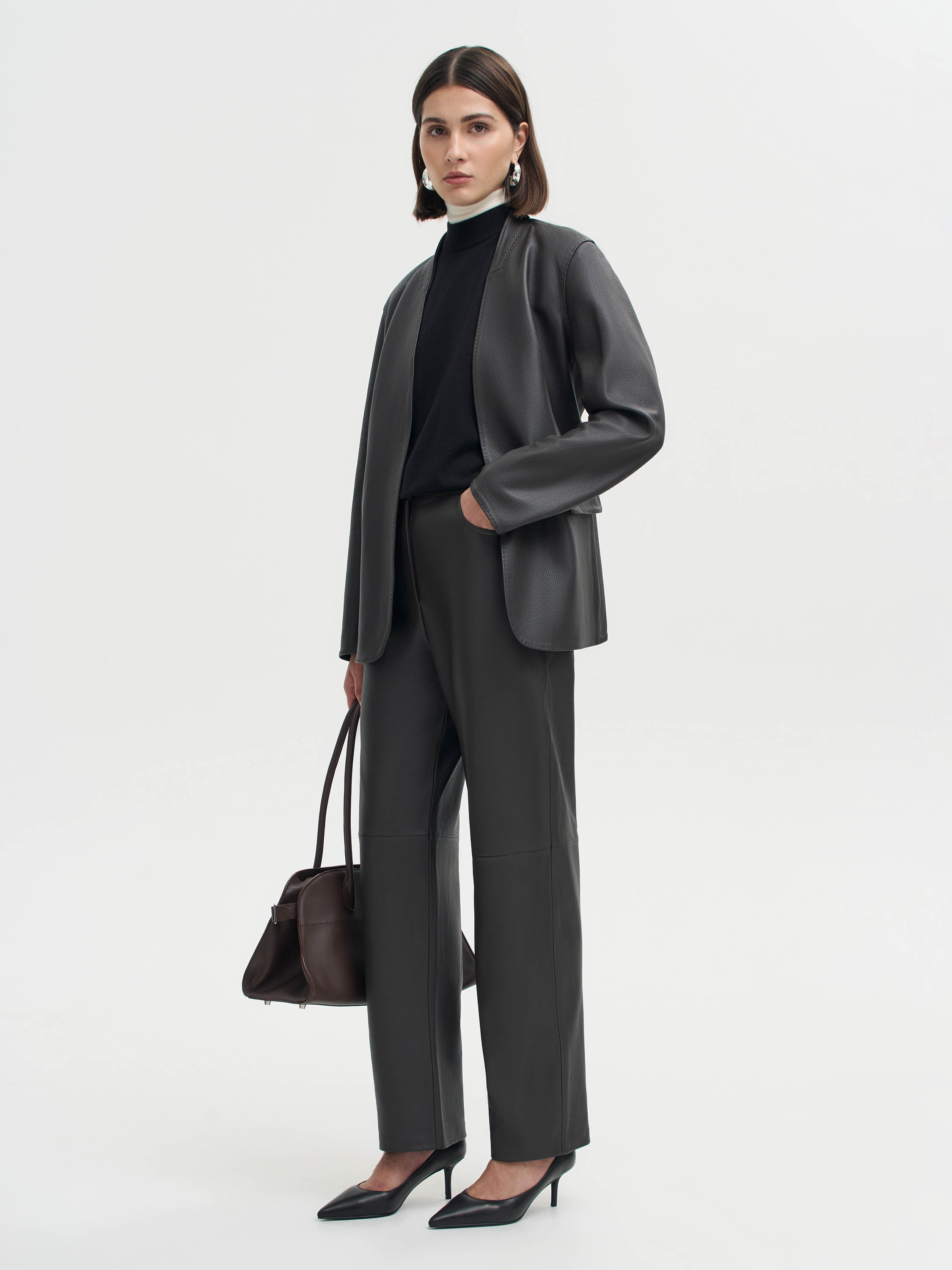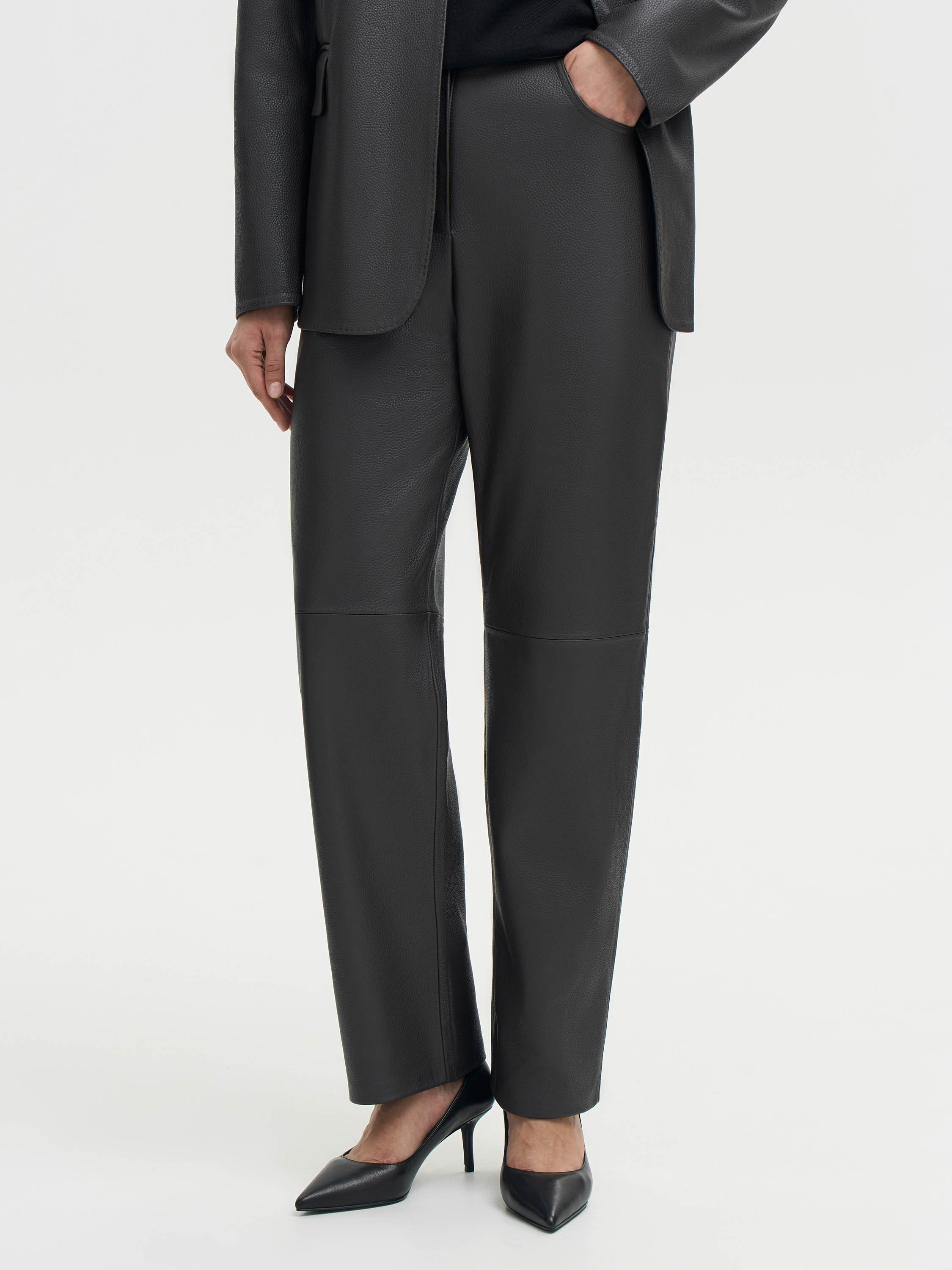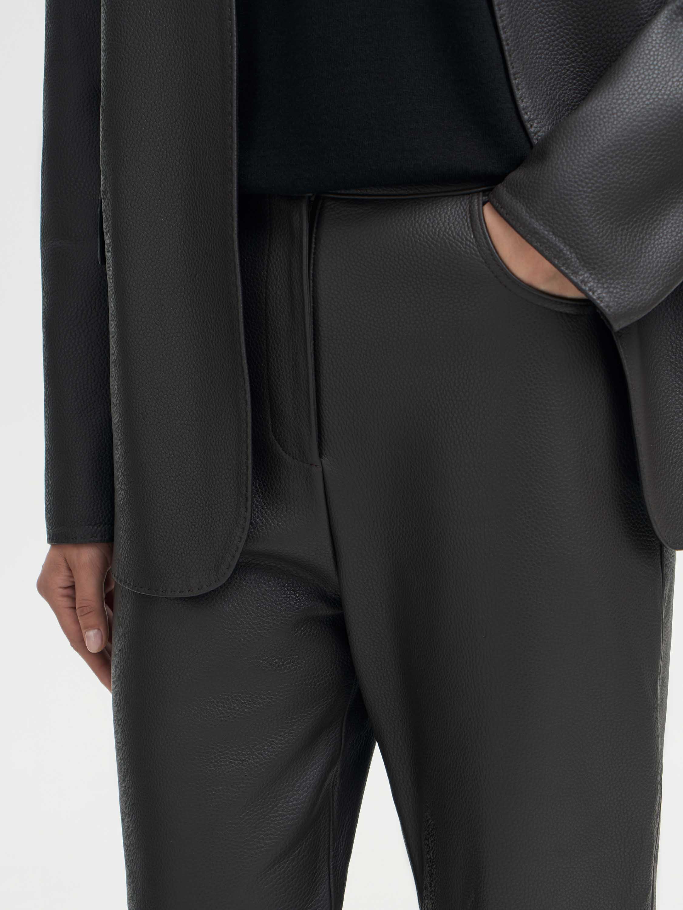 Брюки прямого кроя выполнены из гладкой кожи с естественной матовой фактурой. Плотный материал держит форму, подчеркивая линии силуэта, но при этом остается пластичным и удобным в движении. Посадка средняя, пояс со шлевками, сзади — аккуратные накладные карманы. Чистый крой и минимализм деталей делают модель универсальной: брюки легко вписываются в повседневные и собранные образы, создавая современное звучание классики.