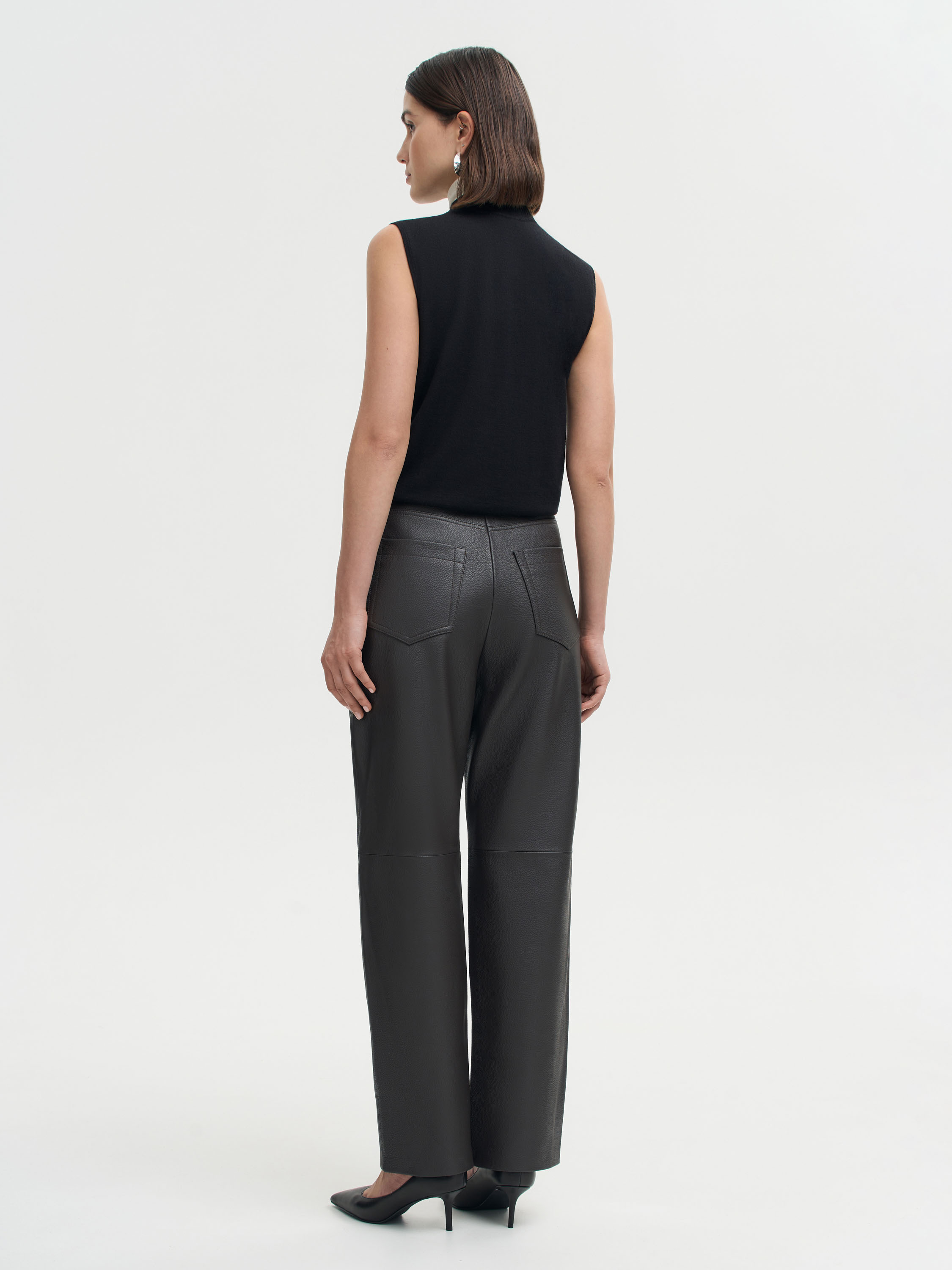 Брюки прямого кроя выполнены из гладкой кожи с естественной матовой фактурой. Плотный материал держит форму, подчеркивая линии силуэта, но при этом остается пластичным и удобным в движении. Посадка средняя, пояс со шлевками, сзади — аккуратные накладные карманы. Чистый крой и минимализм деталей делают модель универсальной: брюки легко вписываются в повседневные и собранные образы, создавая современное звучание классики.
