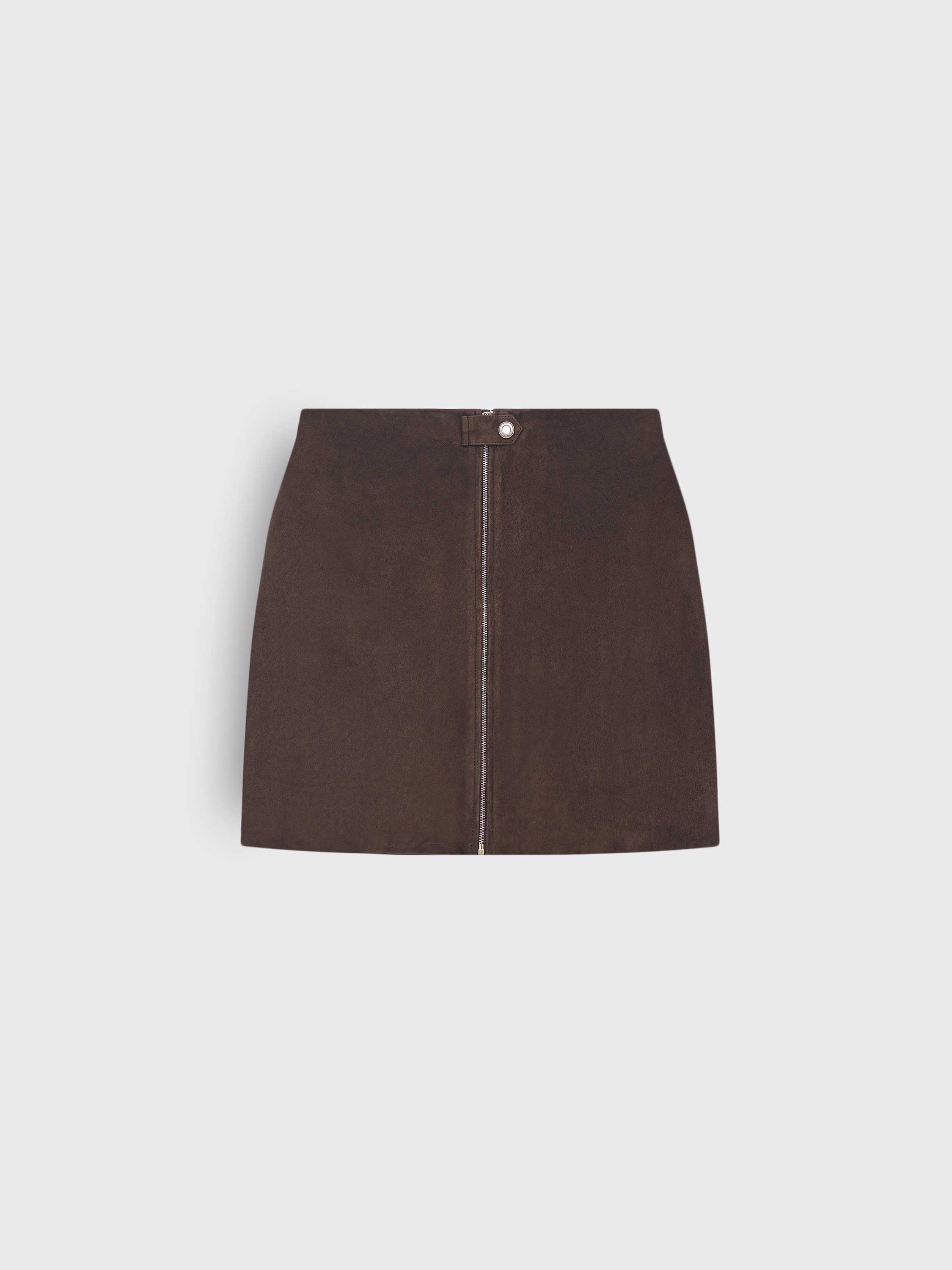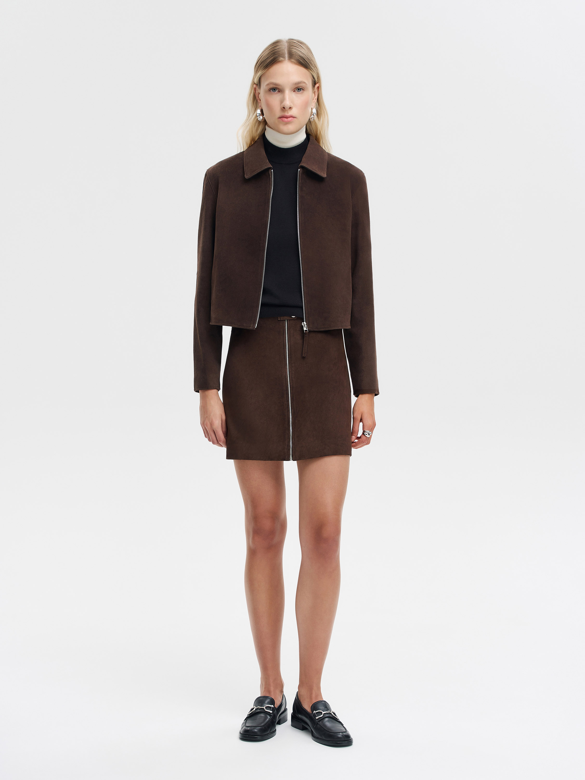 Юбка мини из натуральной замши с мягкой бархатистой фактурой. Материал отличается пластичностью и приятной тактильностью, подчеркивает благородный характер изделия. Крой прямой, с застежкой-молнией по центру и аккуратным поясом на пуговице. Минималистичный дизайн делает модель универсальной: юбка гармонично сочетается с базовыми топами и свитерами, а в комплекте с замшевой курткой формирует цельный современный образ.