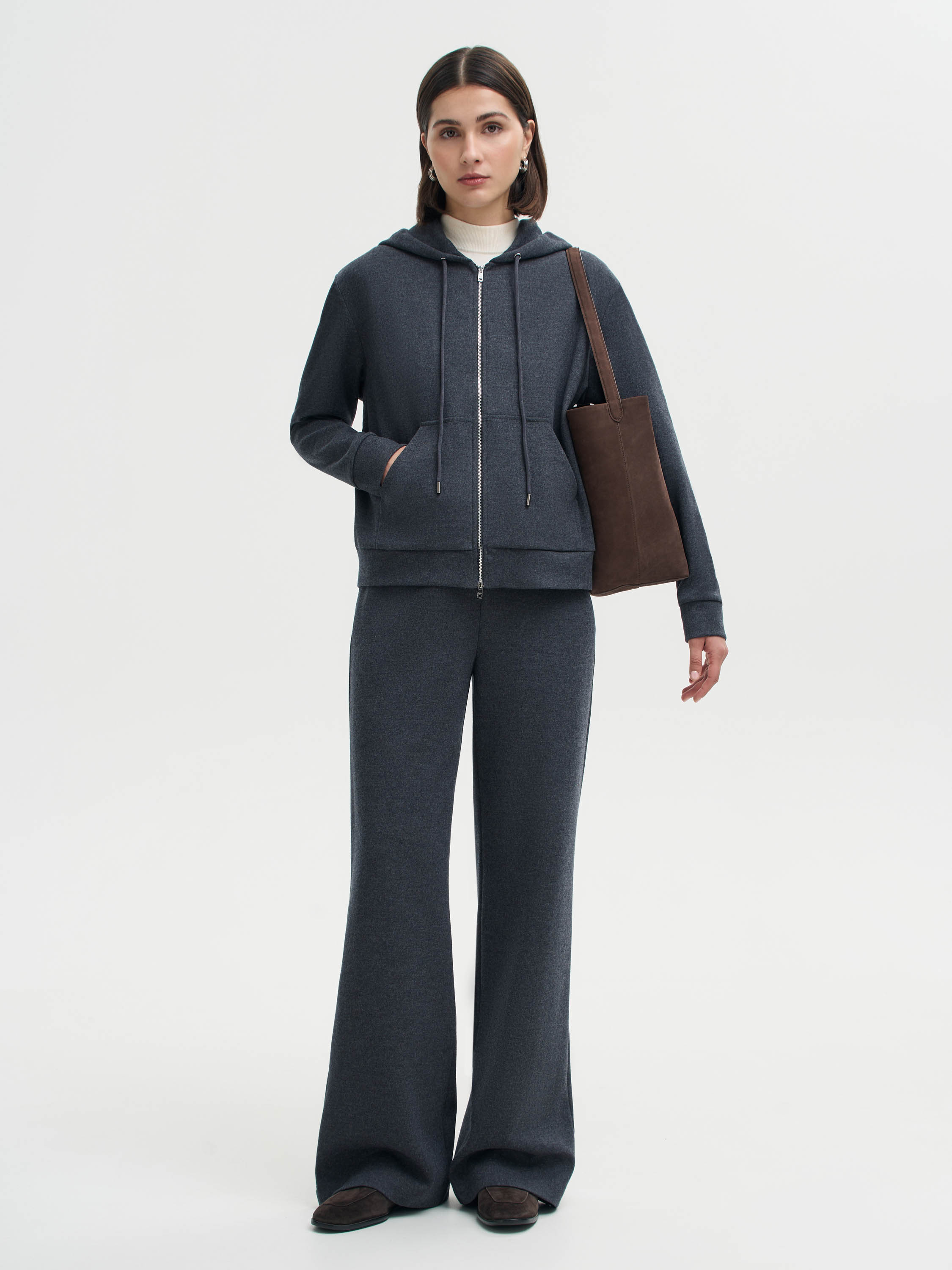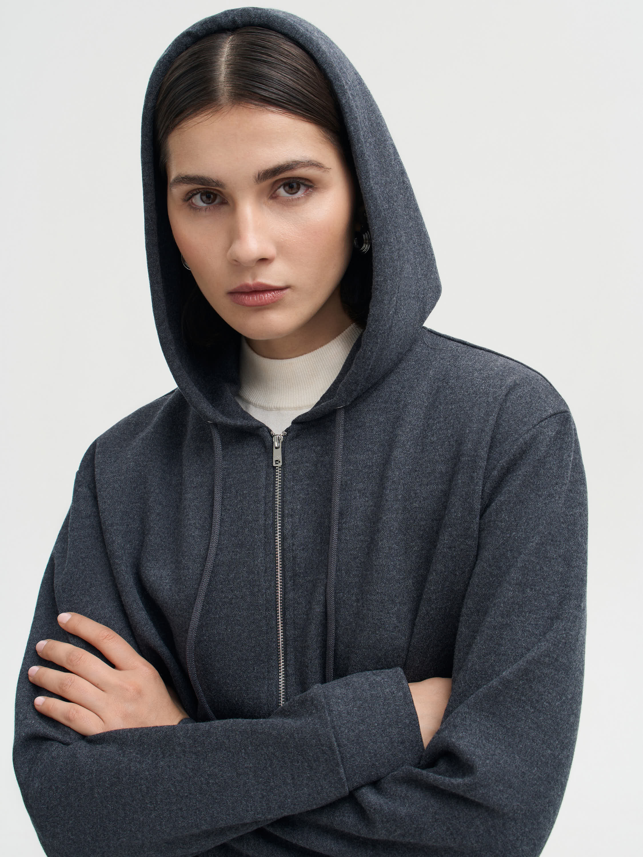 Худи из смесового полотна на основе шерсти и хлопке. Ткань мягкая, дышащая, с тактильным комфортом и умеренным теплом, дополнена прочными эластичными волокнами для сохранения формы. Крой прямой, с удобным капюшоном на кулиске и застежкой-молнией по всей длине. Карман-кенгуру и широкая резинка по низу подчеркивают спортивный характер модели. Универсальное изделие, которое одинаково хорошо смотрится в повседневных образах и в комплекте с брюками из мягкого трикотажа.
