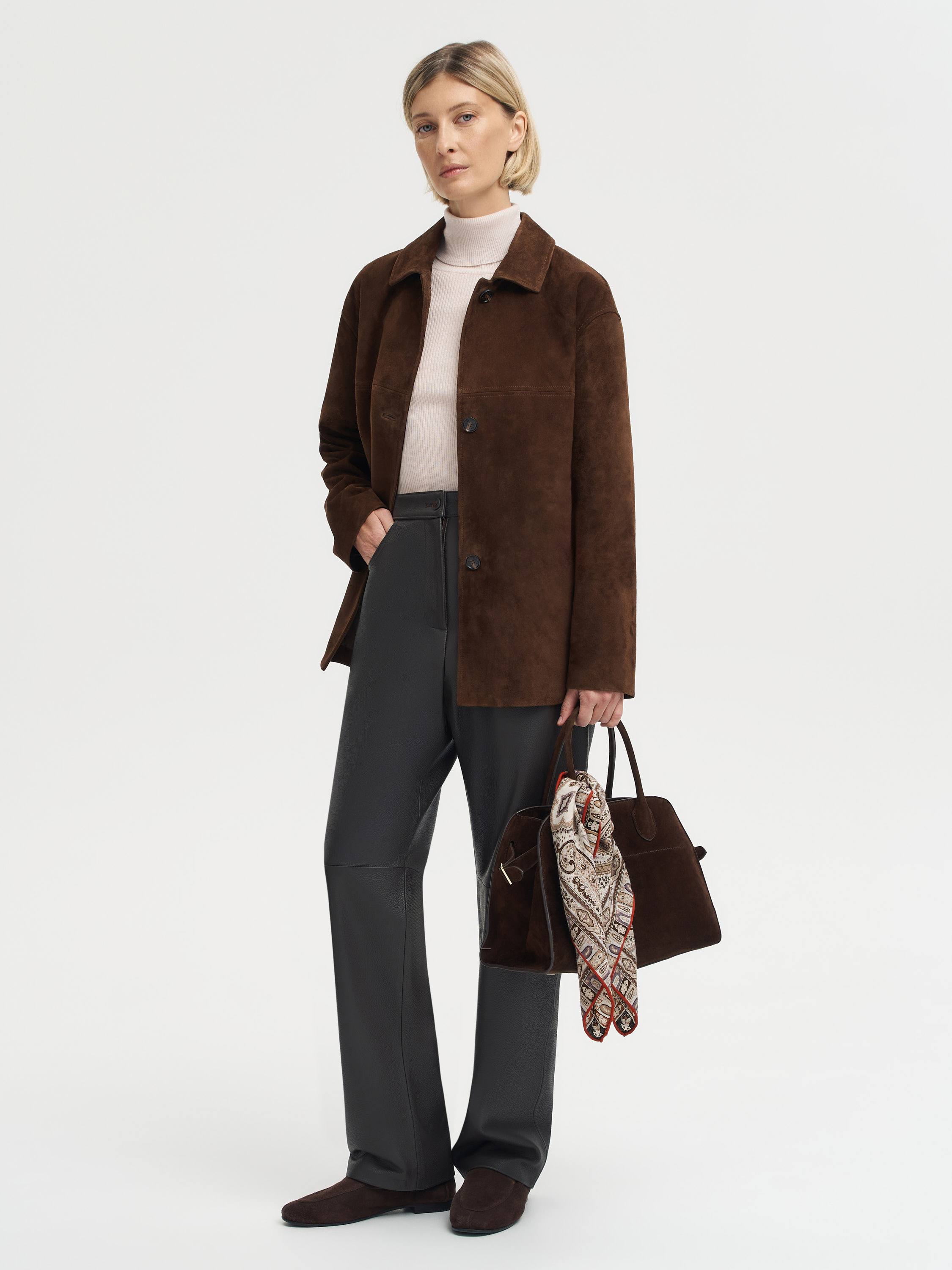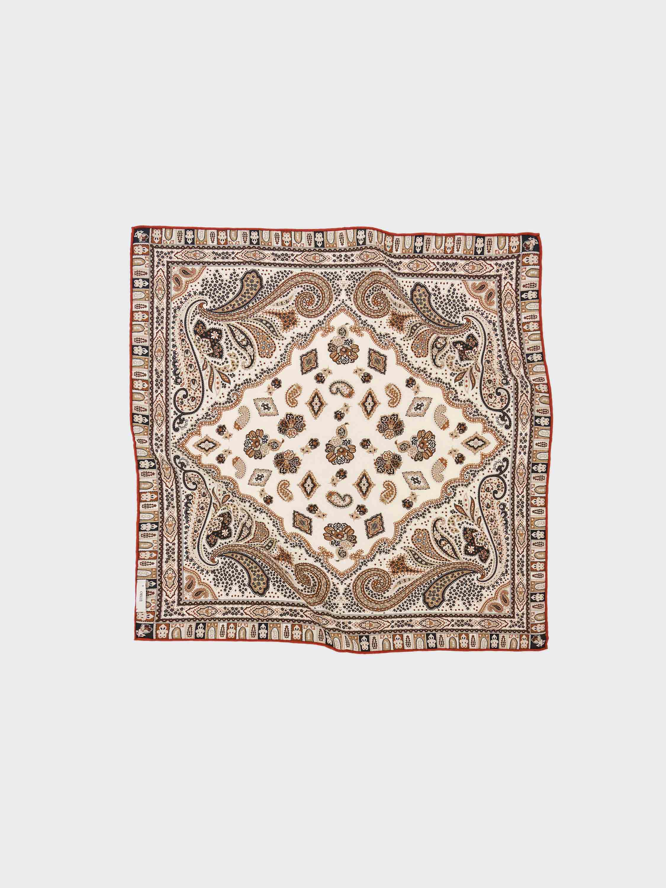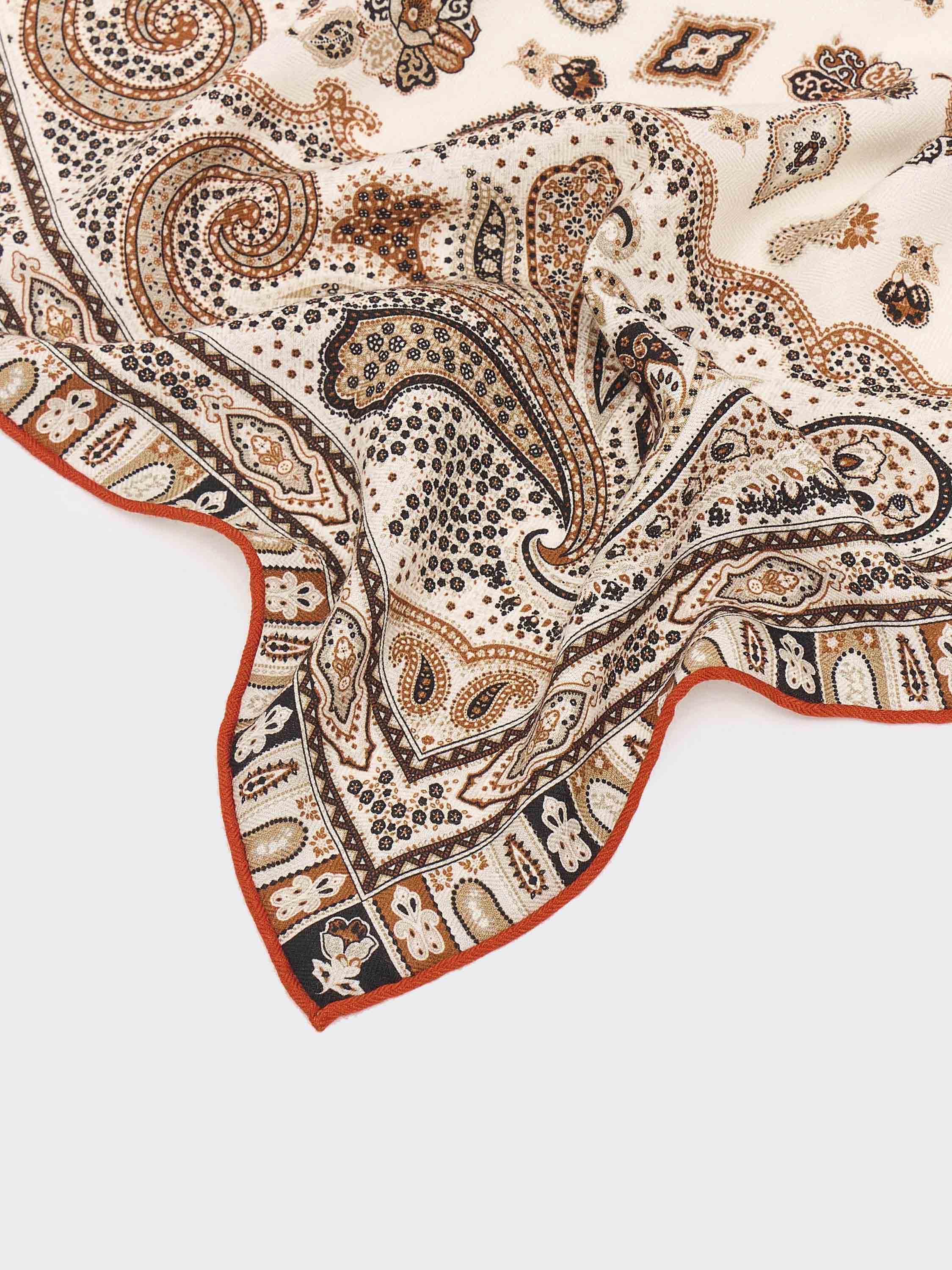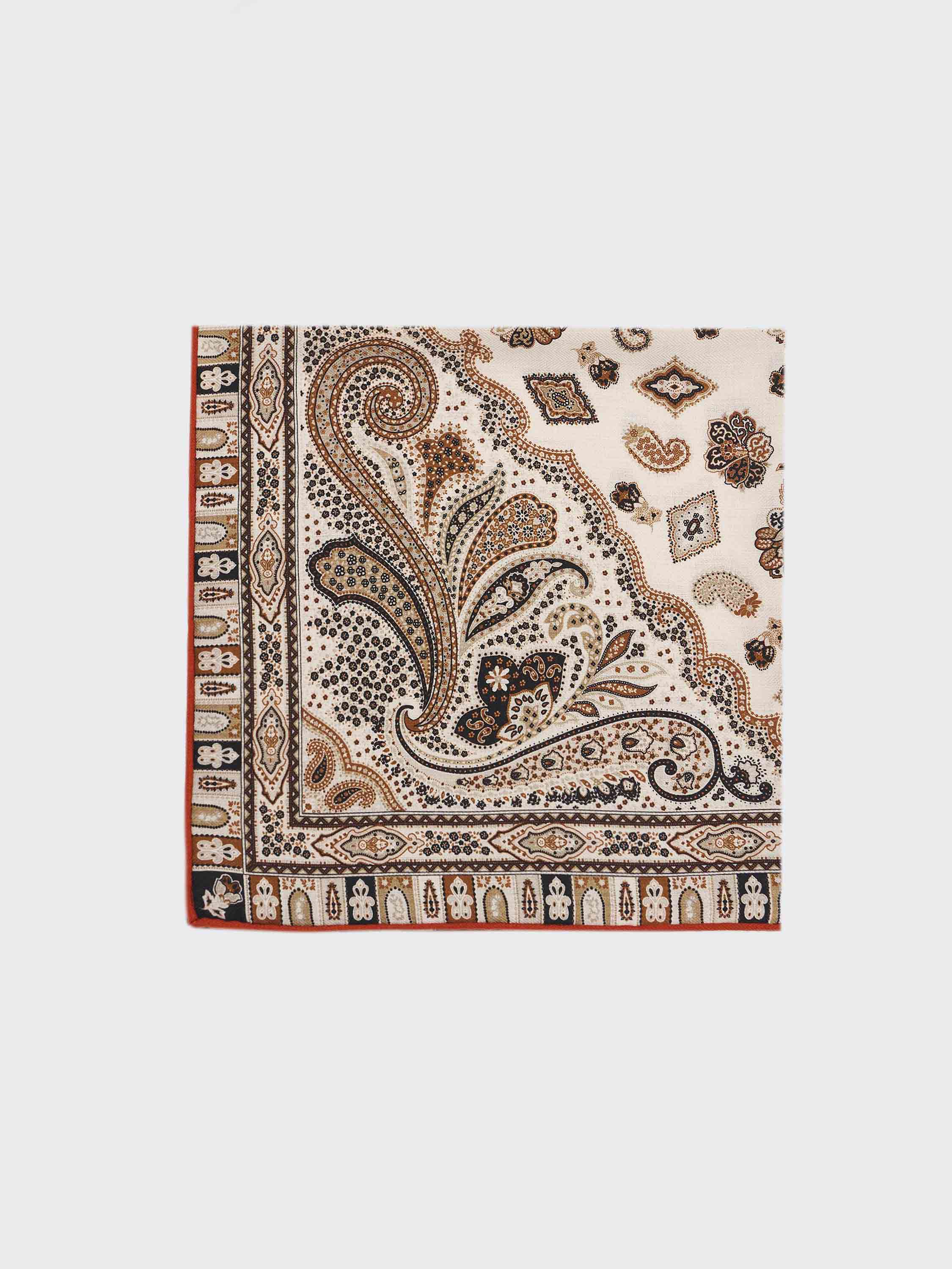 Платок из кашемира и шелка сочетает мягкость и легкость с деликатным блеском ткани. Материал приятно ощущается на коже и хорошо драпируется, сохраняя форму. Глубокий фон подчеркивает сложный орнамент в восточном стиле с плавными растительными узорами, мелкими геометрическими элементами и декоративной рамкой по краю. Контрастная палитра — темные оттенки с золотистыми и светлыми акцентами — придает аксессуару выразительность и делает его универсальным акцентом в повседневных и более торжественных образах.