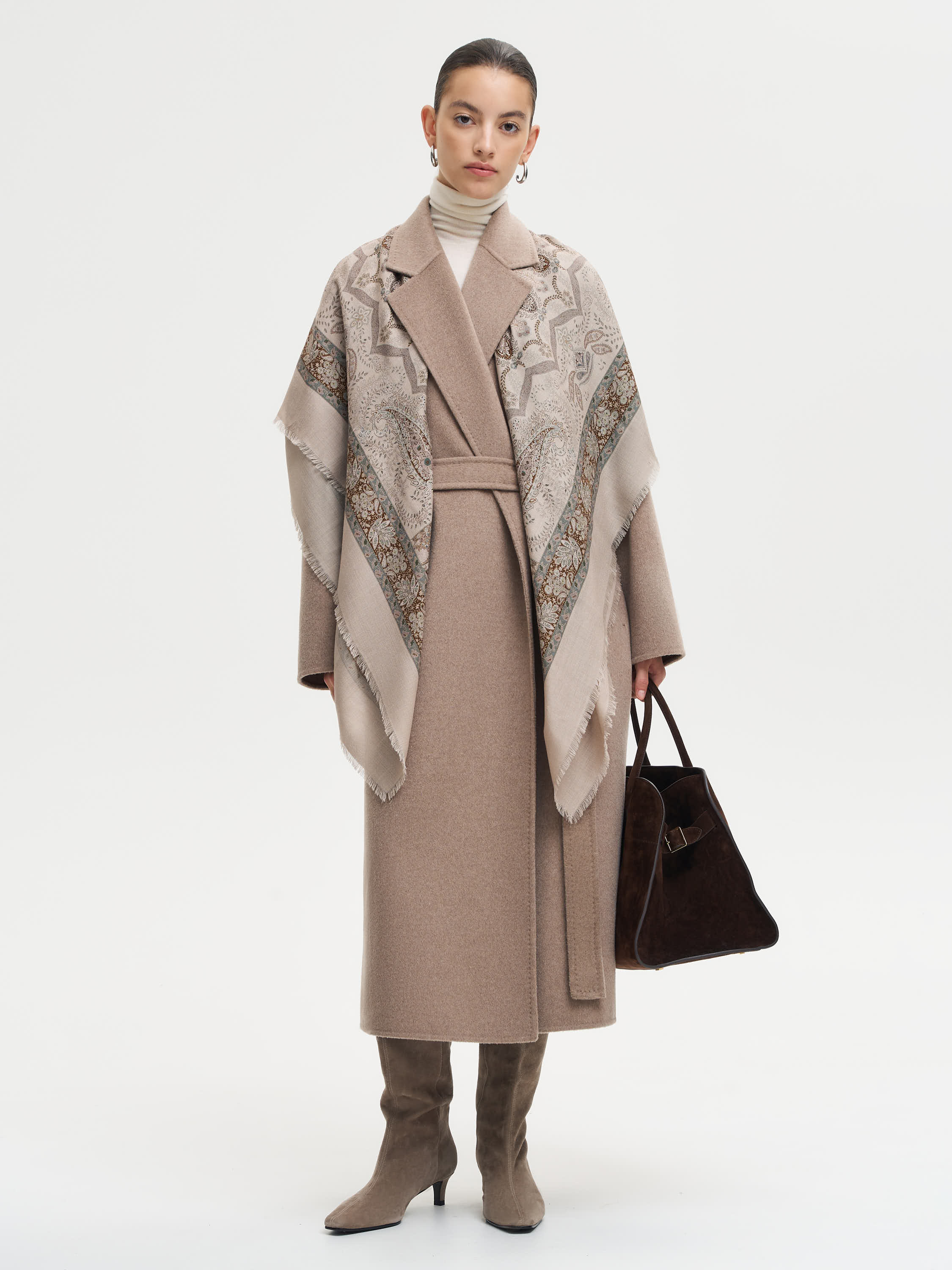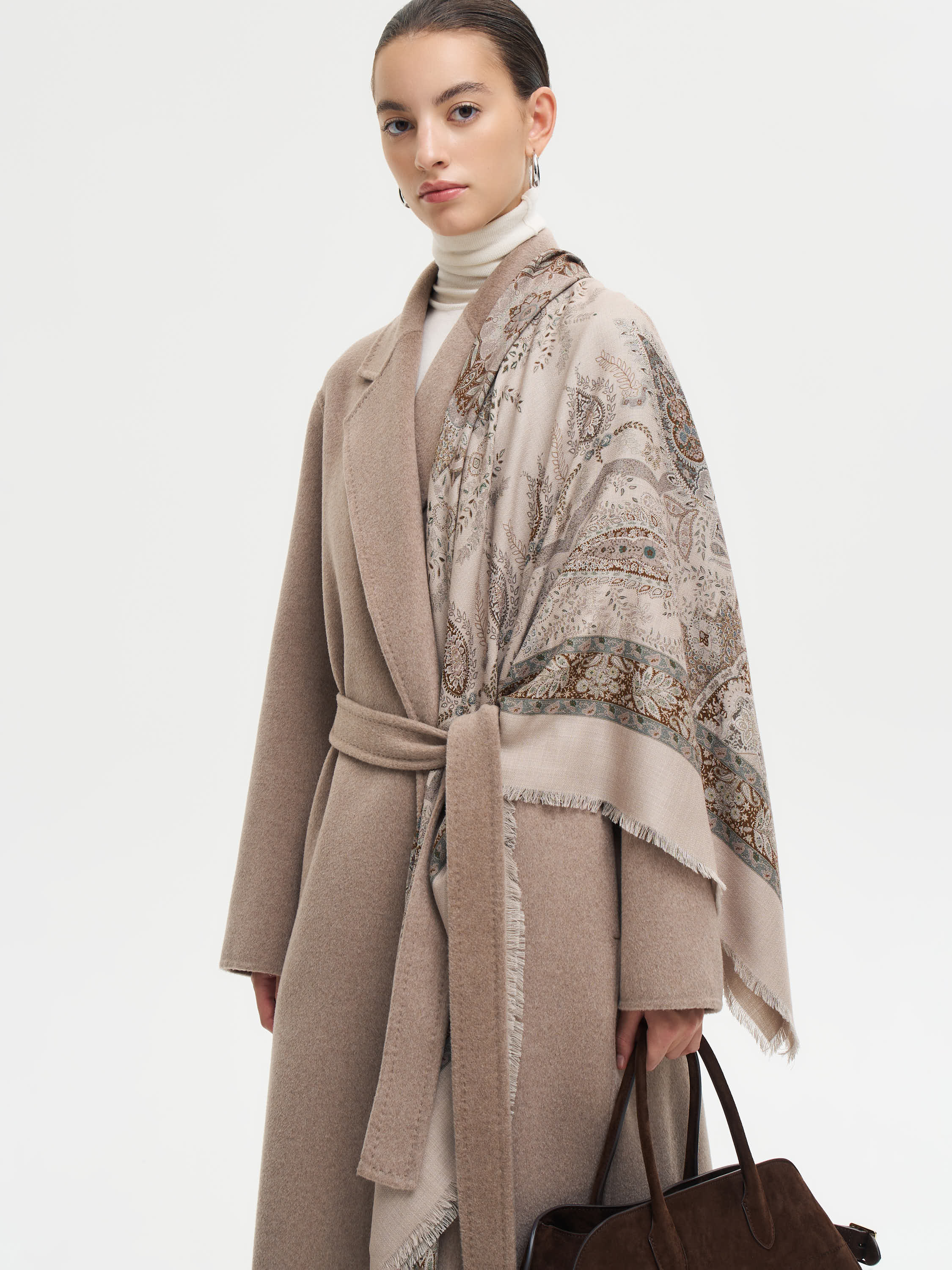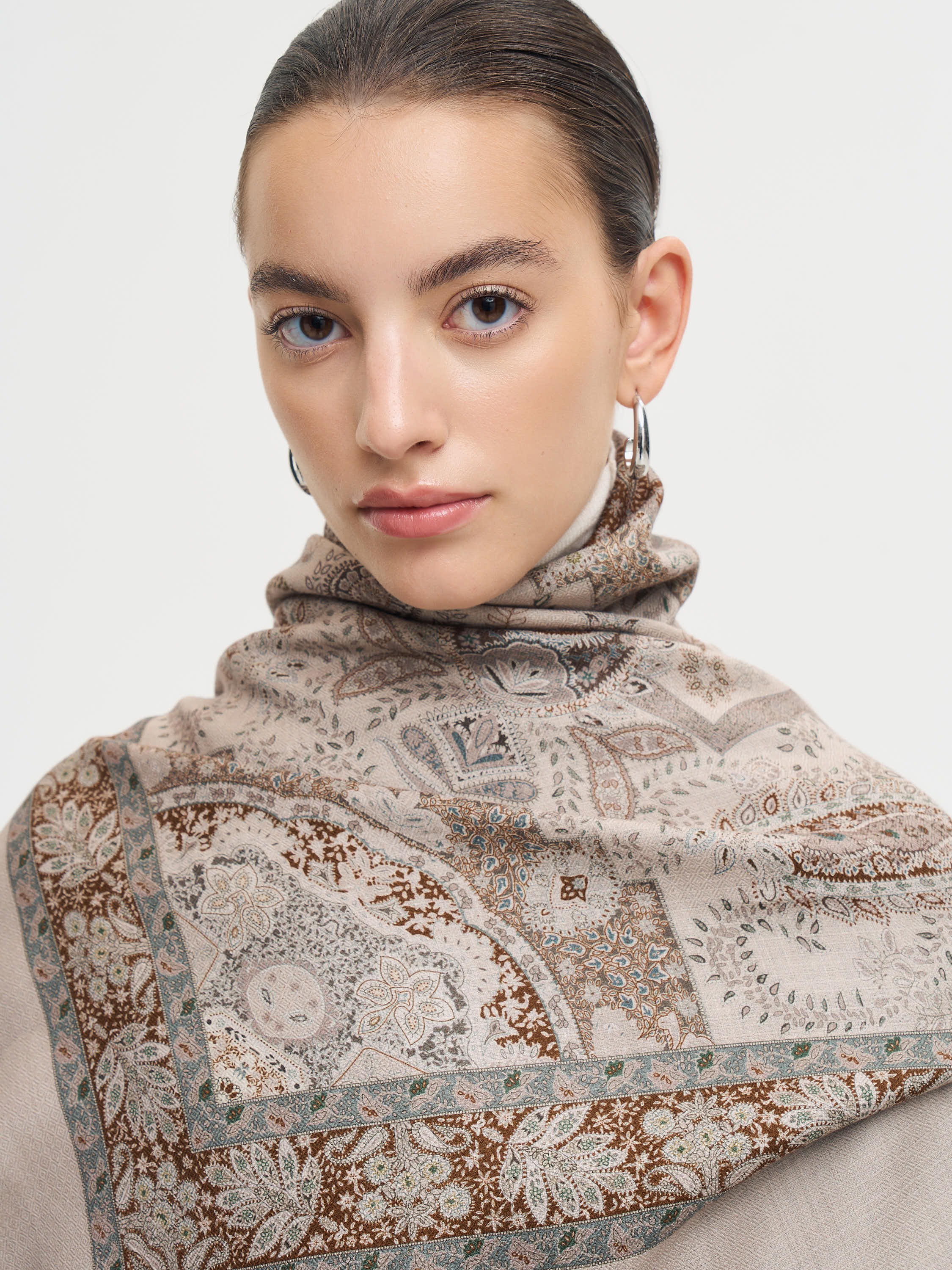 Платок из смеси мериносовой шерсти и шелка с мягкой, деликатной фактурой и приглушенным сатиновым блеском. Классический квадратный формат позволяет носить его как накидку, шарф или аксессуар для пальто. Элегантный орнамент в пейсли с тонкими контрастными линиями выполнен в нейтральной бежево-коричневой гамме, что делает платок универсальным и выразительным акцентом в образе. Легкий, дышащий и приятный к телу материал комфортен в носке и сохраняет форму. Края оформлены короткой бахромой, добавляющей мягкости и естественности.