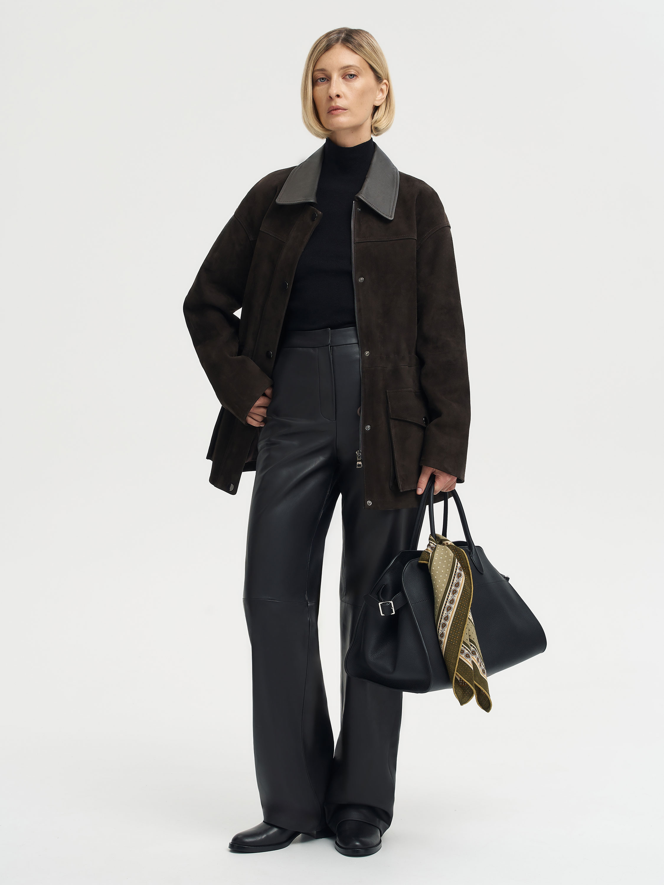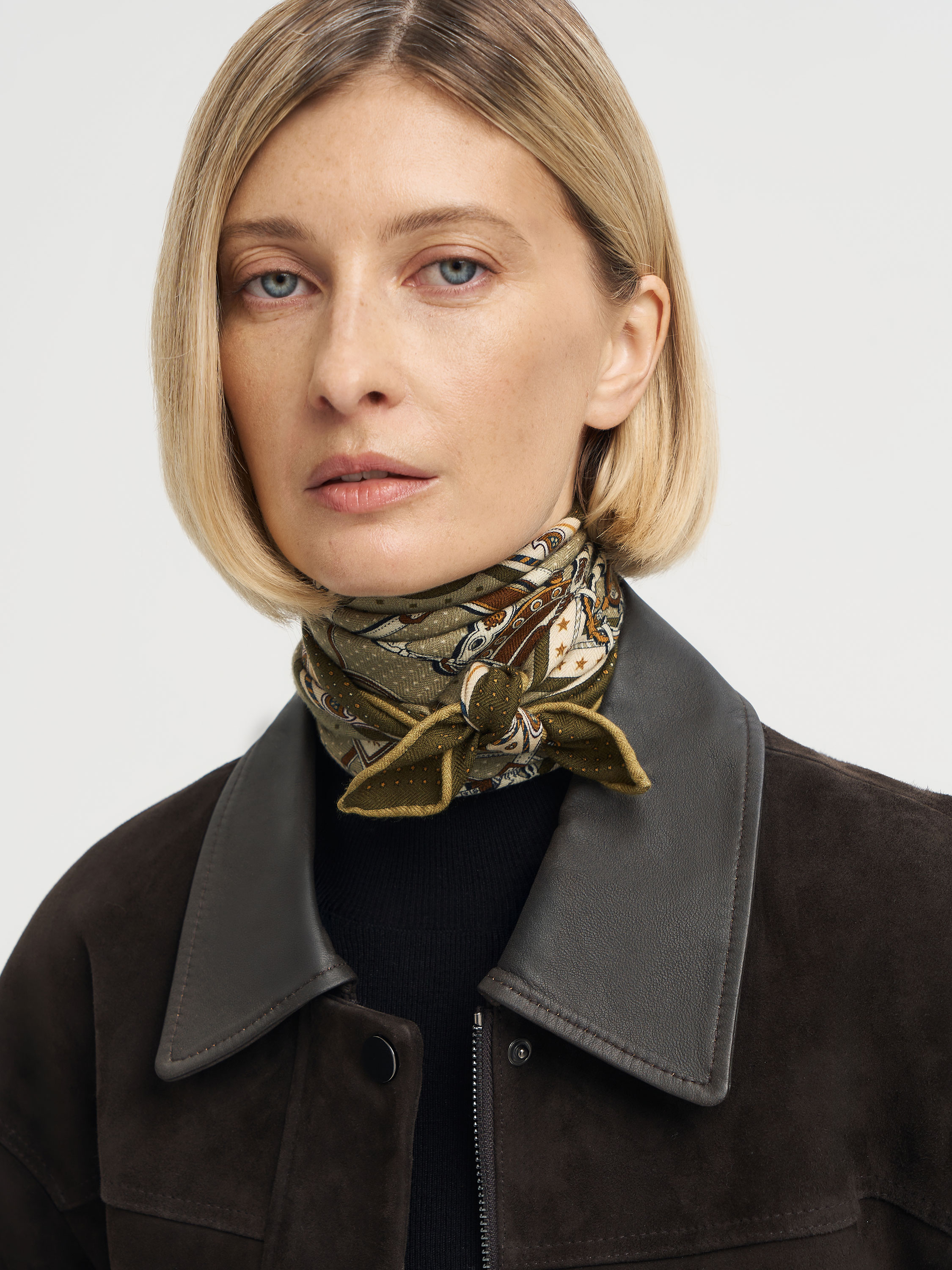 Платок выполнен из шерсти мериноса и шелка — сочетание, которое обеспечивает мягкость, пластичность и деликатный блеск ткани. Легкий и теплый материал комфортно ощущается на коже и сохраняет аккуратную драпировку. Рисунок выдержан в классической эстетике: графичные элементы и рамка по краю образуют цельную композицию, а спокойная палитра оливковых, бежевых и коричневых тонов подчеркивает благородство орнамента. Квадратный формат делает модель универсальной: платок можно носить на шее, завязывать на плечах или использовать как акцент в городских образах.