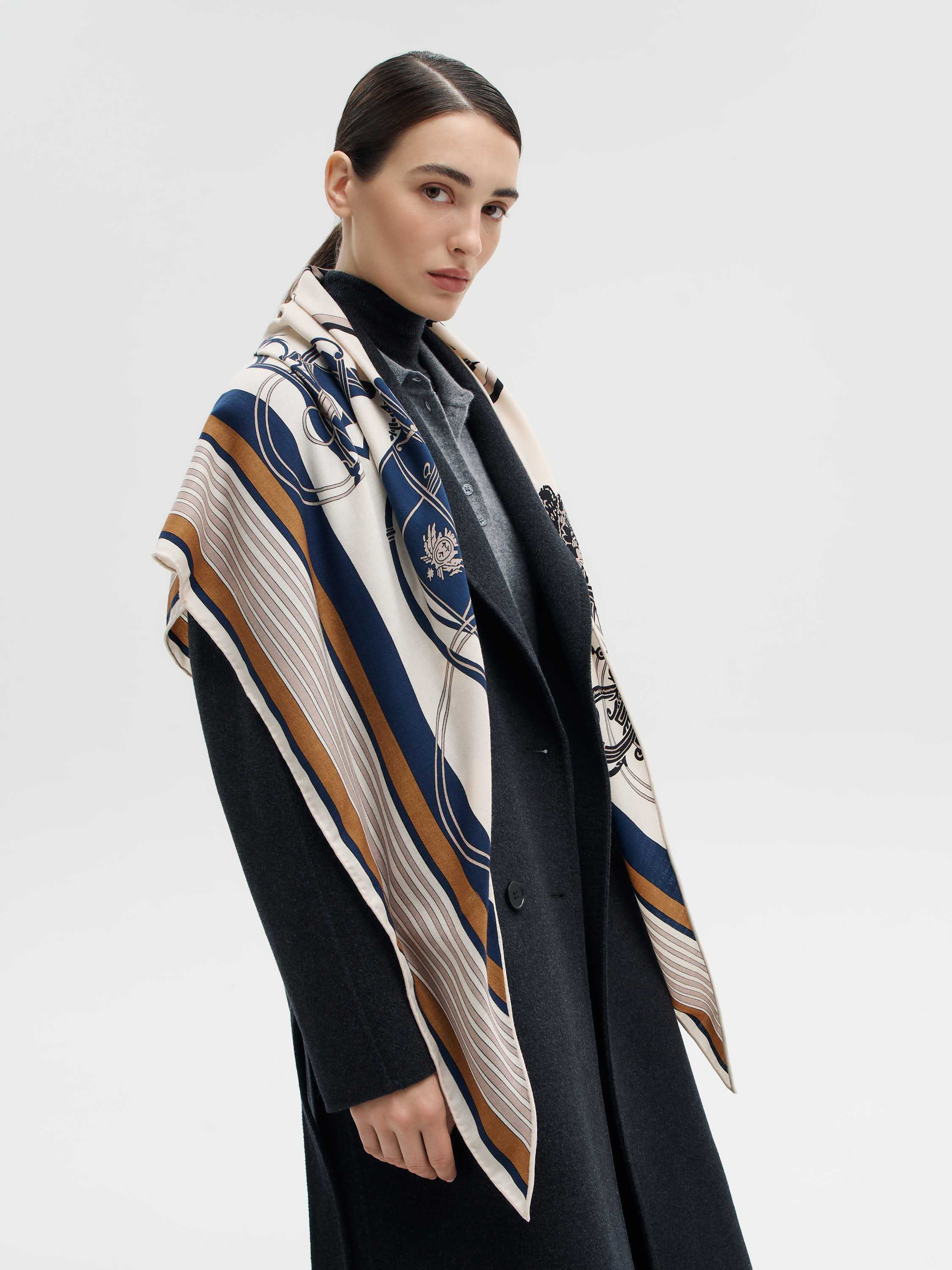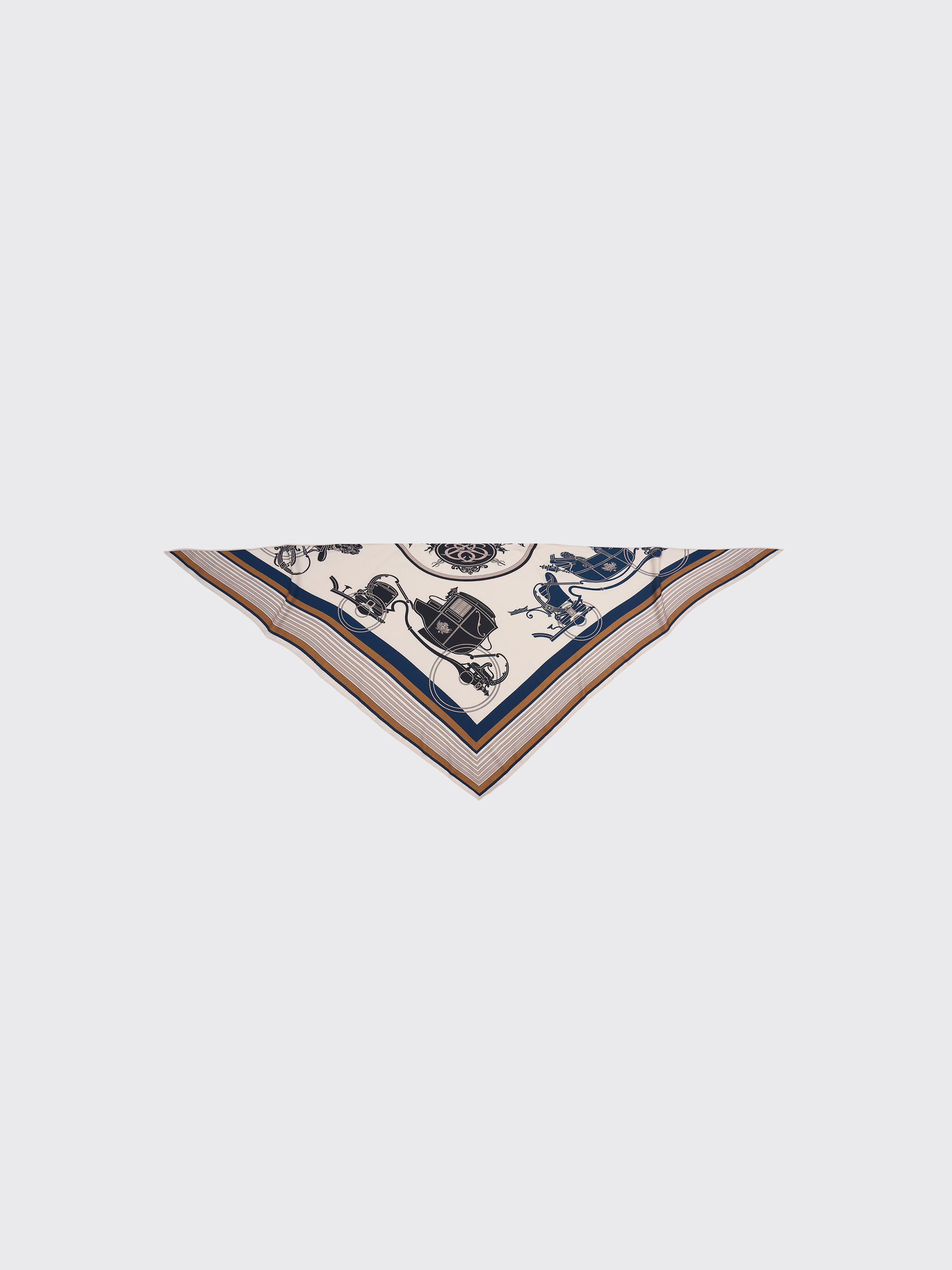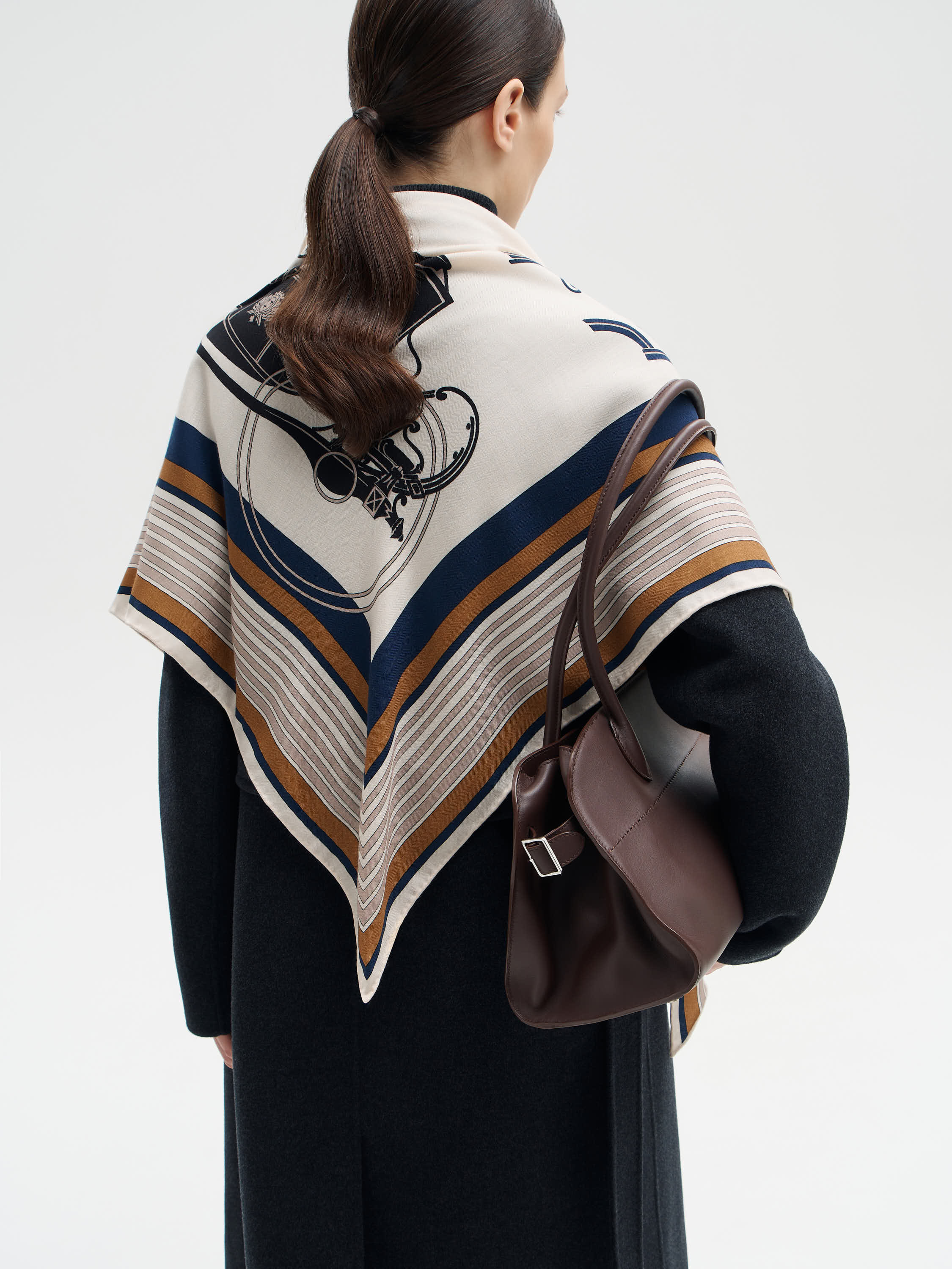 Платок из шерсти мериноса и шелка с графичным принтом в духе классических каретных мотивов: упряжь, ремни и декоративные медальоны переплетаются в орнаменте, обрамленном полосатой рамкой. Легкий блеск шелка подчеркивает рисунок, а шерсть придает плотность и мягкость. Можно носить на шее узлом или расправленным, повязать на голову в стиле ретро, использовать как акцент на поясе или завязать на ручке сумки.