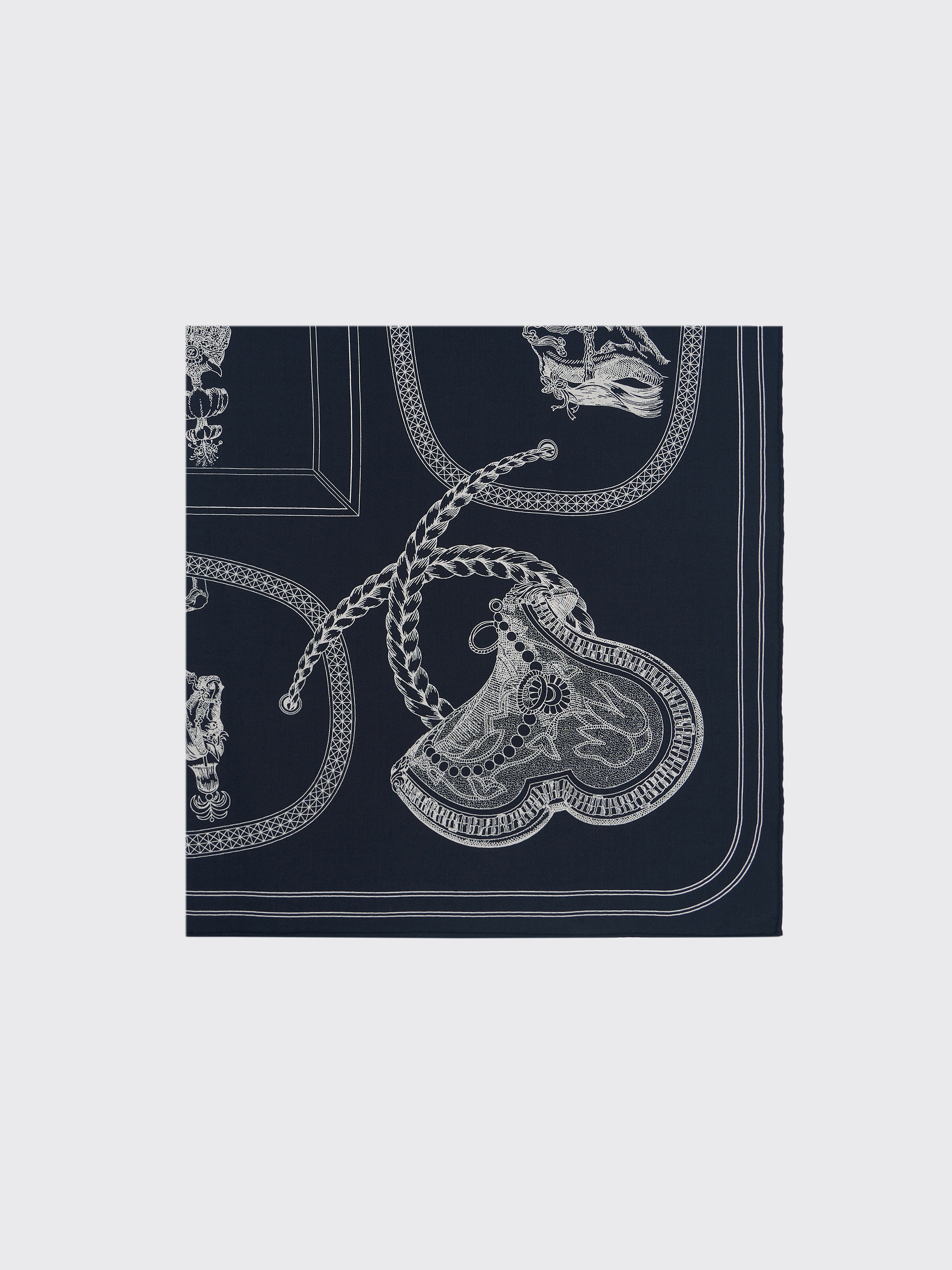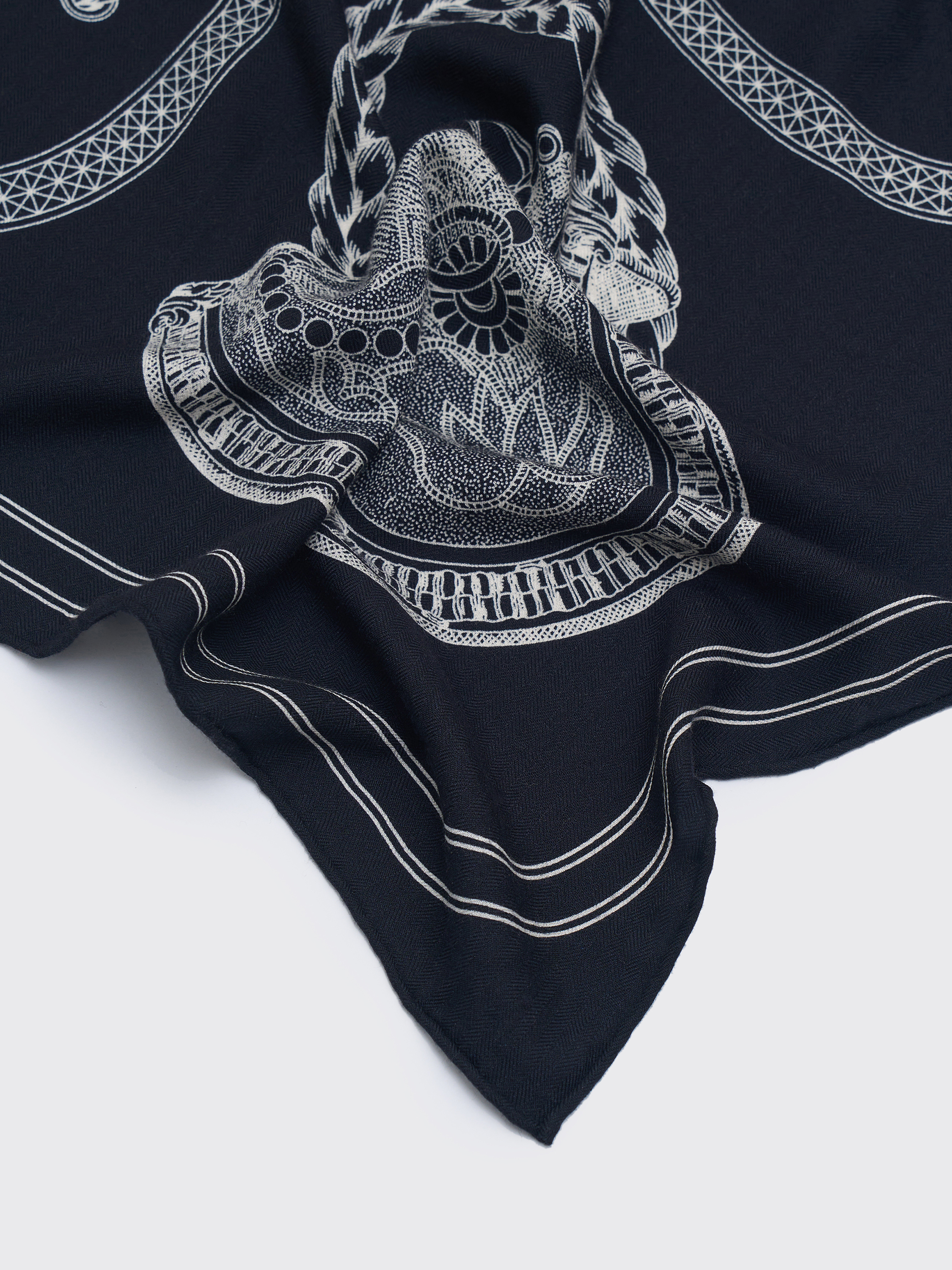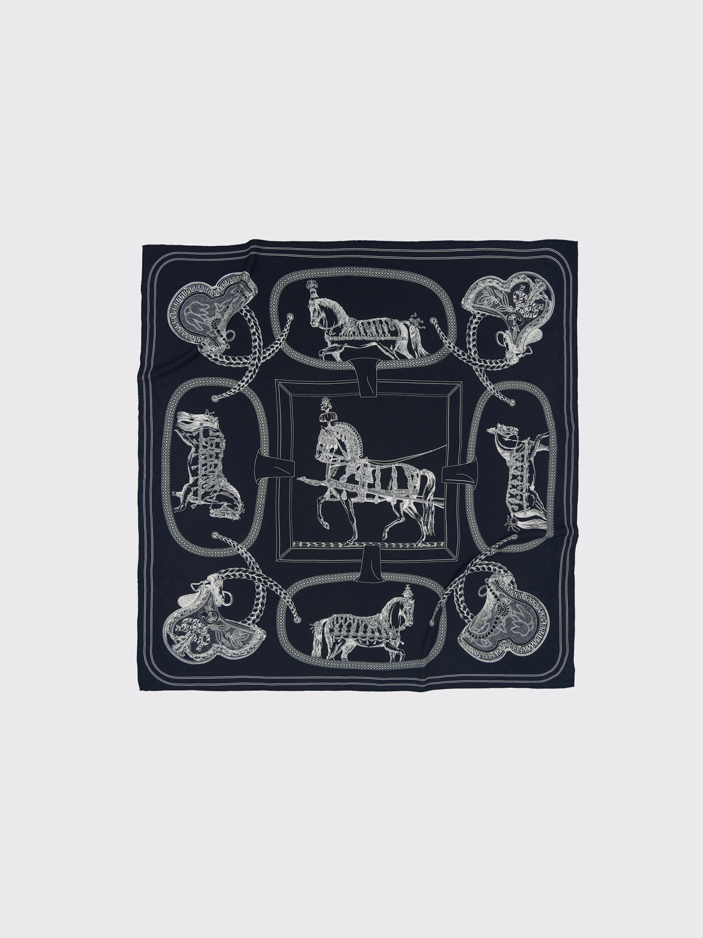 Платок из кашемира и шелка в темной гамме с контрастным рисунком. Декорирован тонкими графичными иллюстрациями в стиле гравюры: по центру и по периметру расположены фигуры лошадей с проработанными анатомическими деталями, дополненные декоративными элементами в обрамлении витых канатов. Сложная композиция с конными мотивами придает аксессуару характер и глубину, а материал сочетает мягкость, тепло и тонкий благородный блеск. Классический квадратный формат делает платок универсальным аксессуаром, который можно завязывать на шее, носить на плечах или использовать как акцент в образе.