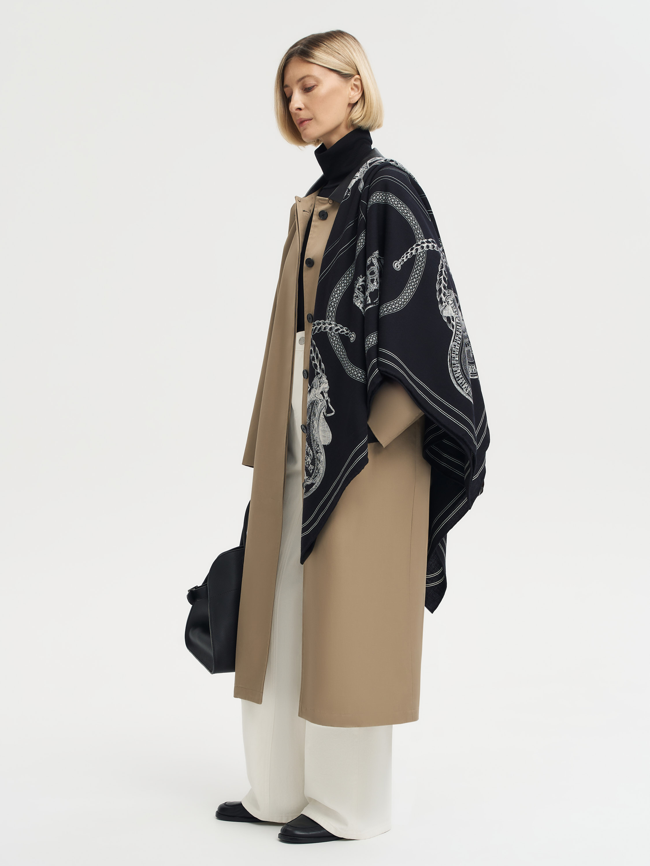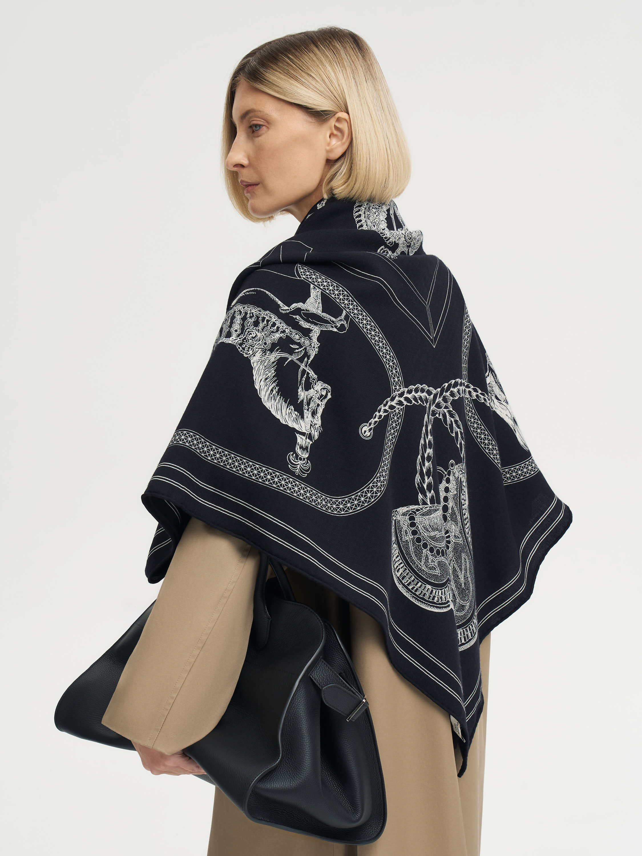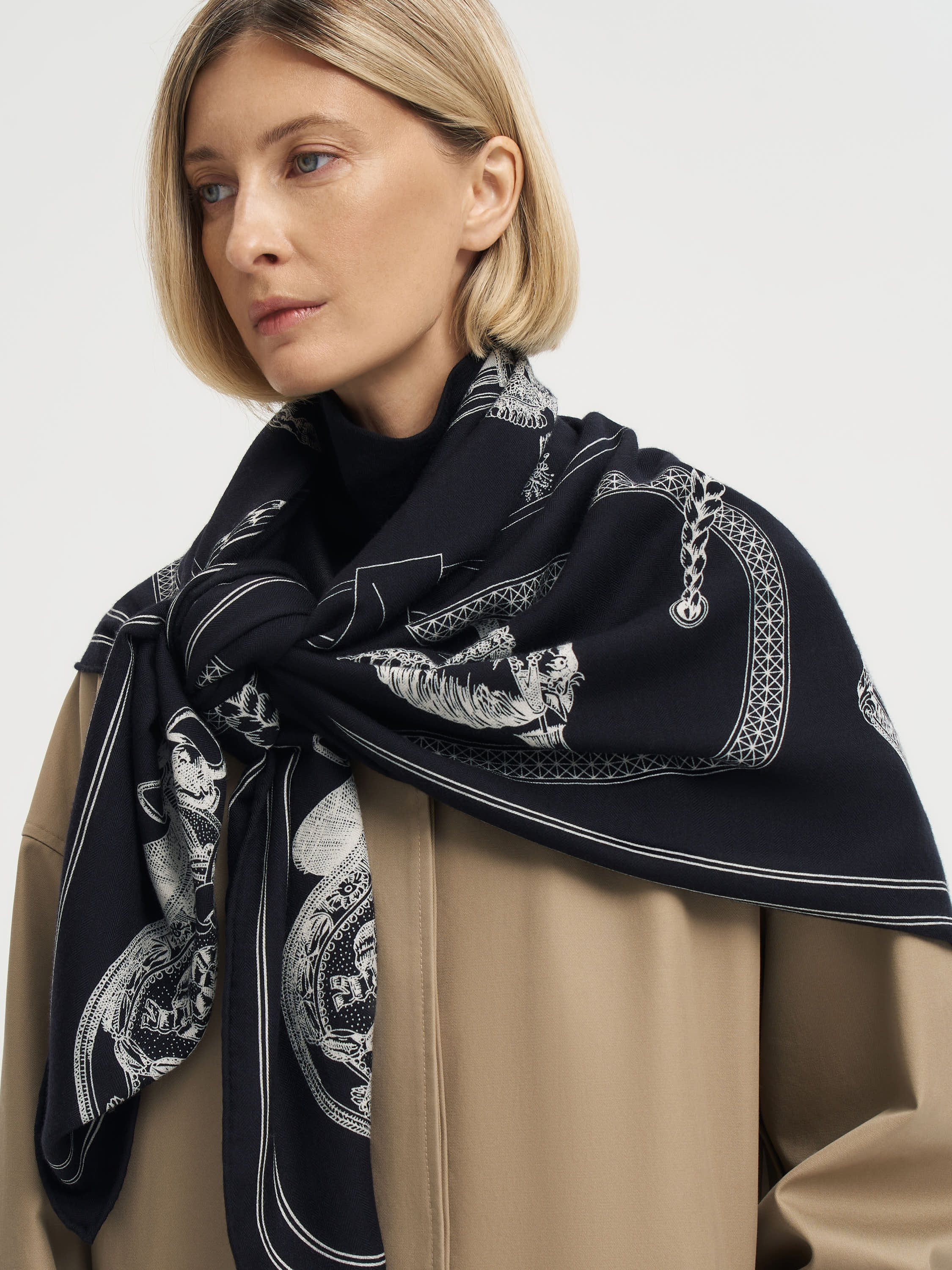 Платок из кашемира и шелка в темной гамме с контрастным рисунком. Декорирован тонкими графичными иллюстрациями в стиле гравюры: по центру и по периметру расположены фигуры лошадей с проработанными анатомическими деталями, дополненные декоративными элементами в обрамлении витых канатов. Сложная композиция с конными мотивами придает аксессуару характер и глубину, а материал сочетает мягкость, тепло и тонкий благородный блеск. Классический квадратный формат делает платок универсальным аксессуаром, который можно завязывать на шее, носить на плечах или использовать как акцент в образе.