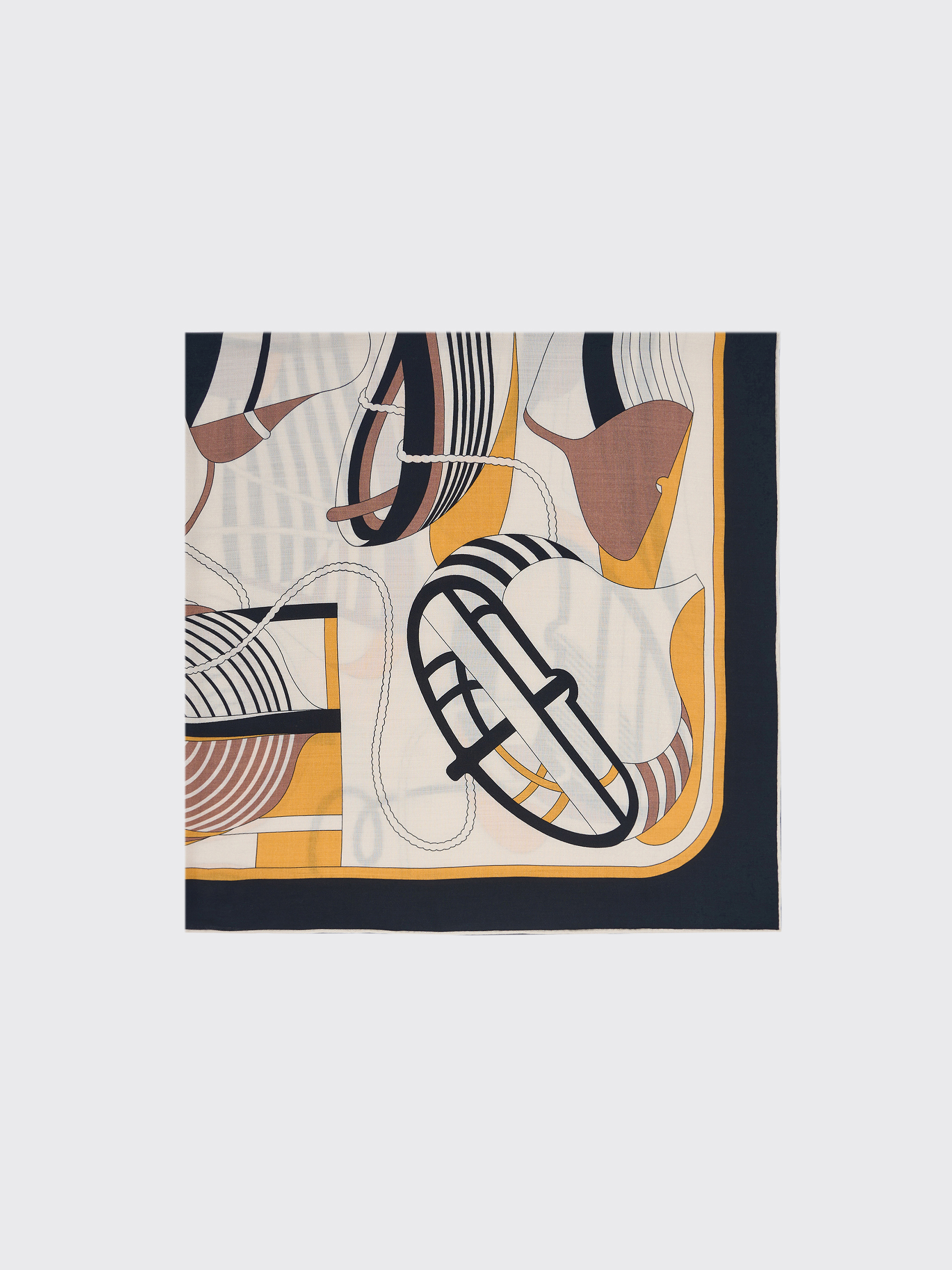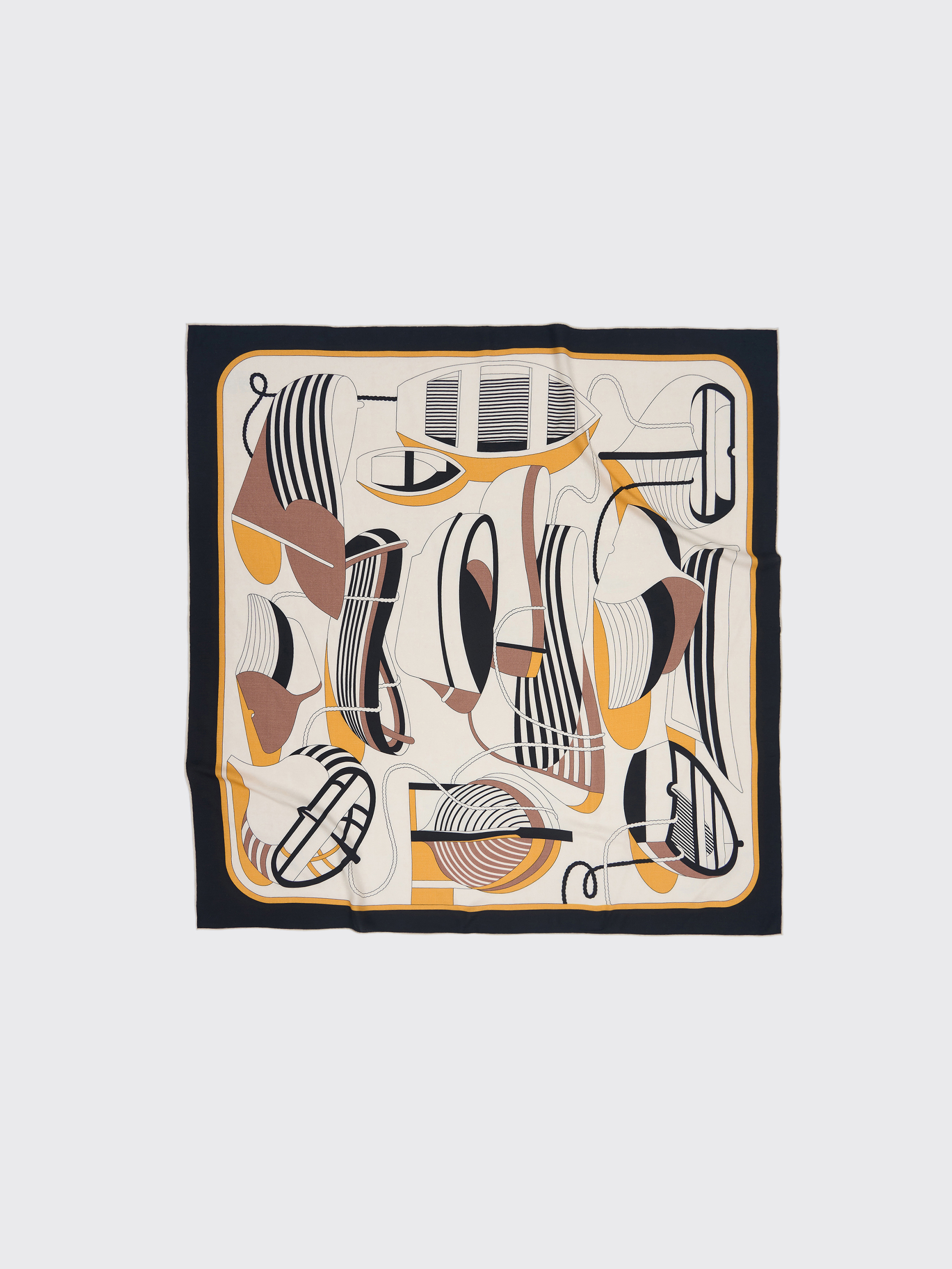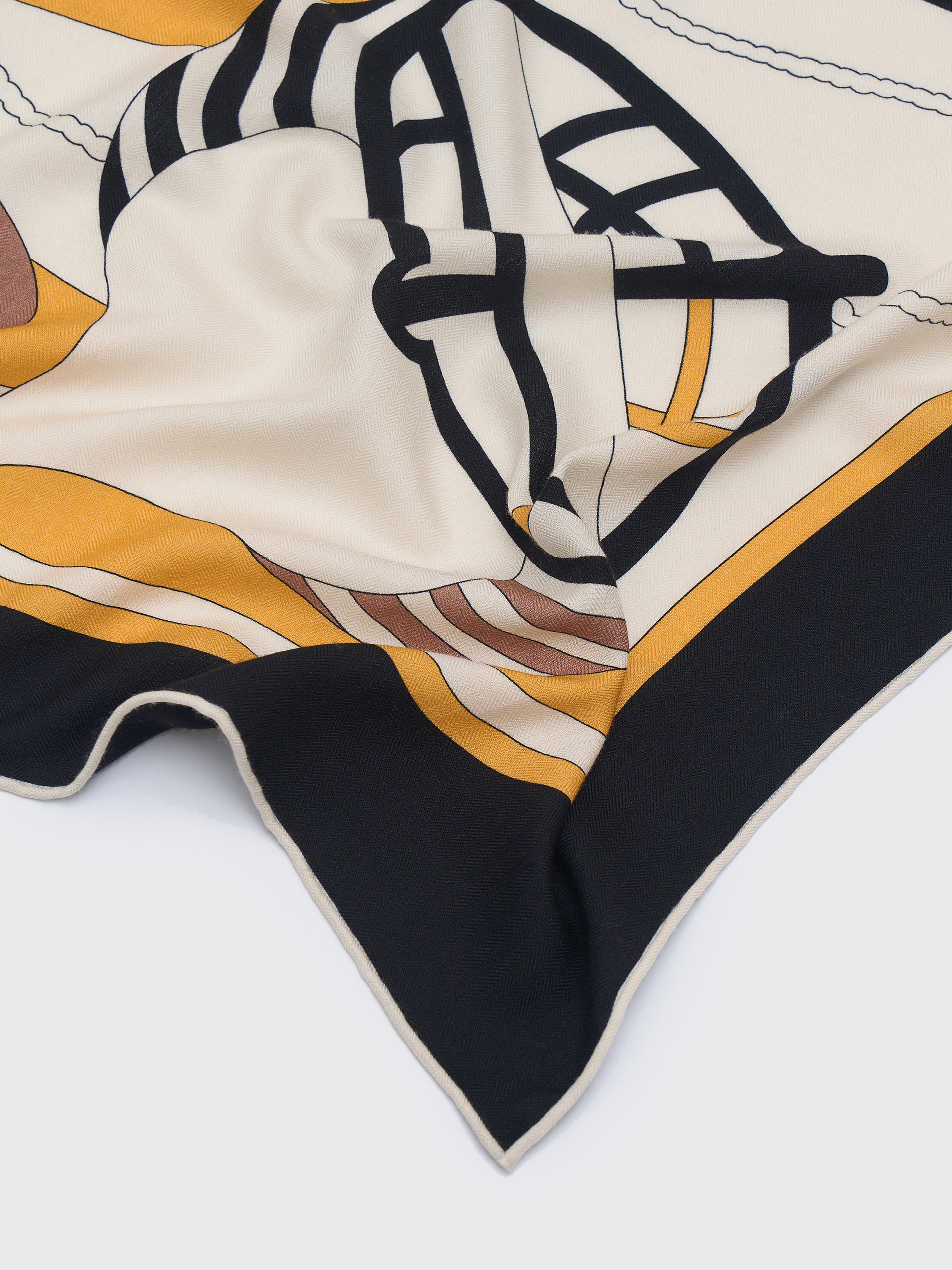 Платок из кашемира и шелка сочетает мягкость, легкость и изысканный блеск ткани. Материал пластично драпируется и комфортен в носке, оставаясь теплым и тонким. Геометрический принт с абстрактными мотивами выполнен в палитре черного, терракотового, охристого и молочного оттенков, что придает аксессуару современный характер и делает его выразительным акцентом в образе. Контрастная рамка по краю завершает композицию и подчеркивает четкость силуэта. Квадратный формат позволяет по-разному стилизовать платок — на шее, плечах, в волосах или на сумке.
