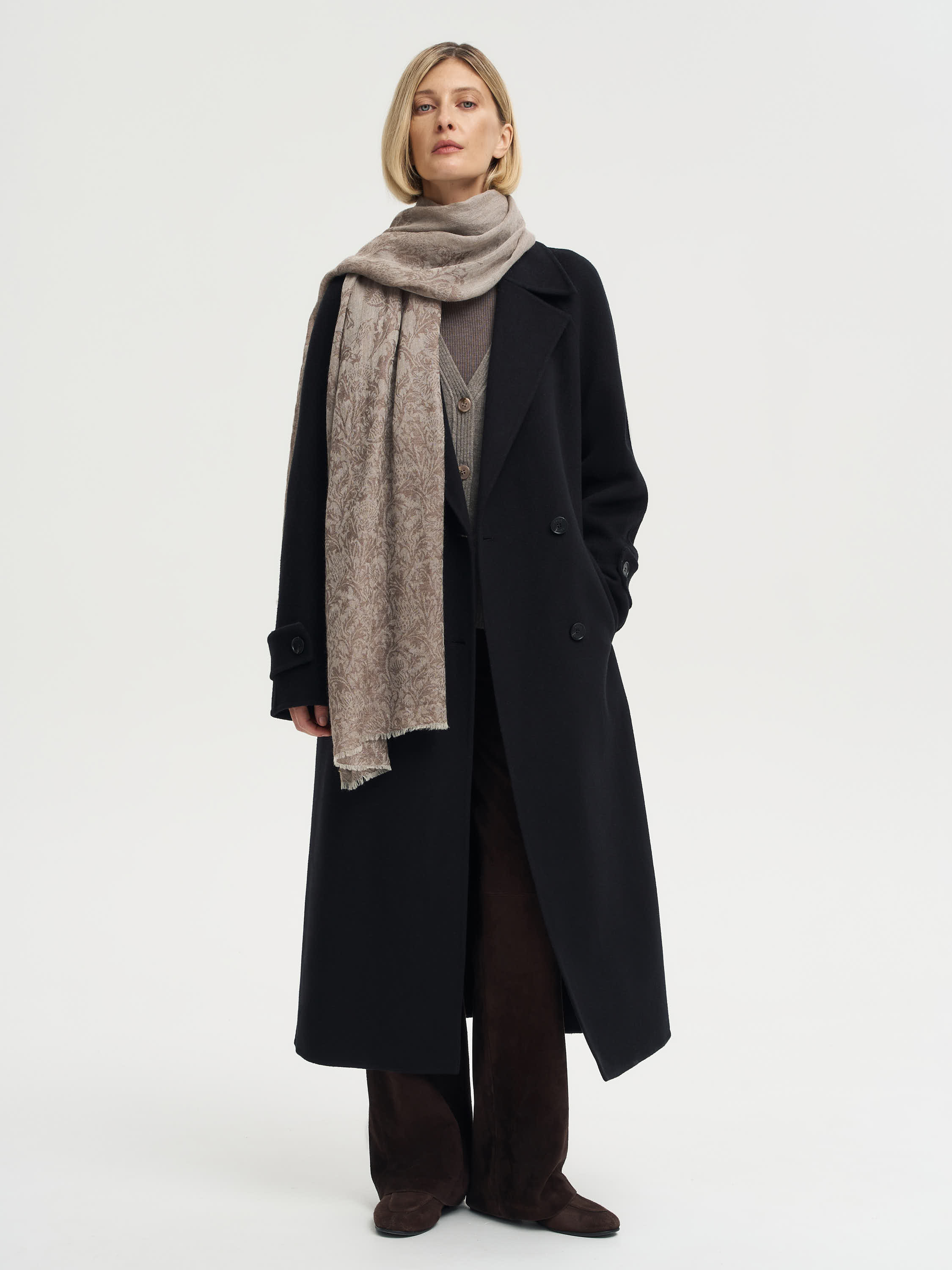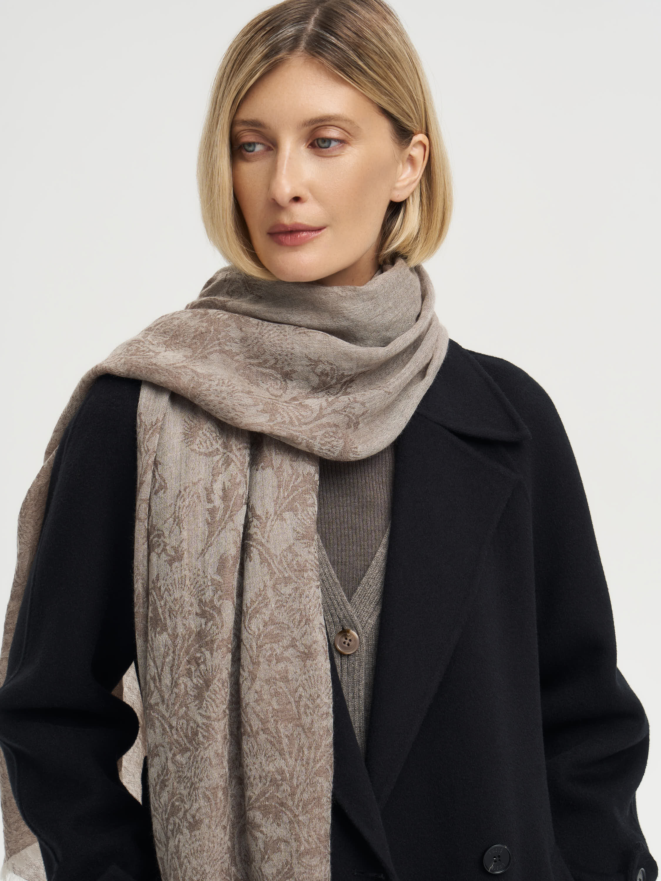 Платок из чистого кашемира с изящным жаккардовым узором — мягкий, тонкий и почти невесомый. Тонкое полотно приятно ощущается на коже и красиво драпируется, создавая объем без утяжеления. Нейтральные оттенки и деликатный рисунок делают аксессуар универсальным — он уместен в любое время года и легко дополняет лаконичные образы. Идеален для тех, кто ценит тактильность, тепло и ненавязчивую элегантность.