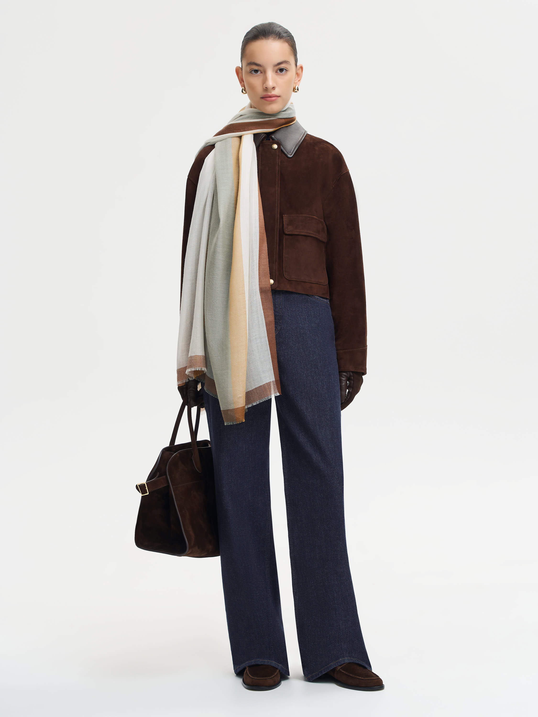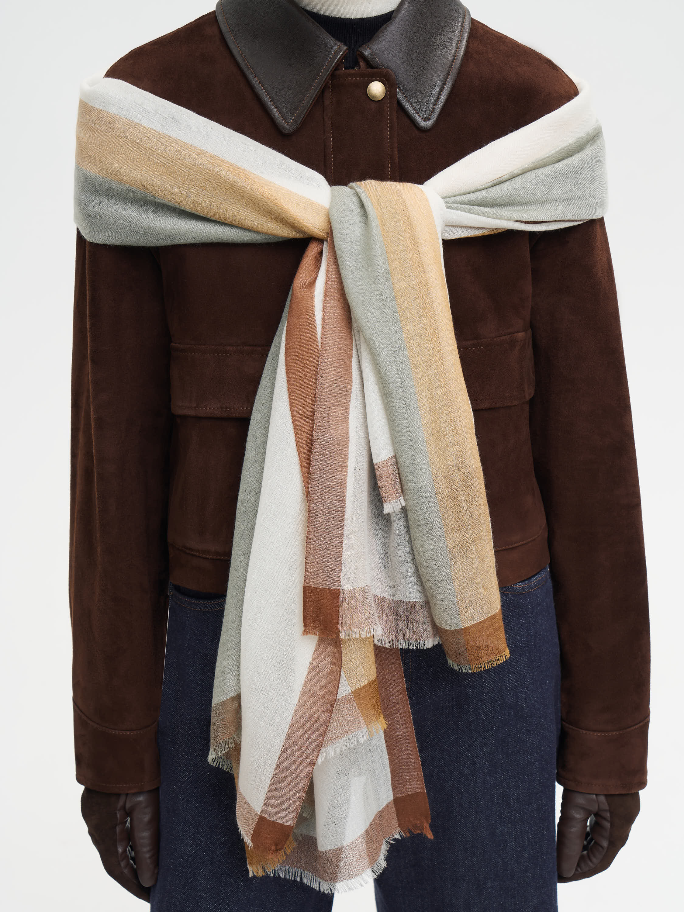 Платок из тонкого кашемира создан как акцент, который не требует усилий. Мягкое, дышащее полотно почти невесомо, приятно прилегает к коже и дарит комфорт в любое время года — зимой сохраняет тепло, а летом защищает от прохладного ветра. Нежная фактура подчеркивает естественную драпировку, позволяя по-разному стилизовать аксессуар: набросить на плечи, повязать на шею или вплести в ручку сумки. Лаконичное сочетание оттенков делает платок универсальным элементом базового гардероба, вносящим в образ мягкость и утонченность.
