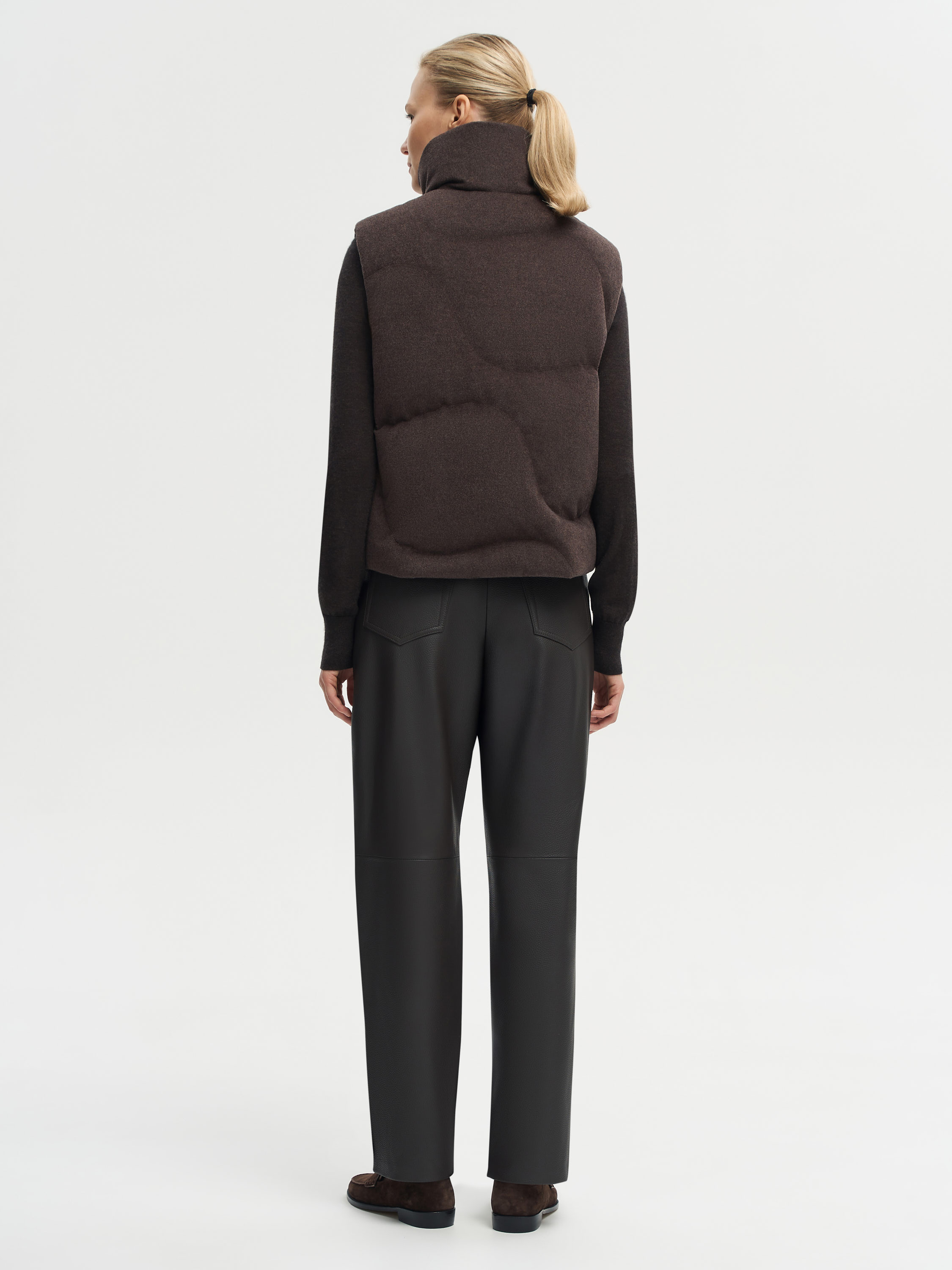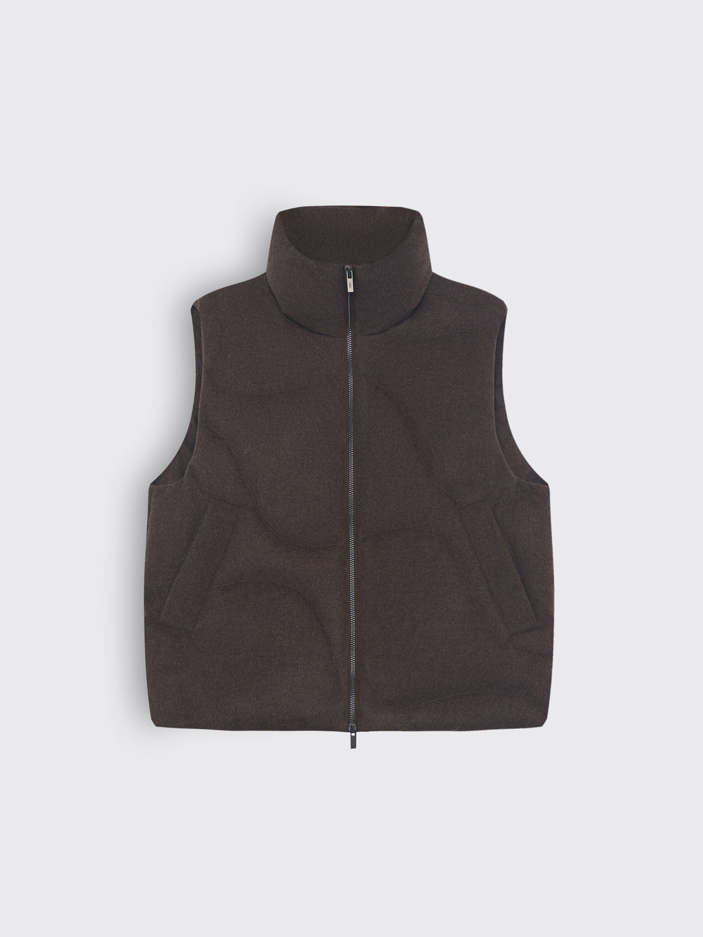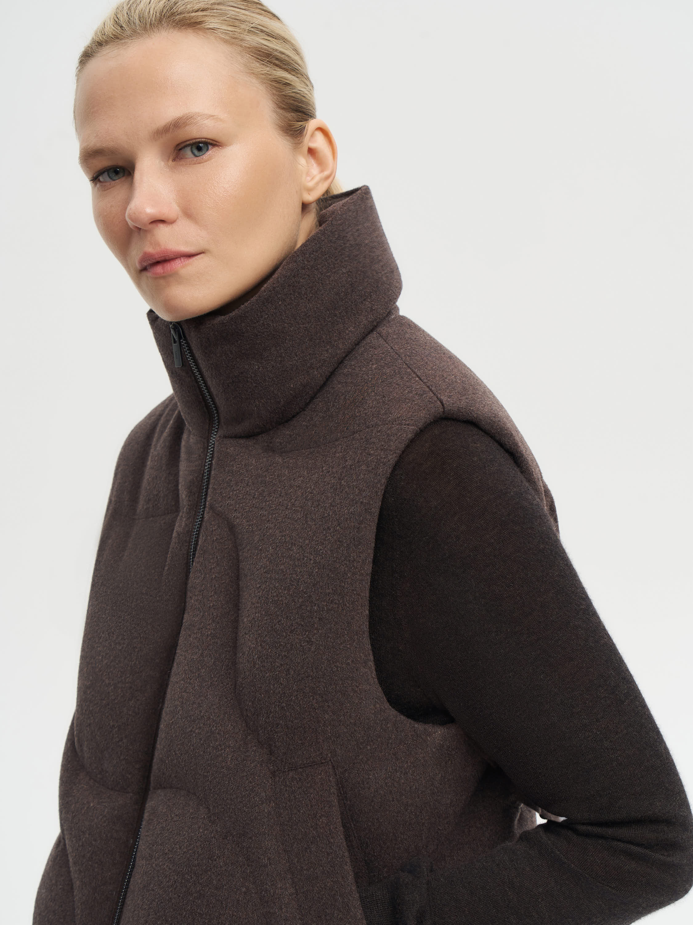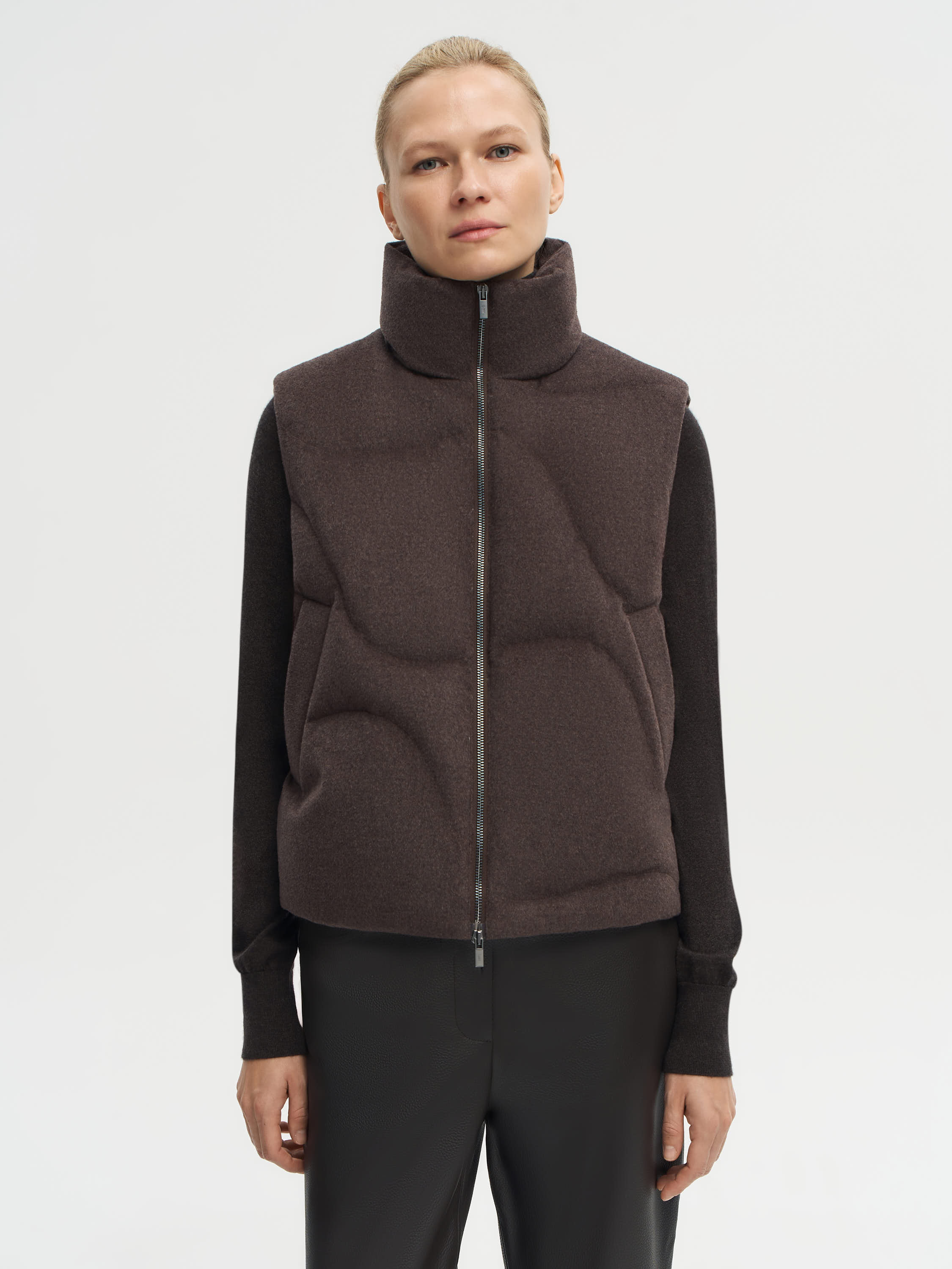 Жилет из ткани на основе шерсти и шелка сочетает в себе тепло, мягкость и изысканную фактуру. Благодаря технологии Storm System материал становится ветро- и водонепроницаемым, сохраняя при этом естественное ощущение натуральных волокон. Тонкая мембрана с микропорами защищает от непогоды и одновременно выводит влагу, обеспечивая комфорт в движении. В качестве наполнителя используется 90% пух и 10% перо с индексом Fill Power 750 — один из самых высоких показателей теплоизоляции. При этом жилет остается легким, пластичным и сохраняет форму. Продуманный крой с высоким воротником и удобной застежкой-молнией делает модель универсальной: ее можно носить поверх водолазок, джемперов или под пальто, выстраивая многослойные и функциональные образы для прохладного сезона.