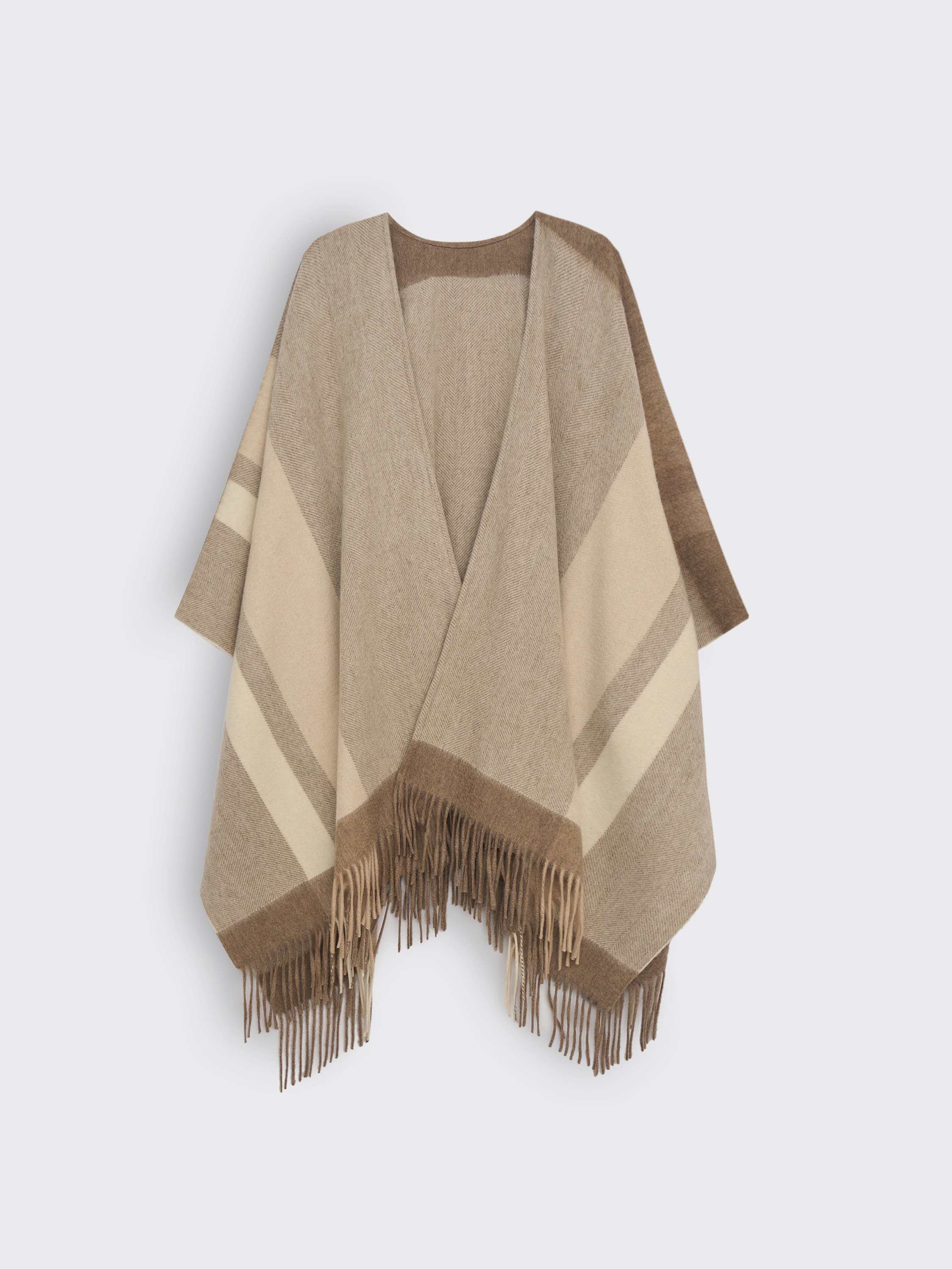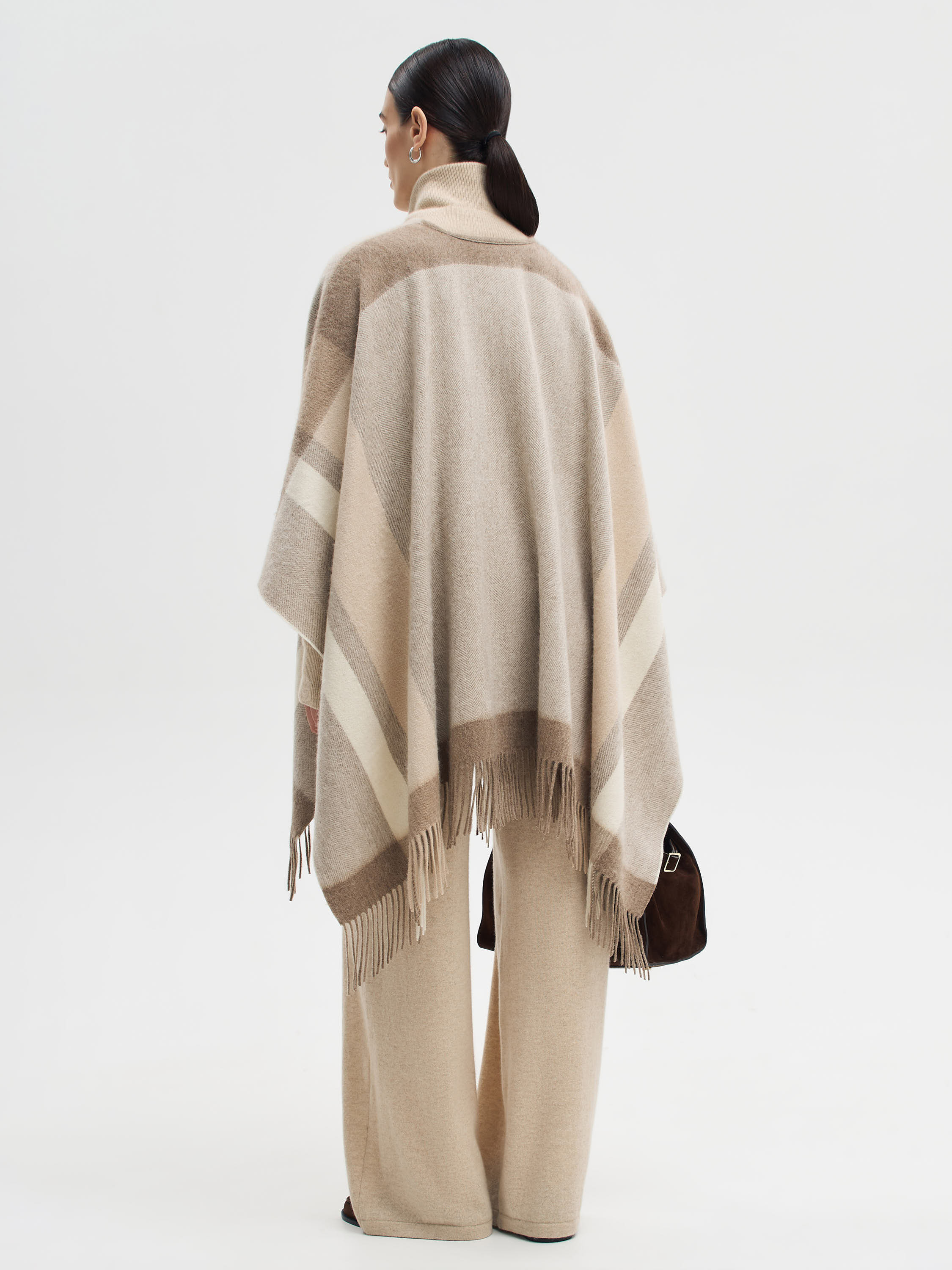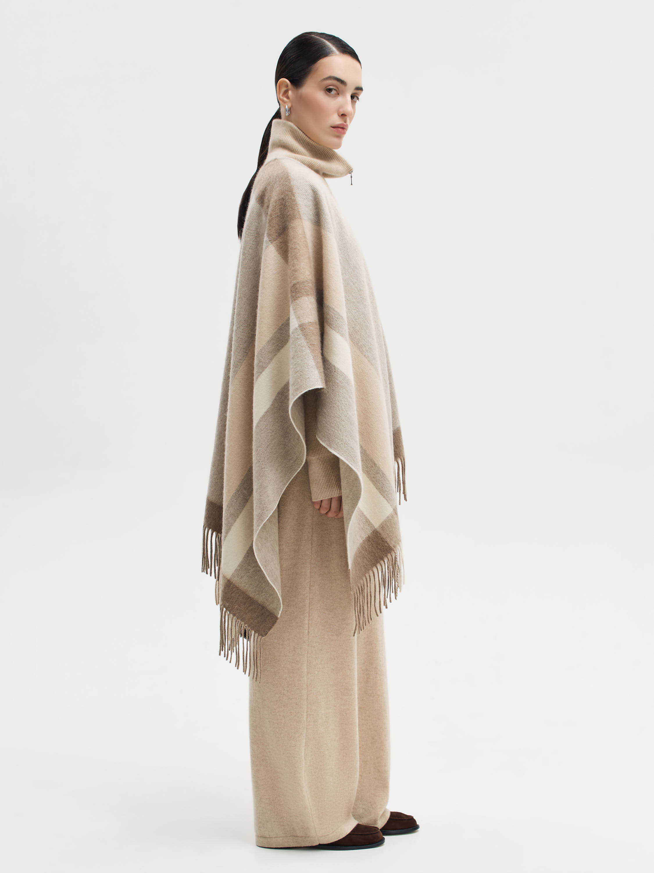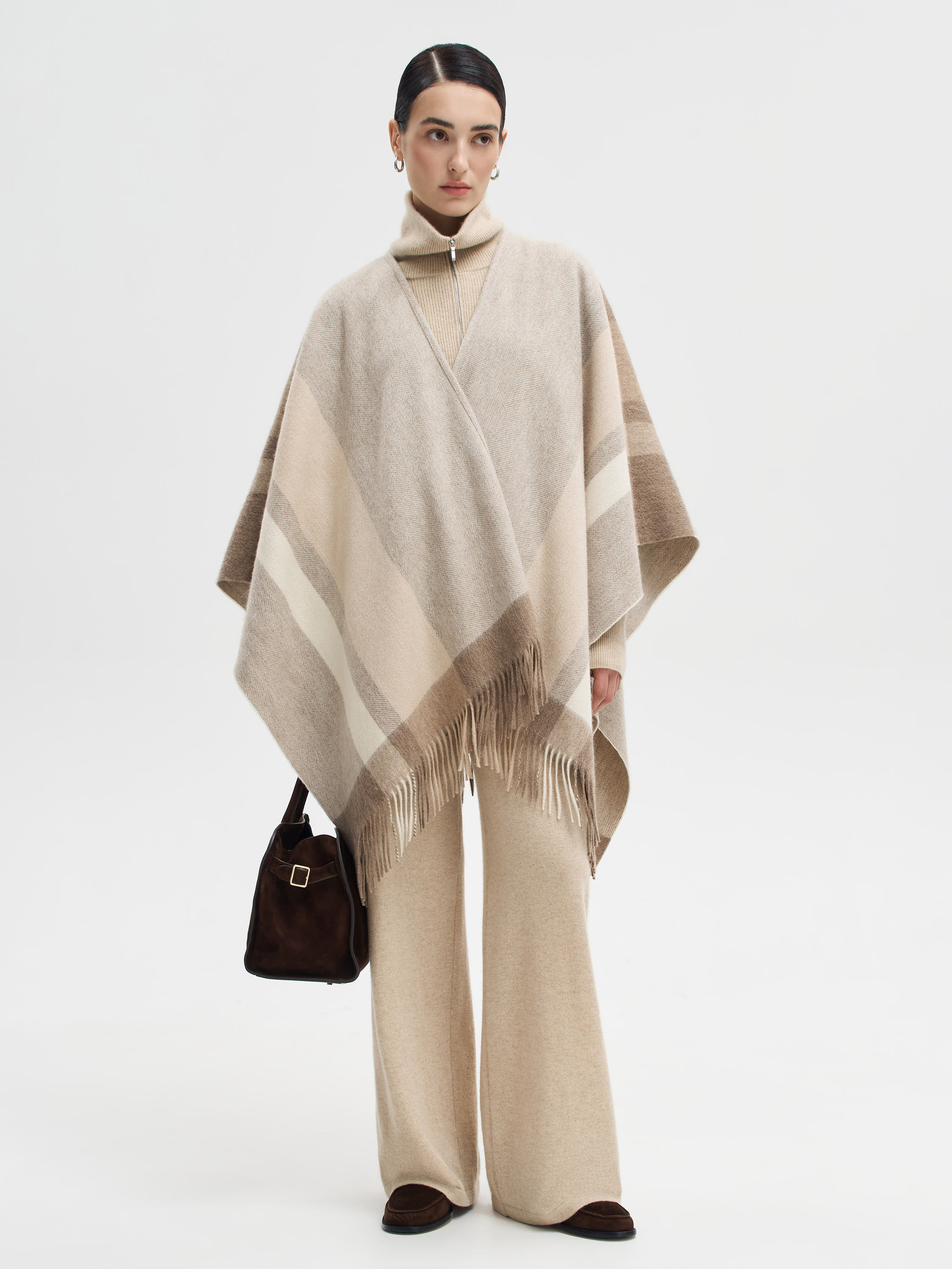 Пончо выполнено из мериносовой шерсти, которая отличается мягкостью, теплом и изысканной фактурой. Легкий и пластичный материал красиво драпируется, создавая выразительный силуэт с плавными линиями. Крупная клетка в спокойной гамме делает акцент на графичности, а длинная бахрома придает образу завершенность и динамику. Такая модель легко вписывается в разные сценарии сезона — от прогулок до городских выходов, оставаясь универсальным и стильным решением.